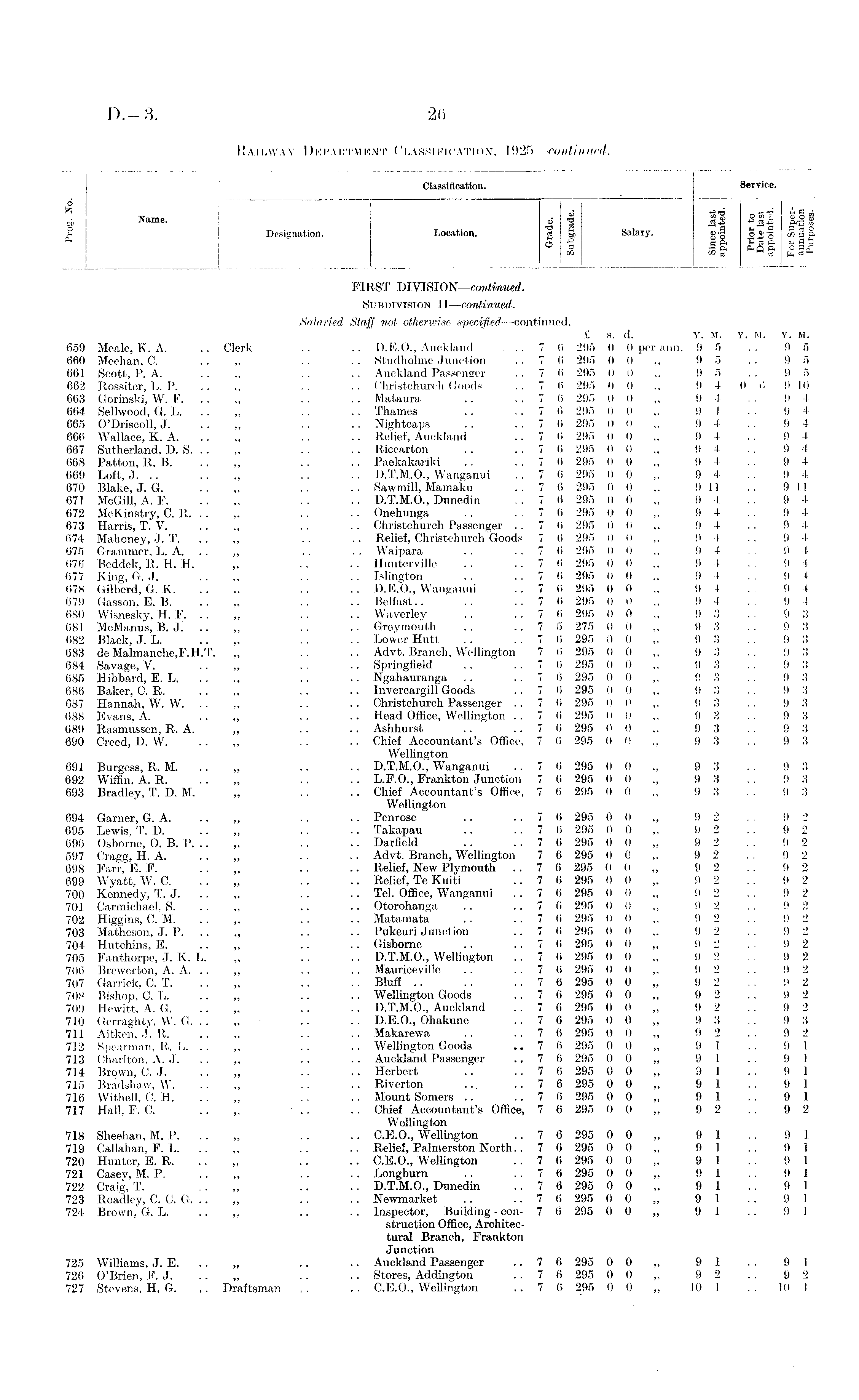 Classification. Service. o " " ———————.—— - * Name. f |i S|| §J g 2 Designation. Location. g & Salary. ©•§ o_£-g 5 § B3 ;l ft ft r °5t FIRST DIVISION—continued. Subdivision II—continued. Salaried Staff not otherwise specified—continued. £ s. d. Y. M. Y. M. Y. M. 659 Meale, K. A. .. Clerk .. .. D.E.O., Auckland ... 7 6 295 0 0 per ann. 95 . • 95 660 Meehan, C. .. ,, .. .. Studholme Junction .. 7 6 295 0 0,, 9 5 .. 9 5 661 Scott, P. A. .. ,, .. .. Auckland Passenger .. 7 6 295 0 0 ,, 9 5 .. 9 5 662 Rossiter, L. P. .. ,, .. .. Christchurch Goods . . 7 6 295 0 0 ,, 9 4 0 0 9 10 663 Gorinski, W. F. ,, .. .. Mataura .. ..7 6 295 0 0,, 9 4 . . 9 4 664 Sellwood, G. L. ,, • • •. Thames .. ..7 6 295 0 0 9 4 .. 9 4 665 O'Driscoll, J. .. „ . . . • Nightcaps .. .. 7 (i 295 0 0 9 4 . . 9 4 666 Wallace, K. A. ,, .. .. Relief, Auckland .. 7 6 295 0 0 ,, 9 4 .. 9 4 667 Sutherland, D. S. .. .. .. Riccarton .. ..7 0 295 0 0 9 4 . . 9 4 668 Patton, R. B. .. ,, .. .. Paekakariki . . ..7 6 295 0 0 ,, 9 4 . . 9 4 669 Loft, J. .. .. „ . . .. D.T.M.O., Wanganui . . 7 6 295 0 0 9 4 . . 9 4 670 Blake, J. G. .. „ . . .. Sawmill, Mamaku . . 7 (i 295 0 0 ,. 9 11 . . 9 11 671 McGill, A. P. .. „ .. .. D.T.M.O., Dunedin .. 7 6 295 0 0 „ 9 4 .. 9 4 672 McKinstry, C. R. .. „ .. .. Onehunga .. ..7 6 295 0 0 „ 94 .. 94 673 Harris, T. V. .. „ .. .. Christchurch Passenger . . 7 6 295 0 0,, 9 4 .. 9 4 674 Mahoney, J. T. ,, .. .. Relief, Christchurch Goods 7 6 295 0 0 ,, 9 4 .. 9 4 675 Grammer, L. A. „ .. .. Waipara .. ..7 6 295 0 0 9 4 .. 9 4 676 Beddek, R. H. H. „ .. .. Hunterville .. ..7 6 295 0 0 „ 94 .. 9 4 677 King, G. J, .. ,, .. .. Islington .. ..7 6 295 0 0 ,, 9 4 .. 9 4 678 Gilberd, G. K. .. „ .. .. D.E.O., Wanganui .. 7 6 295 0 0,. 9 4 . . 9 4 679 Gasson, E. B. .. „ .. .. Belfast.. .. .. 7 6 295 0 0 „ 9 4 .. 9 4 680 Wisnesky, H. F. .. „ .. .. Waverley .. ..7 6 295 0 0 „ 93 .. 9 3 681 McManus, B. J. „ .. .. Greymouth .. ..7 5 275 0 0 „ 93 . . 9 3 682 Black, J. L. .. „ .. .. Lower Hutt .. .. 7 6 295 0 0 9 3 . . 9 3 683 de Malmanche,F.H.T. „ . . .. Advt. Branch, Wellington 7 6 295 0 0 „ 9 3 .. 9 3 684 Savage, V. „ .. .. Springfield .. ..7 6 295 0 0 „ 93 .. 9 3 685 Hibbard, E. L. ,, . . .. Ngahauranga .. ..7 6 295 0 0,, 9 3 . . 9 3 686 Baker, C. R. .. ,, . . .. Invercargill Goods . . 7 (i 295 0 0 9 3 . . 9 3 687 Hannah, W. W. .. ,, • • . • Christchurch Passenger . . 7 6 295 0 0 ,, 9 3 . . 9 3 688 Evans, A. .. „ .. .. Head Office, Wellington . . 7 6 295 0 0,, 9 3 . . 9 3 689 Rasmussen, R. A. „ .. .. Ashhurst .. .. 7 6 295 0 0 „ 9 3 . . 9 3 690 Creed, D. W. .. „ •. • • Chief Accountant's Office, 7 6 295 0 0,, 9 3 . . 9 3 Wellington 691 Burgess, R. M. „ .. .. D.T.M.O., Wanganui . . 7 6 295 0 0 „ 9 3 .. 9 3 692 Wiffin, A. R. .. „ .. .. L.F.O., Frankton Junction 7 6 295 0 0 „ 9 3 .. 9 3 693 Bradley, T. D. M. „ .. .. Chief Accountant's Office, 7 6 295 0 0 9 3 . . 9 3 Wellington 694 Garner, G. A. .. „ .. .. Penrose .. .. 7 6 295 0 0 „ 9 2 .. 9 2 695 Lewis, T. D. .. „ .. .. Takapau .. ..7 6 295 0 0 „ 92 .. 92 696 Osborne, O. B. P. .. „ .. .. Darfield .. .. 7 6 295 0 0 9 2 .. 9 2 597 Cragg, H. A. .. „ .. .. Advt. Branch, Wellington 7 6 295 0 0,. 9 2 . . 9 2 698 Farr, E. F. .. „ .. .. Relief, New Plymouth .. 7 6 295 0 0 „ 9 2 . . 9 2 699 VVyatt, W. C. .. „ .. • • Relief, Te Kuiti ..7 6 295 0 0 9 2 9 2 700 Kennedy, T. J. „ .. .. Tel. Office, Wanganui . . 7 (i 295 0 0,, 9 2 . . 9 2 701. Carmichael, S. .. ,, .. .. Otorohanga .. .. 7 (i 295 0 0 ,, 9 2 .. 9 2 702 Higgins, C. M. .. „ . . .. Matamata . . .. 7 li 295 0 0 9 2 . . 9 2 703 Matheson, J. P. „ .. .. Pukeuri Junction .. 7 6 295 0 0 „ 9 2 .. 9 2 704 Hutchi'ns, E. .. „ .. .. Gisborne .. .. 7 (i 295 0 0 „ 9 2 . . 9 2 705 Fanthorpe, J. K. L. „ .. .. D.T.M.O., Wellington .. 7 (i 295 It 0 „ 9 2 . . 9 2 706 Brewerton, A. A. .. „ .. .. Mauriceville .. ..7 6 295 0 0 „ 92 . . 92 707 Garrick, C. T. .. „ .. .. Bluff .. .. ..7 6 295 0 0 „ 92 . . 92 708 Bishop, C. L. .. „ .. .. Wellington Goods .. 7 6 295 0 0 „ 9 2 . . 9 2 709 Hewitt, A. G. .. „ • • • • D.T.M.O., Auckland .. 7 6 295 0 0 „ 9 2 . . 9 2 710 Gerraghty, W. G. .. „ .. .. D.E.O., Ohakune .. 7 6 295 0 0 ,, 9 3 . . 9 3 711 Aitken, J. R. .. ,, .. .. Makarewa .. ..7 6 295 0 0,, 9 2 ... 9 2 712 Spearman, R. L. .. „ .. .. Wellington Goods .. 7 6 295 0 0 „ 9 1 .. 9 1 713 Charlton, A. J .. .. Auckland Passenger .. 7 6 295 0 0 „ 9 1 .. 9 1 714 Brown, C. J. .. „ .. .. Herbert .. ..7 6 295 0 0 „ 9 1 .. 9 1 715 Bradshaw, W. .. „ .. .. Riverton ... .. 7 6 295 0 0 „ 9 1 .. 9 1 716 Withell, C. H. .. „ .. .. Mount Somers .. ..7 6 295 0 0 „ 9 1 .. 9 1 717 Hall, F. C. .. „ ' .. .. Chief Accountant's Office, 7 6 295 0 0 „ 9 2 .. 9 2 Wellington 718 Sheehan, M. P. .. „ .. .. C.E.O., Wellington .. 7 6 295 0 0 „ 9 1 . . 9 1 719 Callahan, F. L. .. „ .. .. Relief, Palmerston North.. 7 6 295 0 0 „ 9 1 .. 9 I 720 Hunter, E. R. .. „ .. .. C.E.O., Wellington . . 7 6 295 0 0 „ 9 1 . . 9 1 721 Casey, M. P. .. „ .. .. Longburn .. ..7 6 295 0 0 „ 91 .. 91 722 Craig, T. .. „ .. . . JD.T.M.O., Dunedin .. 7 6 295 0 0 „ 9 1 .. 9 1 723 Roadley, C. C. G. .. „ . . .. Newmarket .. ..7 6 295 0 0,, 9 1 .. 9 1 724 Brown, G. L. .. .. .. Inspector, Building - con- 7 6 295 0 0 „ 9 1 .. 9 1 struction Office, Architectural Branch, Frankton Junction 725 Williams, J. E. „ .. .. Auckland Passenger .. 7 6 295 0 0 „ 9 1 .. 9 1 726 O'Brien, F. J .. .. Stores, Addington .. 7 6 295 0 0 „ 9 2 .. 9 2 727 Stevens, H, G. .. Draftsman .. C.E.O., Wellington .. 7 6 295 0 0 „ 10 1 .. 10 I