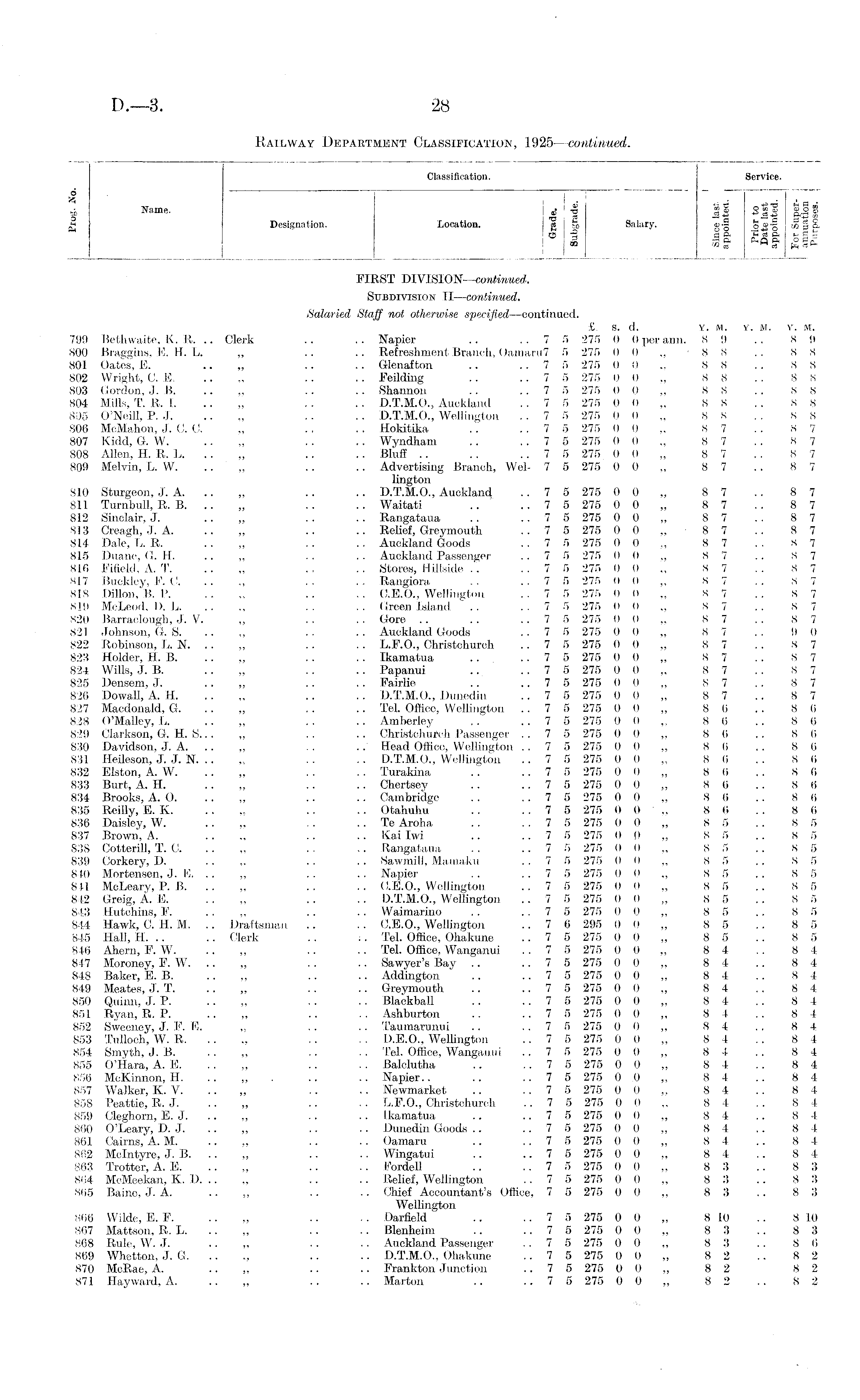 Classification. Service. o . " ~ i | — *5 i . _ __ j ; 1 I Tj t-H H */) th Name. 1 •© £.2 « 2 Designation. Location. g j to Salary. g-| jjjjg'i w § ■5 oft Jiift i§ 5 ft t"QB OlSt J 00 J) a M ri FIRST DIVISION—continued. Subdivision II—continued. Salaried Staff not otherwise specified—continued. £. s. d. y. M. x. M. Y. M. 799 Bethwaite, K. R. .. Clerk .. .. Napier .. ..75 275 0 0 per ann. 89 .. 8 9 800 Braggins, E. H. L. „ .. .. Refreshment Branch, Oamaru7 5 275 0 0 „ '88 .. 88 801 Oates, E. „ .. .. Glenafton .. ..7 5 275 0 0 ,, 8 8 .. 8 8 802 Wright, C. E. .. „ .. .. Feilding .. ..7 5 275 0 0 „ 88 .. 88 803 Gordon, J. B. .. „ .. .. Shannon .. ..7 5 275 0 0 ,, 8 8 .. 8 8 804 Mills, T. R. 1. .. „ .. .. D.T.M.O., Auckland .. 7 5 275 0 0 „ 8 8 .. 8 8 805 O'Neill, P. J. .. „ .. .. D.T.M.O., Wellington .. 7 5 275 0 0 „ 8 8 .. 8 8 806 McMahon, J. C. C. „ .. .. Hokitika .. .. 7 5 275 0 0 8 7 .. 8 7 807 Kidd, G. W. .. ,, .. .. Wyndham .. ..7 5 275 0 0 „ 87 . . 87 808 Allen, H. R. L. .. „ .. .. Bluff .. .. .. 7 5 275 0 0 8 7 . . 8 7 809 Melvin, L. W. .. ,, .. . . Advertising Branch, Wcl- 7 5 275 0 0 „ 8 7 .. 8 7 lington 810 Sturgeon, J. A. .. ,, .. .. D.T.M.O., Auckland .. 7 5 275 0 0., 8 7 .. 8 7 811 Turnbull, R. B. .. „ .. .. Waitati .. . . 7 5 275 0 0 8 7 .. 8 7 812 Sinclair, J. .. „ . . .. Rangataua . . ..7 5 275 0 0 ,, 8 7 .. 8 7 813 Creagh, J. A. .. „ .. .. Relief, Greymouth .. 7 5 275 0 0 „ 8 7 .. 8 7 814 Dale, L. R. ■ • „ • • • • Auckland Goods .. 7 5 275 0 0 „ 8 7 .. 8 7 815 Duane, G. H. .. „ .. .. Auckland Passenger .. 7 5 275 0 0 „ 8 7 .. 8 7 816 FifielcI. A. T. .. „ .. .. Stores, Hillside .. ..7 5 275 0 0,, 8 7 .. 8 7 817 Buckley, F. 0. .. „ .. .. Rangiora .. ..7 5 275 0 0 „ 87 .. 87 818 Dillon, B. P. .. „ .. .. C.E.O., Wellington .. 7 5 275 0 0 8 7 .. 8 7 819 McLeod, D. L. ,, . . .. Green Island .. ..7 5 275 0 0,, 8 7 . . 8 7 820 Barraclough, J. V. ,, . . .. Gore .. .. ..7 5 275 0 0 „ 87 ..87 821 Johnson, G. S. ,, .. .. Auckland Goods .. 7 5 275 0 0 „ 8 7 .. 9 0 822 Robinson, L. N. ,, .. .. L.F.O., Christchurch .. 7 5 275 0 0 ,, 8 7 .. 8 7 823 Holder, H. B. .. „ .. . . Ikamatua .. ..7 5 275 0 0 „ 87 .. 87 824 Wills, J. B. .. ,, .. .. Papanui .. ..7 5 275 0 0,, 8 7 .. 8 7 825 Densem, J. .. .. . . Fairlie .. ..7 5 275 0 0 8 7 .. 8 7 826 Do wall, A. H .. . . D.T.M.O., Dunedin .. 7 5 275 0 0 8 7 .. 8 7 827 Maedonald, G. ,, .. .. Tel. Office, Wellington .. 7 5 275 0 0 ,, 8 6 .. 8 6 828 O'Malley, L. .. „ .. .. Amberley .. .. 7 5 275 0 0 8 6 .. 8 6 829 Olarkson, G. H. S... ,, .. .. Christchurch Passenger .. 7 5 275 0 0 ,. 8 6 .. 8 6 830 Davidson, J. A. ,, . . . . Head Office, Wellington .. 7 5 275 0 0,, 8 6 . . 8 6 831 Heileson, J. J. N. .. „ . . . . D.T.M.O., Wellington .. 7 5 275 0 0 8 6 .. 8 6 832 Elston, A. W. .. ,, .. .. Turakina .. ..7 5 275 0 0,, 8 (i .. 86 833 Burt, A. H. .. „ .. .. Chertsey .. ..7 5 275 0 0 „ 86 .. 86 834 Brooks, A. O. .. ,, .. .. Cambridge .. ..7 5 275 0 0 „ 86 .. 86 835 Reilly, E. K. .. „ .. .. Otahuhu .. .. 7 5 275 0 0 „ 8 6 .. 8 6 836 Daisley, W. „ .. .. Te Aroha .. ..7 5 275 0 0 „ 85 .. 85 837 Brown, A. .. „ .. .. Kai Iwi .. ..7 5 275 0 0 „ 85 .. 85 838 Cotterill, T. C. .. ,, .. .. Rangataua .. ..7 5 275 0 0 „ 85 .. 85 839 Corkery, D. .... .. . . Sawmill, Mamaku .. 7 5 275 0 0 „ 8 5 .. 8 5 840 Mortensen, J. E. .. ,, .. .. Napier .. ..7 5 275 0 0 „ .85 .. 85 841 McLeary, P. B. .. „ .. .. O.E.O., Wellington .. 7 5 275 0 0 „ 8 5 .. 8 5 842 Greig, A. E. . . ,, . . .. D.T.M.O., Wellington .. 7 5 275 0 0 ,, 8 5 .. 8 5 843 Hutchins, F. .. „ . . .. YVaimarino . . ..7 5 275 0 0,, 8 5 .. 8 5 844 Hawk, C. H. M. .. Draftsman .. .. U.E.O., Wellington .. 7 6 295 0 0,, 8 5 .. 8 5 845 Hall, H. .. .. Clerk .. ;. Tel. Office, Ohakune .. 7 5 275 0 0,, 8 5 .. 8 5 846 Ahem, F. W. .. ,, .. .. Tel. Office, Wanganui . . 7 5 275 0 0,, 8 4 .. 8 4 847 Moroney, F. W. .. ,, . . .. Sawyer's Bay .. ..7 5 275 0 0 ,, 8 4 .. 8 4 848 Baker, E. B. .. „ .. ■. Addington .. .. 7 5 275 0 0 8 4 .. 8 4 849 Meates, J. T. .. „ .. .. Greymouth .. .. 7 5 275 0 0 8 4 .. 8 4 850 Quinn, J. P. .. ,, .. .. Blackball .. ..7 5 275 0 0 „ 84 .. 84 851 Ryan, R. P. .. ,, .. .. Ashburton .. ..7 5 275 0 0,, 8 4 .. 8 4 852 Sweeney, J. F. E. ,, .. .. Taumarunui .. ..7 5 275 0 0 ,, 8 4 .. 8 4 853 Tulloch, W. R. „ . . .. D.E.O., Wellington .. 7 5 275 0 0 „ 8 4 .. 8 4 854 Smyth, J. B. .. ,, .. .. Tel. Office, Wanganui .. 7 5 275 0 0,, 8 4 .. 8 4 855 O'Hara, A. E. .. „ .. .. Balclutha .. .. 7 5 275 0 0 8 4 .. 8 4 856 McKinnon, H. .. ,, .. .. Napier.. .. ..7 5 275 0 0,, 8 4 .. 8 4 857 Walker, K. V. .. „ .. .. Newmarket .. ..7 5 275 0 0,, 8 4 .. 8 4 858 Peattie, R. J. .. ,, .. . . L.F.O., Christchurch .. 7 5 275 0 0 ,, 8 4 .. 8 4 859 Clegborn, E. J. ,, .. .. Ikamatua .. ..7 5 275 0 0,, 8 4 .. 8 4 860 O'Leary, D. J. .. ,, .. .. Dunedin Goods .. ..7 5 275 0 0 „ 84 .. 84 861 Cairns, A. M. .. .. .. Oamaru .. ..7 5 275 0 0 „ 84 .. 84 862 Mclntyre, J. B. .. „ .. .. Wingatui .. .. 7 5 275 0 0 „ 8 4 .. 8 4 863 Trotter, A. E. .. „ .. .. Fordell .. ..7 5 275 0 0 8 3 .. 8 3 864 McMeekan, K. D. .. „ .. .. Relief, Wellington .. 7 5 275 0 0 „ 8 3 .. 8 3 865 Baine, J. A. .. ,, .. .. Chief Accountant's Office, 7 5 275 0 0,, 8 3 .. 8 3 Wellington 866 Wilde, E. F. .. „ .. ■. Darfield .. .. 7 5 275 0 0 „ 8 10 .. 8 10 867 Mattson, R. L. „ .. .. Blenheim .. .. 7 5 275 0 0 8 3 .. 8 3 868 Rule, W. J. .. .. . . Auckland Passenger .. 7 5 275 0 0,, 8 3 .. 8 6 869 Whetton, J. G. ,, .. .. D.T.M.O., Ohakune .. 7 5 275 0 0,, 8 2 .. 8 2 870 McRae, A. „ .. .. Frankton Junction .. 7 5 275 0 0 „ 8 2 8 2 871 Hayward, A. .. „ .. .. Marton .. ..7 5 275 0 0 „ 8 2 .. 8 2