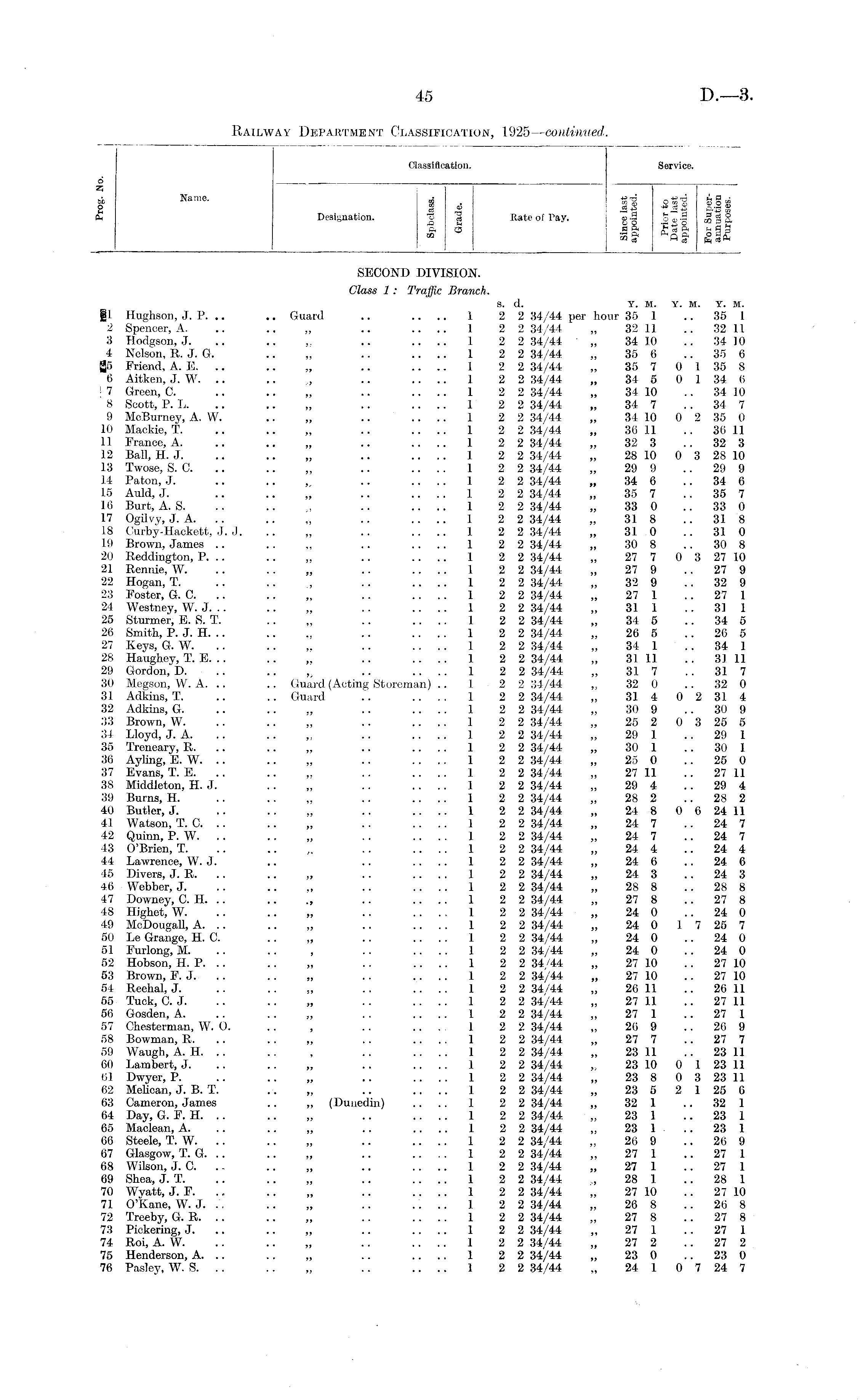 Classification. Service. 0 . 1 Narae - 1 o !| si| |!g Ot Designation. jg g Hate of Pay. g o S £ m Sg 1 gift SECOND DIVISION. Class 1: Traffic Branch. s. d. Y. M. Y. M. Y. M. 11 Hughson, J. P. .. .. Guard .. .... 1 2 2 34/44 per hour 35 1 .. 35 1 ■2 Spencer, A. .. .. „ .. .... 1 2 2 34-/44 „ 32 11 .. 32 1.1 3 Hodgson, J. .. .. .. .... 1 2 2 34/44 ' „ 34 10 .. 34 10 4 Nelson, R. J. G. .. „ .. .... 1 2 2 34/44 „ 35 6 .. 35 6 g5 Friend, A. IS. .. .. „ .. .... 1 2 2 34/44 „ 35 7 0 1 35 8 6 Aitken, J. W. .. .. „ .. .... 1 2 2 34/44 „ 34 5 0 1 34 6 f 7 Green, 0. .. .. „ .. .... 1 2 2 34/44- „ 34 10 .. 34 10 8 Seott, P. L. .. .. „ .. .... 1 2 2 34/44 „ 34 7 .. 34 7 9 McBurney, A. W. .. „ .. .... 1 2 2 34/44 „ 34 10 0 2 35 0 10 Mackie, T. .. .. „ .. .... 1 2 2 34/44 „ 36 11 .. 36 11 11 France, A. .. .. „ .. .... 1 2 2 34/44 „ 32 3 .. 32 3 12 Ball, H. J. .. .. „ .. .... 1 2 2 34/44 „ 28 10 0 3 28 10 13 Twose, S. C. .. „ .. .... 1 2 2 34/44 „ 29 9 .. 29 9 14 Paton, J. .. .. „ .. .... 1 2 2 34/44 „ 34 6 34 6 15 Auld, J. .. .. „ .. .... 1 2 2 34/44 „ 35 7 .. 35 7 JO Burt, A. S. .. .. , .. .... I 2 2 34/44 „ 33 0 33 0 17 Ogilvy, J. A. .. .. „ .. .... 1 2 2 34/44 „ 31 8 .. 31 8 18 Curby-Hackett, J. J. .. „ .. .... 1 2 2 34/44 „ 31 0 .. 31 0 19 Brown, James .. .. ,, .. .... 1 2 2 34/44 „ 30 8 .. 30 8 20 Reddington, P. .. .. „ .. .... 1 2 2 34/44 „ 27 7 0 3 27 10 21 Rennie, W. .. .. „ .. .... 1 2 2 34/44 „ 27 9 .. 27 9 22 Hogan, T. .. .. , .. .... 1 2 2 34/44 „ 32 9 32 9 23 Foster, G. G. .. .. „ .. .... 1 2 2 34/44 „ 27 1 27 1 24 Westney, W. J. .. .. „ .. .... 1 2 2 34/44 „ 31 1 31 1 25 Sturmer, E. S. T. .. „ .. .... 1 2 2 34/44 „ 34 5 .. 34 5 26 Smith, P. J. H. .. .. .. .... 1 2 2 34/44 „ 26 5 .. 26 5 27 Keys, G. W. .. ,. .. .... 1 2 2 34/44 „ 34 1 .. 34 1 28 Haughey, T. E. .. .. „ .. .... 1 2 2 34/44 „ 31 11 .. 31 11 29 Gordon, D. .. .. .. .... 1 2 2 34/44 „ 31 7 31 7 30 Megson, W. A. .. .. Guard (Acting Storeman) .. 1 2 2 34/44 „ 32 0 32 0 31 Adkins, T. .. .. Guard .. .... 1 2 2 34/44 „ 31 4 0 2 31 4 32 Adkins, G. .. .. „ .. .... 1 2 2 34/44 „ 30 9 30 9 33 Brown, W. .. .. „ .. .... 1 2 2 34/44 „ 25 2 0 3 25 5 34 Lloyd, J. A. .. „ .. .... 1 2 2 34/44 „ 29 1 .. 29 1 35 Treneary, R. .. .. „ .. .... 1 2 2 34/44 „ 30 1 .. 30 1 36 Ayling, E. W. .. .. „ .. .... 1 2 2 34/44 „ 25 0 25 0 37 Evans, T. E. .. .. „ .. .... 1 2 2 34/44 „ 27 11 .. 27 11 38 Middleton, H. J. .. „ .. .... 1 2 2 34/44 „ 29 4 .. 29 4 39 Burns, H. .. .. „ .. .... 1 2 2 34/44 „ 28 2 .. 28 2 40 Butler, J. .. .. „ .. .... 1 2 2 34/44 „ 24 8 0 6 24 11 41 Watson, T. C. .. .. „ .. .... 1 2 2 34/44 „ 24 7 24 7 42 Quinn, P. W. .. .. „ .. .... 1 2 2 34/44 „ 24 7 .. 24 7 43 O'Brien, T. .. .. „ .. .... 1 2 2 34/44 „ 24 4 .. 24 4 44 Lawrence, W. J. .. .. .... 1 2 2 34/44 „ 24 6 .. 24 6 45 Divers, J. R. .. .. „ .. .... 1 2 2 34/44 „ 24 3 .. 24 3 46 Webber, J. .. .. „ .. .... 1 2 2 34/44 „ 28 8 .. 28 8 47 Downey, C. H. .. .. ., .. .... 1 2 2 34/44 „ 27 8 27 8 48 Highet, W. .. .. „ .. .... 1 2 2 34/44 „ 24 0 .. 24 0 49 McDougall, A. .. .. „ .. .... 1 2 2 34/44 „ 24 0 1 7 25 7 50 Le Grange, H. C. .. „ .. .... 1 2 2 34/44 „ 24 0 24 0 51 Furlong, M. .. .. , .. .... 1 2 2 34/44 „ 24 0 .. 24 0 52 Hobson, H. P. .. .. „ .. .... 1 2 2 34/44 „ 27 10 27 10 53 Brown, F. J. .. .. „ .. .... 1 2 2 34/44 „ 27 10 .. 27 10 54 Reehal, J. .. .. „ .. .... 1 2 2 34/44 „ 26 11 .. 26 11 55 Tuck, 0. J. .. .. „ .. .... 1 2 2 34/44 „ 27 11 .. 27 11 56 Gosden, A. .. .. „ .. .... 1 2 2 34/44 „ 27 1 27 1 57 Chesterman, W. O. .. , .. .... 1 2 2 34/44 „ 26 9 .. 26 9 58 Bowman, R. .. „ .. .... 1 2 2 34/44 „ 27 7 27 7 59 Waugh, A. H. .. .. , .. .... 1 2 2 34/44 „ 23 11 .. 23 11 60 Lambert, J. .. .. „ .. .... 1 2 2 34/44 „ 23 10 0 1 23 11 61 Dwyer, P. .. .. „ .. .... 1 2 2 34/44 „ 23 8 0 3 23 11 62 Melican, J. B. T. .. „ .. .... 1 2 2 34/44 „ 23 5 2 1 25 6 63 Cameron, James .. „ (Duuedin) .. .. 1 2 2 34/44 „ 32 1 .. 32 1 64 Day, G. F. H. .. .. „ .. .... 1 2 2 34/44 „ 23 1 .. 23 1 65 Maclean, A. .. .. „ .. .... 1 2 2 34/44 „ 23 1 23 1 66 Steele, T. W. .. .. „ .. .... 1 2 2 34/44 „ 26 9 .. 26 9 67 Glasgow, T. G. .. .. „ .. .... 1 2 2 34/44 „ 27 1 27 1 68 Wilson, J. C. . - .. „ .. .... 1 2 2 34/44 „ 27 1 .. 27 1 69 Shea, J. T. .. .. „ .. .... 1 2 2 34/44 .., 28 1 .. 28 1 70 Wvatt, J. F. .. „ .. .... 1 2 2 34/44 „ 27 10 .. 27 10 71 O'Kane, W. J. .. .. „ .. .... 1 2 2 34/44 „ 26 8 .. 26 8 72 Treeby, G. R. .. .. „ .. .... 1 2 2 34/44 „ 27 8 .. 27 8 73 Pickering, J. .. „ .. .... 1 2 2 34/44 „ 27 1 27 1 74 Roi, A. W. .. .. „ .. .... 1 2 2 34/44 „ 27 2 27 2 75 Henderson, A. .. .. „ .. .... 1 2 2 34/44 „ 23 0 .. 23 0 76 Pasley, W. S. .. .. „ .. .... 1 2 2 34/44 „ 24 1 0 7 24 7
