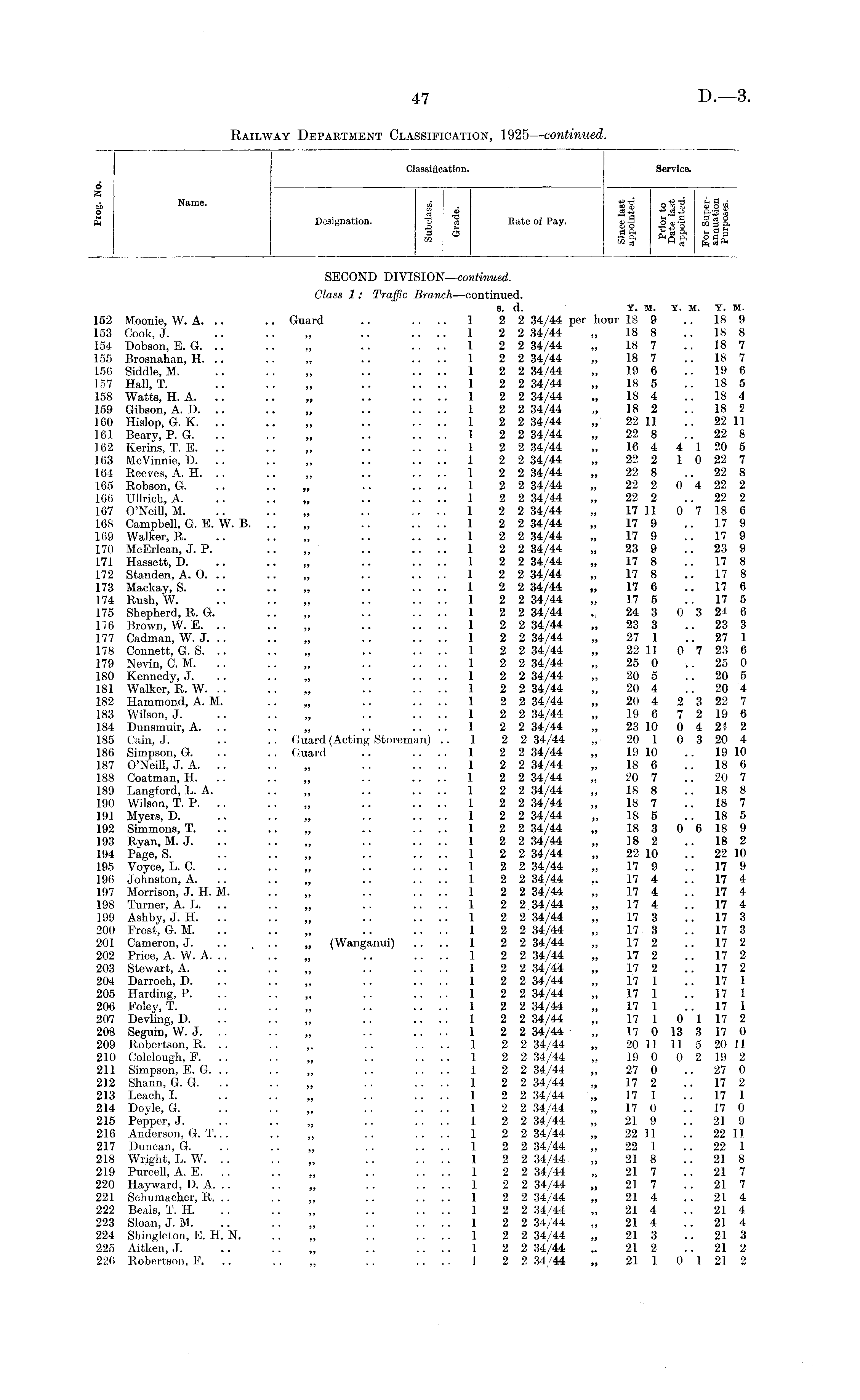 Classification. Service. o & <4 Name. j |-g o|1 § g» o c§,2 ,5 43 .5 43 BS « & Designation. o d Bate of Pay. g -9 o <u 03 § §, ® 33 §• 1 g§(S SECOND DIVISION—continued. Class 1: Traffic Branch—continued. s. d. Y. m. Y. m. Y. M. 152 Moonie, W. A. .. .. Guard .. .... 1 2 2 34/44 per hour 189 .. 18 9 153 Cook, J. .. .. „ .. .... 1 2 2 34/44 „ 18 8 .. 18 8 154 Dobson, E. G. .. .. „ .. .... 1 2 2 34/44 „ 18 7 18 7 155 Brosnahan, H. .. .. „ .. .... 1 2 2 34/44 „ 18 7 ..187 156 Siddle, M. .. .. „ .. .... 1 2 2 34/44 „ 19 6 19 6 157 Hall, T. .. .. „ .. .... 1 2 2 34/44 „ 18 5 .. 18 5 158 Watts, H. A. .. .. „ .. .... 1 2 2 34/44 „ 18 4 .. 18 4 159 Gibson, A. D. .. .. „ .. .... 1 2 2 34/44 „ 182 18 2 160 Hislop, G. K. .. .. „ .. .... 1 2 2 34/44 „ 22 11 .. 22 11 161 Beary, P. G. .. .. „ .. .... 1 2 2 34/44 „ 22 8 .. 22 8 162 Kerins, T. E. .. .. „ .. .... 1 2 2 34/44 „ 16 4 4 1 20 5 163 McVinnie, D. .. .. „ .. .... 1 2 2 34/44 „ 22 2 1 0 22 7 164 Reeves, A. H. .. .. „ .. .... 1 2 2 34/44 „ 22 8 .. 22 8 165 Robson, G. .. .. „ .. .... 1 2 2 34/44 „ 22 2 0 4 22 2 166 Ullrich, A. .. .. „ .. .... 1 2 2 34/44 „ 22 2 .. 22 2 167 O'Neill, M. .. .. „ .. .... 1 2 2 34/44 „ 17 11 0 7 18 6 168 Campbell, G. E. W. B. .. „ .. .... 1 2 2 34/44 „ 17 9 17 9 169 Walker, R. .. .. „ .. .... 1 2 2 34/44 „ 17 9 ..179 170 McErlean, J. P. .. „ .. .... 1 2 2 34/44 „ 23 9 .. 23 9 171 Hassett, D. .. .. „ .. .... 1 2 2 34/44 „ 17 8 17 8 172 Standen, A. 0. .. .. „ .. .... 1 2 2 34/44 „ 17 8 ..178 173 Mackay, S. .. .. „ .. .... 1 2 2 34/44 „ 17 6 .. 17 6 174 Rush, W. .. .. „ .. .... 1 2 2 34/44 „ 17 5 17 5 175 Shepherd, R. G. .. „ .. .... 1 2 2 34/44 ,, 24 3 0 3 24 6 176 Brown, W. E. .. .. „ .. .... 1 2 2 34/44 „ 23 3 .. 23 3 177 Cadman, W. J. .. .. „ .. .... 1 2 2 34/44 „ 27 1 .. 27 1 178 Connett, G. S. .. .. „ .. .... 1 2 2 34/44 „ 22 11 0 7 23 6 179 Nevin, C. M. .. .. „ .. .... 1 2 2 34/44 „ 25 0 .. 25 0 180 Kennedy, J. .. „ .. .... 1 2 2 34/44 „ 20 5 .. 20 5 181 Walker, R. W. .. .. „ .. .... 1 2 2 34/44 „ 20 4 .. 20 4 182 Hammond, A. M. .. „ .. .... 1 2 2 34/44 „ 20 4 2 3 22 7 183 Wilson, J. .. .. „ .. .... 1 2 2 34/44 „ 19 6 7 2 19 6 184 Dunsmuir, A. .. .. „ .. .... 1 2 2 34/44 „ 23 10 0 4 24 2 185 Cain, J. .. .. Guard (Acting Storeman) .. 1 2 2 34/44 „■ 20 1 0 3 20 4 186 Simpson, G. .. .. Guard .. .... 1 2 2 34/44 „ 19 10 .. 19 10 187 O'Neill, J. A. .. .. „ .. .... 1 2 2 34/44 „ 18 6 18 6 188 Coatman, H. .. .. „ .. .... 1 2 2 34/44 „ 20 7 .. 20 7 189 Langford, L. A. .. „ .. .... 1 2 2 34/44 „ IS 8 18 8 190 Wilson, T. P. .. .. „ .. .... 1 2 2 34/44 „ 18 7 18 7 191 Myers, D. .. .. „ .. .... 1 2 2 34/44 „ 18 5 18 5 192 Simmons, T. .. „ .. .... 1 2 2 34/44 „ 18 3 0 6 18 9 193 Ryan, M. J. .. .. „ .. .... 1 2 2 34/44 „ 18 2 18 2 194 Page, S. .. .. „ .. .... 1 2 2 34/44 „ 22 10 .. 22 10 195 Voyce, L. C. .. „ .. .... 1 2 2 34/44 „ 17 9 .. 17 9 196 Johnston, A. .. .. „ .. .... 1 2 2 34/44 .. 17 4 17 4 197 Morrison, J. H. M. .. „ .. .... 1 2 2 34/44 „ 17 4 17 4 198 Turner, A. L. .. .. „ . . .... 1 2 2 34/44 „ 17 4 17 4 199 Ashby, J. H. .. .. „ .. .... 1 2 2 34/44 „ 17 3 .. 17 3 200 Frost, G. M. .. „ .. .... 1 2 2 34/44 „ 17 3 .. 17 3 201 Cameron, J. .. „ (Wanganui) .... 1 2 2 34/44 „ 17 2 ..172 202 Price, A. W. A. .. .. „ .. .... 1 2 2 34/44 „ 17 2 17 2 203 Stewart, A. .. .. „ .. .... 1 2 2 34/44 „ 17 2 .. 17 2 204 Darroch, D. .. .. „ .. .... 1 2 2 34/44 „ 17 1 17 1 205 Harding, P. .. .. „ .. .... 1 2 2 34/44 „ 17 1 17 1 206 Foley, T. .. .. „ .. .... 1 2 2 34/44 „ 17 1 .. 17 1 207 Devling, D. .. .. „ .. .... 1 2 2 34/44 „ 17 1 0 1 17 2 208 Seguin, W. J. .. .. „ .. .... 1 2 2 34/44 „ 17 0 13 3 17 0 209 Robertson, R. .. .. „ .. .... 1 2 2 34/44 „ 20 11 11 5 20 11 210 Colclough, F. .. .. „ .. .... 1 2 2 34/44 „ 19 0 0 2 19 2 211 Simpson, E. G. .. .. „ .. .... 1 2 2 34/44 „ 27 0 27 0 212 Shann, G. G. .. .. „ .. .... 1 2 2 34/44 „ 17 2 17 2 213 Leach, I. .. .. „ .. .... 1 2 2 34/44 „ 17 1 .. 17 1 214 Doyle, G. .. .. „ .. .... 1 2 2 34/44 „ 17 0 17 0 215 Pepper, J. .. .. „ .. .... 1 2 2 34/44 „ 21 9 21 9 216 Anderson. G. T... .. „ .. .... 1 2 2 34/44 „ 22 11 .. 22 11 217 Duncan, G. . . .. „ .. .... 1 2 2 34/44 „ 22 1 .. 22 1 218 Wright, L. W. .. .. „ .. .... 1 2 2 34/44 „ 21 8 .. 21 8 219 Purcell, A. E. .. .. „ .. .... 1 2 2 34/44 „ 21 7 .. 21 7 220 Hayward, D. A. .. .. „ .. .... 1 2 2 34/44 „ 21 7 21 7 221 Schumacher, R. .. .. „ .. .... 1 2 2 34/44 „ 21 4 .. 21 4 222 Beals, T. H. .. .. „ .. .... 1 2 2 34/44 „ 21 4 .. 21 4 223 Sloan, J. M. .. .. „ .. .... 1 2 2 34/44 „ 214 21 4 224 Shingleton, E. H. N. .. „ .. .... 1 2 2 34/44 „ 21 3 .. 21 3 225 Aitken, J. .. .. „ .. .... 1 2 2 34/44 ,. 21 2 .. 21 2 226 Robertson, F. .. .. „ .. .... 1 2 2 34/44 „ 21 1 0 1 21 2