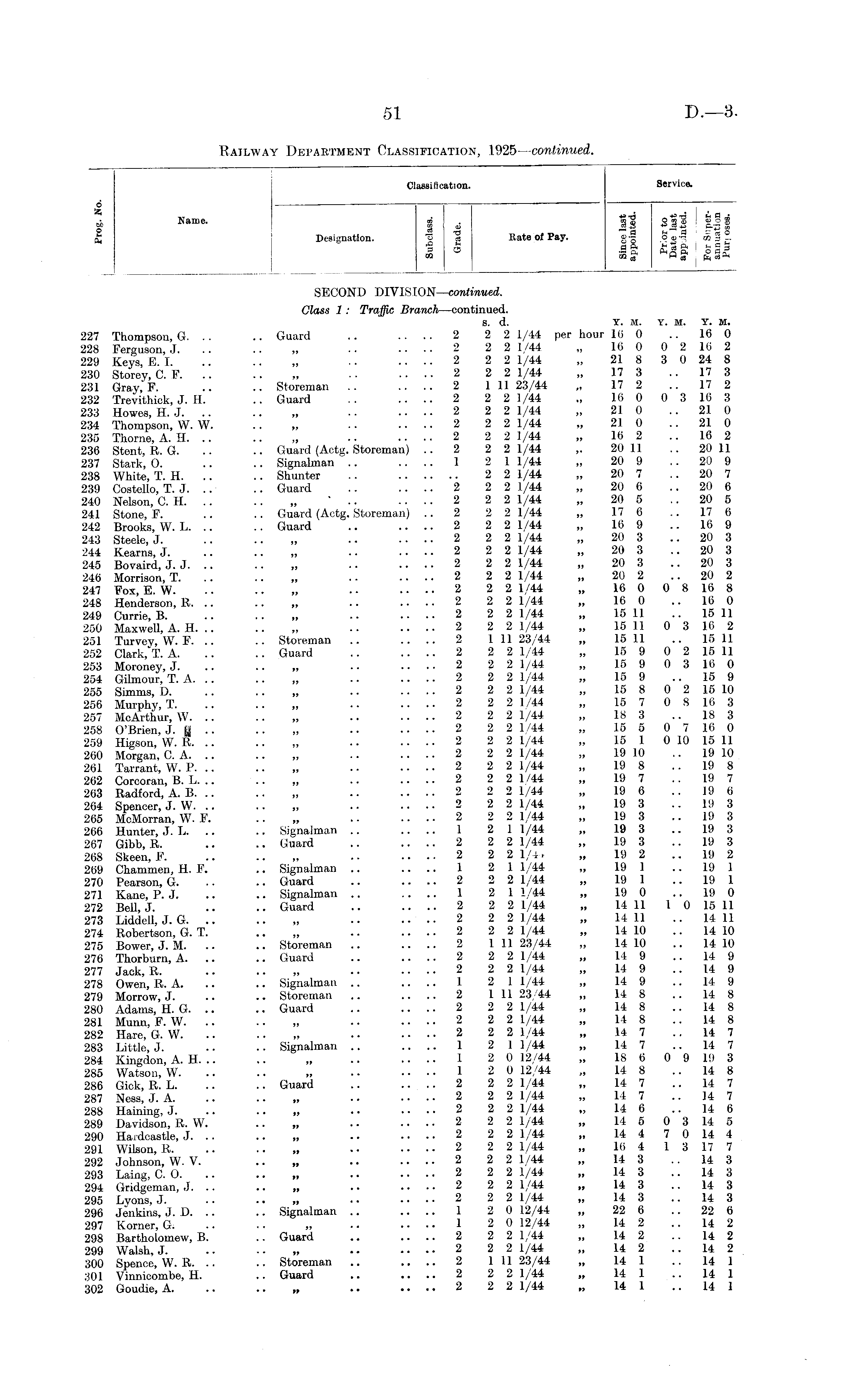 Classification. Service. o — — " j g Name - I a |1 S|| ! ||i £ Designation. 'o g Rate of Pay. £■§ o a> ] m a ?- m ° I« ! lis m 1/2 eS SECOND DIVISION—continued. Glass 1 : Traffic Branch—continued. 8. d. Y. M. Y. M. Y. M. 227 Thompson, G. .. .. Guard .. .... 2 2 2 1/44 per hour 16 0 .. 16 0 228 Ferguson, J. .. .. „ .... 2 2 2 1/44 „ 16 0 0 2 16 2 229 Keys, E. I. .. .. „ .. .... 2 2 2 1/44 „ 21 8 3 0 24 8 230 Storey, C. F. .. .. „ •• .... 2 2 2 1/44 „ 17 3 .. 17 3 231 Gray, F. .. .. Storeman .. .... 2 I 11 23/44 „ 17 2 .. 17 2 232 Trevithick, J. H. .. Guard .. .... 2 2 2 1/44 „ 160 03163 233 Howes, H. J. .. .. „ .. .... 2 2 2 1/44 „ 21 0 .. 21 0 234 Thompson, W. W. .. „ •. .... 2 2 2 1/44 „ 21 0 .. 21 0 230 Thorne, A. H. .. .. ,, .. .... 2 2 2 1/44 ,, 16 2 .. 16 2 236 Stent, R. G. .. .. Guard (Actg. Storeman) .. 2 2 2 1/44 ,. 20 11 .. 20 11 237 Stark, O. .. .. Signalman .. .... 1 2 1 1/44 „ 20 9 .. 20 9 238 White, T. H. .. .. Shunter .. 2 2 1/44 „ 20 7 .. 20 7 239 Costello, T. J. .. .. Guard .. .... 2 2 2 1/44 „ 20 6 .. 20 6 240 Nelson, C. H. .. .. „ " .. .... 2 2 2 1/44 „ 20 5 .. 20 5 241 Stone, F. .. .. Guard (Actg. Storeman) .. 2 2 2 1/44 „ 17 6 .. 17 6 242 Brooks, W. L. .. .. Guard .. .... 2 2 2 1/44 „ 169 ..169 243 Steele, J 2 2 2 1/44 „ 20 3 .. 20 3 244 Kearns, J. .. .. „ •• .... 2 2 2 1/44 „ 20 3 20 3 245 Bovaird, J. J. .. „ .. .... 2 2 2 1/44 ,, 20 3 .. 20 3 246 Morrison, T. .. .. „ .. .... 2 2 2 1/44 „ 20 2 20 2 247 Fox, E. W. .. .. „ . • .... 2 2 2 1/44 „ 16 0 0 8 16 8 248 Henderson, R. .. .. „ .. .... 2 2 2 1/44 „ 16 0 .. 16 0 249 Currie, B. .. .. „ .. .... 2 2 2 1/44 „ 15 11 .. 15 11 250 Maxwell, A. H. .. .. „ .. .... 2 2 2 1/44 „ 15 11 0 3 16 2 251 Turvev, W. F. .. .. Storeman .. .... 2 111 23/44 „ 15 11 .. 15 11 252 Clark, T. A. .. .. Guard .. .... 2 2 2 1/44 „ 15 9 0 2 15 11 253 Moroney, J. .. .. ,, .. .... 2 2 2 1/44 „ 15 9 0 3 16 0 254 Gilmour, T. A. .. .. „ .. .... 2 2 2 1/44 „ 15 9 .. 15 9 255 Simms, D. .. .. „ .. .... 2 2 2 1/44 „ 15 8 0 2 15 10 256 Murphy, T. .. .. „ .. .... 2 2 2 1/44 „ 15 7 0 8 16 3 257 McArthur, W. .. .. „ .. .... 2 2 2 1/44 „ 18 3 .. 18 3 258 O'Brien, J. U ■■ .. „ .. .... 2 2 2 1/44 „ 15 5 0 7 16 0 259 Higson, W. R. .. .. „ •• .... 2 2 2 1/44 „ 15 1 0 10 15 11 260 Morgan, C. A. .. ,, .. .... 2 2 2 1/44 „ 19 10 .. 19 10 261 Tarrant, W. P. .. .. ,, .. .... 2 2 2 1/44 „ 19 8 .. 19 8 262 Corcoran, B. L. .. .. „ .. .... 2 2 2 1/44 ,, 19 7 .. 19 7 263 Radford, A. B. .. .. „ .. .... 2 2 2 1/44 „ 19 6 19 6 264 Spencer, J. W. .. .. „ .. .... 2 2 2 1/44 „ 19 3 .. 19 3 265 McMorran, W. F. .. „ .. .... 2 2 2 1/44 „ 19 3 .. 19 3 266 Hunter, J. L. .. .. Signalman .. .... 1 2 1 1/44 „ 19 3 .. 19 3 267 Gibb, R. .. .. Guard .. .... 2 2 2 1/44 „ 19 3 19 3 268 Skeen, F. .. .. ,, •• .... 2 2 2 1/4 ► „ 19 2 .. 19 2 269 Chammen, H. F. .. Signalman .. .... 1 21 1/44 „ 19 1 .. 191 270 Pearson, G. . • .. Guard .. .... 2 2 2 1/44 ,, 19 1 .. 19 1 271 Kane, P. J, .. .. Signalman .. .... 1 21 1/44 „ 19 0 19 0 272 Bell, J. .. .. Guard .. .... 2 2 2 1/44 „ 14 11 10 15 11 273 Liddell, J. G. .. .. „ .. .... 2 2 2 1/44 „ 14 11 .. 14 11 274 Robertson, G. T. .. ,, .. .... 2 2 2 1/44 „ 14 10 .. 14 10 275 Bower, J. M. .. .. Storeman .. .... 2 1 11 23/44 „ 14 10 .. 14 10 276 Thorburn, A. .. .. Guard .. .... 2 2 2 1/44 „ 14 9 .. 14 9 277 Jack,R. .. .. „ .. .... 2 22 1/44 „ 14 9 14 9 278 Owen, R. A. .. .. Signalman .. .... 1 2 1 1/44 „ 14 9 .. 14 9 279 Morrow, J. .. .. Storeman .. .... 2 111 23/44 „ 148 .. 148 280 Adams, H. G. .. .. Guard .. .... 2 2 2 1/44 „ 14 8 14 8 281 Munn, F. W. .. .. „ .. .... 2 2 2 1/44 „ 14 8 14 8 282 Hare, G. W. .. .. „ .. .... 2 2 2 1/44 „ 14 7 14 7 283 Little, J. .. .. Signalman .. .... 1 2 1 1/44 „ 14 7 .. 14 7 284 Kingdon, A. H. .. .. „ .. .... 1 2 0 12/44 „ 18 6 0 9 19 3 285 Watson, W. .. .. „ .. .... 1 2 0 12/44 „ 14 8 14 8 286 Gick, R. L. .. .. Guard .. .... 2 2 2 1/44 „ 14 7 14 7 287 Ness, J. A 2 2 2 1/44 „ 14 7 .. 14 7 288 Haining, J. .. .. ,, • • .... 2 2 2 1/44 „ 14 6 .. 146 289 Davidson, R. W. .. „ .. .... 2 2 2 1/44 ,, 14 5 0 3 14 5 290 Hardcastle, J. .. .. „ .. .... 2 2 2 1/44 „ 14 4 7 0 14 4 291 Wilson, R. .. .. „ . • .... 2 2 2 1/44 „ 164 13177 292 Johnson, W. V. .. „ .• .... 2 2 2 1/44 „ 14 3 .. 14 3 293 Laing, C. O. .. .. ,, .. .... 2 2 2 1/44 „ 14 3 .. 14 3 294 Gridgeman, J. .. .. „ .. .... 2 2 2 1/44 „ 14 3 .. 14 3 295 Lyons, J. .. .. ,, .. .... 2 2 2 1/44 „ 14 3 .. 14 3 296 Jenkins, J. D. .. .. Signalman .. .... 1 2 0 12/44 „ 22 6 .. 22 6 297 Korner, G. .. .. „ .. .... 1 2 0 12/44 „ 14 2 .. 14 2 298 Bartholomew, B. .. Guard .. .... 2 2 2 1/44 „ 14 2 .. 14 2 299 Walsh, J. .. .. „ .. .... 2 2 2 1/44 „ 14 2 14 2 300 Spence, W. R. .. .. Storeman .. .... 2 1 11 23/44 „ 14 1 .. 14 1 301 Vinnicombe, H. .. Guard .. .... 2 2 2 1/44 „ 14 1 .. 14 1 302 Goudie, A. .. .. » .. .... 2 2 2 1/44 „ 14 1 .. 141