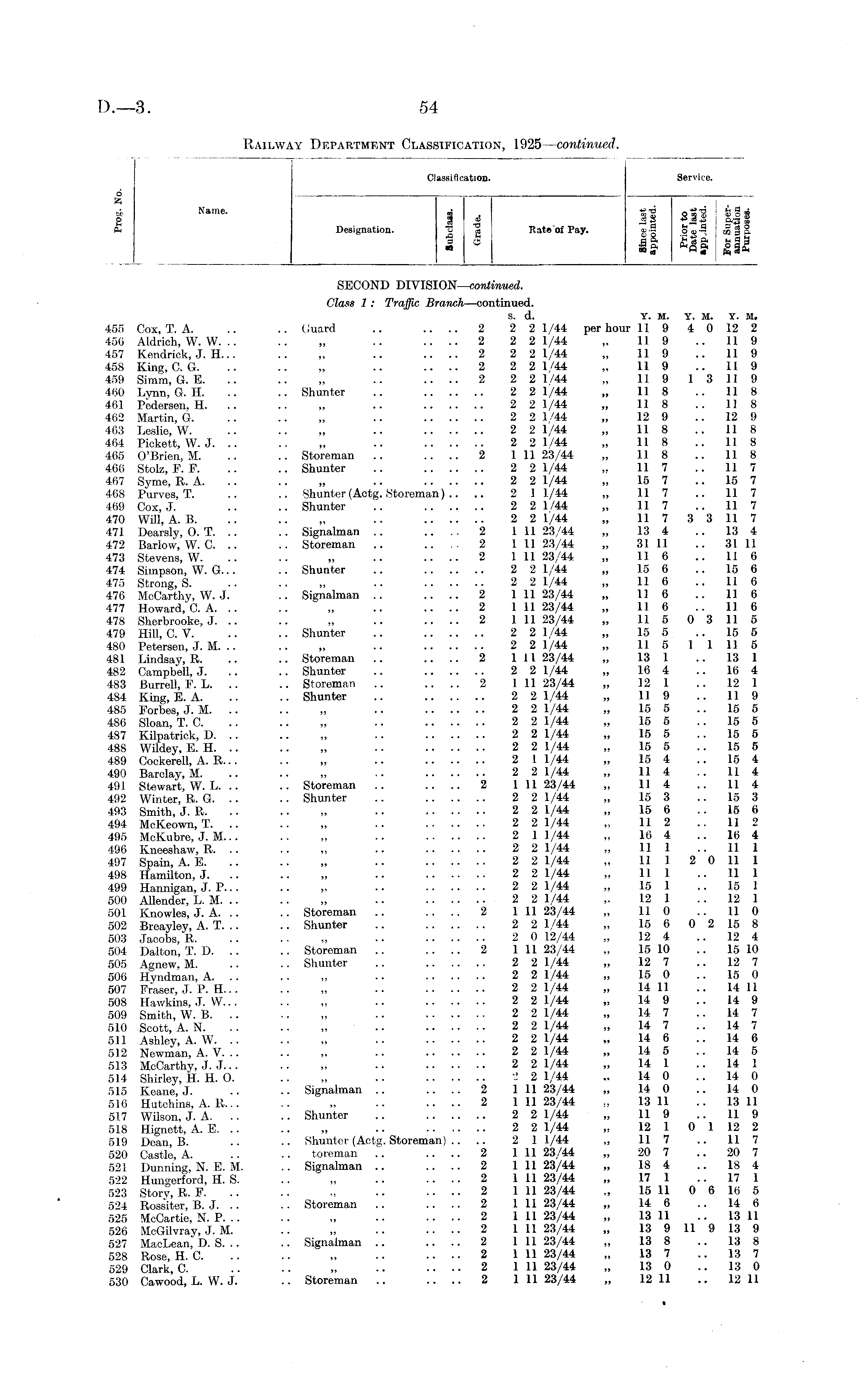 Classification. Service. o fc i <a Name - i . I'g oizi ! g 3 « ■! ««« ag & cn Designation. ~ a Kate of Pay. ®-S Se-9 j m § H. •§£ §S.„ctja|Mga » 59 a? s-! SECOND DIVISION—continued. Class 1: Traffic Branch—continued. S. d. Y. M. Y. M. Y. M, 455 Cox, T. A. .. .. Guard .. .... 2 2 2 1/44 per hour 11 9 4 0 12 2 456 Aldrich, W. W. .. .. „ .. .... 2 2 2 1/44 „ 11 9 11 9 457 Kendrick, J. H... .. „ .. .... 2 2 2 1/44 „ 11 9 11 9 458 King, C. G. .. .. „ .. .... 2 2 2 1/44 „ 11 9 11 9 459 Simm, G. E. .. .. „ .. .... 2 2 2 1/44 „ 11 9 1 3 11 9 460 Lynn, G. H. .. .. Shunter .. 2 2 1/44 „ 11 8 11 8 461 Pedersen. H. .. .. „ .. 2 2 1/44 „ 11 8 .. 11 8 462 Martin, G. .. .. „ .. 2 2 1/44 „ 12 9 12 9 463 Leslie, W. .. .. „ .. 2 2 1/44 „ 11 8 11 8 464 Pickett, W.J. .. .. „ .. 2 2 1/44 „ 11 8 .. 11 8 465 O'Brien, M. .. .. Storeman .. .... 2 1 11 23/44 ,, 11 8 .. 11 8 466 Stolz, P. F. .. .. Shunter .. 2 2 1/44 „ 11 7 .. 11 7 467 Syme, R. A. .. .. „ .. 2 2 1/44 „ 15 7 15 7 468 Purves, T. .. .. Shunter (Actg. Storeman) .... 2 1 1/44 „ 117 .. 117 469 Cox, J. .. .. Shunter .. 2 2 1/44 „ 11 7 .. 11 7 470 Will, A. B 2 2 1/44 „ 11 7 3 3 11 7 471 Dearsly, 0. T. .. .. Signalman .. .... 2 1 11 23/44 „ 13 4 .. 13 4 472 Barlow, W. C. .. .. Storeman .. .... 2 1 11 23/44 „ 31 11 .. 31 11 473 Stevens, W. .. .. ,, .. .... 2 1 11 23/44 „ 11 6 .. 11 6 474 Simpson, W. G... .. Shunter .. 2 2 1/44 „ 15 6 .. 15 6 475 Strong, S. .. .. „ 2 2 1/44 „ 11 6 .. 11 6 476 McCarthy, W. J. .. Signalman .. .... 2 1 11 23/44 „ 11 6 .. 11 6 477 Howard, C. A „ 2 1 11 23/44 „ 11 6 .. 11 6 478 Sherbrooke, J. .. .. ,, .. .... 2 1 11 23/44 „ 115 03115 479 Hill, C. V. .. .. Shunter .. 2 2 1/44 „ 15 5 15 5 480 Petersen, J. M. .. .. „ .. 2 2 1/44 ,, 115 1 1 115 481 Lindsay, R. .. .. Storeman .. .... 2 111 23/44 „ 13 1 .. 13 1 482 Campbell, J. .. .. Shunter .. 2 2 1/44 „ 16 4 16 4 483 Burrell, F. L. .. .. Storeman .. .... 2 I 11 23/44 „ 12 1 .. 12 1 484 King, E. A. .. .. Shunter .. 2 2 1/44 „ 11 9 .. 11 9 485 Forbes, J. M. .. .. „ .. 2 2 1/44 „ 15 5 15 5 486 Sloan, T. C. .. .. „ .. 2 2 1/44 „ 15 5 15 5 487 Kilpatrick, D. .. .. „ .. 2 2 1/44 „ 15 5 .. 15 5 488 Wildey, E. H. .. .. „ .. 2 2 1/44 „ 15 5 15 5 489 Cockerell, A. R... .. ,, .. 2 1 1/44 „ 15 4 .. 15 4 490 Barclay, M. .. .. ,, .. 2 2 1/44 ,, 11 4 .. 11 4 491 Stewart, W. L. .. .. Storeman .. .... 2 1 11 23/44 „ 11 4 .. 11 4 492 Winter, R. G. .. .. Shunter .. 2 2 1/44 „ 15 3 .. 15 3 493 Smith, J. R. .. „ .. 2 2 1/44 „ 15 6 15 6 494 McKeown, T. .. .. „ .. 2 2 1/44 „ 11 2 11 2 495 McKubre, J. M... .. ,, .. 2 1 1/44 ,, 16 4 .. 16 4 496 Kneeshaw, R. .. .. ,, .. 2 2 1/44 ,, 11 1 .. 11 1 497 Spain, A. E. .. .. ,, .. 2 2 1/44 „ 11 1 2 0 11 1 498 Hamilton, J. .. .. „ •• 2 2 1/44 ,, 11 1 .. 11 1 499 Hannigan, J. P... .. „ .. 2 2 1/44 „ 15 1 .. 15 1 500 Allender, L. M. .. .. „ .. 2 2 1/44 ,. 12 1 12 1 501 Knowles, J. A. .. .. Storeman .. .. .. 2 111 23/44 ,, 11 0 .. 11 0 502 Breayley, A. T. .. .. Shunter .. 2 2 1/44 ,, 15 6 0 2 15 8 503 Jacobs, R. .. . - „ .. 2 0 12/44 „ 12 4 12 4 504 Dalton, T. D. .. .. Storeman .. .... 2 1 11 23/44 „ 15 10 .. 15 10 505 Agnew. M. . ■ .. Shunter .. 2 2 1/44 ,, 12 7 .. 12 7 506 Hyndman, A. .. .. „ .. 2 2 1/44 „ 15 0 15 0 507 Fraser, J. P. H... .. ,, . • 2 2 1/44 „ 14 11 .. 14 11 508 Hawkins, J. VV... .. ,, •. 2 2 1/44 „ 14 9 .. 14 9 509 Smith, W. B. .. .. „ .. 2 2 1/44 „ 14 7 14 7 510 Scott, A. N. .. . ■ ,, . • 2 2 1/44 ,, 14 7 .. 14 7 511 Ashley, A. W. .. .. „ .. 2 2 1/44 „ 14 6 .. 14 6 512 Newman, A. V. .. .. „ . • 2 2 1/44 ,, 14 5 .. 14 5 513 McCarthy, J. J... .. ,, • • 2 2 1/44 ,, 14 1 .. 14 1 514 Shirley, H. H. 0. .. ,, •• 2 2 1/44 ,, 14 0 .. 14 0 515 Keane, J. . • .. Signalman .. .... 2 111 23/44 ,, 14 0 .. 14 0 516 Hutchins, A. R 2 1 11 23/44 „ 13 11 .. 13 11 517 Wilson, J. A. .. .. Shunter .. 2 2 1/44 ,, 11 9 .. 11 9 518 Hignett, A. E. .. .. ,, 2 2 1/44 ,, 12 1 0 1 12 2 519 Dean, B. .. .. Shunter (Actg. Storeman) .. .. 2 1 1/44 „ 11 7 .. 11 7 520 Castle, A. .. • ■ toreman .. .. .. 2 111 23/44 ,, 20 7 .. 20 7 521 Dunning, N. E. M. .. Signalman .. .... 2 1 11 23/44 „ 18 4 .. 18 4 522 Hungerford, H. S. .. ,, .. .... 2 1 11 23/44 „ 17 1 .. 17 1 523 Story, R. F 2 111 23/44 „ 15 11 0 6 16 5 524 Rossiter, B. J. .. .. Storeman .. .... 2 111 23/44 ,, 14 6 .. 14 6 525 McCartie, N. P. .. .. ,, •• .... 2 1 11 23/44 ,, 13 11 .. 13 11 526 McGilvray, J. M. .. „ .. .... 2 1 11 23/44 „ 13 9 11 9 13 9 527 MacLean, D. S. .. .. Signalman .. .... 2 1 11 23/44 „ 13 8 .. 13 8 528 Rose, H. C. .. .. ,, •• .... 2 1 11 23/44 „ 13 7 .. 13 7 529 Clark, C 2 1 11 23/44 „ 13 0 .. 13 0 530 Cawood, L. W. J. •• Storeman .. .... 2 1 11 23/44 ,, 12 11 .. 12 11