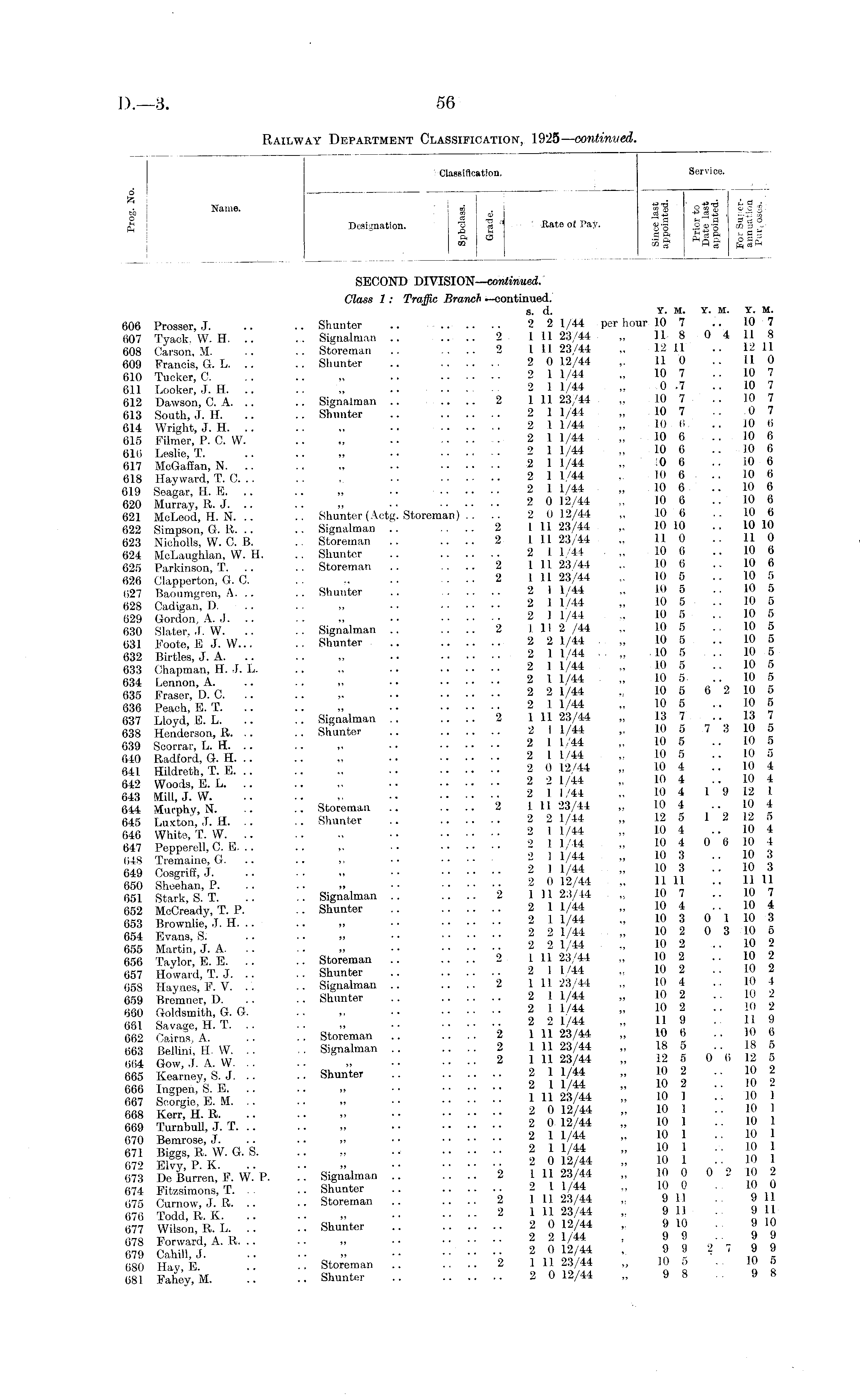 Classification. Service. 5 i o ——-— : j ' , *n Name. « «9Sbo 2 <i> +.) ,£2 1 P--*3 35 £ Designation. £ IS a Hate of Pay. 4>-9 .2S'S 02 § « ® |S lis CO CQ(j H(j fc,(SW SECOND DIVISION—continued. Class 1: Traffic Branch —continued. s. d. Y. M. Y. M. Y. M. 606 Prosser, J. .. .. Shunter .. 2 2 1/44 per hour 10 7 .. 10 7 607 Tyack. W. H. .. ... Signalman .. .... 2 1 11 23/44 „ 11. 8 0 4 11 8 608 Carson, M. .. .. Storeman .. .... 2 1 11 23/44 „ 12 11 .. 12 11 609 Francis, G. L. .. .. Shunter .. 2 0 12/44 „ 11 0 .. 11 0 610 Tucker, C. .. .. „ • • 2 1 1/44 „ 10 7 10 7 611 Looker, J. H. .. .. „ .. 2 1 1/44 . „ 0 .7 .. 10 7 612 Dawson, C. A. .. .. Signalman .. .... 2 1 11 23/44 „ 10 7 JO 7 613 South, J. H. .. .. Shunter .. 2 1 1/44 „ 10 7 .. 0 7 614 Wright, J. H 2 11/44 „ 10 .6. .. 10 b 615 Filmer, P. C. W. .. „ .. 2 1 1/44 „ 10 6 .. 10 6 616 Leslie, T „ 2 1 1/44 „ 10 6 .. 0 6 617 McGafEan, N. .. .. „ •• 2 1 1/44 „ a0 6 .. 10 6 618 Hay ward, T. C 21 1/44 . JO « •• J° £ 619 Sea'gar, H. E. .. .. „ 2 1 1/44 „ 10 6 .. 10 6 620 Murray, R. J. .. .. „ •• 2 0 12/44 „ 10 6 .. 10 6 621 McLeod, H. N. .. .. Shunter (Actg. Storeman) .. .. 2 0 12/44 „ 10 b .. 10 6 622 Simpson, G. R. .. .. Signalman .. .... 2 111 23/44 ,, 10 10 .. 10 10 623 Nicholls, W. C. B. .. Storeman .. .... 2 1 11 23/44 „ .11 0 .. 11 0 624 McLaughlan, W. H. .. Shunter .. 2 1 1/44 ■ „ 10 6 .. 10 6 625 Parkinson, T. .. .. Storeman .. .... 2 111 23/44 ,. 10 6 .. 10 6 626 Clapperton, G. C. .. „ 2 1 11 23/44 10 5 . - JO 5 627 Baoumgren, A. .. .. Shunter .. 2 1 1/44 „ 10 5 .. 10 5 628 Cadigan, D. .. .. „ •• 2 1 1/44 „ 10 5 .. 10 5 629 Gordon, A. J 2 1 1/44 „ 10 5 .. 10 5 630 Slater. J. W. .. .. Signalman .. .... 2 1 11 2/44 „ 10 5 .. 10 5 631 Foote, E J. W... .. Shunter .. 2 2 1/44 „ 10 5 10 5 632 Birtles, J. A. .. .. „ •. 2 1 1/44 „ 10 5 .. 10 5 633 Chapman, H. J. L 2 1 1/44 „ 0 5 .. 10 5 634 Lennon, A 2 1 I/ 44 - 0 »■ ° « 635 Eraser, D. C. .. .. „ • • 2 2 1/44 „ 10 5 6 2 10 5 636 Peach, E. T. .. .. „ • • 2 1 V 44 - JO J* - J® ® 637 Lloyd, E. L. .. .. Signalman .. .... 2 1 11 23/44 „ 13 7 - 13 7 638 Henderson, R. .. .. Shunter .. 2 1 1/44 „ 10 5 7 3 10 5 639 Scorrar, L. H 2 1 1/44 „ 10 5 .. JO 5 640 Radford, G. H 2 1 1/44 „ 10 5 .. 10 5 641 Hildreth, T. E „ 2 0 12/44 „ JO 4 .. 10 4 642 Woods, E. L 2 2 1/44 „ JO 4 10 4 643 Mill J W. .. .. •• 2 1 1/44 „ 10 4 1 9 12 1 644 Murphy, N. .. .. Storeman .. .... 2 1 11 23/44 „ 10 4 .. 10 4 645 Luxton, J. H. .. .. Shunter .. 2 2 1/44 „ 12 5 12 J2 5 646 White, T. W 2 J J/ 44 » ]° 4 •• ® 4 647 Pepperell, C. 2 / 44 - In t 10 3 648 Tremaine, G 2 J/ 44 » JO | .. 10 3 649 Cosgriff, J 2 1 J/ 44 " " J® 650 Sheehan, P. .. .. .» • • 20 ' 2 / 44 " J11 " J' i 651 Stark, S. T. .. .. Signalman .. .... 2 1 11 23/44 . „ JO 7 .. 10 7 652 McCready, T. P. .. Shunter 2 J J/44 „ 10 4 . 10 4 653 Brownlie, J. H 2 1 J/ 44 - 3 ° J J® » 654 Evans, S 22 J/ 44 " ° 0 3 JO 6 655 Martin, J. A. .. .. „ •• 2 2 l'ul± " in 9 " 10 2 656 Taylor, E. E. .. .. Storeman .. .... 2 1 11 23/44 „ JO 2 .. 10 2 657 Howard, T.J. .. .. Shunter .. 2 1/44 „ JO 2 JO 2 658 Haynes, F. V. .. Signalman .. .... 2 1 11 23/44 10 4 JO 4 659 Bremner, D. .. .. Shunter .. 2 1 1/44 „ JO 2 JO 2 660 Goldsmith, G. G. .. ,, •• 2 1 J/ 44 » I. X " hq 661 Savage H T. .. .. „ 2 2 V 44 » 11 9 • 11 9 662 Cairns,A. .. Storeman .. .... 2 1 1J 23/44 „ JO 6 JO 6 663 Bellini, H. W. .. . Signalman 2 J JJ 23/44 „ J8 5 .. J8 5 664 Gow, J. A. W 2 1 1J 23/44 „ J2 5 0 6 J2 o 665 Kearney, S. J. .. .. Shunter .. 2 1 1/44 „ JO 2 • • J° 2 666 Ingpen, S. E " a ? " n ? 667 Soorgie, E. M 11 23/44 „ JO - JO J 668 Kerr, H. R 2 0 J 2 / 44 » JO • • } 669 Turnbull, J. T 2 0 12/44 „ JO .. JO J 670 Bemrose, J „ 2 / 44 " J® '' o 671 Biggs, R. W. G. S 21 /44 „ 0 .. 10 A79 Rlvv P K . . . . „ • • U l-A/k'i „ iU 1 • iu l 673 De Burren, F. W. P. .. Signalman .. .... 2 1 1J 23/44 „ JO 0 0 2 10 2 674 Fitzsimons, T. .. Shunter 2 1 1/44 „ 10 0 10 0 675 Curnow, J. R Storeman 2 J J J 23/44 9 J 9 JJ 676 Todd, R. K „ 2 1 U 23/44 „ 9 I 9 11 677 Wilson, R. L Shunter 2 0 12/44 „ 9 10 9 10 678 Forward, A. R. .. .. „ •• 2 2 J/ 44 > 9 " 679 Cahill, J „ 2 " J 2 / 44 ' 9 » ? ' ® ® 680 Hay, E. .. .. Storeman 2 1 11 23/44 „ 10 o . 10 5 681 Fahey, M. .. .. Shunter .. 2 0 12/44 „ 9 8 9 8