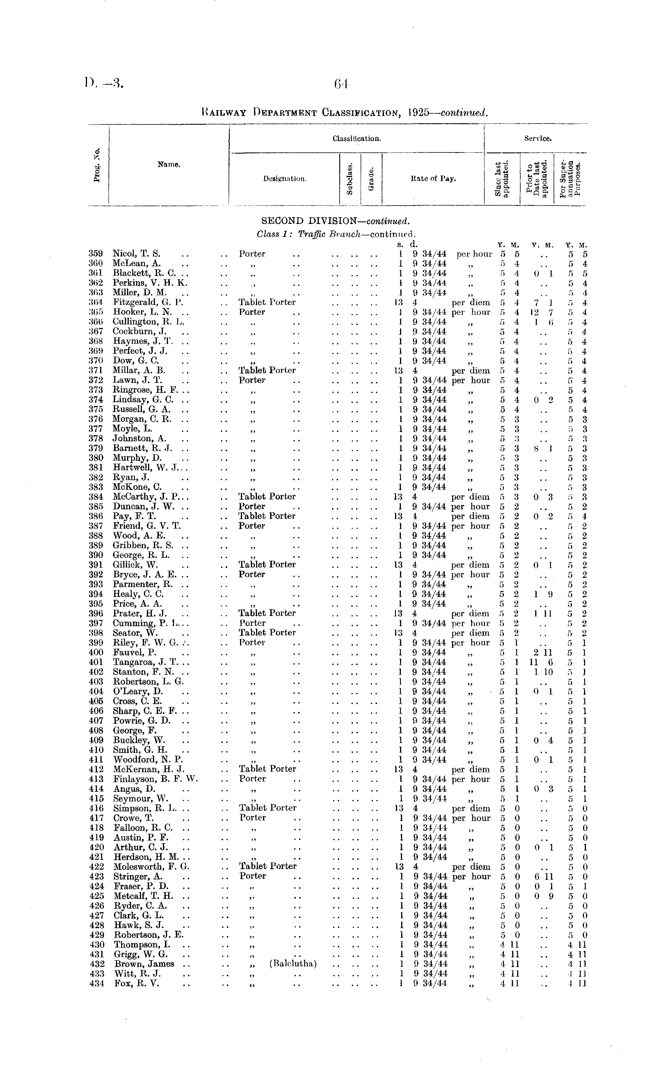 Classification. Service. © __ . ti Name. ,i |-g ofS 8g$ O aj 33 ~ *j ,£2 £ & Designation. % Hate of Pay. a-9 o a>-§ ® 2 H, •D «-« 00'5-<jj0 t_, 3 s Sg filft SgS M w§- £S* SECOND DIVISION —continued. Class 1: Traffic Branch—continued. s. d. Y. M. y. M. Y. M. 359 Nicol, T. S. .. .. Porter .. 1 9 34/44 per hour 5 5 .. 5 5 360 McLean, A. .. .. „ .. 1 9 34/44 „ 5 4 .. 5 4 361 Blackett, R, C. .. .. „ .. 1 9 34/44 „ 5 4 0 1 5 5 362 Perkins, V. H. K. .. ., .. 1 9 34/44 „ 5 4 ., 5 4 363 Miller, D. M. .. .. „ .. 1 9 34/44 „ 5 4 .. 5 4 364 Fitzgerald, G. P. .. Tablet Porter 13 4 per diem 5 4 7 1 5 4 365 Hooker, L. N. .. .. Porter .. 1 9 34/44 per hour 5 4 12 7 5 4 366 Cullington, H . L. .. ,, .. 19 34/44 „ 5 4 1 6 5 4 367 Cockburn, J. .. „ .. 19 34/44 „ 5 4 .. 5 4 368 Haymes, J. T. .. .. .. 19 34/44 „ 5 4- .. 5 4 369 Perfect, J. J. .. „ .. 1 9 34/44 „ 5 4 .. 5 4 370 Dow, G.C. .. .. „ .. 1 9 34/44 „ 5 4 .. 5 4 371 Millar, A. B. .. .. Tablet Porter 13 4 per diem 5 4 .. 5 4 372 Lawn, J. T. .. .. Porter .. 1 9 34/44 per hour 5 4 .. 5 4 373 Ringrose, H. F. .. .. ,, .. 1 9 34/44 „ 5 4 .. 5 4 374 Lindsay, G. C. .. .. „ .. 1 9 34/44 „ 5 4 0 2 5 4 375 Russell, G. A. .. .. „ .. 1 9 34/44 „ 5 4 .. 5 4 376 Morgan, C. R. .. .. „ .. 1 9 34/44 „ 5 3 .. 5 3 377 Moyle, L. .. .. „ .. 1 9 34/44 „ 5 3 .. 5 3 378 Johnston, A. .. „ .. 1 9 34/44 „ 5 3 .. 5 3 379 Barnett, R. J. .. .. „ .. ...... 1 9 34/44 „ 5 3 8 J 5 3 380 Murphy, D. .. .. „ .. 1 9 34/44 „ 5 3-.. 53 381 Hartwell, W. J... .. „ .. 1 9 34/44 „ 5 3 .. 5 3 382 Ryan, J. .. .. „ .. 1 9 34/44 „ 5 3 .. 5 3 383 McKone, 0. .. .. „ .. 1 9 34/44 „ 5 3 .. 5 3 384 McCarthy, J. P... .. Tablet Porter 13 4 per diem 5 3 0 3 5 3 385 Duncan, J. W. .. .. Porter .. 1 9 34/44 per hour 5 2 .. 5 2 386 Pay, F. T. .. .. Tablet Porter 13 4 per diem 5 2 0 2 5 4 387 Friend, G. V. T. .. Porter .. 1 9 34/44 per hour 5 2 .. 5 2 388 Wood, A. E. .. .. „ .. I 9 34/44 „ 5 2 .. 5 2 389 Gribben, R. S. .. .. „ .. 1 9 34/44 „ 5 2 .. 5 2 390 George, R. L. .. .. „ .. 1 9 34/44 „ 5 2 .. 5 2 391 Gillick, W. .. .. Tablet Porter 13 4 per diem 5 2 0 1 5 2 392 Bryce, J. A. E. . . .. Porter .. 1 9 34/44 per hour 5 2 .. 5 2 393 Parmenter, R. .. .. „ .. 1 9 34/44 „ 5 2 .. 5 2 394 Healy, C. C. .. .. „ .. 1 9 34/44 „ 5 2 1 9 5 2 395 Price, A. A. .. .. „ .. 1 9 34/44 „ 5 2 .. 5 2 396 Prater, H. J. .. .. Tablet Porter 13 4 per diem 5 2 1 11 5 2 397 Cumming, P. L... .. Porter .. 1 9 34/44 per hour 5 2 .. 5 2 398 Seator, W. .. .. Tablet Porter 13 4 per diem 5 2 .. 5 2 399 Riley, F. W. G. .. Porter .. 1 9 34/44 per hour 5 1 .. 5 1 400 Fauvel, P. .. .. „ .. 1 9 34/44 „ 5 1 2 11 5 1 401 Tangaroa, J. T. .. .. „ .. 1 9 34/44 „ 5 1 11 6 5 1 402 Stanton, F. N. .. .. „ .. 1 9 34/44 „ 5 1 1 10 5 1 403 Robertson, L. G. .. „ .. 1 9 34/44 „ 5 1 .. 5 1 404 O'Leary, D. .. .. „ .. 1 9 34/44 „ 5 1 0 1 5 1 405 Cross, C. E. .. .. „ .. 1 9 34/44 „ 5 1 .. 5 1 406 Sharp, C. E. F. .. .. „ .. 1 9 34/44 „ 5 1 .. 5 1 407 Powrie, G. D. .. .. „ .. 1 9 34/44 ,, 5 1 .. 5 1 408 George, F. .. .. „ .. 1 9 34/44 „ 5 1 .. 5 1 409 Buckley, W. .. .. „ .. 1 9 34/44 „ 5 1 0 4 5 ] 410 Smith, G. H. .. .. „ .. 19 34/44 „ 5 1 .. 5 1 411 Woodford, N. P. .. „ .. 1 9 34/44 „ 5 10 15 1 412 McKernan, H. J. . . Tablet Porter 13 4 per diem 5 1 .. 5 1 413 Finlayson, B. F. W. .. Porter .. 1 9 34/44 per hour 5 1 .. 5 1 414 Angus, D. .. .. „ .. 1 9 34/44 „ 5 1 0 3 5 1 415 Seymour, W. .. „ .. 1 9 34/44 „ 5 1 .. 5 1 416 Simpson, R. L. .. .. Tablet Porter 13 4 per diem 5 0 .. 5 0 417 Crowe, T. .. .. Porter .. 1 9 34/44 per hour 5 0 .. 5 0 418 Falloon, R. C. .. .. „ .. 1 9 34/44 „ 5 0 .. 5 0 419 Austin, P. F. .. .. „ .. 1 9 34/44 „ 5 0 .. 5 0 420 Arthur, C. J. .. .. „ .. 1 9 34/44 „ 5 0 0 15 1 421 Herdson, H. M. . . .. „ .. 1 9 34/44 „ 5 0 .. 5 0 422 Molesworth, F. G. .. Tablet Porter 13 4 per diem 5 0 .. 5 0 423 Stringer, A. .. .. Porter .. 1 9 34/44 per hour 5 0 6 11 5 0 424 Fraser, P. D. .. .. 1 9 34/44 „ 5 0 0 1 5 1 425 Metcalf, T. H. .. .. „ .. 1 9 34/44 „ 5 0 0 9 5 0 426 Ryder, C. A. .. „ .. 1 9 34/44 „ 5 0 .. 5 0 427 Clark, G. L. .. .. „ .. 1 9 34/44 „ 5 0 .. 5 0 428 Hawk, S. J. .. .. „ .. 1 9 34/44 „ 5 0 .. 5 0 429 Robertson, J. E. .. „ .. 1 9 34/44 „ 5 0 .. 5 0 430 Thompson, I. .. .. „ .. 1 9 34/44 „ 4 11 .. 4 11 431 Grigg, W. G. .. .. „ .. 1 9 34/44 „ 4 11 .. 4 11 432 Brown, James .. .. „ (Balclutha) 1 9 34/44 „ 4 11 .. 4 11 433 Witt, R.J. .. .. „ .. 1 9 34/44 „ 4 11 .. 4 11 434 Fox, R. V. .. .. „ .. 1 9 34/44 „ 4 11 .. 4 11
