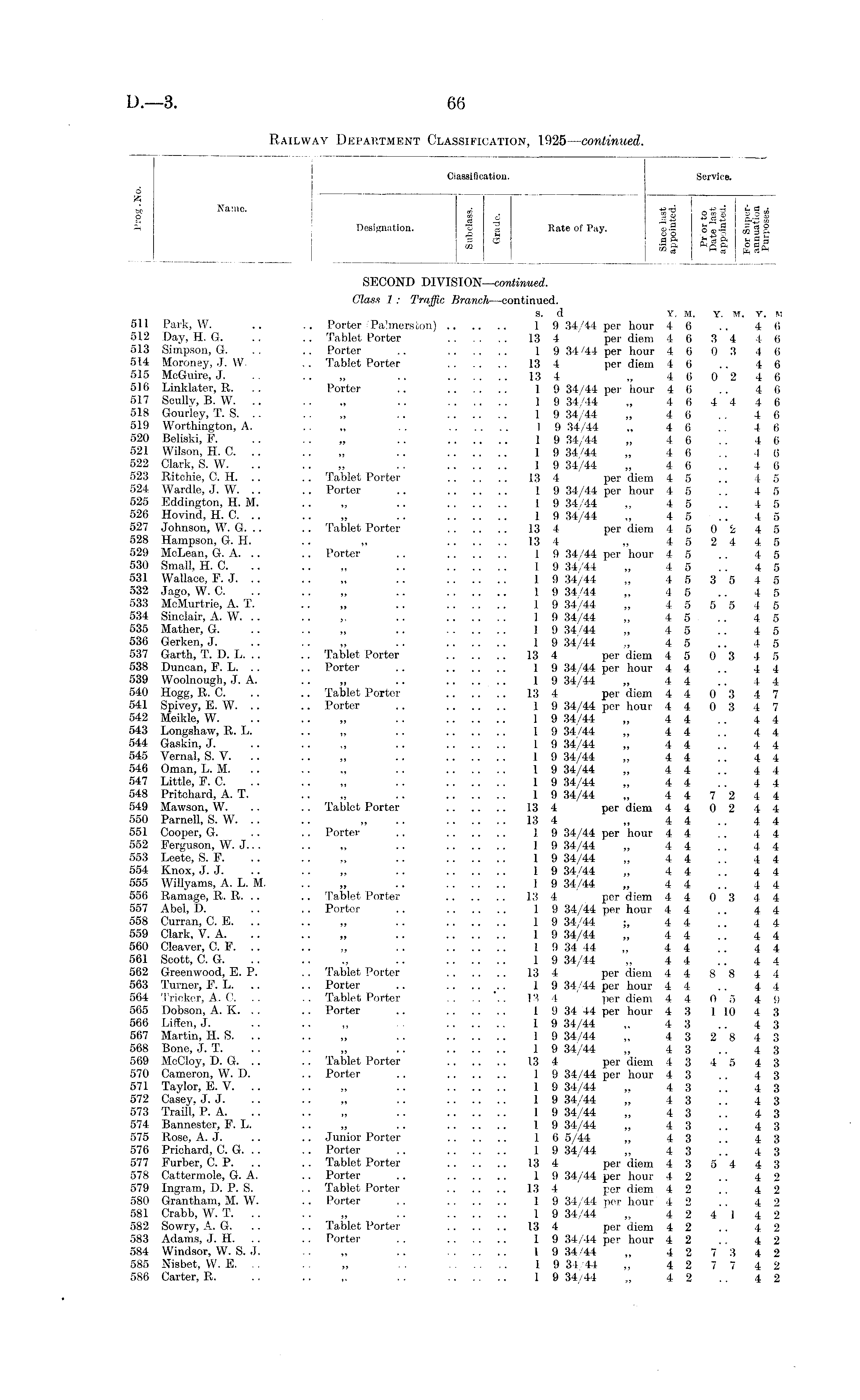 Classification. Service. o fc W Name - ss . g'S Ss§« O o ci 43 ci p,—« £ Designation. 'B 1 Rate of Pay. «-S So-I tola = <3 II ggs M Sg 1 1 (£§»h SECOND DIVISION—continued. Glass 1 : Traffic Branch—continued. s. d Y. M. Y. W. Y. M 511 Park, W. .. .. Porter Pa'mersion) 1 9 34/44 per hour 4 6 .. 4 6 512 Day, H. G. .. .. Tablet Porter 13 4 per diem 4 6 3 4 4 6 513 Simpson, G. . . .. Porter .. 1 9 34 '44 per hour 4 6 0 3 4 6 514 Moroney, J. W. .. Tablet Porter 13 4 per diem 4 6 .. 4 6 515 McGuire, J. .. .. „ .. 13 4 „ 4 6 0 2 4 6 516 Linklater, R. .. Porter .. 1 9 34/44 per hour 4 6 .. 4 6 517 Scully, B. W. .. .. ., .. 1 9 34/44 „ 4 6 4 4 4 6 518 Gourley, T. S. .. .. „ .. 1 9 34/44 „ 4 6 .. 4 6 519 Worthington, A. .. „ .. 19 34/44 ,, 4 6 .. 4 6 520 Beliski, P. .. .. „ .. 1 9 34/44 „ 4 6 .. 4 6 521 Wilson, H. 0. .. .. „ .. 1 9 „ 4 6 .. 4 6 522 Clark, S. W. .. .. „ . . 1 9 34/44 „ 4 6 .. 4 6 523 Ritchie, C. H. .. .. Tablet Porter 13 4 per diem 4 5 .. 4 5 524 Wardle, J. W. .. .. Porter .. 1 9 34/44 per hour 4 5 .. 4 5 525 Eddington, H. M. .. „ .. 1 9 34/44 „ 4 5 .. 4 5 526 Hovind, H. C. .. .. „ .. 1 9 34/44 „ 4 5 .. 4 5 527 Johnson, W. G. .. .. Tablet Porter 13 4 per diem 4 5 0 2 4 5 528 Hampson, G. H. .. „ 13 4 „ 4 5 2 4 4 5 529 McLean, G. A. .. .. Porter .. 1 9 34/44 per hour 4 5 .. 4 5 530 Small, II. C. .. .. „ .. 1 9 34/44 „ 4 5 .. 4 5 531 Wallace, E. J. .. .. „ .. 1 9 34/44 „ 4 5 3 5 4 5 532 Jago, W. C. .. .. „ .. 1 9 34/44 „ 4 5 .. 4 5 533 McMurtrie, A. T. .. „ .. 1 9 34/44 „ 4 5 5 5 4 5 534 Sinclair, A. W. .. .. „ .. 1 9 34/44 „ 4 5 .. 4 5 535 Mather, G. .. .. „ .. 1 9 34/44 „ 4 5 .. 4 5 536 Gerken, J. .. .. „ .. 1 9 34/44 „ 4 5 .. 4 5 537 Garth, T. D. L. .. .. Tablet Porter 13 4 per diem 4 5 0 3 4 5 538 Duncan, F. L. .. .. Porter .. 1 9 34/44 per hour 4 4 .. 4 4 539 Woolnough, J. A. .. „ .. 1 9 34/44 „ 4 4 .. 4 4 540 Hogg, R. C. .. .. Tablet Porter 13 4 per diem 4 4 0 3 4 7 541 Spivey, E. W. .. .. Porter .. 1 9 34/44 per hour 4 4 0 3 4 7 542 Meikle, W. .. .. „ .. 1 9 34/44 „ 4 4 .. 4 4 543 Longshaw, R. L. .. ,, .. 1 9 34/44 „ 4 4 .. 4 4 544 Gaskin, J. .. .. ,, .. 1 9 34/44 „ 4 4 .. 4 4 545 Vernal, S. V. .. .. „ .. 1 9 34/44 „ 4 4 .. 4 4 546 Oman, L. M. .. .. „ .. 1 9 34/44 „ 4 4 .. 4 4 547 Little, F. C. .. .. „ .. 1 9 34/44 „ 4 4 .. 4 4 548 Pritchard, A. T. .. „ .. 1 9 34/44 „ 4 4 7 2 4 4 549 Mawson, W. .. .. Tablet Porter 13 4 per diem 4 4 0 2 4 4 550 Parnell, S. W. .. .. „ .. 13 4 „ 4 4 .. 4 4 551 Cooper, G. .. .. Porter .. 1 9 34/44 per hour 4 4 .. 4 4 552 Ferguson, W. J... .. „ .. 1 9 34/44 „ 4 4 .. 4 4 553 Leete, S. F. .. .. „ .. 1 9 34/44 „ 4 4 .. 4 4 554 Knox, J. J. .. .. „ .. 1 9 34/44 „ 4 4 .. 4 4 555 Willyams, A. L. M. .. „ .. 1 9 34/44 „ 4 4 .. 4 4 556 Ramage, R. R. .. .. Tablet Porter 13 4 per diem 4 4 0 3 4 4 557 Abel, D. .. .. Porter .. 1 9 34/44 per hour 4 4 .. 4 4 558 Curran, C. E. .. ,, .. 1 9 34/44 ;, 4 4 .. 4 4 559 Clark, V. A. .. .. „ .. 1 9 34/44 „ 4 4 .. 4 4 560 Cleaver, C. F. .. „ .. 1 9 34 44 „ 4 4 .. 4 4 561 Scott, C. G. .. .. ,, .. 1 9 34/44 „ 4 4 .. 4 4 562 Greenwood, E. P. .. Tablet Porter 13 4 per diem 4 4 8 8 4 4 563 Turner, F. L. .. .. Porter .. 1 9 34/44 per hour 4 4 .. 4 4 564 Tricker, A. C. .. Tablet Porter . . . . . 13 4 per diem 4 4 0 5 4 9 565 Dobson, A. K. .. .. Porter .. 1 9 34 44 per hour 4 3 1 10 4 3 566 Liffen, J. .. .. „ 1 9 34/44 „ 4 3 .. 4 3 567 Martin, H. S. .. „ .. 1 9 34/44 „ 4 3 2 8 4 3 568 Bone, J. T. .. .. „ .. 1 9 34/44 „ 4 3 .. 4 3 569 McCloy, D. G. .. .. Tablet Porter 13 4 per diem 4 3 4 5 4 3 570 Cameron, W. D. .. Porter .. 19 34/44 per hour 4 3 .. 4 3 571 Taylor, E. V. .. „ .. 1 9 34/44 „ 4 3 .. 4 3 572 Casey, J. J. .. .. „ .. 1 9 34/44 „ 4 3 .. 4 3 573 Traill, P. A. .. .. „ .. 1 9 34/44 „ 4 3 .. 4 3 574 Bannester, F. L. .. „ .. 1 9 34/44 „ 4 3 .. 4 3 575 Rose, A. J. .. .. Junior Porter 1 6 5/44 „ 4 3 .. 4 3 576 Prichard, C. G. .. .. Porter .. 1 9 34/44 „ 4 3 .. 4 3 577 Furber, C. P. .. .. Tablet Porter 13 4 per diem 4 3 5 4 4 3 578 Cattermole, G. A. .. Porter .. 1 9 34/44 per hour 4 2 .. 4 2 579 Ingram, D. P. S. .. Tablet Porter 13 4 per diem 4 2 ., 4 2 580 Grantham, M. W. .. Porter .. 1 9 34/44 per hour 4 2 .. 4 2 581 Crabb, W. T. .. „ .. 1 9 34/44 „ 4 2 4 1 4 2 582 Sowry, A. G. .. .. Tablet Porter 13 4 per diem 4 2 .. 4 2 583 Adams, J. H. .. .. Porter .. 1 9 34/44 per hour 4 2 .. 4 2 584 Windsor, W. S. J. .. „ .. 1 9 34/44 „ 4 2 7 3 4 2 585 Nisbet, W. E. .. „ . . 1 9 34 44 „ 4 2 7 7 4 2 586 Carter, R. .. .. . . 1 9 34/44 „ 4 2 .. 4 2