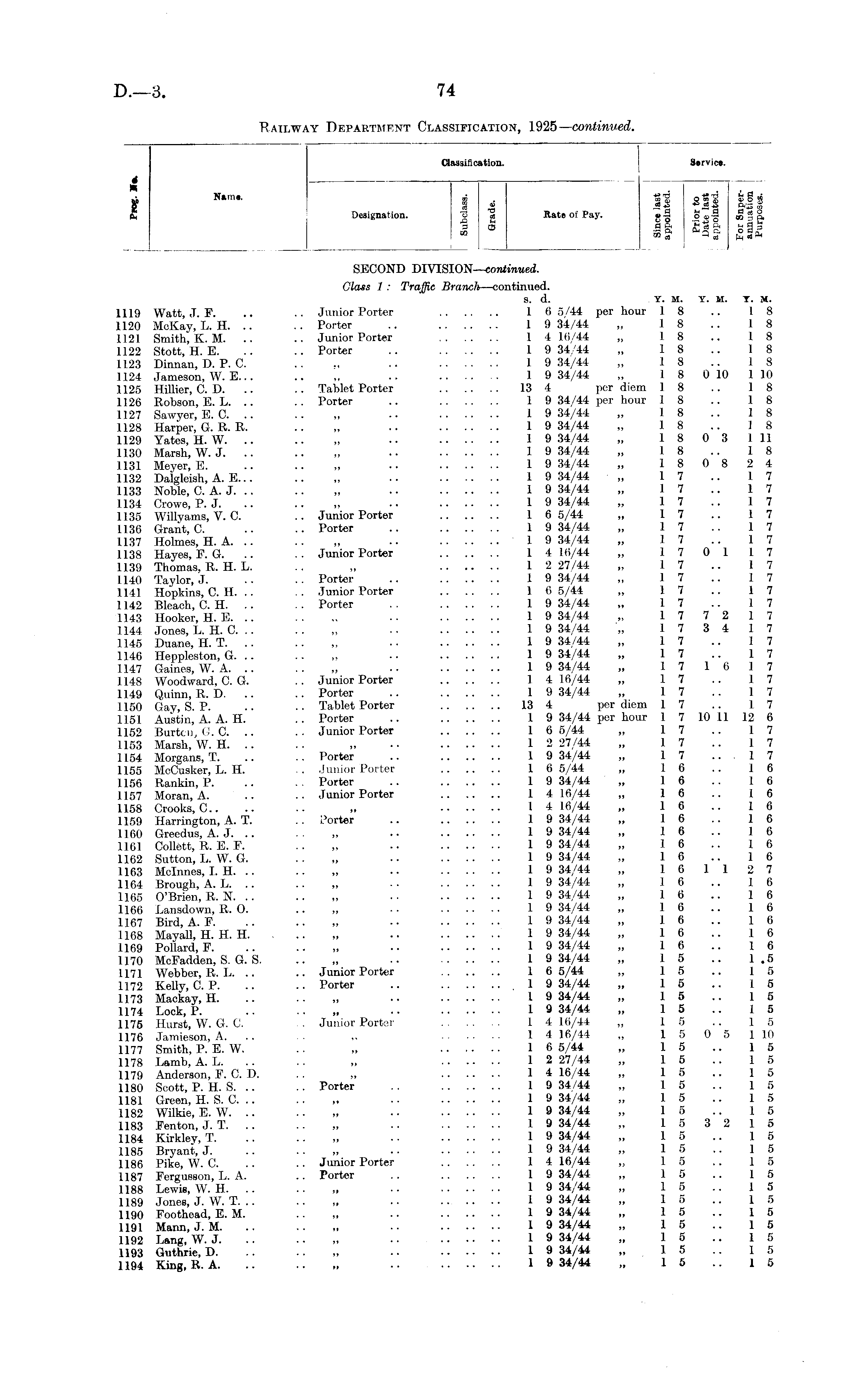 Classifi cation. Service. < —j—— 9 Nim *' I 4 II all Mjt Cn Designation. o cs Rate of Pay. « S o ® <n ~ p, s * ii m hi SECOND DIVISION—continued. Glass 1 : Traffic Branch—continued. S. d. Y. M. Y. M. Y. M. 1119 Watt, J. F. .. .. Junior Porter 1 6 5/44 per hour 18 .. 18 1120 McKay, L. H. .. .. Porter .. 1 9 34/44 „ 18 .. 18 1121 Smith, K. M. .. .. Junior Porter 14 16/44 „ 18 .. 18 1122 Stott, H. E. .. .. Porter .. 1 9 34/44 „ 18 .. 18 1123 Dinnan, D. P. C. .. ,, .. 1 9 34/44 „ 18 .. 18 1124 Jameson, W. E... .. ,, .. 1 9 34/44 ,, 1 8 0 10 1 10 1125 Hillier, C. D. .. .. Tablet Porter 13 4 per diem 18 .. 18 1126 Robson, E. L. .. .. Porter .. 1 9 34/44 per hour 18 .. 18 1127 Sawyer, E. C. .. .. ,, 1 9 34/44 ,, 1 8 .. 1 8 1128 Harper, G. R. R. .. „ 1 9 34/44 „ 18 .. 18 1129 Yates, H. W. .. .. „ .. 1 9 34/44 „ 1 8 0 3 1 11 1130 Marsh, W.J 1 9 34/44 „ 18 .. 18 1131 Meyer, E. .. .. „ .. 1 9 34/44 „ 1 8 0 8 2 4 1132 Dalgleish, A. E... .. „ .. 1 9 34/44 „ 17 .. 17 1133 Noble, C.A.J 1 9 34/44 „ 17 .. 17 1134 Crowe, P. J. .. .. ,, •• 1 9 34/44 „ 17 .. 17 1135 Willyams, V. C. .. Junior Porter 1 6 5/44 „ 17 .. 17 1136 Grant, C. .. .. Porter .. 1 9 34/44 „ 17 .. 17 1137 Holmes, H. A. .. .. „ .. 1 9 34/44 „ 17 .. 17 1138 Hayes, E. G. .. .. Junior Porter 14 16/44 „ 17 0 117 1139 Thomas, R, H. L. .. „ 1 2 27/44 „ 17 .. 17 1140 Taylor, J. .. .. Porter .. 1 9 34/44 „ 17 .. 17 1141 Hopkins, C. H. .. .. Junior Porter 1 6 5/44 „ 17 .. 17 1142 Bleach, C. H. .. .. Porter .. 1 9 34/44 „ 17 .. 17 1143 Hooker, H. E. .. .. „ .. 1 9 34/44 „ 1 7 7 2 1 7 1144 Jones, L. H. C. .. .. ,, • • 1 9 34/44 ,, 1 7 3 4 1 7 1145 Duane, H. T. .. .. „ .. 1 9 34/44 ,, 1 7 .. 1 7 1146 Heppleston, G. .. . - „ • • 1 9 34/44 „ 17 .. 17 1147 Gaines, W. A. .. .. „ •• 1 9 34/44 „ 17 16 17 1148 Woodward, C. G. .. Junior Porter 14 16/44 ,, 17 .. 17 1149 Quinn, R. D. .. .. Porter .. 1 9 34/44 „ 17 .. 17 1150 Gay, S. P. .. . • Tablet Porter 13 4 per diem 17 .. 17 1151 Austin, A. A. H. .. Porter .. 1 9 34/44 per hour 1 7 10 11 12 6 1152 Bur ten, G. C. .. .. Junior Porter 1 6 5/44 „ 17 .. 17 1153 Marsh, W. H. .. .. „ •• 1 2 27/44 „ 17 .. 17 1154 Morgans, T. .. .. Porter .. 1 9 34/44 ,, 1 7 .. . 1 7 1155 McCusker, L. H. .. Junior Porter 1 6 5/44 „ 16 .. 16 1156 Rankin, P. .. Porter .. .... .. 1 9 34/44 „ 16 .. 16 1157 Moran, A. .. .. Junior Porter 14 16/44 „ 16 .. 16 1158 Crooks, C.. .. .. „ 14 16/44 „ 16 .. 16 1159 Harrington, A. T. .. Porter .. 1 9 34/44 ,, 1 6 .. 1 6 1160 Greedus, A. J. .. .. „ •• 1 9 34/44 „ 16 .. 16 1161 Collett, R. E. F. .. „ .. 1 9 34/44 „ 16 .. 16 1162 Sutton, L. W. G. .. „ .. 1 9 34/44 „ 16 .. 16 1163 Mclnnes, I. H. .. .. „ . • 1 9 34/44 „ 16 112 7 1164 Brough, A. L. .. .. „ 1 9 34/44 ,, 1 6 .. 1 6 1165 O'Brien, R.N. .. .. „ .. 1 9 34/44 „ 16 .. 16 1166 Lansdown, R. O. .. ,, •• 1 9 34/44 „ 16 .. 16 1167 Bird, A. F. .. .. „ . 1 9 34/44 „ 16 .. 16 1168 Mayall, H. H. H. ... „ 1 9 34/44 „ 16 .. 16 1169 Pollard, F. .. .. „ .. I 9 34/44 „ 16 .. 16 1170 McFadden, S. G. S .. 1 9 34/44 „ 15 .. 1.5 1171 Webber, R. L. .. .. Junior Porter 1 6 5/44 „ 15 .. 15 1172 Kelly, C. P. .. .. Porter .. .1 9 34/44 „ 15 .. 15 1173 Mackay, H. .. .. „ .. 1 9 34/44 „ 15 .. 15 1174 Lock, P. .. .. „ .. 1 9 34/44 „ 15 .. 15 1175 Hurst, W. G. C. Junior Porter 14 16/44 „ 15 .. 15 1176 Jamieson, A. ,, 14 16/44 „ 1 5 0 5 1 10 1177 Smith, P. E. W. .. „ 1 6 5/44 „ 15 .. 15 1178 Lamb, A. L. .. .. ,, 1 2 27/44 ,, 1 5 .. 1 5 1179 Anderson, F. C. D. . . ,, 14 16/44 ,, 15 .. 15 1180 Scott, P. H. S. .. .. Porter .. 1 9 34/44 „ 15 .. 15 1181 Green, H. S. C. .. .. ,* • ■ 1 9 34/44 ,, 15 .. 15 1182 Wilkie, E. W. .. •• „ 1 9 34/44 „ 15 .. 15 1183 Fenton, J. T „ 1 9 34/44 „ 1 5 3 2 1 5 1184 Kirkley, T. .. .. „ .. 1 9 34/44 „ 15 .. 15 1185 Bryant, J. .. .. „ •• 1 9 34/44 „ 15 .. 15 1186 Pike, W. C. .. .. Junior Porter 14 16/44 „ 15 .. 15 1187 Fergusson, L. A. .. Porter .. 1 9 34/44 ,, 1 5 .. 1 5 1188 Lewis, W. H. .. „ • ■ 1 9 34/44 ,, 1 5 .. 1 5 1189 Jones, J. W. T. .. .. ,, .. 1 9 34/44 „ 15 .. 15 1190 Foothead, E. M. .. ,, 1 9 34/44 „ 15 .. 15 1191 Mann, J. M. .. .. „ • • 1 9 34/44 „ 15 .. 15 1192 Lang, W. J. .. .. „ •• 1 9 34/44 „ 15 .. 15 1193 Guthrie, D. .. .. „ .. 1 9 34/44 „ 15 .. 15 1194 King, R. A. .. .. „ •• 1 9 34/44 „ 15 .. 15