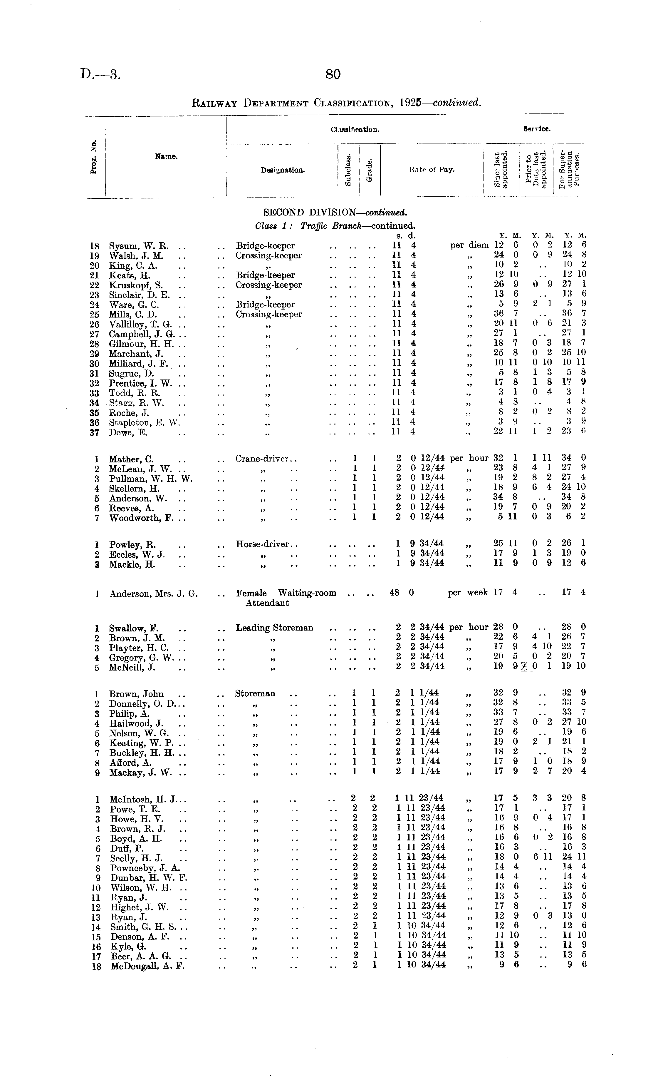 Classification. Service. 0 I : — 1 Nsme - I « ft sJS i|« Designation. "3 « Rate of Pay. g -g o <o •§ ° a 5 r/) .P Pj A . WJ M cS M oi pe< SECOND DIVISION—continued. Glass 1 : Traffic Branch—continued. s. d. Y. M. Y. M. Y. M. 18 Sysum, W. R. .. .. Bridge-keeper 11 4 per diem 12 6 0 2 12 6 19 Walsh, J. M. .. .. Crossing-keeper 11 4 „ 24 0 0 9 24 8 20 King, C. A. .. .. „ 11 4 „ 10 2 10 2 21 Keats, H. .. .. Bridge-keeper 11 4 „ 12 10 .. 12 10 22 Kruskopf, S. .. .. Crossing-keeper 11 4 ,, 26 9 0 9 27 1 23 Sinclair, D. E. .. .. „ 11 4 „ 13 6 13 6 24 Ware, G. C. . .. Bridge-keeper 114 „ 59 21 59 25 Mills, C. D. .. .. Crossing-keeper 11 4 „ 36 7 .. 36 7 26 Vallilley, T. G. .. .. „ 11 4 „ 20 11 0 6 21 3 27 Campbell, J. G. .. .. „ 11 4 „ 27 1 .. 27 1 28 Gilmour, H. H. . . . . „ 114 „ 18 7 0 3 18 7 29 Marchant, J. . . ,, 11 4 ,, 25 8 0 2 25 10 30 Milliard, J. E. .. .. „ 11 4 „ 10 11 0 10 10 11 31 Sugrue, D. .. .. „ 11 4 „ 5 8 1 3 5 8 32 Prentice, I. W. .. .. „ 11 4 „ 17 8 1 8 17 9 33 Todd, R. R. . .. „ 11 4 3 1 0 4 3 1 34 Staeg, R. W. .. .. „ 11 4 „ 4 8.. 4 8 35 Roche, J. .. .. „ 114 „ 8 2 0 2 8 2 36 Stapleton, E. W. .. „ 11 4 „• 3 9.. 3 9 37 Dewe, E. .. .. „ 11 4 „ 22 11 1 2 23 6 1 Mather, C. .. .. Crane-driver.. .. 1 1 2 0 12/44 per hour 32 1 1 11 34 0 2 McLean, J. W. .. .. „ .. ..1 1 2 0 12/44 „ 23 8 4 1 27 9 3 Pullman, W. H. W. .. „ .. ..1 1 2 0 12/44 „ 19 2 8 2 27 4 4 Skellern, H. .. .. „ .. ..1 1 2 0 12/44 „ 18 9 6 4 24 10 5 Anderson, W. .. „ ■ • ..1 1 2 0 12/44 „ 34 8 .. 34 8 6 Reeves, A 1 1 2 0 12/44 „ 19 7 0 9 20 2 7 Woodworth, E. .. .. „ .. ..1 1 2 0 12/44 „ 511 03 62 1 Powlev, R. .. .. Horse-driver.. 1 9 34/44 „ 25 11 0 2 26 1 2 Eccles, W. J. .. .. „ .. 1 9 34/44 „ 17 9 1 3 19 0 3 Mackle, H „ 1 9 34/44 „ 11 9 0 9 12 6 1 Anderson, Mrs. J. G. .. Eemale Waiting-room .. .. 48 0 per week 17 4 .. 17 4 Attendant 1 Swallow, E. .. .. Leading Storeman 2 2 34/44 per hour 28 0 .. 28 0 2 Brown, J. M. .. .. „ 2 2 34/44 „ 22 6 4 1 26 7 3 Playter, H. C „ 2 2 34/44 „ 17 9 4 10 22 7 4 Gregory, G. W. .. .. „ 2 2 34/44 „ 20 5 0 2 20 7 5 McNeill, J „ 2 2 34/44 „ 19 9 g 0 1 19 10 1 Brown, John .. .. Storeman .. .. 11 2 1 1/44 „ 32 9 .. 32 9 2 Donnelly, O. D... .. „ .. ..1 1 2 1 1/44 ,, 32 8 .. 33 5 3 Philip, A 112 1 1/44 „ 33 7 .. 33 7 4 Hailwood, J 112 1 1/44 „ 27 8 0 2 27 10 5 Nelson, W. G. .. .. „ .. ..11 21 1/44 „ 19 6 .. 19 6 6 Keating, W. P. .. .. „ . • ..11 21 1/44 „ 19 0 2 1 21 1 7 Buckley, H. H. .. .. „ .. ..11 21 1/44 „ 18 2 .. 18 2 8 Afford, A 11 2 1 1/44 „ 17 9 1 0 18 9 9 Mackay, J. W. .. .. „ .. ..11 2 1 1/44 „ 17 9 2 7 20 4 1 Mcintosh, H. J .. ..22 111 23/44 „ 17 5 3 3 20 8 2 Powe, T. E „ .. ..2 2 1 11 23/44 „ 17 1 .. 17 1 3 Howe, H. V 2 2 111 23/44 „ 16 9 0 4 17 1 4 Brown, R.J „ .. ..2 2 1 11 23/44 „ 16 8 .. 16 8 5 Bovd, A. H „ .. ..2 2 1 11 23/44 „ 16 6 0 2 16 8 6 Duff, P. .. .. „ .. ..2 2 1 11 23/44 „ 16 3 16 3 7 Scelly, H. J. .. „ .. ..22 111 23/44 „ 18 0 6 11 24 11 8 Pownceby, J. A. . . „ .. ..22 111 23/44 „ 14 4 .. 14 4 9 Dunbar, H. W. E. .. „ .. ..2 2 1 11 23/44 „ 14 4 .. 14 4 10 Wilson, W. H. .. .. „ .. ..2 2 1 11 23/44 „ 13 6 .. 13 6 u Ryan, J „ .. ..2 2 1 11 23/44 „ 13 5 .. 13 5 12 Highet, J. W „ ..2 2 1 11 23/44 „ 17 8 .. 17 8 13 Rvan, J „ .. ..2 2 1 11 23/44 „ 12 9 0 3 13 0 14 Smith, G. H. S. .. .. „ .. ..2 1 1 10 34/44 „ 12 6 .. 12 6 15 Denson, A. E „ .. ..2 1 1 10 34/44 „ 1110 .. 1110 16 Kyle, G 2 1 1 10 34/44 „ 11 9 .. 11 9 17 Beer, A. A. G „ .. ..2 1 1 10 34/44 „ 13 5 .. 13 5 18 McDougall, A. E. .. „ .. ..2 1 1 10 34/44 „ 9 6 .. 9 6