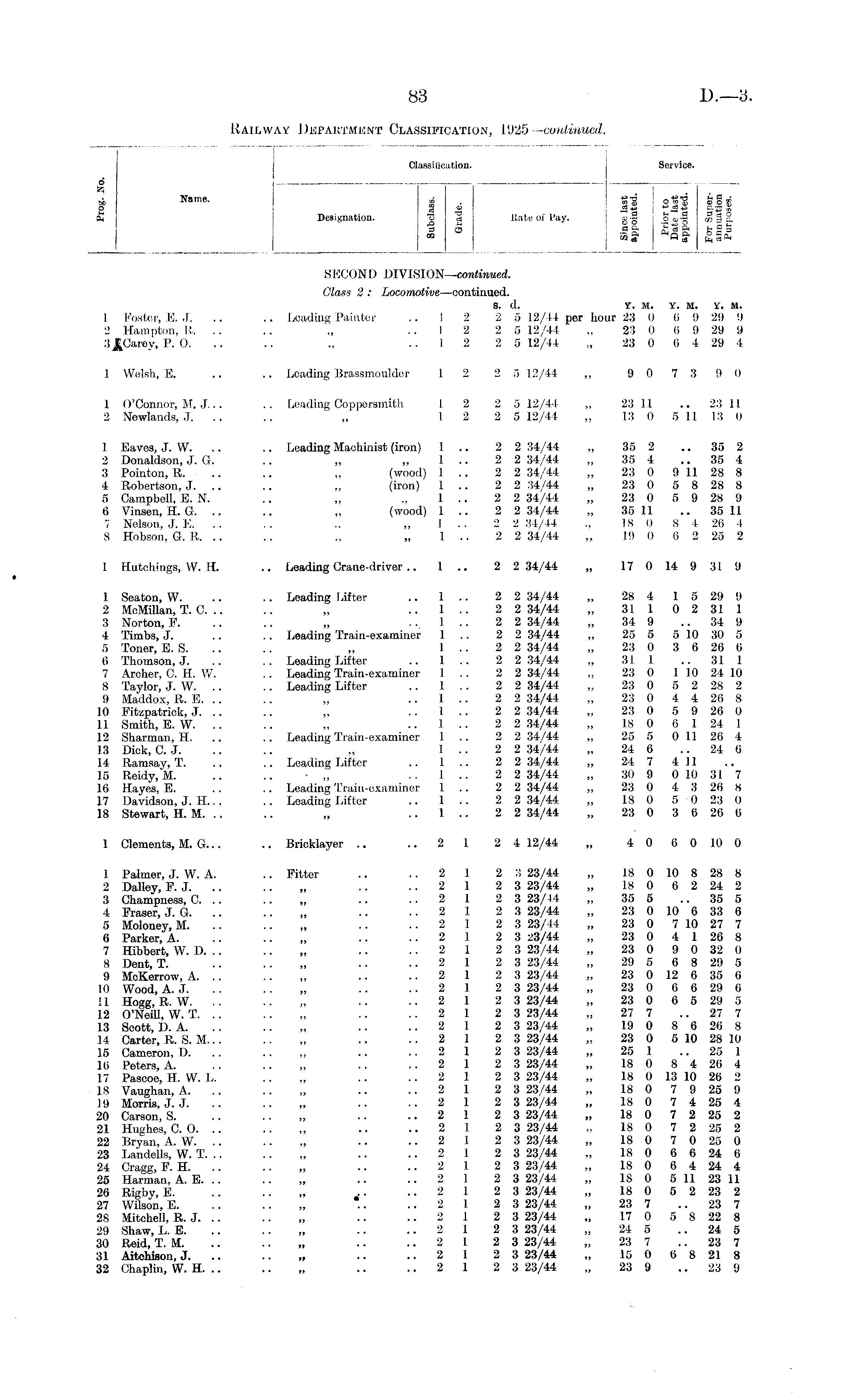 Classification. Service. o" . » Name - » si ofS s§$ O cj ° jS +■* J-3 -p P-£ rft £ Designation. o . Itate of Pay. oc-9 & 3 2. -O fc4 I WW .J-4 4_> W 'Z. (. CO r7» a r & S Cb CQjj H(J |j,{jW SECOND DIVISION—continued. Glass 2 : Locomotive—continued. s. d. X. M. Y. M. Y. M. 1 Postei', E. J. .. .. Leading Painter .. 1 2 2 5 12/44 per hour 23 0 (i 9 29 9 2 Hampton, R. .. .. „ ..1 2 2 5 12/44 „ 23 0 6 9 29 9 3J>Carey, P. 0. .. .. „ 1 2 2 5 12/44 „ 23 0 6 4 29 4 1 Welsh, E. .. .. Leading Brassmoulder 1 2 2 5 12/44 „ 9 0 7 3 9 0 1 O'Connor, M. J... .. Leading Coppersmith 1 2 2 5 12/44 „ 23 11 .. 23 11 2 Newlands, J. .. .. 1 2 2 5 12/44 „ 13 0 5 11 13 0 1 Eaves, J. W. .. .. Leading Machinist (iron) 1 2 2 34/44 „ 35 2 .. 35 2 2 Donaldson, J. G. .. „ „ 1 .. 2 2 34/44 „ 35 4 .. 35 4 3 Pointon, R. .. .. „ (wood) 1 .. 2 2 34/44 „ 23 0 9 11 28 8 4 Robertson, J. .. .. ., (iron) 1 .. 2 2 34/44 „ 23 0 5 8 28 8 5 Campbell, E. N. .. „ „ 1 .. 2 2 34/44 „ 23 0 5 9 28 9 6 Vinsen, H. G. .. .. „ (wood) 1 .. 2 2 34/44 „ 35 11 .. 35 11 7 Nelson, J. E. .. .. ., „ 1 .. 2 2 34/44 ., 18 0 8 4 26 4 8 Hobson, G. R. .. .. „ „ 1 .. 2 2 34/44 „ 19 0 6 2 25 2 1 Hutchings, W. H. .. Leading Crane-driver .. 1 2 2 34/44 „ 17 0 14 9 31 9 1 Seaton, W. .. .. Leading Lifter .. 1 .. 2 2 34/44 „ 28 4 1 5 29 9 2 McMillan, T.C „ .. 1 .. 2 2 34/44 „ 31 1 0 2 31 1 3 Norton, P. .. .. „ . . 1 .. 2 2 34/44 „ 34 9 34 9 4 Timbs, J. .. .. Leading Train-examiner 1 2 2 34/44 „ 25 5 5 10 30 5 5 Toner, E. S. .. „ 1 .. 2 2 34/44 „ 23 0 3 6 26 6 6 Thomson, J. .. .. Leading Lifter .. 1 2 2 34/44 „ 311 .. 311 7 Archer, C. II. W. .. Leading Train-examiner 1 2 2 34/44 „ 23 0 1 10 24 10 8 Taylor, J. W. .. .. Leading Lifter .. 1 .. 2 2 34/44 „ 23 0 5 2 28 2 9 Maddox, R. E. .. .. „ .. 1 .. 2 2 34/44 „ 23 0 4 4 26 8 10 Pitzpatrick, J. .. .. „ .. 1 .. 2 2 34/44 „ 23 0 5 9 26 0 11 Smith, E. W. .. .. „ .. 1 .. 2 2 34/44 „ 18 0 6 1 24 1 12 Sharman, H. .. .. Leading Train-examiner 1 2 2 34/44 „ 25 5 0 11 26 4 13 Dick, C. J. .. .. „ 1 .. 2 2 34/44 „ 24 6 .. 24 6 14 Ramsay, T. .. .. Leading Lifter .. 1 2 2 34/44 „ 24 7 4 11 15 Reidy, M. .. .. • „ 1 .. 2 2 34/44 „ 30 9 0 10 31 7 16 Hayes, E. .. .. Leading Train-examiner 1 2 2 34/44 „ 23 0 4 3 26 8 17 Davidson, J. H... .. Leading Lifter .. 1 2 2 34/44 ,, 18 0 5 0 23 0 18 Stewart, H. M. .. .. „ .. 1 .. 2 2 34/44 „ 23 0 3 6 26 6 1 Clements, M. G... .. Bricklayer .. ..2 1 2 4 12/44 „ 4 0 6 0 10 0 1 Palmer, J. W. A. .. Fitter .. ..2 1 2 3 23/44 „ 18 0 10 8 28 8 2 Dalley, P. J. .. .. „ . . ..2 1 2 3 23/44 „ 18 0 6 2 24 2 3 Champness, C. .. .. „ .. ..2 1 2 3 23/44 ,, 35 5 .. 35 5 4 Praser, J. G. .. ,, .. ..2 1 2 3 23/44 „ 23 0 10 6 33 6 5 Moloney, M. .. ,, .. ..2 1 2 3 23/44 „ 23 0 7 10 27 7 6 Parker, A .. ..2123 23/44 „ 23 0 4 1 26 8 7 Hibbert, W. D. .. .. „ .. ..2 1 2 3 23/44 „ 23 0 9 0 32 0 8 Dent, T. .. .. „ •. ..2 1 2 3 23/44 „ 29 5 6 8 29 5 9 McKerrow, A. .. ,, .. ..2 1 2 3 23/44 ,, 23 0 12 6 35 6 10 Wood, A. J. .. .. „ .. ..2 1 2 3 23/44 „ 23 0 6 6 29 6 11 Hogg, R. W. .. .. „ .. ..2 1 2 3 23/44 „ 23 0 6 5 29 5 12 O'Neill, W. T. .. .. „ .. ..2 1 2 3 23/44 „ 27 7 .. 27 7 13 Soott, D. A „ .. ..2 1 2 3 23/44 „ 19 0 8 6 26 8 14 Carter, R. S. M.. . .. „ .. ..2 1 2 3 23/44 „ 23 0 5 10 28 10 15 Cameron, D. .. ,, .. ..2 1 2 3 23/44 „ 25 1 .. 25 1 16 Peters, A. .. . • „ .. ..2 1 2 3 23/44 „ 18 0 8 4 26 4 17 Pascoe, H. W. L. .. „ .. ..2 1 2 3 23/44 „ 18 0 13 10 26 2 18 Vaughan, A. .. .. ,, .. ..2 1 2 3 23/44 „ 18 0 7 9 25 9 19 Morris, J. J „ .. ..2 1 2 3 23/44 „ 18 0 7 4 25 4 20 Carson, S. .. . • „ .. ..2 1 2 3 23/44 „ 18 0 7 2 25 2 21 Hughes, C. O. .. .. „ .. ..2 1 2 3 23/44 „ 18 0 7 2 25 2 22 Bryan, A. W. .. .. ., .. ..2 1 2 3 23/44 „ 18 0 7 0 25 0 23 Landells, W. T. .. .. „ .. ..2 1 2 3 23/44 „ ISO 6 6 24 6 24 Cragg, P. H. .. „ .. ..2 1 2 3 23/44 „ 18 0 6 4 24 4 25 Harman, A. E. .. .. „ .. .. 2 1 2 3 23/44 „ 18 0 5 11 23 11 26 Rigby, E. .. .. „ .. ..2 1 2 3 23/44 „ 18 0 5 2 23 2 27 Wilson, E. .. .. „ *.. ..2 1 2 3 23/44 „ 23 7 .. 23 7 28 Mitchell, R. J. .. .. „ .. ..2 1 2 3 23/44 „ 17 0 5 8 22 8 29 Shaw, L. E .. .. 2 1 2 3 23/44 „ 24 5 .. 24 5 30 Reid, T. M .. ..2 1 2 3 23/44 „ 23 7 .. 23 7 31 Aitchison, J. .. .. ,» .. ..2 1 2 3 23/44 „ 15 0 6 8 21 8 32 Chaplin, W. H. .. .. „ .. ..2 1 2 3 23/44 „ 23 9 .. 23 9