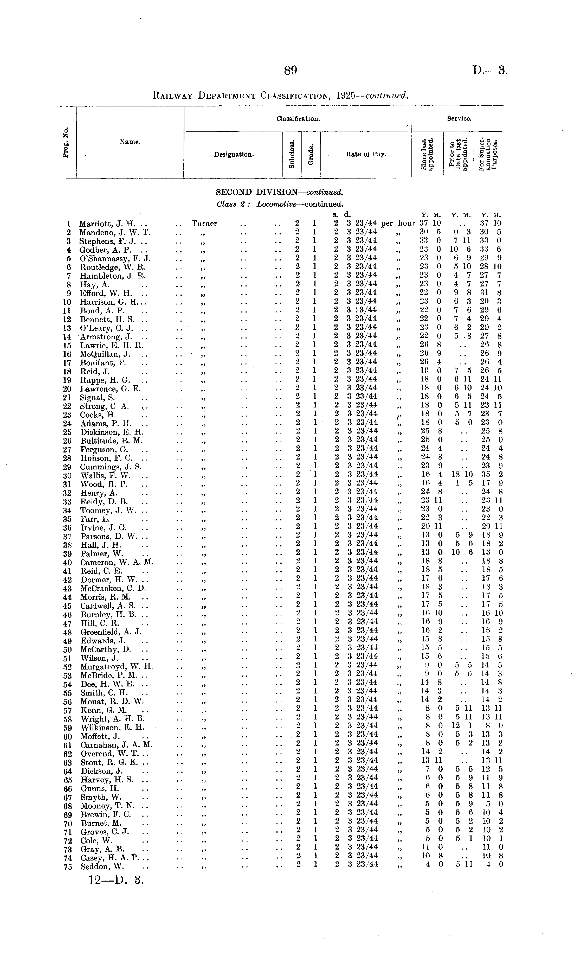 Classification. Service. 0 —_____— fe , I . 1 Name * | 05 |1 2|S |.2S £ Designation. "3 H Rate oi Pay. ©.9 o©| m § ° ® ° sg 1 g§5 SECOND DIVISION—continued. Glass 2 : Locomotive—-continued. s. d. Y. M. Y. M. Y. M. 1 Marriott, J. H. .. .. Turner .. ..2 1 2 3 23/44 per hour 37 10 .. 37 10 2 Mandeno, J. W. T. .. .. ..2 1 2 3 23/44 „ 30 5 0 3 30 5 3 Stephens, P. J „ .. ..2 1 2 3 23/44 „ 33 0 7 11 33 0 4 Godber, A. P. .. .. „ .. ..2 1 2 3 23/44 „ 23 0 10 6 33 6 5 O'Shannassy, F. J. .. „ .. ..2 1 2 3 23/44 ., 23 0 6 9 29 9 6 Routledge, W. R. .. „ • ■ ..2 1 2 3 23/44 „ 23 0 5 10 28 10 7 Hambleton, J. R. .. „ .. ..2 1 2 3 23/44 „ 23 0 4 7 27 7 8 Hay, A. .. .. „ .. ..2 1 2 3 23/44 „ 23 0 4 7 27 7 9 Efford, W. H. .. .. „ .. ..2 1 2 3 23/44 „ 22 0 9 8 31 8 10 Harrison, G. H... .. „ .. ..2 1 2 3 23/44 „ 23 0 6 3 29 3 11 Bond, A. P „ .. ..212 3 £3/44 „ 22 0 7 6 29 6 12 Bennett, H. S. .. .. „ .. ..2 1 2 3 23/44 „ 22 0 7 4 29 4 13 O'Leary, C. J. .. .. ,. .. ..2 1 2 3 23/44 „ 23 0 6 2 29 2 14 Armstrong, J. .. .. „ .. ..2 1 2 3 23/44 „ 22 0 5 8 27 8 15 Lawrie, E. H. R. .. „ .. ..2 1 2 3 23/44 „ 26 8 .. 26 8 16 McQuillan, J. .. .. „ .. ..2 1 2 3 23/44 „ 26 9 .. 26 9 17 Bonifant, P. .. „ . . ..2 1 2 3 23/44 „ 26 4 .. 26 4 18 Reid, J. .. .. „ .. ..2 1 2 3 23/44 „ 19 0 7 5 26 5 19 Rappe, H. G .. ..2 1 2 3 23/44 „ 18 0 6 11 24 11 20 Lawrence, G. E. .. „ .. ..2 1 2 3 23/44 „ 18 0 6 10 24 10 21 Signal, S ■ • ..2 1 2 3 23/44 „ 18 0 6 5 24 5 22 Strong, C A. „ •• ..2 1 2 3 23/44 „ 18 0 5 11 23 11 23 Cocks, H .. ..2 1 2 3 23/44 18 0 5 7 23 7 24 Adams, P. H. . . „ .. ..2 1 2 3 23/44 „ 18 0 5 0 23 0 25 Dickinson, E. H. .. „ .. ..2 1 2 3 23/44 „ 25 8 .. 25 8 26 Bultitude, R. M. .. „ .. ..2 1 2 3 23/44 „ 25 0 .. 25 0 27 Ferguson, G. .. .. „ .. ..2 1 2 3 23/44 „ 24 4 .. 24 4 28 Hobson, P. C. .. .. „ . . ..2 1 2 3 23/44 „ 24 8 .. 24 8 29 Cummings, J. S. .. ,, .. ..2 1 2 3 23/44 „ 23 9 .. 23 9 30 Wallis, P. W. .. . • „ •. ..2 1 2 3 23/44 „ 16 4 18 10 35 2 31 Wood, H. P ..212 3 23/44 „ 16 4 15 17 9 32 Henry, A. .. .. -, .. ..2 1 2 3 23/44 ,, 24 8 .. 24 8 33 Reidy, D. B .. ..2 1 2 3 23/44 „ 23 11 .. 23 11 34 Toomey, J. W. .. .. ,» • • ..2 1 2 3 23/44 „ 23 0 .. 23 0 35 Parr, L. .. .. „ .. ..2 1 2 3 23/44 „ 22 3 .. 22 3 36 Irvine, J. G. .. .. ,> • • ..2 1 2 3 23/44 „ 20 11 .. 20 11 37 Parsons, D. W • • ..2 1 2 3 23/44 „ 13 0 5 9 18 9 38 Hall, J. II • ■ ..2 1 2 3 23/44 „ 13 0 5 6 18 2 39 Palmer, W. .. ■■ „ •• ..2 1 2 3 23/44 „ 13 0 10 6 13 0 40 Cameron, W. A. M. .. ,, .. ..2 1 2 3 23/44 „ 18 8 .. 18 8 41 Reid, C. E • • ..2 1 2 3 23/44 „ 185 ..185 42 Dormer, H. W „ •• ..2 1 2 3 23/44 „ 17 6 .. 17 6 43 McCracken, C. D. .. ,, .. ..2 1 2 3 23/44 ,, 18 3 .. 18 3 44 Morris, R. M. • • ,, ■ • ..2 1 2 3 23/44 „ 175 .. 175 45 Caldwell, A. S. .. .. „ • • • • 2 1 2 3 23/44 ,, 17 5 .. 17 5 46 Burnley, H. B. .. . ■ ,, • • ..2 1 2 3 23/44 ,, 16 10 .. 16 10 47 Hill, C. R ..212 3 23/44 „ 16 9 .. 16 9 48 Greenfield, A. J. •• ,, ..2 1 2 3 23/44 ,, 16 2 .. 16 2 49 Edwards, J • • ..2 1 2 3 23/44 „ 15 8 . . 15 8 50 McCarthy, D. .. „ .. ..2 1 2 3 23/44 ,, 15 5 .. 15 5 51 Wilson, J. ■ • ..2 1 2 3 23/44 „ 15 6 .. 15 6 52 Murgatroyd, W. H. .. ,, .. ..2 1 2 3 23/44 ,, 9 0 5 5 14 5 53 McBride, P. M .. ..2 1 2 3 23/44 „ 9 0 5 5 14 3 54 Dee, H. W. E „ • • ..2 1 2 3 23/44 „ 148 .. 14 8 55 Smith, C. H. .. .. „ • • ..2 1 2 3 23/44 „ 14 3 .. 14 3 56 Mouat, R. D. W. .. „ .. ..2 1 2 3 23/44 „ 14 2 .. 14 2 57 Kenn, G. M „ •• ..2 1 2 3 23/44 „ 8 0 5 11 13 11 58 Wright, A. H. B .. ..2 1 2 3 23/44 „ 8 0 5 11 13 11 59 Wilkinson, E. H. .. „ • • ..2 1 2 3 23/44 „ 8 0 12 1 8 0 60 Mofiett, J • • ..2 1 2 3 23/44 „ 8 0 5 3 13 3 61 Carnahan, J. A. M. .. „ .. ..2 1 2 3 23/44 „ 8 0 5 2 13 2 62 Overend, W. T. .. .. „ .. ..2 1 2 3 23/44 „ 14 2 .. 14 2 63 Stout, R.G.K •• ..2 1 2 3 23/44 „ 1311 .. 1311 64 Dickson, J. . ■ ■ • >> • • ..2 1 2 3 23/44 ,, 1 0 5 5 12 5 65 Harvey, H.S... „ •• •• 2 1 23 23/44 „ 6 0 5 9 11 9 66 Gunns, H .. ..2 1 2 3 23/44 „ 6 0 5 8 11 8 67 Smyth, W „ • • ..2 1 2 3 23/44 „ 6 0 5 8 11 8 68 Mooney, T. N „ • • ..2 1 2 3 23/44 „ 5 0 5 9 5 0 69 Brewin, P. C „ • ■ ..2 1 2 3 23/44 „ 5 0 5 6 10 4 70 Burnet, M ■ • ..2 1 2 3 23/44 „ 5 0 5 2 10 2 71 Groves, C. J „ .. ..2 1 2 3 23/44 „ 5 0 5 2 10 2 72 Cole, W • • ..2 1 2 3 23/44 „ 5 0 5 1 10 1 73 Gray, A. B 2 1 2 3 23/44 „ 11 0 .. 11 0 74 Casey, H. A. P „ • • ..2 1 2 3 23/44 „ 10 8 .. 10 8 75 Seddon, W •• ..2 1 2 3 23/44 „ 4 0 5 11 4 0