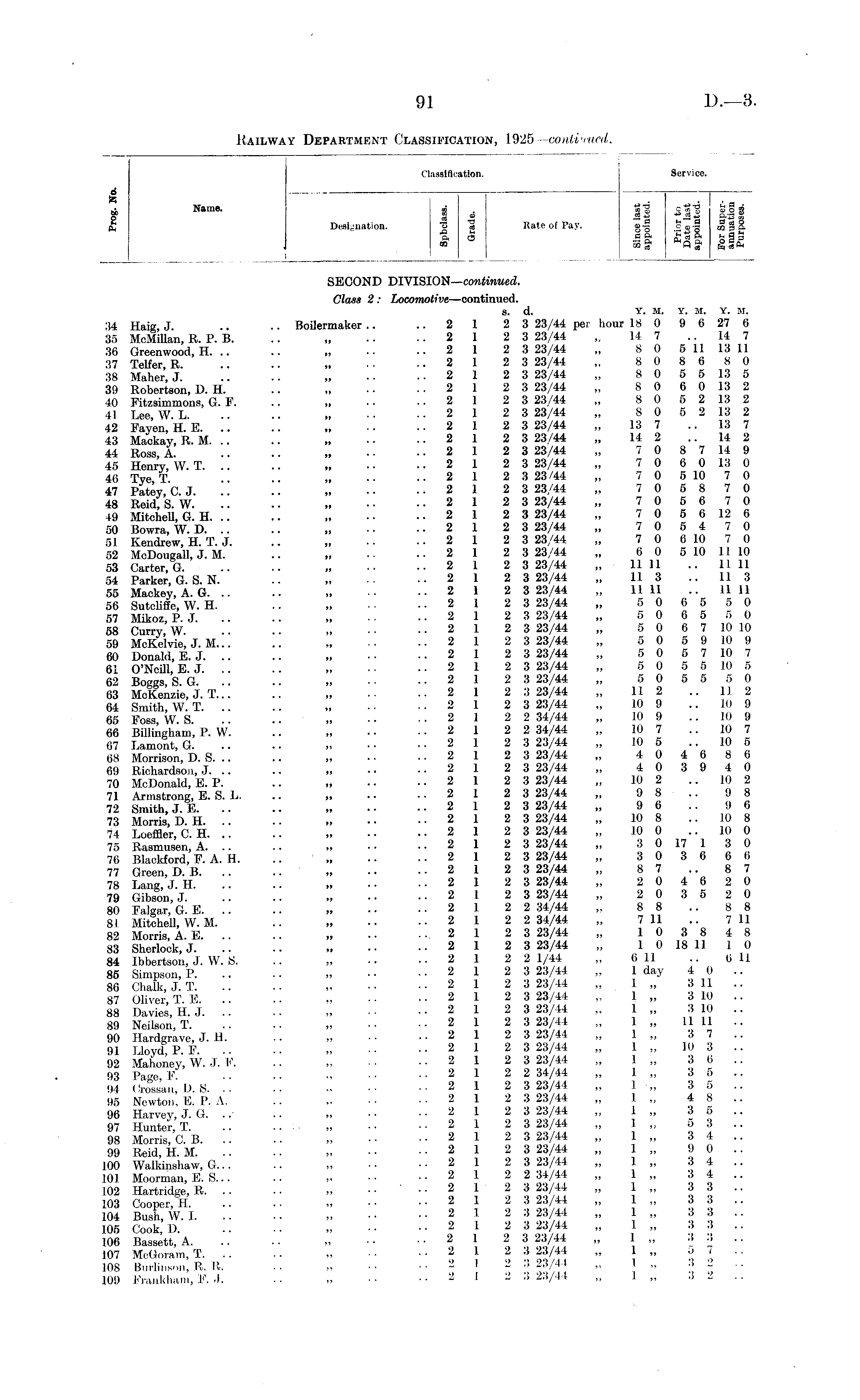 Classification. Service. g — g> Name " | 6 11 -sjl all £ Designation. J3 It Rate of Pay. g-S 5 ca § 8. Q.5 OP* n'tjP' « S& *«§• g|(S i SECOND DIVISION—continued. Class 2 : Locomotive—continued. s. d. Y. m. y. M. Y, M. 34 Haig, J. .. .. Boilermaker .. ..2 1 2 3 23/44 per hour 18 0 9 6 27 6 35 McMillan, R. P. B. .. „ .. ..2 1 2 3 23/44 „ 14 7 .. 14 7 36 Greenwood, H. .. .. ,, •• ..2 1 2 3 23/44 „ 8 0 5 11 13 11 37 Telfer, R 2 1 2 3 23/44 „ 8 0 8 6 8 0 38 Maher, J. .. .. „ .. ..2 1 2 3 23/44 „ 8 0 5 5 13 5 39 Robertson, D. H. .. „ .. ..2 1 2 3 23/44 „ 8 0 6 0 13 2 40 Fitzsimmons, G. F. .. <> • • ..2 1 2 3 23/44 ,, 8 0 5 2 13 2 41 Lee, W. L 2 1 2 3 23/44 „ 8 0 5 2 13 2 42 Fayen, H. E. .. „ • • ..2 1 2 3 23/44 ,, 13 7 .. 13 7 43 Maekay, R. M. .. .. >, • • ..2 1 2 3 23/44 „ 14 2 .. 14 2 44 Ross, A. .. .. ,* • • ..2 1 2 3 23/44 „ / 0 8 7 14 9 45 Henry, W. T. .. .. „ • • ..2 1 2 3 23/44 „ 7 0 6 0 13 0 46 Tve T .. „ ..2 1 2 3 23/44 „ 7 0 5 10 7 0 47 Patey, C. J •• ..2 1 2 3 23/44 „ 7 0 5 8 7 0 48 Reid, S. W. .. .. „ • • .. 2 1 2 3 23/44 „ 7 0 5 6 7 0 49 Mitchell, G. H. .. .. „ • • ..2 1 2 3 23/44 „ 7 0 5 6 12 6 50 Bowra, W. D. .. ,, .. ..2 1 2 3 23/44 „ 7 0 5 4 7 0 51 Kendrew, H. T. J. .. ,, • • ..2 1 2 3 23/44 „ 7 0 6 10 7 0 52 McDougall, J. M. .. „ •• ..2 1 2 3 23/44 „ 6 0 5 10 11 10 53 Carter, G. .. . • „ • • ..2 1 2 3 23/44 „ 1111 .. 1111 54 Parker, G. S. N. .. ,, • • ..2 1 2 3 23/44 „ 11 3 ... 11 3 55 Mackey, A. G. .. •• ,» •• ..2 1 2 3 23/44 ,, 11 11 .. 11 11 56 Sutcliffe, W. H. .. „ • • ..2 1 2 3 23/44 „ 5 0 6 5 5 0 57 Mikoz, P. J. .. .. „ • • ..2 1 2 3 23/44 „ 5 0 6 5 5 0 58 Curry, W. • • • • »» • • ..2 1 2 3 23/44 „ 5 0 6 7 10 10 59 McKelvie, J. M... .. „ •• ..2 1 2 3 23/44 „ 5 0 5 9 10 9 60 Donald, E. J. .. .. „ • • ..2 1 2 3 23/44 „ 5 0 5 7 10 7 61 O'Neill, E. J. .. . • „ • • ..2 1 2 3 23/44 „ 5 0 5 5 10 5 62 Boggs, S. G. .. „ • • ..2 1 2 3 23/44 „ 5 0 5 5 5 0 63 McKenzie, J. T... .. „ ..2 1 2 3 23/44 „ 11 2 .. 11 2 64 Smith, W. T. .. .. „ • • ..2 1 2 3 23/44 „ 10 9 10 9 65 Foss, W. S. .. .. „ .. ..2 1 2 2 34/44 „ 10 9 10 9 66 Billingham, P. W. .. „ • • ..2 1 2 2 34/44 „ 10 7 .. 10 7 67 Lamont, G • • ..2 1 2 3 23/44 „ 10 5 .. 10 5 68 Morrison, D. S. .. .. „ • • ..2 1 2 3 23/44 „ 4 0 4 6 8 6 69 Richardson, J. .. .. „ • • ..2 1 2 3 23/44 „ 4 0 3 9 4 0 70 McDonald, E. P. .. » • • ..2 1 2 3 23/44 „ 10 2 .. 10 2 71 Armstrong, E. S. L. .. „ .. ..2 1 2 3 23/44 „ 98.. 98 72 Smith, J. E 2 1 2 3 23/44 „ 9 6 .. 9 6 73 Morris, D. H 2 1 2 3 23/44 „ 10 8 .. 10 8 74 Loeffler, C. H „ ..2 1 2 3 23/44 „ 10 0 .. 10 0 75 Rasmusen, A. .. .. „ • • ..2 1 2 3 23/44 „ 3 0 17 1 30 76 Blackford, F. A. H. .. „ .. ..2 1 2 3 23/44 „ 3 0 3 6 6 6 77 Green, D. B. .. ,, ■. ..2 1 2 3 23/44 „ 87 .. 87 78 Lang, J. H 2 1 2 3 23/44 „ 2 0 4 6 2 0 79 Gibson, J 2 1 2 3 23/44 „ 2 0 3 5 2 0 80 Falgar, G. E „ • • ..2 1 2 2 34/44 „ 88 .. 88 81 Mitchell, W. M. .. „ •• ..2 1 2 2 34/44 „ 711 .. 711 82 Morris, A. E 2 1 2 3 23/44 „ 1 0 3 8 4 8 83 Sherlock, J 2 1 2 3 23/44 „ 1 0 18 11 1 0 84 Ibbertson, J. W. S. .. „ •• ..2 1 2 2 1/44 „ 6 11 .. 6 11 85 Simpson, P „ • • ..2 1 2 3 23/44 „ 1 day 40 86 Chalk, J. T. .. .. „ • • ..2 1 2 3 23/44 „ 1 „ 3 11 87 Oliver, T. E „ ..2 1 2 3 23/44 „ 1 „ 310 .. 88 Da vies, H. J „ •• ..2 1 2 3 23/44 „ 1 „ 310 .. 89 Neilson, T. .. .. „ • ■ ..2 1 2 3 23/44 „ 1 „ 11 11 90 Hardgrave, J. H. .. „ • • ..2 1 2 3 23/44 „ 1 ,, 37 91 Lloyd, P. F. .. .. „ • • ..2 1 2 3 23/44 „ 1 „ 10 3 .. 92 Mahoney, W. J. F. .. „ • ■ ..2 1 2 3 23/44 „ 1 „ 3 6 93 Page, F. .. • • » • • ..2 1 2 2 34/44 „ 1 „ 35 94 Crossan, D. S „ •• ..2 1 2 3 23/44 „ 1 „ 35.. 95 Newton, E. P. A. .. „ •• ..2 1 2 3 23/44 „ 1 „ 4 8 96 Harvey, J. G. .. .. „ • • ..2 1 2 3 23/44 „ 1 „ 35 97 Hunter, T. .. .. : - „ • • ..2 1 2 3 23/44 „ 1 „ 5 3 .. 98 Morris, C. B „ • • ..2 1 2 3 23/44 „ 1 „ 3 4 .. 99 Reid, H. M. .. .. „ • • ..2 1 2 3 23/44 „ 1 „ 9 0 .. 100 Walkinshaw, G... .. „ • • ..2 1 2 3 23/44 „ ] >> 3 4 101 Moorman, E. S... .. „ ■ • ..2 1 2 2 34/44 „ 1 „ 34 102 Hartridge, R. .. • • „ ..'..2 1 2 3 23/44 „ 1 „ 33.. 103 Cooper, H. •• ..2 1 2 3 23/44 „ 1 „ 33.. 104 Bush, W. I. . ■ ■ • „ • • ..2 1 2 3 23/44 „ 1 „ 3 3 .. 105 Cook, D. .. .. „ • • ..2 1 2 3 23/44 „ 1 „ 33.. 106 Bassett, A. .. -. • • • • 2 1 2 3 23/44 „ 1 „ i.i.. 107 McGoram, T. .. .. „ ■ • • • 2 1 2 3 23/44 „ 1 „ o 7 108 Burlinson, R. R. .. „ • • ..2 1 2 3 23/44 „ 1 „ 3 2 109 Frankliam, F. J. • • » • • ..21 2 ,1 23/44 „ 1 „ .> -