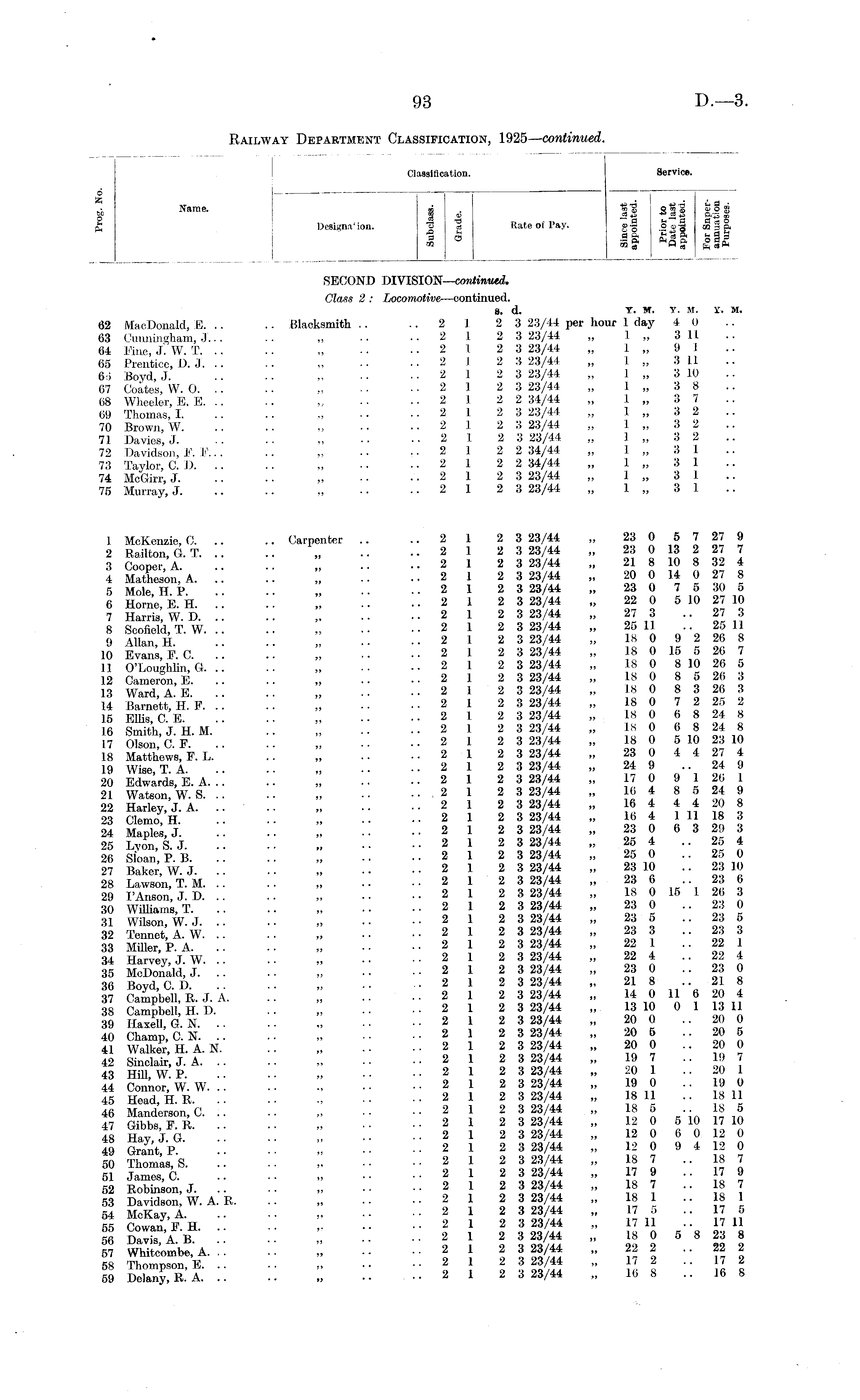 Classification. Service. o ; £5 * a M Name. « . 'g'S gS'g Bog op og <x> _£? J5 ftp m £ Designa'ion. "3 d Rate of Pay. ©■- .§©*§ w 3 a 1 5 l| III SECOND DIVISION—continued. Class 2 : Locomotive—continued. a. d. t. w. y. M. Y. M. 62 MacDonald, E. .. .. Blacksmith .. .. 2 1 2 3 23/44 per hour 1 day 40 63 Cunningham, J... .. „ •• ..2 1 2 3 23/44 „ 1 „ 3 11 64 Pine, J. W. T „ .. ..2 1 2 3 23/44 „ 1 „ 91 65 Prentice, D. J. .. .. ,, •• ..2 1 2 3 23/44 „ 1 „ 3 11 66 Boyd, J. .. .. ,, • • ..2 1 2 3 23/44 „ 1 „ 3 10 67 Coates, W. 0. .. .. „ • • ..2 1 2 3 23/44 „ 1 „ 38 68 Wheeler, E. E. .. .. „ • • ..2 1 2 2 34/44 „ 1 „ 37 69 Thomas, I. .. •. ,, • • ..2 1 2 3 23/44: „ 1 ,, 32 70 Brown, W. .. .. „ •• ..2 1 2 3 23/44 „ 1 „ 3 2 71 Davies, J. .. „ ■■ . . 2 1 2 3 23/44 „ 1 „ 3 2 72 Davidson, P. P... .. „ •• ..2 1 2 2 34/44 „ 1 „ 31 73 Taylor, C. D. .. .. „ .. ..2 1 2 2 34/44 „ 1 „ 31 74 MoGirr, J. .. .. „ • • ..2 1 2 3 23/44 „ 1 „ 31 75 Murray, J. .. .. „ • • ..2 1 2 3 23/44 „ 1 „ 31 1 McKenzie, C. .. .. Carpenter .. .. 2 1 23 23/44 „ 230 57279 2 Railton, G. T 2 1 2 3 23/44 „ 23 0 13 2 27 7 3 Cooper, A. .. .. ,, • • ..2 1 2 3 23/44 „ 21 8 10 8 3- 4 4 Matheson, A .. ..2 1 2 3 23/44 „ 20 0 14 0 27 8 5 Mole, H. P. .. .. „ .. ..2 1 2 3 23/44 „ 23 0 7 5 30 5 6 Home, E. H " .. ..2 1 2 3 23/44 „ 22 0 5 10 27 10 7 Harris, W. D „ .. ..2 1 2 3 23/44 „ 27 3 .. 27 3 8 Scofield T W •■ ..2123 23/44 „ 25 11 .. 25 11 9 AUanH !! 1! !! .. ..2 1 2 3 23/44 „ 18 0 9 2 26 8 10 Evans, F. C. .. „ • • ..2 1 2 3 23/44 „ 18 0 15 5 26 7 11 O'Loughlin, G .. ..2 1 2 3 23/44 „ 18 0 8 10 26 5 12 Cameron, E. .. „ • • ..2 1 2 3 23/44 „ 18 0 8 5 26 3 13 Ward, A. E. .. „ • • ..2 1 2 3 23/44 „ 18 0 8 3 26 3 14 Barnett, H. P " .. ..2 1 2 3 23/44 „ 18 0 7 2 25 2 15 Ellis C. E. .. .. „ ..2 1 2 3 23/44 „ 18 0 6 8 24 8 16 Smith, J. H. M. .. „ . • ..2 1 2 3 23/44 „ IK 0 6 8 24 8 17 Olson C. P. .. .. „ .. ..2 1 2 3 23/44 „ 18 0 5 10 23 10 18 Matthews, P. L. .. „ .. ..2 1 2 3 23/44 „ 23 'J 4 4 27 4 19 Wise, T. A. .. .. „ ■ • ..2 1 2 3 23/44 „ 24 9 24 9 20 Edwards, E. A. .. .. „ ■. ..2 1 2 3 23/44 „ 17 0 9 1 26 1 21 Watson, W. S. .. .. „ .. ..2 1 2 3 23/44 „ 16 4 5 4 22 Harlev J A ... „ . • ..2 1 2 3 23/44 „ 16 4 4 4 20 8 23 .. .. .. ..2 1 2 3 23/44 „ 16 4 1 11 18 3 24 Maple;, J ! .. ..2 1 2 3 23/44 „ 23 0 6 3 29 3 25 Lvon S J •• ..21 23 23/44 „ 25 4 .. 25 4 26 Sloan', P. B .. ..2 1 2 3 23/44 „ 25 0 .. 25 0 27 Baker W J • ■ ..2 1 2 3 23/44 „ 23 10 .. 2,i 10 28 Eaw S on W T.M. !! .. !! .. ..2 1 2 3 23 44 „ 23 6 23 6 29 I'Anson JD .. ,, .. ..21 23 23/44 „ 18 0 15 1 26 3 # « :: .. .. 2 1 2323/44 „ 230 .. 230 31 Wilson, W. J. .. • • „ • • ..2 1 2 3 23/44 „ 23 5 .. 23 5 32 Tennet, A. W. .. . . „ • • ..2 1 2 3 23/44 „ 23 3 23 3 33 Miller PA .. •• ..2123 23/44 „ 22 1 22 1 34 Harvey J W. ! •• ..2 1 2 3 23/44 „ 22 4 .. 22 4 35 McDonald, J „ .. ..2 1 2 3 23/44 „ 23 0 3 0 36 Bovd C. D. .. .. „ ■ • .2 1 2 3 23/44 „ 21 8 .. 21 8 37 Camu'bell RJA . .. ..2123 23/44 „ 14 0 11 6 20 4 38 Campbell H D. .. ..2 1 2 3 23/44 „ 13 10 0 1 1311 39 Haxe P n, G.N. .. .. " .. ..2 1 2 3 23/44 „ 20 0 .. 20 0 40 Champ, C. N. .. .. „ • • ..2 1 2 3 23/44 „ 20 5 .. 20 5 41 Walker, H. A. N. .. „ .. ..2 1 2 3 23/44 „ 20 0 .. 20 0 42 Sinclair J A .. • • ..2 1 2 3 23/44 „ 19 7 .. 19 7 43 Hill!w.'p. :: .. ;; .. ..212 32344 „ 20 1 .. 20 1 44 Connor W. W. .. . ■ • • ..2 1 2 3 23/44 „ 19 0 .. 19 0 H 5H H ; •• -2 1 2 3 23/44 „ 1811 .. 1811 46 Manderson, C. .. .. „ ■■ ..2 1 2 3 23/44 „ 18 5 .. 18 5 47 Gibbs PR... . ■ „ ■ • ..2 1 2 3 23/44 „ 12 0 5 10 17 10 48 Hav J G • • ..2 1 2 3 23/44 „ 12 0 6 0 12 0 49 St p :: :: . ..212 323/44 „ 12 0 9 4 12 0 50 Thomas S • • ..2 1 2 3 23/44 „ 18 7 .. 18 7 61 James C .. ..2 1 2 3 23/44 „ 17 9 .. 17 9 52 Robinson, J. " 2 1 2 3 23/44 „ 18 7 .. 18 7 53 Davidson. W. A. R. .. „ • • ..2 1 2 3 23/44 „ 18 1 .. 18 1 54 McKav A. .. ,, .. ..2 1 2 3 23/44 „ 17 5 .. 17 5 55 Cowan! P. H 2 1 2 3 23/44 „ 17 11 .. 17 11 56 Davis A. B , .. ..2 1 2 3 23/44 „ 18 0 5 8 23 8 57 WUtcombe, A „ .. ..2 1 2 3 23/44 „ 22 2 .. 22 2 58 Thompson, E. .. .. „ 2 1 2 3 23/44 „ 1/ 2 .. 1/ 2 59 Delany, R. A. .. .. „ • • ..2 1 2 3 23/44 „ 16 8 16 8