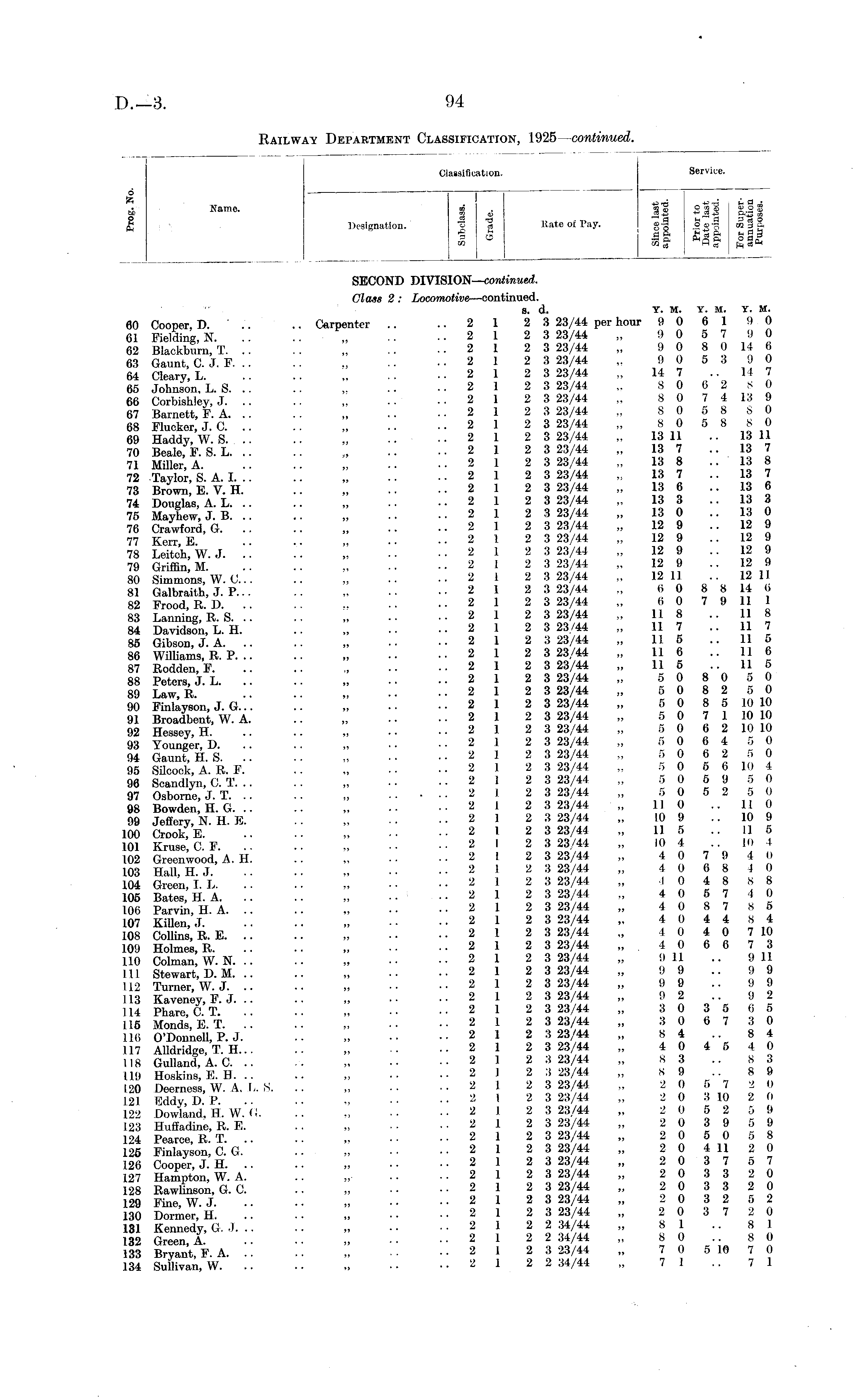 Classification. Service. o —~j " , +2 fQ fc-< ' u) Name - | o 35 ft-ll J? Designation. "3 « liate of Pay. g -g S ® ■§ in 3 a i 5 I si m g9£ SECOND DIVISION—continued. Glass 2 : Locomotive—continued. 8. d. Y. M. Y. M. Y. M. 00 Cooper, D. .. .. Carpenter .. ..2 1 2 3 23/44 per hour 9 0 6 1 9 0 61 Fielding, N 2 1 2 3 23/44 „ 9 0 5 7 9 0 62 Blackburn, T. .. .. „ .. ..2 1 2 3 23/44 „ 9 0 8 0 14 6 63 Gaunt, C. J. F. .. .. „ .. ..2 1 2 3 23/44 „ 9 0 5 3 9 0 64 Cleary, L. .. .. „ .. ..2 1 2 3 23/44 ,, 14 7 .. 14 7 65 Johnson, L. S. .. .. „ •. ..2 1 2 3 23/44 ,, 80 62 80 66 Corbishley, J. .. ,, .. ..2 1 2 3 23/44 „ 8 0 7 4 13 9 67 Barnett, F. A 2 1 2 3 23/44 „ 8 0 5 8 8 0 68 Flucker, J. C. .. .. „ .. ..2 1 2 3 23/44 „ 8 0 5 8 8 0 69 Haddy, W. S „ .. ..2 1 2 3 23/44 „ 13 11 .. 13 11 70 Beale, F. S. L. .. .. „ .. ..2 1 2 3 23/44 „ 13 7 .. 13 7 71 Miller,A .. ..2 1 2 3 23/44 „ 13 8 .. 72 Taylor, S. A. I. .. .. „ .. ..2 1 2 3 23/44 „ 13 7 .. 13 7 73 Brown, E. V. H. .. „ .. ..2 1 2 3 23/44 „ 13 6 .. 13 6 74 Douglas, A. L. .. .. „ .. ..2 1 2 3 23/44 „ 13 3 .. 13 3 75 Mayhew, J. B. .. .. „ .. ..2 1 2 3 23/44 „ 13 0 .. 13 0 76 Crawford, 6. .. „ • • ..2 1 2 3 23/44 „ 12 9 .. 12 9 77 Kerr, E 2 1 2 3 23/44 „ 12 9 .. 12 9 78 Leitoh, W.J „ • • ..2 1 2 3 23/44 „ 12 9 .. 12 9 79 Griffin; M 2 1 2 3 23/44 „ 12 9 .. 12 9 80 Simmons, W. C... .. „ ..2 1 2 3 23/44 „ 12 11 .. 12 11 81 Galbraith, J. P .. ..2 1 2 3 23/44 „ 6 0 8 8 14 0 82 Frood, R. D .. ..2 1 2 3 23/44 „ 6 0 7 9 11 1 83 Lanning, R. S. .. 2 1 2 3 23/44 „ 11 8 .. 11 8 84 Davidson, L. H. .. „ .. ..2 1 2 3 23/44 „ - " !} ' 85 Gibson, J. A •• ..2 1 2 3 23/44 „ 11 5 .. 11 5 86 Williams, R. P. .. ..2 1 2 3 23/44 „ 11 6 .. 11 6 87 Rodden, F. .. .. „ •• ..2 1 2 3 23/44 „ 11 5 .. 11 5 88 Peters, J. L .. ..2 1 2 3 23/44 „ 5 0 8 0 5 0 89 Law, R 2 1 2 3 23/44 „ 5 0 8 2 5 0 90 Finlayson, J. G 2 1 2 3 23/44 „ 5 0 8 5 10 10 91 Broadbent, W. A. .. „ • • ..2 1 2 3 23/44 „ 5 0 7 1 10 10 92 Hessey, H. .. .. „ • • ..2 1 2 3 23/44 „ 50 b 2 10 10 93 Y ounger, D „ .. ..2 1 2 3 23/44 „ 5 0 6 4 5 0 94 Gaunt, H. S „ •• ..2 1 2 3 23/44 „ 5 0 6 2 5 0 95 Silcock, A. R. F 2 1 2 3 23/44 „ 5 0 5 6 10 4 96 Scandlyn, C. T „ ■ • ..2 1 2 3 23/44 „ 5 0 5 9 5 0 97 Osborne, J. T .....2 1 2 3 23/44 „ 5 0 5 2 5 0 98 Bowden, H. G „ ... ..2 1 2 3 23/44 „ 11 0 .. 11 0 99 Jeffery, N. H. E 2 1 2 3 23/44 „ 10 9 .. 10 9 100 Crook, E. .. .. „ • • ..2 1 2 3 23/44 „ 11 5 11 5 101 Kruse, C. F. .. .. „ •• ..2 1 2 3 23/44 „ 10 4 .. 10 4 102 Greenwood, A. H. .. ,, • • ..2 1 2 3 23/44 ,, 4 0 7 9 4 0 103 Hall, H. J 2 1 2 3 23/44 „ 4 0 6 8 4 0 104 Green, I. L .. ..2 1 2 3 23/44 „ 4 0 4 8 8 8 105 Bates H. A 2 1 2 3 23/44 „ 4 0 5 7 4 0 106 Parvin, H. A „ • • ..2 1 2 3 23/44 „ 4 0 8 7 8 5 107 KiUen J .. „ • • ..2 1 2 3 23/44 „ 4 0 4 4 8 4 108 Collins', RE •• ..2 1 2 3 23/44 „ 4 0 4 0 7 10 109 Holmes, R .. ..2 1 2 3 23/44 „ . 4 0 6 6 7 3 110 Colman, W. N. .. ..2 1 2 3 23/44 „ 911 .. 911 111 Stewart, D. M. .. .. „ ..2 1 2 3 23/44 „ 9 9 .. 9 9 112 Turner, W.J 2 1 2 3 23/44 „ 9 9 .. 9 9 113 Kaveney, F. J. .. .. „ ..2 1 2 3 23/44 „ 9 2 .. 9 2 114 Phare, C. T .. ..2 1 2 3 23/44 „ 3 0 3 5 6 5 115 Monds, E. T. .. .. „ •• ..2 1 2 3 23/44 „ 3 0 6 7 3 0 116 O'Donnell, P. J. .. „ • ■ ..2 1 2 3 23/44 „ 84 .. 84 117 Alldridge, T. H .. ..2 1 2 3 23/44 „ 4 0 4 5 4 0 118 Gulland, A. C 2 1 2 3 23/44 „ 8 3 .. 8 3 119 Hoskins, E. H ..2 1 2 3 23/44 „ 8 9 .. 8 9 120 Deerness, W. A. L. S. ,. „ • • ..2 1 2 3 23/44 „ 2 0 5 7 2 0 121 Eddy, D. P. .. .. „ •• ..2 1 2 3 23/44 „ 2 0 .1 10 2 0 122 Dowland, H. W. G. .. „ • ■ ..2 1 2 3 23/44 „ 2 0 5 2 5 9 123 Huffadine, R. E. .. „ .. ..2 1 2 3 23/44 „ 2 0 3 9 5 9 124 Pearce, R. T 2 1 2 3 23/44 „ 2 0 5 0 5 8 125 Finlayson, C. G. .. „ •• ..2 1 2 3 23/44 „ 20 411 20 126 Cooper, J. H 2 1 2 3 23/44 „ 2 0 3 7 5 7 127 Hampton, W. A. .. „ .. ..2 1 2 3 23/44 „ 2 0 3 3 2 0 128 Rawlinson, G. C. .. „ • ■ ..2 1 2 3 23/44 „ 2 0 3 3 2 0 129 Fine, W. J. . • •. » • - ..2 1 2 3 23/44 „ 2 0 3 2 5 2 130 Dormer, H. .. .. „ • • ..2 1 2 3 23/44 „ 2 0 3 7 2 0 131 Kennedy, G. J. .. • • „ • • ..2 1 2 2 34/44 „ 81 .. 81 1?2 Green A .. .. 2 1 2 2 34/44 „ 8 0 .. 8 0 133 Bryant, F. A. .. .. „ •• ..2 1 2 3 23/44 „ 7 0 5 10 7 0 134 Sullivan, W. .. .. 2 1 2 2 34/44 „ 7 1 .. 7 1