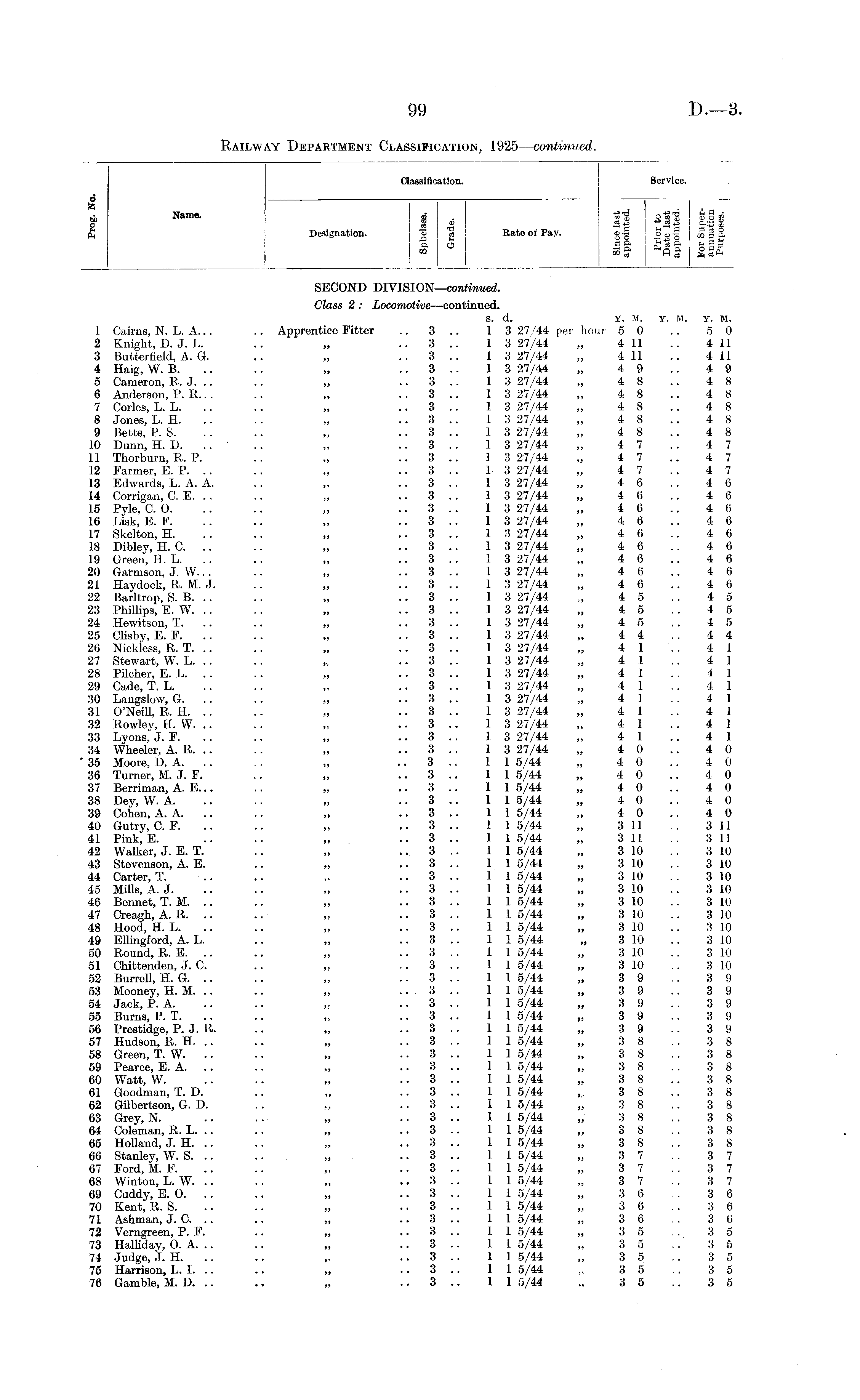 Classification. \ Service. o — — 5 Name - i * 11 sfs in £ Designation. "3 a Hate of Pay. g ■§ o « -9 £ g 2, a. & So^ SECOND DIVISION—continued. Class 2 : Locomotive—continued. S. d. Y. M. Y. M. Y. M. 1 Cairns, N. L. A... .. Apprentice Fitter .. 3 .. 1 3 27/44 per hour 5 0 .. 5 0 2 Knight, D. J. L. .. „ .. 3 .. 1 3 27/44 „ 4 11 .. 4 11 3 Butterfield, A. G. .. „ .. 3 .. 1 3 27/44 „ 4 11 .. 4 11 4 Haig, W. B „ .. 3 .. 1 3 27/44 „ 4 9 .. 4 9 5 Cameron, B. J. .. .. „ .. 3 .. 1 3 27/44 „ 4 8 .. 4 8 6 Anderson, P. B... .. „ 3 1 3 27/44 „ 4 8 .. 4 8 7 Corles, L. L. .. .. „ .. 3 .. 1 3 27/44 „ 4 8 .. 4 8 8 Jones, L. H. .. „ .. 3 .. 1 3 27/44 „ 4 8 .. 4 8 9 Betts, P. S. .. .. „ .. 3 .. 1 3 27/44 „ 4 8 .. 4 8 10 Dunn, H. D. .. ' .. „ .. 3 .. 1 3 27/44 „ 4 7 .. 4 7 11 Thorburn, B. P. .. „ .. 3 .. 1 3 27/44 „ 4 7 .. 4 7 12 Farmer, E. P. .. .. „ .. 3 .. 1 3 27/44 „ 4 7 .. 4 7 13 Edwards, L. A. A. .. „ . 3 .. 1 3 27/44 „ 4 6 .. 4 6 14 Corrigan, C. E. .. .. „ .. 3 .. 1 3 27/44 „ 4 6 .. 4 6 15 Pyle, C. 0. .. .. „ .. 3 .. 1 3 27/44 „ 4 6 .. 4 6 16 Lisk, E. F. .. .. „ .. 3 .. 1 3 27/44 „ 4 6 .. 4 6 17 Skelton, H. . . .. „ .. 3 .. 1 3 27/44 „ 4 6 .. 4 6 18 Dibley, H. C. .. .. „ .. 3 .. 1 3 27/44 „ 4 6 .. 4 6 19 Green, H. L. .. .. „ .. 3 .. 1 3 27/44 „ 4 6 .. 4 6 20 Garmson, J. W... .. „ .. 3 .. 1 3 27/44 „ 4 6 .. 4 6 21 Hay dock, B. M. J. .. „ 3 .. 1 3 27/44 „ 4 6 .. 4 6 22 Barltrop, S. B. .. .. „ .. 3 .. 1 3 27/44 „ 4 5 .. 4 5 23 Phillips, E. W. .. .. „ .. 3 .. 1 3 27/44 „ 4 5 .. 4 5 24 Hewitson, T. .. .. „ .. 3 .. 1 3 27/44 „ 4 5 .. 4 5 25 Clisby, E. F. .. .. „ .. 3 .. 1 3 27/44 „ 4 4 .. 4 4 26 Niokless, B. T. .. .. „ .. 3 .. 1 3 27/44 „ 4 1 .. 4 1 27 Stewart, W. L. .. .. >v .. 3 .. 1 3 27/44 „ 4 1 .. 4 1 28 Pilcher, E. L. .. .. „ .. 3 .. 1 3 27/44 „ 4 1 .. 4 1 29 Cade, T. L. .. .. „ .. 3 .. 1 3 27/44 „ 4 1 .. 4 1 30 Langslow, G. .. .. „ .. 3 .. 1 3 27/44 „ 4 1 .. 4 1 31 O'Neill, B. H. .. .. „ .. 3 .. 1 3 27/44 „ 4 1 .. 4 1 32 Bowley, H. W. .. .. „ .. 3 .. 1 3 27/44 „ 4 1 .. 4 1 33 Lyons, J. F. .. „ .. 3 .. 1 3 27/44 ,. 4 1 .. 4 1 34 Wheeler, A. B. .. .. „ 3 .. 1 3 27/44 „ 4 0 .. 4 0 ' 36 Moore, D. A. .. .. „ .. 3 .. 11 5/44 „ 4 0 .. 4 0 36 Turner, M. J. F. .. „ 3 11 5/44 „ 4 0 .. 4 0 37 Berriman, A. E... .. „ 3 .. 11 5/44 „ 4 0 .. 4 0 38 Dey, W. A. .. .. „ .. 3 .. 11 5/44 „ 4 0 .. 4 0 39 Cohen, A. A. .. .. „ .. 3 .. 11 5/44 „ 4 0 .. 4 0 40 Gutry, C. F. .. .. „ .. 3 .. 1 15/44 „ 3 11 3 11 41 Pink, E. .. .. „ .. 3 .. 1 15/44 „ 3 11 .. 3 11 42 Walker, J. E. T. .. „ .. 3 .. 11 5/44 „ 3 10 .. 3 10 43 Stevenson, A. E. .. „ 3 11 5/44 „ 3 10 .. 3 10 44 Carter, T. .. .. „ .. 3 .. 1 15/44 „ 3 10 .. 3 10 45 Mills, A. J. .. .. „ .. 3 .. 11 5/44 „ 3 10 . . 3 10 46 Bennet, T. M. .. .. „ .. 3 .. 1 15/44 „ 3 10 .. 3 10 47 Creagh, A. B. .. .. „ .. 3 .. 11 5/44 „ 3 10 .. 3 10 48 Hood, H. L. .. „ .. 3 .. 11 5/44 „ 3 10 .. 3 10 49 Ellingford, A. L. .. „ 3 11 5/44 „ 3 10 .. 3 10 50 Bound, B. E. .. ,, 3 11 5/44 „ 3 10 .. 3 10 51 Chittenden, J. C. .. „ 3 1 1 5/44 „ 3 10 .. 3 10 52 Burrell, H. G. .. .. „ .. 3 .. 11 5/44 „ 3 9 .. 3 9 53 Mooney, H. M. .. .. „ .. 3 .. 11 5/44 „ 3 9 .. 3 9 54 Jack, P. A. .. .. „ .. 3 .. 11 5/44 „ 3 9 3 9 55 Burns, P. T. .. „ .. 3 .. 11 5/44 „ 3 9 .. 3 9 56 Prestidge, P. J. B. .. „ .. 3 .. 11 5/44 „ 3 9 .. 3 9 57 Hudson, B. H. .. .. „ 3 1 1 5/44 „ 3 8 .. 3 8 58 Green, T. W. .. .. „ .. 3 .. 11 5/44 „ 3 8 .. 3 8 59 Pearce, E. A. .. .. „ .. 3 .. 11 5/44 „ 3 8 .. 3 8 60 Watt, W. .. .. „ .. 3 .. 11 5/44 „ 3 8 .. 3 8 61 Goodman, T. D. .. „ .. 3 .. 11 5/44 „ 3 8 .. 3 8 62 Gilbertson, G. D. .. ,, 3 .. 11 5/44 „ 3 8 .. 3 8 63 Grey, N. .. .. „ .. 3 .. 11 5/44 „ 3 8 .. 3 8 64 Coleman, B. L. .. .. „ .. 3 .. 11 5/44 „ 3 8 .. 3 8 65 Holland, J. H. .. .. „ .. 3 .. 11 5/44 „ 3 8 .. 3 8 66 Stanley, W. S. .. .. „ .. 3 .. 11 5/44 „ 3 7 .. 3 7 67 Ford, M. F. .. „ .. 3 .. 1 1 5/44 „ 3 7 .. 3 7 68 Winton, L. W. .. .. „ .. 3 .. 11 5/44 „ 3 7 .. 3 7 69 Cuddy, E. O. .. .. „ .. 3 .. 11 5/44 „ 3 6 . . 3 6 70 Kent, B. S. .. .. „ .. 3 .. 11 5/44 „ 3 6 . . 3 6 71 Ashman, J. C. .. .. „ 3 .. 11 5/44 „ 3 6 .. 3 6 72 Verngreen, P. F. .. „ 3 11 5/44 „ 3 5 .. 3 5 73 Halliday, O. A. .. .. „ .. 3 .. 11 5/44 „ 3 5 .. 3 5 74 Judge, J. H. .. .. ,. .. 3 .. 11 5/44 „ 3 5 .. 3 5 75 Harrison, L. I. .. .. „ 3 11 5/44 „ 3 5 .. 3 5 76 Gamble, M. D. .. .. „ 3 .. 11 5/44 „ 3 5 .. 3 5