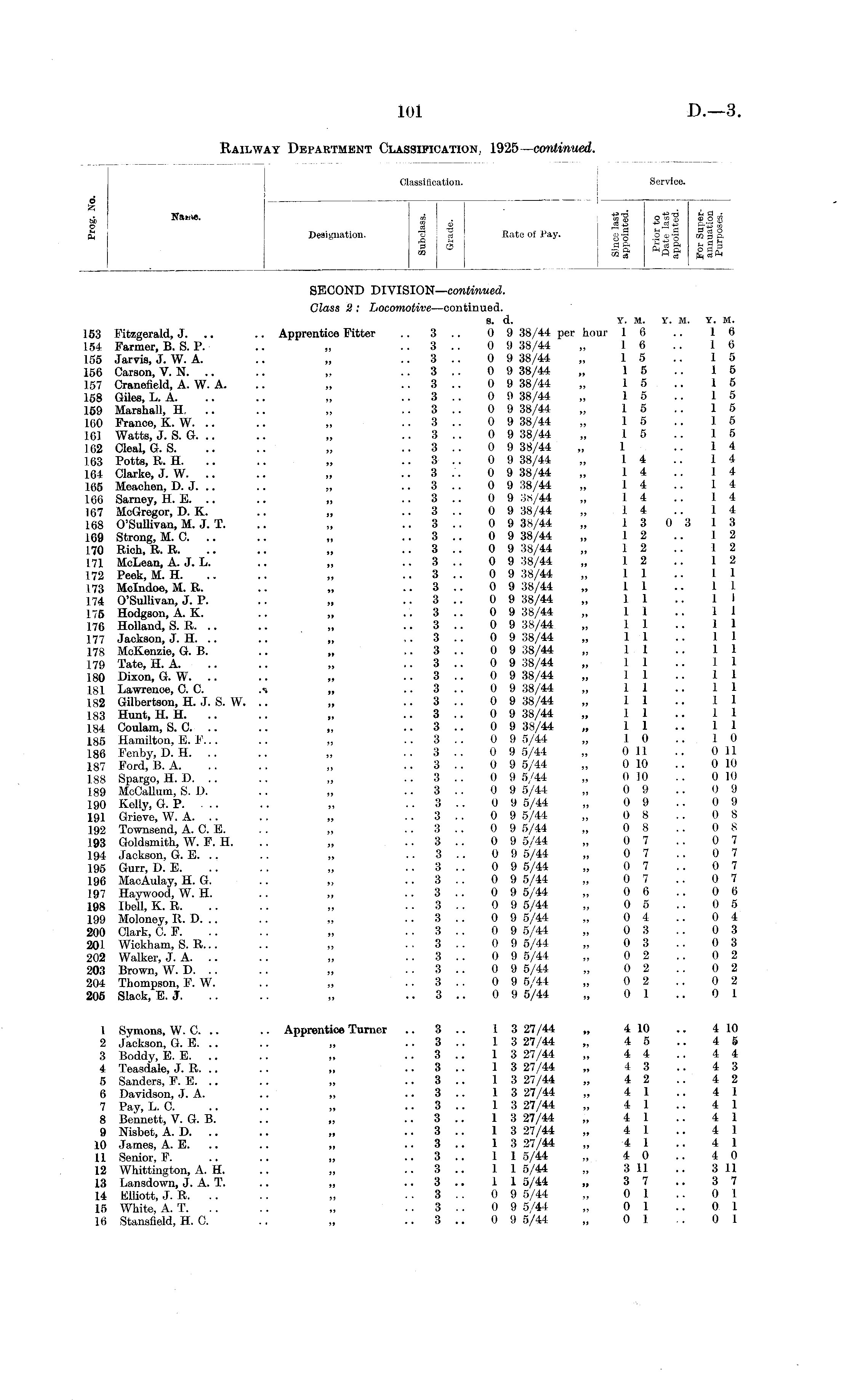 j Classification. j Service. I 1 — g> | « II s$t ||| £ Designation. o £ Rate of Pay. g o ® •§ & $ p. 5 3 II 'fill lis SECOND DIVISION—continued. Glass 2 : Locomotive —continued. s. d. Y. m. v. M. v. M. 153 Fitzgerald, J. .. Apprentice Fitter .. 3 .. 0 9 38/44 per hour 16 .. 16 154 Farmer, B. S. P. .. „ .. 3 .. 0 9 38/44 „ 16 .. 16 155 Jarvis, J. W. A. .. „ .. 3 .. 0 9 38/44 „ 15 .. 15 156 Carson, V. N. .. .. ,. .. 3 .. 0 9 38/44 „ 15 .. 15 157 Cranefield, A. W. A. .. „ .. 3 .. 0 9 38/44 „ 15 .. 15 158 Giles, L. A „ .. 3 .. 0 9 38/44 „ 15 .. 15 159 Marshall, H. .. .. „ .. 3 .. 0 9 38/44 „ 15 .. 15 160 France, K. W „ .. 3 .. 0 9 38/44 „ 15 .. 15 161 Watts, J. S. G. .. .. „ .. 3 .. 0 9 38/44 „ 15 .. 15 162 Oleal, G. S „ .. 3 .. 0 9 38/44 „ 1 ..14 163 Potts, R. H „ .. 3 .. 0 9 38/44 „ 14 .. 14 164 Clarke, J. W „ .. 3 .. 0 9 38/44 „ 14 .. 14 165 Meachen, D. J. .. .. „ .. 3 .. 0 9 38/44 „ 14 .. 14 166 Sarney, H. E. .. .. „ 3 0 9 38/44 „ 14 .. 14 167 McGregor, D. K. .. „ .. 3 .. 0 9 38/44 „ 14 .. 14 168 O'Sullivan, M. J. T. .. „ .. 3 .. 0 9 38/44 „ 1 3 0 3 13 169 Strong, M. C. .. „ 3 0 9 38/44 „ 12 .. 12 170 Rich, R. R. .. „ .. 3 .. 0 9 38/44 „ 12 .. 12 171 McLean, A. J. L. .. „ .. 3 .. 0 9 38/44 „ 12 .. 12 172 Peek, M. H. .. „ .. 3 .. 0 9 38/44 „ 11 .. 11 173 Mclndoe, M. R. .. „ .. 3 .. 0 9 38/44 „ 11 .. J 1 174 O'Sullivan, J. P. .. „ .. 3 .. 0 9 38/44 „ 11 .. II 175 Hodgson, A. K. .. „ 3 .. 0 9 38/44 „ 11 .. 11 176 Holland, S. R „ .. 3 .. 0 9 38/44 „ 11 .. 11 177 Jackson, J. H „ 3 .. 0 9 38/44 „ 11 .. 11 178 McKenzie, G. B. .. „ .. 3 .. 0 9 38/44 „ 11 .. 11 179 Tate, H. A. .. .. „ .. 3 .. 0 9 38/44 „ 11 .. 11 180 Dixon, G. W „ .. 3 .. 0 9 38/44 „ 11 .. 11 181 Lawrenoe, C. C. .n „ 3 .. 0 9 38/44 „ 11 .. 11 182 Gilbertson, H. J. S. W. .. „ .. 3 .. 0 9 38/44 „ 11 .. 11 183 Hunt, H. H „ .. 3 .. 0 9 38/44 „ 11 .. 11 184 Coulam, S. C. .. .. „ .. 3 .. 0 9 38/44 „ 11 .. 11 185 Hamilton, E. F... .. „ .. 3 .. 0 9 5/44 „ 10 .. 10 186 Fenby, D. H. .. .. „ .. 3 .. 0 9 5/44 „ 0 11 .. 0 11 187 Ford, B. A. .. .. „ .. 3 .. 0 9 5/44 „ 0 10 .. 0 10 188 Spargo, H. D „ .. 3 .. 0 9 5/44 „ 0 10 .. 0 10 189 McCaUum, S. D. .. „ .. 3 .. 0 9 5/44 „ 0 9 .. 0 9 190 Kelly, G. P. .. „ .. 3 .. 0 9 5/44 „ 0 9 .. 0 9 191 Grieve, W. A. .. „ 3 0 9 5/44 „ 0 8 .. 0 8 192 Townsend, A. C. E. .. „ .. 3 .. 0 9 5/44 „ 0 8 .. 0 8 193 Goldsmith, W. F. H. .. „ .. 3 .. 0 9 5/44 „ 0 7 .. 0 7 194 Jackson, G. E. .. .. ,, 3 0 9 5/44 „ 0 7 .. 0 7 195 Gurr, D. E „ .. 3 .. 0 9 5/44 „ 0 7 .. 0 7 196 MacAulay, H. G. .. „ .. 3 .. 0 9 5/44 „ 0 7 .. 0 7 197 Havwood, W. H. .. „ .. 3 .. 0 9 5/44 „ 0 6 .. 0 6 198 Ibell, K. R. .. .. „ .. 3 .. 0 9 5/44 „ 0 5 .. 0 5 199 Moloney, R. D „ .. 3 .. 0 9 5/44 „ 0 4 .. 0 4 200 Clark, C. F. .. .. „ .. 3 .. 0 9 5/44 „ 0 3 .. 0 3 201 Wickham, S. R... .. „ .. 3 .. 0 9 5/44 „ 0 3 .. 0 3 202 Walker, J. A „ .. 3 .. 0 9 5/44 „ 0 2 .. 0 2 203 Brown, W. D. .. .. „ .. 3 .. 0 9 5/44 „ 0 2 .. 0 2 204 Thompson, F. W. .. „ .. 3 .. 0 9 5/44 „ 0 2 .. 0 2 205 Slack, E. J. .. .. „ .. 3 .. 0 9 5/44 „ 0 1 .. 0 1 1 Symons, W. C. .. .. Apprentice Turner .. 3 .. 1 3 27/44 „ 4 10 .. 4 10 2 Jackson, G. E. .. .. ,, 3 1 3 27/44 „ 4 5 .. 4 5 3 Boddy, E. E. .. .. „ .. 3 .. 1 3 27/44 „ 4 4 .. 4 4 4 Teasdale, J. R. .. .. „ .. 3 .. 1 3 27/44 „ 4 3 .. 4 3 5 Sanders, F. E. .. .. ,, 3 1 3 27/44 „ 4 2 .. 4 2 6 Davidson, J. A. .. „ 3 1 3 27/44 ,, 4 1 .. 4 1 7 Pay, L. C. .. .. „ .. 3 .. 1 3 27/44 „ 4 1 .. 4 1 8 Bennett, V. G. B. .. „ .. 3 .. 1 3 27/44 „ 4 1 .. 4 1 9 Nisbet, A. D. .. .. „ .. 3 .. 1 3 27/44 „ 4 1 .. 4 1 10 James, A. E. .. .. „ .. 3 .. 1 3 27/44 „ 4 1 .. 4 1 11 Senior, F. .. .. „ 3 1 1 5/44 ,, 4 0 .. 4 0 12 Whittington, A. H. .. „ 3 I 1 5/44 ,, 3 11 .. 3 11 13 Lansdown, J. A. T. .. „ 3 .. 11 5/44 „ 3 7 .. 3 7 14 Elliott, J. R. .. .. „ .. 3 .. 0 9 5/44 „ 0 1 .. 0 1 15 White, A. T. .. .. „ .. 3 .. 0 9 5/44 „ 0 1 .. 0 1 16 Stansfield, H. C. .. ,, 3 0 9 5/44 ,, 0 1 .. 0 1