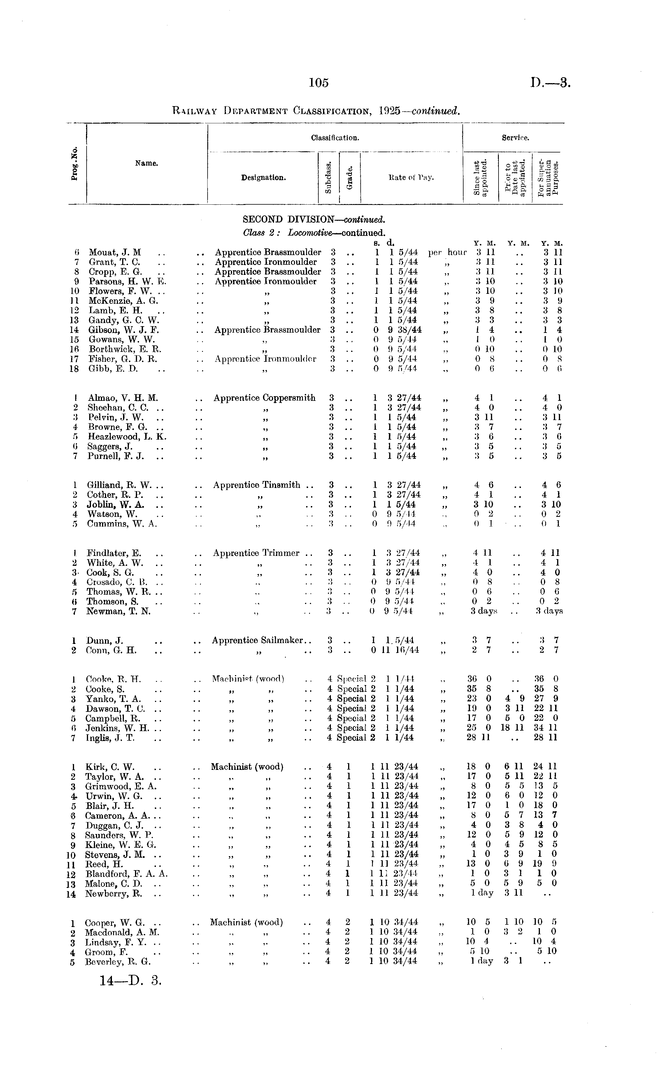 Classification. Service. 0 fc 1 Name - & . ■§■§ OS'S 0 e§ p.-- £ Designation. ]S g Kate of Pay. g S«■§ to S b, «S ° a? SECOND DIVISION—continued. Glass 2 : Locomotive—continued. s. d. y. M. Y. M. Y. M. 6 Mouat, J. M .. .. Apprentice Brassmoulder 3 .. 11 5/44 per hour 3 11 .. 3 11 7 Grant, T. C. .. .. Apprentice Ironmoulder 3 .. 11 5/44 „ 3 11 .. 3 11 8 Cropp, E. G. .. .. Apprentice Brassmoulder 3 .. 11 5/44 „ 3 11 .. 3 11 9 Parsons, H. W. E. .. Apprentice Ironmoulder 3 11 5/44 ,, 3 10 .. 3 10 10 Elowers, E. W. .. .. „ 3 .. 11 5/44 „ 3 10 .. 3 10 11 McKenzie, A. G. .. „ 3 .. 1 15/44 „ 3 9 .. 3 9 12 Lamb, E. H. .. .. „ 3 .. 1 1 5/44 „ 3 8 .. 3 8 13 Gandy, G. C. W. .. „ 3 .. 1 1 5/44 „ 3 3 .. 3 3 14 Gibson, W. J. E. .. Apprentice Brassmoulder 3 .. 0 9 38/44 „ 14 .. 14 15 Gowans, W. W. • . „ 3 .. 0 9 5/44 „ 10 .. 10 16 Borthwick, E. R. . . „ 3 .. 0 9 5/44 „ 0 10 .. 0 10 17 Eisher, G. D. R. .. Apprentice Ironmoulder 3 0 9 5/44 „ 0 8 .. 0 8 18 Gibb, E. D. .. .. „ 3 .. 0 9 5/44 „ 0 6 .. 0 6 1 Almao, V. H. M. .. Apprentice Coppersmith 3 .. 1 3 27/44 „ 4 1 .. 4 1 2 Sheehan, C.C. .. .. „ 3 ... 1 3 27/44 „ 4 0 .. 4 0 3 Pelvin, J. W. .. .. „ 3 .. 1 15/44 „ 3 11 .. 3 11 4 Browne, E. G. .. .. „ 3 11 5/44 „ 3 7 .. 3 7 5 Heazlewood, L. K. .. „ 3 .. 1 1 5/44 „ 3 6 .. 3 6 6 Saggers, J. .. „ 3 .. 1 1 5/44 „ 3 5 .. 3 5 7 Purnell, F. J. .. .. „ 3 .. 1 1 5/44 „ 3 5 .. 3 5 1 Gilliand, R. W. .. .. Apprentice Tinsmith .. 3 .. 1 3 27/44 „ 4 6 .. 4 6 2 Cother, R. P. .. .. „ .. 3 .. 1 3 27/44 „ 4 1 .. 4 1 3 Joblin, W. A. .. .. „ .. 3 .. 11 5/44 „ 3 10 .. 3 10 4 Watson, W. .. .. ,. .. 3 .. 0 9 5/44 ., 0 2 .. 0 2 5 Cummins, W. A. . . „ . . 3 .. 0 9 5/44 .. 0 1 . . 0 1 I. Eindlater, E. .. .. Apprentice Trimmer .. 3 1 3 27/44 „ 4 11 .. 4 11 2 White, A. W. .. .. „ .. 3 .. 1 3 27/44 „ 4 1 .. 4 1 3- Cook, S. G. .. .. „ .. 3 .. 1 3 27/44 „ 4 0 .. 4 0 4 Crosado, C. B. .. 3 . . 0 9 5/44 .. 0 8 . . 0 8 5 Thomas, W. R, .. . . . . 3 .. 0 9 5/44 „ 0 6 .. 0 6 6 Thomson, S. .. ,, 3 0 9 5/44 „ 0 2 .. 0 2 7 Newman, T. N. . . „ 3 .. 0 9 5/44 „ 3 days .. 3 days 1 Dunn, J. .. .. Apprentice Sailmaker.. 3 .. 1 1.5/44 „ 3 7 .. 3 7 2 Conn, G. H. .. .. „ .. 3 .. 0 1116/44 „ 2 7 .. 2 7 1 Cooke, R. H. .. .. Machinist (wood) .. 4 Special 2 1 1/44 .. 36 0 .. 36 0 2 Cooke, S. .. .. ,, „ ..4 Special 2 1 1/44 „ 35 8 .. 35 8 3 Yanko, T. A. .. .. „ „ .. 4 Special 2 1 1/44 ., 23 0 4 9 27 9 4 Dawson, T. C. .. .. „ „ .. 4 Special 2 1 1/44 „ 19 0 3 11 22 11 5 Campbell, R. .. .. „ „ .. 4 Special 2 1 1/44 „ 17 0 5 0 22 0 6 Jenkins, W. H. .. .. „ „ .. 4 Special 2 11/44 „ 25 0 18 11 34 11 7 Inglis, J. T. .. .. „ „ .. 4 Special 2 11/44 „ 28 11 .. 28 11 1 Kirk, C. W. .. .. Machinist (wood) .. 4 1 1 11 23/44 „ 18 0 6 11 24 11 2 Taylor, W. A. .. .. ,. „ ..4 1 1 11 23/44 „ 17 0 5 11 22 11 3 Grimwood, E. A. .. „ „ ..4 1 1 11 23/44 „ 8 0 5 5 13 5 4- Urwin, W. G. .. .. „ „ ..41 111 23/44 „ 12 0 6 0 12 0 5 Blair, J. H. .. .. „ „ ..4 1 1 11 23/44 „ 17 0 1 0 18 0 6 Cameron, A. A. .. .. „ ..4 1 1 11 23/44 „ 8 0 5 7 13 7 7 Duggan, C. J. .. .. „ „ ..4 1 1 11 23/44 „ 4 0 3 8 4 0 8 Saunders, W. P. .. „ „ ..4 1 1 11 23/44 „ 12 0 5 9 12 0 9 Kleine, W. E. G. .. „ „ ..4 1 1 11 23/44 „ 4 0 4 5 8 5 10 Stevons, J. M „ ..4 1 1 11 23/44 „ 1 0 3 9 1 0 11 Reed, H. .. .. „ ., ..4 1 1 11 23/44 „ 13 0 6 9 19 9 12 Blandford, E. A. A. .. „ „ ..4 1 1 11 23/44 „ 10 3 110 13 Malone, C. D. .. .. „ „ ..4 1 1 11 23/44 „ 5 0 5 9 5 0 14 Newberry, R. .. .. „ „ ..4 1 1 11 23/44 „ 1 day 3 11 1 Cooper, W. G. .. .. Machinist (wood) .. 4 2 1 10 34/44 ,, 10 5 1 10 10 5 2 Macdonald, A. M. .. „ „ ..4 2 1 10 34/44 „ 1 0 3 2 1 0 3 Lindsay, E. Y. .. .. ,. ..4 2 1 10 34/44 „ 10 4 .. 10 4 4 Groom, E „ „ .. 4 2 1 10 34/44 „ 5 10 .. 5 10 5 Beverley, R. G. .. ,, „ ..4 2 1 10 34/44 „ 1 day 31