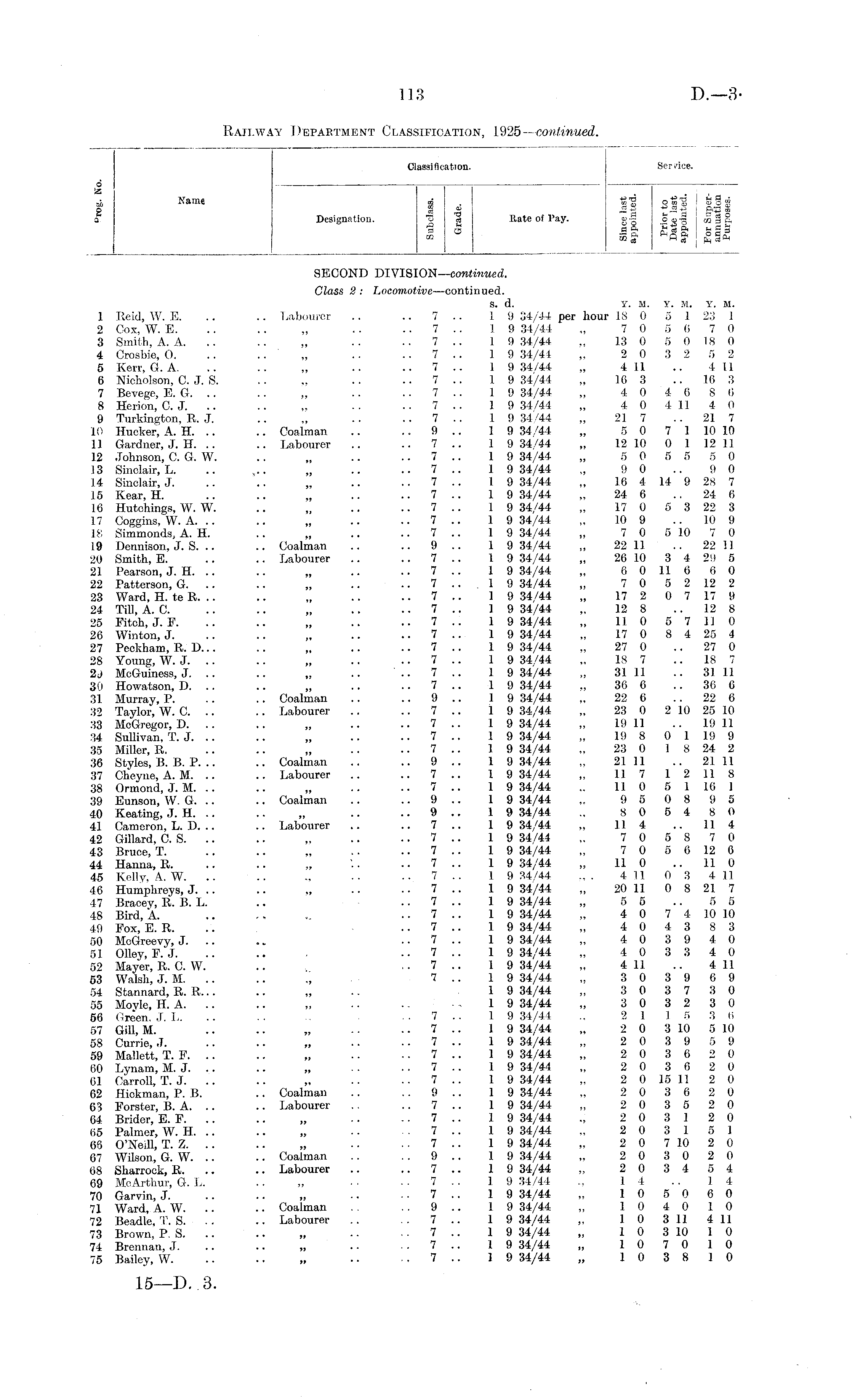Classification. Service. 0 — M Kam6 | » II 2 1S l|| a Designation. "3 *§ Rate of Pay. »•§ ©«■§ 023° if gfl§ 115 SECOND DIVISION—continued. Glass 2 : Locomotive—continued. s. d. y. m. y. M. Y. M. 1 Beid, W. E. .. .. Labourer .. .. 7 1 9 34/44 per hour 18 0 5 1 23 1 2 Oox, W. E. .. .. „ .. 7 .. 1 9 34/44 „ 7 0 5 6 7 0 3 Smith, A. A. .. .. „ .. .. 7 .. 1 9 34/44 „ 13 0 5 0 1.8 0 4 Grosbie, 0. .. .. „ .. .. 7 .. 1 9 34/44 „ 2 0 3 2 5 2 5 Kerr, G. A. .. .. „ .. .. 7 .. 1 9 34/44 „ 4 11 .. 4 11 6 Nicholson, C. J. S. .. „ .. .. 7 .. 1 9 34/44 „ 16 3 16 3 7 Bevege, E. G. .. .. „ .. .. 7 .. 1 9 34/44 „ 4 0 4 6 8 6 8 Herion, C. J. .. .. „ .. .. 7 .. 1 9 34/44 „ 4 0 4 11 4 0 9 Turkington, B. J. .. „ .. .. 7 .. 1 9 34/44 „ 21 7 .. 21 7 10 Hucker, A. H. .. .. Coalman .. .. 9 1 9 34/44 „ 5 0 7 1 10 10 11 Gardner, J. H. .. .. Labourer .. .. 7 .. 1 9 34/44 „ 12 10 0 1 12 11 12 Johnson, C. G. W .. 7 .. 1 9 34/44 „ 5 0 5 5 5 0 13 Sinclair, L. .. ... „ .. .. 7 .. 1 9 34/44 „ 9 0 .. 9 0 14 Sinclair, J .. .. 7 .. 1 9 34/44 „ 16 4 14 9 28 7 15 Kear, H. 7 .. 1 9 34/44 „ 24 6 .. 24 6 16 Hutchings, W. W. .. „ .. .. 7 .. 1 9 34/44 „ 17 0 5 3 22 3 17 Coggins, W. A. .. .. „ .. .. 7 1 9 34/44 „ 10 9 .. 10 9 18 Simmonds, A. H. „ .. .. 7 .. 1 9 34/44 „ 7 0 5 10 7 0 19 Dennison, J. S. .. .. Coalman .. .. 9 1 9 34/44 ,, 22 11 .. 22 11 20 Smith, E. .. .. Labourer .. .. 7 .. 1 9 34/44 „ 26 10 3 4 29 5 21 Pearson, J. H. .. .. „ .. .. 7 .. 1 9 34/44 „ 6 0 11 6 6 0 22 Patterson, G. .. .. 7 ... 1 9 34/44 „ 7 0 5 2 12 2 23 Ward, H. te B 7 .. 1 9 34/44 „ 17 2 0 7 17 9 24 TiU, A. C. .. .. „ .. .. 7 .. 1 9 34/44 „ 12 8 12 8 25 Fitch, J. F. .. .. 7 .. 1 9 34/44 „ 11 0 5 7 11 0 26 Winton, J 7 .. 1 9 34/44 „ 17 0 8 4 25 4 27 Peckham, B. D... .. „ .. .. 7 .. 1 9 34/44 „ 27 0 .. 27 0 28 Young, W. J 7 .. 1 9 34/44 „ 18 7 .. 18 7 McGuiness, J. .. .. „ .. .. 7 1 9 34/44 „ 31 11 .. 31 11 30 Howatson, D. .. .. „ .. 7 1 9 34/44 „ 36 6 .. 36 6 31 Murray, P. .. .. Coalman .. .. 9 .. 1 9 34/44 „ 22 6 .. 22 6 32 Taylor, W. C. .. .. Labourer .. .. 7 .. 1 9 34/44 „ 23 0 2 10 25 10 33 McGregor, D 7 .. 1 9 34/44 „ 19 11 .. 19 11 34 Sullivan, T. J. .. .. „ .. .. 7 1 9 34/44 ,, 19 8 0 1 19 9 35 Miller, B .. .. 7 .. 1 9 34/44 „ 23 0 1 8 24 2 36 Styles, B. B. P. .. .. Coalman .. .. 9 .. 1 9 34/44 „ 2111 .. 2111 37 Cheyne, A. M. .. .. Labourer .. .. 7 .. 1 9 34/44 „ 117 12118 38 Ormond, J. M. .. .. „ .. .. 7 .. 1 9 34/44 „ 11 0 5 1 16 1 39 Eunson, W. G. .. .. Coalman .. .. 9 .. 1 9 34/44 „ 9 5 0 8 9 5 40 Keating, J. H. .. .. „ .. •. 9 1 9 34/44 ,, 8 0 5 4 8 0 41 Cameron, L. D. .. .. Labourer .. .. 7 1 9 34/44 ,, 11 4 .. 11 4 42 Gillard, C. S .. .. 7 .. 1 9 34/44 7 0 5 8 7 0 43 Bruce, T .. .. 7 .. 1 9 34/44 „ 7 0 5 6 12 0 44 Hanna, B „ '.. .. 7 .. 1 9 34/44 „ 11 0 .. 11 0 45 Kelly, A. W. .. .. „ .. .. 7 .. ] 9 34/44 . 4 11 0 3 4 11 46 Humphreys, J. .. .. „ .. 7 1 9 34/44 „ 20 11 0 8 21 7 47 Bracey, B. B. L. .. 7 1 9 34/44 ,, 5 5 .. 5 5 48 Bird, A. .. .. ... .. 7 .. 1 9 34/44 „ 4 0 7 4 10 10 49 Fox, E. B. 7 .. 1 9 34/44 „ 4 0 4 3 8 3 50 McGreevy, J. .. .. 7 .. 1 9 34/44 „ 4 0 3 9 4 0 51 Olley, F. J .. 7 .. 1 9 34/44 „ 4 0 3 3 4 0 52 Mayer, B. C. W. .. . .. 7 .. 1 9 34/44 „ 4 11 .. 4 11 53 Walsh, J. M. .. .. ., 7 .. 1 9 34;/44 „ 3 0 3 9 6 9 54 Stannard, B. B... .. „ .. 1 9 34/44 „ 3 0 3 7 3 0 55 Movie, H. A .. .. - - 1 9 34/44 „ 3 0 3 2 3 0 56 Green, J. I . . 7 .. 1 9 34/44 2 1 1 5 3 6 57 Gill, M. .. .. 7 .. 1 9 34/44 „ 2 0 3 10 5 10 58 Currie, J .. .. 7 .. 1 9 34/44 „ 2 0 3 9 5 9 59 Mallett, T. F. .. .. 7 .. 1 9 34/44 „ 2 0 3 6 2 0 60 Lynam, M. J. .. .. „ .. 7 1 9 34/44 ,, 2 0 3 6 2 0 61 Carroll, T.J 7 .. 1 9 34/44 „ 2 0 15 11 2 0 62 Hickman, P. B. .. Coalman .. .. 9 1 9 34/44 ,, 2 0 3 6 2 0 63 Forster, B. A. .. .. Labourer .. .. 7 .. 1 9 34/44 „ 2 0 3 5 2 0 64 Brider, E. F. .. .. „ .. .. 7 .. 1 9 34/44 ., 2 0 3 1 2 0 65 Palmer, W. H. .. .. „ .. . . 7 .. 1 9 34/44 „ 2 0 3 1 5 ] 66 O'Neill, T. Z .. . . 7 .. 1 9 34/44 „ 2 0 7 10 2 0 67 Wilson, G. W. .. .. Coalman .. . . 9 .. 1 9 34/44 „ 2 0 3 0 2 0 68 Sharrock, B. .. .. Labourer .. .. 7 .. 1 9 34/44 „ 2 0 3 4 5 4 69 McArthur, G. L. .. ,, ■ ■ 7 1 9 34/44 . , 1 4 .. 1 4 70 Garvin, J .. . . 7 .. 1 9 34/44 „ 1 0 5 0 6 0 71 Ward, A. W. .. .. Coalman . . 9 .. 1 9 34/44 „ 1 0 4 0 1 0 72 Beadle, T. S. .. .. Labourer .. .. 7 .. 1 9 34/44 „ 1 0 3 11 4 11 73 Brown, PS... .. „ • • 7 1 9 34/44 „ 1 0 3 10 1 0 74 Brennan, J. .. .. ,, . • 7 1 9 34/44 „ 1 0 7 0 1 0 75 Bailey, W 7 .. 1 9 34/44 „ 1 0 3 8 1 0