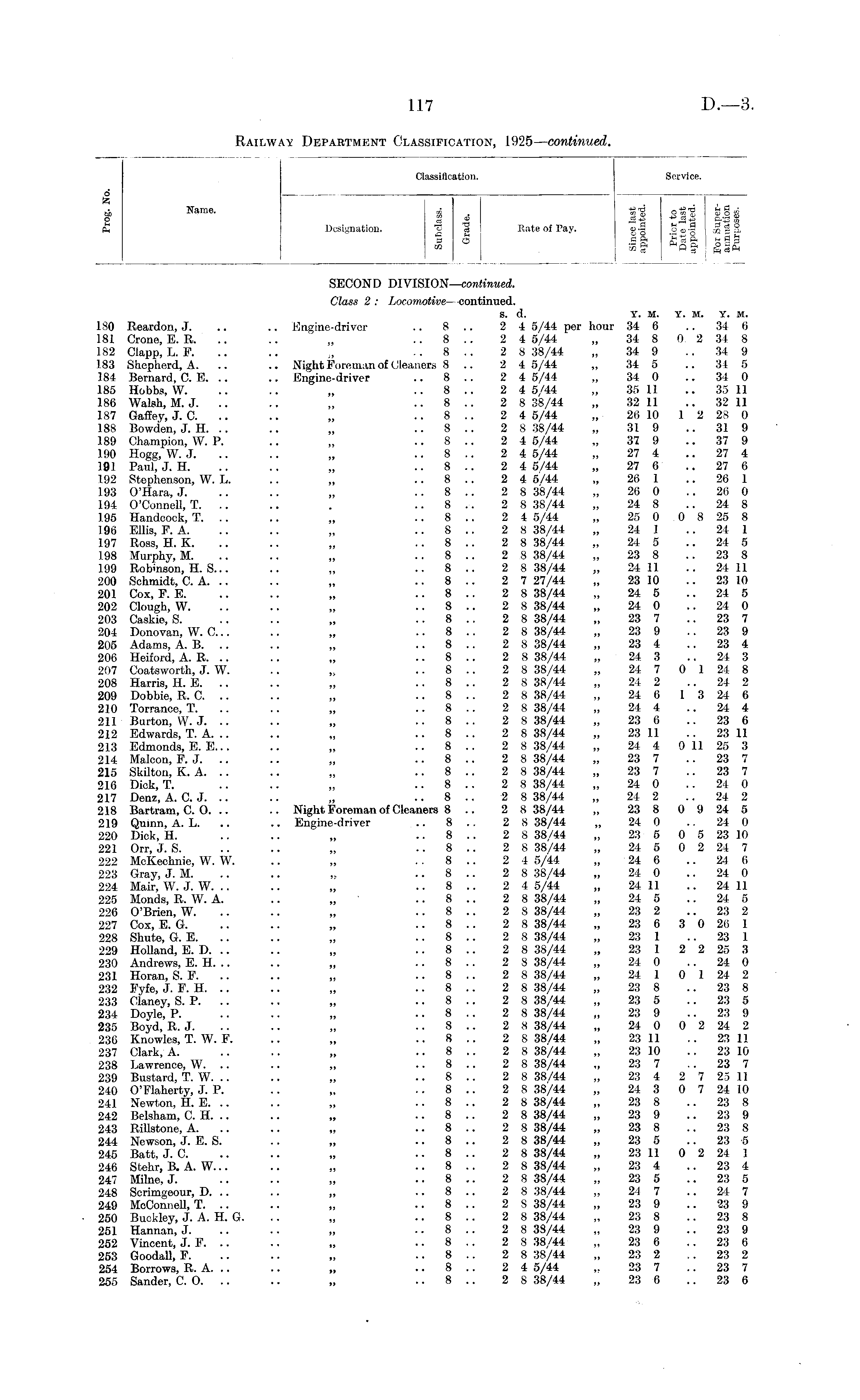 Classification. Service. o — . m Ni » me - a • »o »o« o g <v +3 w plj Designation. *3 H Rate of Pay. ©•§ 0®--I 1 1! s ri en SECOND DIVISION—continued. Class 2 : Locomotive —continued. s. d. Y. M. y. M. Y. M. 180 Reardon, J. .. .. Engine-driver .. 8 2 4 5/44 per hour 34 6 .. 34 6 181 Crone, E. R. .. .. „ 8 .. 2 4 5/44 „ 34 8 0. 2 34 8 182 Clapp, L. F. .. .. 8 .. 2 8 38/44 „ 34 9 .. 34 9 183 Shepherd, A. .. .. Night Foreman of Cleaners 8 2 4 5/44 „ 34 5 .. 34 5 184 Bernard, C. E. .. .. Engine-driver .. 8 .. 2 4 5/44 „ 34 0 .. 34 0 185 Hobbs, W. .. .. „ .. 8 .. 2 4 5/44 „ 35 11 .. 35 11 186 Walsh, M. J. .. .. „ .. 8 .. 2 8 38/44 „ 32 11 .. 32 11 187 Gafiey, J. C. .. .. „ .. 8 .. 2 4 5/44 „ 26 10 1 2 28 0 188 Bowden, J. H. .. .. „ .. 8 .. 2 8 38/44 „ 31 9 .. 31 9 189 Champion, W. P. .. „ .. 8 .. 2 4 5/44 „ 37 9 .. 37 9 190 Hogg, W. J. .. „ .. 8 .. 2 4 5/44 „ 27 4 .. 27 4 191 Paul, J. H „ .. 8 .. 2 4 5/44 „ 27 6 .. 27 6 192 Stephenson, W. L. .. „ .. 8 .. 2 4 5/44 „ 26 1 .. 26 1 193 O'Hara, J. .. .. „ .. 8 .. 2 8 38/44 „ 26 0 .. 26 0 194 O'Connell, T. .. .. . .. 8 .. 2 8 38/44 „ 24 8 .. 24 8 195 Handoock, T. .. .. „ .. 8 .. 2 4 5/44 „ 25 0 0 8 25 8 196 Ellis, E. A. .. .. „ .. 8 .. 2 8 38/44 „ 24 1 .. 24 1 197 Ross, H. K. .. „ .. 8 .. 2 8 38/44 „ 24 5 .. 24 5 198 Murphy, M. .. „ .. 8 .. 2 8 38/44 „ 23 8 .. 23 8 199 Robinson, H. S... .. „ .. 8 .. 2 8 38/44 „ 24 11 .. 24 11 200 Schmidt. C. A. .. .. „ .. 8 .. 2 7 27/44 „ 23 10 .. 23 10 201 Cox, F. E. .. .. „ .. 8 .. 2 8 38/44 „ 24 5 .. 24 5 202 Clough, W. .. .. „ .. 8 .. 2 8 38/44 „ 24 0 24 0 203 Caskie, S. .. .. „ .. 8 .. 2 8 38/44 „ 23 7 .. 23 7 204 Donovan, W. C... .. „ .. 8 .. 2 8 38/44 „ 23 9 .. 23 9 205 Adams, A. B. .. .. „ .. 8 .. 2 8 38/44 „ 23 4 .. 23 4 206 Heiford, A. R. .. .. „ .. 8 .. 2 8 38/44 „ 24 3 .. 24 3 207 Coatsworth, J. W. .. „ .. 8 .. 2 8 38/44 „ 24 7 0 1 24 8 208 Harris, II. E. .. .. „ .. 8 .. 2 8 38/44 „ 24 2 .. 24 2 209 Dobbie, R. C. .. .. „ .. 8 .. 2 8 38/44 „ 24 6 1 3 24 6 210 Torrance, T. .. .. „ .. 8 .. 2 8 38/44 „ 24 4 .. 24 4 211 Burton, W. J. •• •• „ .. 8 .. 2 8 38/44 „ 23 6 .. 23 6 212 Edwards, T. A. .. .. „ .. 8 .. 2 8 38/44 „ 23 11 .. 23 11 213 Edmonds, E. E... .. „ .. 8 .. 2 8 38/44 „ 24 4 0 11 25 3 214 Malcon, F. J. .. .. „ .. 8 .. 2 8 38/44 „ 23 7 .. 23 7 215 Skilton, K. A. .. .. „ .. 8 .. 2 8 38/44 „ 23 7 .. 23 7 216 Dick, T. .. .. „ .. 8 .. 2 8 38/44 „ 24 0 .. 24 0 217 Denz, A. C. J. .. .. „ .. 8 .. 2 8 38/44 „ 24 2 .. 24 2 218 Bartram, C. O. .. .. Night Foreman of Cleaners 8 .. 2 8 38/44 „ 23 8 0 9 24 5 219 Quinn, A. L. .. .. Engine-driver .. 8 .. 2 8 38/44 „ 24 0 .. 24 0 220 Dick, H. .. .. „ .. 8 .. 2 8 38/44 „ 23 5 0 5 23 10 221 Orr, J. S „ .. 8 .. 2 8 38/44 „ 24 5 0 2 24 7 222 McKeehnie, W. W. .. „ 8 .. 2 4 5/44 „ 24 6 .. 24 6 223 Gray, J. M. .. .. „ .. 8 .. 2 8 38/44 „ 24 0 .. 24 0 224 Mair, W. J. W „ .. 8 .. 2 4 5/44 „ 24 11 .. 24 11 225 Monds, R. W. A. .. „ .. 8 .. 2 8 38/44 „ 24 5 .. 24 5 226 O'Brien, W. .. „ .. 8 .. 2 8 38/44 „ 23 2 .. 23 2 227 Cox, E. G. .. .. „ .. 8 .. 2 8 38/44 „ 23 6 3 0 26 1 228 Shute, G. E. .. .. „ .. 8 .. 2 8 38/44 „ 23 1 .. 23 1 229 Holland, E. E>. .. .. „ .. 8 .. 2 8 38/44 „ 23 1 2 2 25 3 230 Andrews, E. H. .. .. „ .. 8 .. 2 8 38/44 „ 24 0 .. 24 0 231 Horan, S. F. .. .. „ .. 8 .. 2 8 38/44 „ 24 1 0 1 24 2 232 Fyfe, J. F. H. .. .. „ .. 8 .. 2 8 38/44 „ 23 8 .. 23 8 233 Claney, S. P. .. .. „ .. 8 .. 2 8 38/44 „ 23 5 .. 23 5 234 Doyle, P. .. .. „ .. 8 .. 2 8 38/44 „ 23 9 .. 23 9 235 Boyd, R. J. .. .. „ .. 8 .. 2 8 38/44 „ 24 0 0 2 24 2 236 Knowles, T. W. F. .. „ .. 8 .. 2 8 38/44 „ 23 11 .. 23 11 237 Clark, A. .. .. „ .. 8 .. 2 8 38/44 „ 23 10 .. 23 10 238 Lawrence, W. .. .. „ 8 2 8 38/44 ,, 23 7 .. 23 7 239 Bustard, T. W. .. .. „ .. 8 .. 2 8 38/44 „ 23 4 2 7 25 11 240 O'Flaherty, J. P. .. „ .. 8 .. 2 8 38/44 „ 24 3 0 7 24 10 241 Newton, H. E. .. .. „ .. 8 .. 2 8 38/44 „ 23 8 .. 23 8 242 Belsham, C. H „ .. 8 .. 2 8 38/44 „ 23 9 .. 23 9 243 Rillstone, A. .. .. „ .. 8 .. 2 8 38/44 „ 23 8 .. 23 8 244 Newson, J. E. S. .. „ .. 8 .. 2 8 38/44 „ 23 5 .. 23 -5 245 Batt, J. C. .. .. „ .. 8 .. 2 8 38/44 „ 23 11 0 2 24 1 246 Stehr, B. A. W... .. „ .. 8 .. 2 8 38/44 „ 23 4 .. 23 4 247 Milne, J. .. .. „ .. 8 .. 2 8 38/44 „ 23 5 .. 23 5 248 Scrimgeour, D. .. .. ,, 8 2 8 38/44 „ 24 7 .. 24 7 249 McConnell, T. .. .. „ .. 8 .. 2 S 38/44 „ 23 9 .. 23 9 250 Buckley, J. A. H. G. .. „ .. 8 .. 2 8 38/44 „ 23 8 .. 23 8 251 Hannan, J. .. „ .. 8 .. 2 8 38/44 „ 23 9 .. 23 9 252 Vincent, J. F. .. .. „ .. 8 .. 2 8 38/44 „ 23 6 .. 23 6 253 Goodall, F. .. „ .. 8 .. 2 8 38/44 „ 23 2 .. 23 2 254 Borrows, R. A. .. .. „ .. 8 .. 2 4 5/44 „ 23 7 .. 23 7 255 Sander, C. O „ .. 8 .. 2 8 38/44 „ 23 6 .. 23 6