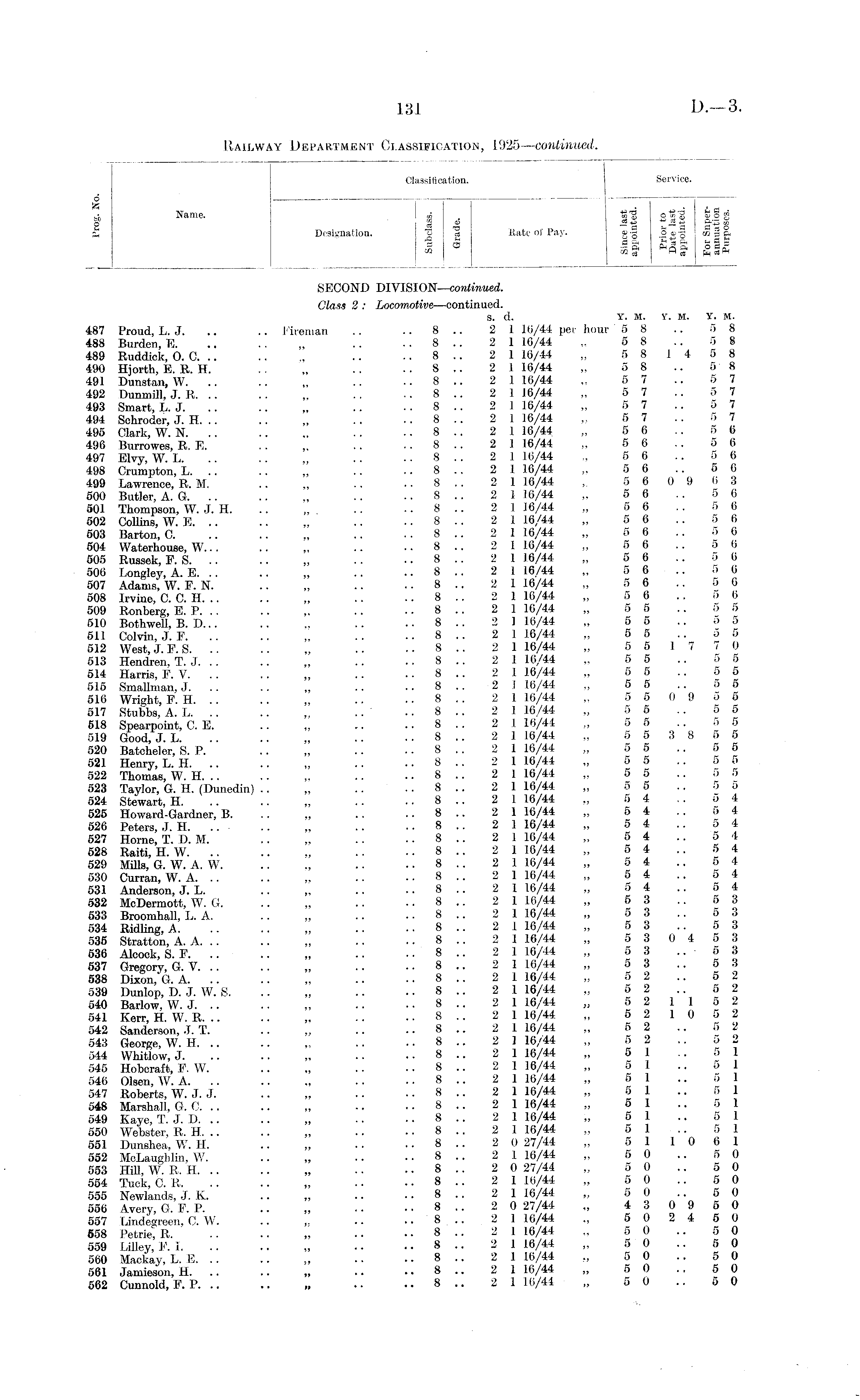 Classification. Service. o w> Name. <5 . o § o3 J2 £ ®-43 Cfi £ Designation. "5 Is Hate of Pay. g .2 « o as 3 & cift C/3 r7) Q r 5 CU M e3 H C« fH W SECOND DIVISION—continued. Glass 2 : Locomotive—continued. s. d. Y. M. Y. M. Y. M. 487 Proud, L. J. .. .. Fireman .. ■. 8 2 1 16/44 per hour 5 8 .. 5 8 488 Burden, E. .. .. „ .. .. 8 .. 2 1 16/44 „ 5 8 .. 5 8 489 Ruddick, 0. C. .. .. „ . . .. 8 .. 2 1 16/44 „ 5 8 1 4 5 8 490 Hjorth, E. R. H. .. „ .. .. 8 .. 2 1 16/44 „ 5 8 .. 5 8 491 Dunstan, W. .. .. „ .. .. 8 .. 2 1 16/44 „ 5 7 .. 5 7 492 Dunmill, J. R. .. .. ,. .. .. 8 .. 2 1 16/44 „ 5 7 .. 5 7 493 Smart, L.J. .. .. „ .. .. 8 .. 2 1 J6/44 „ 5 7 .. 5 7 494 Schroder, J. H. .. .. „ . . .. 8 .. 2 1 16/44 „ 5 7 .. 5 7 495 Clark, W. N. .. .. „ .. .. 8 .. 2 1 16/44 „ 5 6 .. 5 6 496 Burrowes, R. E. ,, .. 8 2 1 16/44 ,, 5 6 .. 5 6 497 Elvy, W. L. .. .. „ .. .. 8 .. 2 1 16/44 „ 5 6 .. 5 6 498 Crumpton, L. .. „ .. .. 8 .. 2 1 16/44 ,, 5 6 .. 5 6 499 Lawrence, R. M. .. ,, .. 8 2 1 16/44 ,. 5 6 0 9 6 3 500 Butier, A. G. .. .. „ .. .. 8 .. 2 1 16/44 „ 5 6 .. 5 6 501 Thompson, W. J. H. .. .. .. 8 .. 2 1 16/44 „ 5 6 .. 5 6 502 Collins, W. E. .. .. „ .. .. 8 .. 2 1 16/44 „ 5 6 .. 5 6 503 Barton, C. .. .. „ .. .. 8 .. 2 1 16/44 „ 5 6 .. 5 6 504 Waterhouse, W... .. ,, .. • • 8 .. 2 1 16/44 ,, 5 6 .. 5 6 505 Russek, F. S. .. .. „ .. .. 8 .. 2 1 16/44 „ 5 6 .. 5 6 506 Longley, A. E. .. .. „ .. 8 2 1 16/44 „ 5 6 .. o 6 507 Adams, W. F. N. .. „ .. .. 8 .. 2 1 16/44 „ 5 6 .. 5 6 508 Irvine, C. C. II. .. .. „ .. .. 8 .. 2 1 16/44 „ 5 6 .. 5 6 509 Ronberg, E. P. .. .. „ .. .. 8 .. 2 1 16/44 „ 5 5 .. 5 5 510 Bothwell, B. D... .. „ .. .. 8 .. 2 1 16/44 „ 5 5 .. 5 5 611 Colvin, J. F. .. .. „ .. .. 8 .. 2 1 16/44 „ 5 5 .. 5 5 512 West, J. F. S. .. .. „ .. .. 8 .. 2 1 16/44 „ 5 5 1 7 7 0 513 Hendren, T. J. . . .. „ .. .. 8 .. 2 1 16/44 „ 5 5 .. 5 5 514 Harris, F. V. .. .. „ .. .. 8 .. 2 1 16/44 „ 5 5 .. 5 5 515 Smallman, J. .. .. „ .. .. 8 .. 2 1 16/44 ,, 5 5 .. 5 5 516 Wright, F. H. .. .. „ .. .. 8 .. 2 1. 16/44 „ 5 5 0 9 o 6 517 Stubbs, A. L. .. .. „ .. .. 8 .. 2 1 16/44 „ 5 5 .. 5 5 518 Spearpoint, C. E. .. „ .. 8 2 1 16/44 „ 5 5 .. 5 5 519 Good, J. L. .. .. „ .. .. 8 .. 2 1 16/44 „ 5 5 3 8 5 5 520 Batcheler, S. P. .. „ .. .. 8 .. 2 1 16/44 „ 5 5 .. 5 5 521 Henry, L. H. .. .. „ .. .. 8 .. 2 1 16/44 „ 5 5 .. 5 5 522 Thomas, W. H. .. .. „ .. .. 8 .. 2 1 16/44 „ 5 5 .. 5 5 523 Taylor, G. H. (Dunedin) .. „ .. .. 8 .. 2 1 16/44 „ 55 .. 5 o 524 Stewart, H „ .. .. 8 .. 2 1 16/44 „ 5 4 .. 5 4 525 Howard-Gardner, B. .. ,, .. 8 2 1 16/44 „ 5 4 .. 5 4 526 Peters, J. H. .. .. „ .. .. 8 .. 2 1 16/44 „ 5 4 .. 5 4 527 Home, T. D. M. .. „ .. .. 8 .. 2 1 16/44 „ 5 4 .. 5 4 528 Raiti, H. W. .. .. „ .. .. 8 .. 2 1 16/44 „ 5 4 .. 5 4 529 Mills, G. W. A. W. .. „ .. .. 8 .. 2 1 16/44 „ 5 4 .. 5 4 530 Curran, W. A. .. .. „ .. .. 8 .. 2 1 16/44 „ 5 4 .. 5 4 531 Anderson, J. L. .. „ .. .. 8 .. 2 1 16/44 „ 5 4 .. 5 4 532 McDermott, W. G. .. „ .. .. 8 .. 2 1 16/44 „ 5 3 .. 5 3 533 Broomhall, L. A. .. „ .. .. 8 .. 2 1 16/44 „ 5 3 .. 5 3 534 Ridling, A. .. .. „ .. .. 8 .. 2 1 16/44 „ 5 3 .. 5 3 535 Stratton, A. A. .. .. „ .. .. 8 .. 2 1 16/44 „ 5 3 0 4 5 3 536 Alcock, S. F. .. .. „ .. .. 8 .. 2 1 16/44 „ 5 3 ..53 537 Gregory, G. V. .. .. „ .. .. 8 .. 2 1 16/44 „ 5 3 .. 5 3 538 Dixon, G. A .. .. 8 .. 2 1 16/44 „ 5 2 .. 5 2 539 Dunlop, D. J. W. S. .. „ .. .. 8 .. 2 1 16/44 „ 5 2 .. 5 2 540 Barlow, W. J. .. .. „ .. .. 8 .. 2 1 16/44 „ 5 2 115 2 541 Kerr, H. W. R. .. .. „ .. .. 8 .. 2 1 16/44 „ 5 2 1 0 5 2 542 Sanderson, J. T. .. „ .. .. 8 .. 2 1 16/44 „ 5 2 .. 5 2 543 George, W. H. .. .. ,. .. .. 8 .. 2 1 16/44 „ 5 2 .. o 2 544 Whitlow, J. .. .. „ .. .. 8 .. 2 1 16/44 „ 5 1 .. 5 1 545 Hobcraffc, F. W. .. „ .. .. 8 .. 2 1 16/44 „ 5 1 .. 5 1 546 Olsen, W. A. .. .. „ .. .. 8 .. 2 1 16/44 „ 5 1 .. 5 1 547 Roberts, W. J. J. .. „ .. .. 8 .. 2 1 16/44 „ 5 1 .. 5 1 548 Marshall, G. 0. .. .. „ -. .. 8 .. 2 1 16/44 „ 5 1 .. 5 1 549 Kaye, T. J. D. .. .. „ .. .. 8 .. 2 1 16/44 „ 5 1 .. 5 .1 550 Webster, R. H. .. .. „ .. .. 8 .. 2 1 16/44 „ 5 1 .. 5 1 551 Dunshea, W. H. .. „ .. .. 8 .. 2 0 27/44 „ 5 110 6 1 552 McLaughlin. W. .. „ .. .. 8 .. 2 1 16/44 „ 5 0 .. 5 0 553 Hill, W. R. H. .. .. „ .. .. 8 .. 2 0 27/44 „ 5 0 .. 5 0 554 Tuck, C. R. .. .. „ .. .. 8 .. 2 1 16/44 „ 5 0 .. 5 0 555 Newlands, J. K. .. „ .. .. 8 .. 2 1 16/44 „ 5 0 .. 5 0 556 Avery, G. F. P. .. „ .. .. 8 .. 2 0 27/44 „ 4 3 0 9 5 0 557 Lindegreen, C. W. .. „ .. 8 2 1 16/44 ,, 5 0 2 4 5 0 658 Petrie'; R. .. .. „ .. .. 8 .. 2 1 16/44 „ 5 0 .. 5 0 559 Lilley, F. I. .. .. „ . • .. 8 .. 2 1 16/44 „ 5 0 .. 5 0 560 Mackay, L. E. .. .. „ .. .. 8 .. 2 1 16/44 „ 5 0 .. 5 0 561 Jamieson, H. .. „ .. 8 2 1 16/44 ,, 5 0 .. 5 0 562 Cunnold, F. P. .. .. „ .. .. 8 .. 2 1 16/44 „ 5 0 .. 5 0