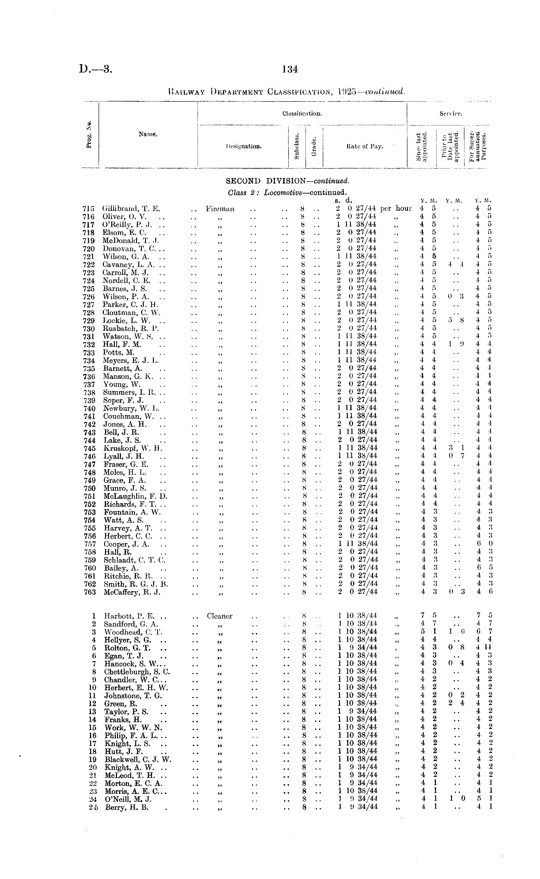 Classification. Service. ® . & I . , g Name - i i s'S 51" sis £ Designation. o * Iiate of Pay. &•§ j o«S rr\ t3i P< " ) ft | O fl» <s " c« j Fh SECOND DIVISION —continued. Class 2 : Locomotive —continued. s. d. y. M. Y. M. Y. M. 715 Gillibrand, T. E. .. Fireman .. .. 8 .. 2 0 27/44 per hour 4 5 .. 4 5 716 Oliver, 0. V. .. .. „ .. .. 8 .. 2 0 27/44 „ 4 5 .. 4 5 717 O'Reilly, P. J. .. .. „ .. .. 8 .. 1 11 38/44 „ 4 5 .. 4 5 718 Elsom, E. C. .. .. „ .. .. 8 .. 2 0 27/44 „ 4 5 .. 4 5 719 McDonald, T. J. .. „ .. .. 8 .. 2 0 27/44 „ 4 5 .. 4 5 720 Donovan, T. C. .. .. „ .. 8 .. 2 0 27/44 „ 4 5 .. 4 5 721 Wilson, G. A. .. .. „ .. .. 8 .. 1 11 38/44 „ 4 5 .. 4 5 722 Cavaney, L. A. .. .. „ .. .. 8 .. 2 0 27/44 ., 4 5 4 4 4 5 723 Carroll, M. J. .. .. „ .. .. 8 .. 2 0 27/44 „ 4 5 .. 4 5 724 Nordell, C. E. .. .. „ .. .. 8 .. 2 0 27/44 „ 4 5 .. 4 5 725 Barnes, J. S. .. .. „ .. .. 8 .. 2 0 27/44 „ 4 5 .. 4 5 726 Wilson, P. A. .. .. „ .. .. 8 .. 2 0 27/44 „ 4 5 0 3 4 5 727 Parker, C. J. H. .. „ .. .. 8 .. 1 11 38/44 „ 4 5 .. 4 5 728 Cloutman, C. W. .. „ .. 8 2 0 27/44 „ 4 5 .. 4 5 729 Loekie, L. W. .. .. „ .. .. 8 .. 2 0 27/44 „ 4 5 5 8 4 5 730 Rusbatch, R. P. .. „ .. 8 .. 2 0 27/44 „ 4 5 .. 4 5 731 Watson, W. S. .. .. „ .. .. 8 .. 1 11 38/44 „ 4 5 .. 4 5 732 Hall, F. M. .. .. „ .. .. 8 .. Ill 38/44 „ 4 4 1 9 4 4 733 Potts, M. .. .. „ .. .. 8 .. 1 11 38/44 4 4 .. 4 4 734 Meyers, E. J. L. .. „ .. .. 8 .. 1 11 38/44 „ 4 4 .. 4 4 735 Barnett, A. .. .. „ .. .. 8 .. 2 0 27/44 „ 4 4 . . 4 4 736 Manson, G. K. .. .. „ .. .. 8 .. 2 0 27/44 „ 4 4 .. 4 4 737 Young, W. .. .. „ .. 8 .. 2 0 27/44 „ 4 4 .. 4 4 738 Summers, I. R. .. .. „ .. 8 2 0 27/44 „ 4 4 .. 4 4 739 Soper, F. J. . . .. „ .. .. 8 .. 2 0 27/44 „ 4 4 . . 4 4 740 Newbury, W. L. .. ,, .. 8 111 38/44 ,, 4 4 . . 4 4 741 Couchman, W. .. .. „ .. .. 8 .. Ill 38/44 „ 4 4 . . 4 4 742 Jones, A. H. .. .. „ .. . . 8 .. 2 0 27/44 „ 4 4 .. 4 4 743 Bell, J. R. . . .. „ .. . . 8 .. 1 11 38/44 „ 4 4 .. 4 4 744 Lake, J. S. .. .. „ .. .. 8 .. 2 0 27/44 „ 4 4 . . 4 4 745 Kruskopf, W. H. .. „ .. 8 111 38/44 ,, 4 4 3 1 4 4 746 Lyall, J. H. . . .. „ .. .. 8 . . 1 11 38/44 „ 4 4 0 7 4 4 747 Fraser, G. E. .. .. „ .. .. 8 .. 2 0 27/44 „ 4 4 .. 4 4 748 Moles, H. L. .. „ .. .. 8 .. 2 0 27/44 „ 4 4 .. 4 4 749 Grace, F. A. .. „ .. .. 8 .. 2 0 27/44 „ 4 4 . . 4 4 750 Munro, J. S. .. „ .. .. 8 .. 2 0 27/44 „ 4 4 .. 4 4 751 McLaughlin, F. D .. .. 8 .. 2 0 27/44 „ 4 4 .. 4 4 752 Richards, F. T. .. .. „ .. .. 8 . . 2 0 27/44 „ 4 4 .. 4 4 753 Fountain, A. W. .. „ .. .. 8 .. 2 0 27/44 „ 4 3 .. 4 3 754 Watt, A. S. .. .. „ .. .. 8 .. 2 0 27/44 „ 4 3 .. 4 3 755 Harvey, A. T... .. „ .. .. 8.. 2027/44 „ 4 3 .. 4 3 756 Herbert, C. C. .. .. „ .. .. 8 .. 2 0 27/44 „ 4 3 .. 4 3 757 Cooper, J. A. .. .. „ .. .. 8 .. 1 11 38/44 „ 4 3 .. 6 0 758 Hall, R. .. .. „ .. .. 8 .. 2 0 27/44 „ 4 3 .. 4 3 759 Schlaadt, C. T. C. .. „ .. .. 8 .. 2 0 27/44 „ 4 3 .. 4 3 760 Bailey, A. .. .. „ .. .. 8 .. 2 0 27/44 „ 4 3 .. 6 5 761 Ritchie, R. R. .. .. „ .. .. 8 .. 2 0 27/44 „ 4 3 .. 4 3 762 Smith, R. G. J. B. .. „ .. .. 8 .. 2 0 27/44 „ 4 3 .. 4 3 763 McCaffery, R. J. .. „ .. .. 8 .. 2 0 27/44 „ 4 3 0 3 4 6 1 Harbott, P. E. .. .. Cleaner .. . . 8 .. 1 10 38/44 „ 7 5 .. 7 5 2 Sandford, G. A. .. „ .. 8 1 10 38/44 „ 4 7 .. 4 7 3 Woodhead, C. T. .. „ .. .. 8 .. 1 10 38/44 „ 5 116 6 7 4 Hellyer, S. G. .. .. „ .. .. 8 .. 1 10 38/44 „ 4 4 .. 4 4 5 Rolton, G. T .. .. 8 .. 1 9 34/44 , 4 3 0 8 4 11 6 Egan, T. J. .. .. „ .. .. 8 .. 1 10 38/44 „ 4 3 .. 4 3 7 Hancock, S. W... .. „ .. .. 8 .. 1 10 38/44 „ 4 3 0 4 4 3 8 Chettleburgh, S. C. .. „ .. .. 8 .. 1 10 38/44 „ 4 3 .. 4 3 9 Chandler, W. C... .. „ .. .. 8 .. 1 10 38/44 „ 4 2 .. 4 2 10 Herbert, E. H. W. .. „ .. .. 8 .. 1 10 38/44 „ 4 2 .. 4 2 11 Johnstone, T. G. .. „ .. .. 8 .. 1 10 38/44 „ 4 2 0 2 4 2 12 Green, R. .. .. „ .. .. 8 .. 1 10 38/44 „ 4 2 2 4 4 2 13 Taylor, P. S. .. .. „ .. .. 8 .. 1 9 34/44 „ 4 2 .. 4 2 14 Franks, H. .. .. „ .. 8 .. 1 10 38/44 „ 4 2 .. 4 2 15 Work, W. W. N. .. „ .. .. 8 .. 1 10 38/44 „ 4 2 .. 4 2 16 Philip, F. A. L . . .. 8 .. 1 10 38/44 „ 4 2 .. 4 2 17 Knight, L. S. .. .. „ .. .. 8 .. 1 10 38/44 „ 4 2 .. 4 2 18 Hutt, J. F. .. .. „ .. .. 8 .. 1 10 38/44 „ 4 2 .. 4 2 19 Blackwell, C. J. W. .. „ .. .. 8 .. 1 10 38/44 „ 4 2 .. 4 2 20 Knight, A. W. .. .. „ .. .. 8 .. 1 9 34/44 „ 4 2 .. 4 2 21 McLeod, T. H. .. .. „ .. .. 8 .. 1 9 34/44 „ 4 2 .. 4 2 22 Morton, E. C. A. .. „ .. .. 8 .. 1 9 34/44 „ 4 1 .. 4 1 23 Morris, A. E. C... .. „ .. .. 8 .. 1 10 38/44 „ 4 1 .. 4 1 24 O'Neill, M. J. .. „ .. .. 8 .. 1 9 34/44 „ 4 110 5 1 25 Berry, H. B. . .. „ .. .. 8 .. 1 9 34/44 „ 4 1 .. 4 1