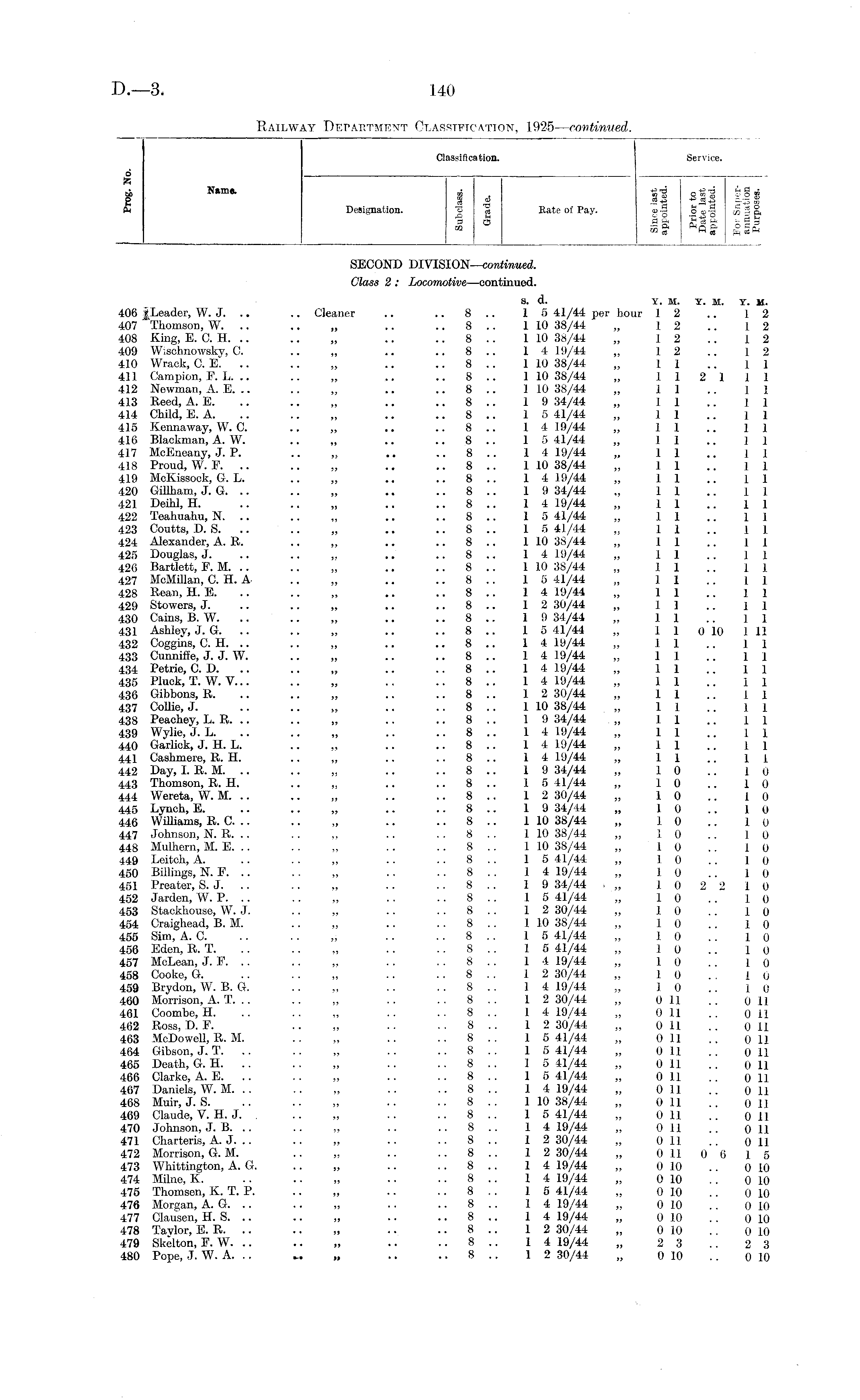 Classification. Service, o 9 s * ti lis 2 c8,£ — t-" d S fi Designation. « & Rate of Pay. © -S o o> •§ « S p, rO M O O •— O ~ 5 ® 1! £ «! lis SECOND DIVISION—continued. Glass 2 : Locomotive—continued. s. d. Y. M. Y. M. Y. u. 406 jXeader, W. J. .. .. Cleaner .. .. 8 .. IS 41/44 per hour 12 .. 12 407 Thomson, W. .. .. „ .. 8 .. 1 10 38/44 „ 12 .. 12 408 King, E. C. H. .. .. „ .. 8 .. 1 10 38/44 „ 12 .. 12 409 Wischnowsky, C. .. „ .. 8 .. 14 19/44 „ 12 .. 12 410 Wrack, C. E. .. .. „ .. .. 8 .. 1 10 38/44 „ 11 .. 11 411 Campion, E. L. .. .. „ ... .. 8 .. 1 10 38/44 „ 112 111 412 Newman, A. E. .. .. „ .. .. 8 1 10 38/44 ,, 11 .. 11 413 Reed, A. E. .. .. „ .. 8 .. 1 9 34/44 „ 11 .. 11 414 Child, E. A. .. .. „ .. .. 8 .. 1 5 41/44 „ 11 .. 11 415 Kennaway, W. C. .. „ .. 8 .. 14 19/44 „ 11 .. 11 416 Blackman, A. W. .. „ .. .. 8 .. 1 5 41/44 „ 11 .. 11 417 McEneany, J. P. .. „ .. .. 8 .. 14 19/44 „ II .. 11 418 Proud, W. E. .. .. „ .. .. 8 .. 1 10 38/44 „ 11 .. 11 419 McKissock, G. L. .. „ .. .. 8 .. 14 19/44 „ 11 .. 11 420 Gillham, J. G. .. .. „ .. .. 8 .. 1 9 34/44 „ 11 .. 11 421 Deihl, H. .. .. „ .. .. 8 .. 14 19/44 „ 11 .. 11 422 Teahuahu, N. .. „ .. .. 8 .. 1 5 41/44 „ 11 .. 11 423 Coutts, D. S. .. .. „ .. .. 8 .. 1 5 41/44 „ 11 .. 11 424 Alexander, A. R. .. „ .. 8 .. 1 10 38/44 „ 11 .. 11 425 Douglas, J. .. .. „ .. .. 8 .. 14 19/44 „ 11 .. 11 426 Bartlett, E. M. .. .. „ .. .. 8 .. 1 10 38/44 „ 11 .. 11 427 McMillan, C. H. A .. „ .. .. 8 .. 1 5 41/44 „ 11 .. i l 428 Rean, H. E. .. .. „ .. 8 .. 14 19/44 „ 11 .. 11 429 Stowers, J. .. .. „ .. .. 8 .. 1 2 30/44 „ 11 .. 11 430 Cains, B. W. .. ' „ .. .. 8 .. 1 9 34/44 „ 11 .. 11 431 Ashley, J. G. .. .. „ .. 8 .. 1 5 41/44 „ 11 0 10 1 11 432 Coggins, C. H. .. .. „ .. .. 8 .. 14 19/44 „ 11 .. 11 433 Cunniffe, J. J. W. .. „ .. .. 8 .. 14 19/44 „ 11 .. 11 434 Petrie, C. D. .. „ .. 8 .. 14 19/44 „ 11 .. l i 435 Pluck, T. W. V... .. „ .. 8 .. 14 19/44 „ 11 .. 11 436 Gibbons, R. .. .. „ .. 8 .. 1 2 30/44 „ 11 .. l i 437 Collie, J. .. .. „ .. .. 8 .. 1 10 38/44 „ 11 .. l i 438 Peachey, L. R. .. .. „ .. .. 8 1 9 34/44 „ 11 .. 11 439 Wylie, J. L .. .. 8 .. 14 19/44 „ II .. 11 440 Garlick, J. H. L. .. „ .. 8 .. 14 19/44 „ 11 .. l j 441 Cashmere, R. H. .. „ .. 8 .. 14 19/44 „ 11 .. l l 442 Day, I. R. M. .. .. „ .. .. 8 .. 1 9 34/44 „ 10 .. 1 o 443 Thomson, R. H. .. „ .. 8 .. 1 5 41/44 „ 10 .. 10 444 Wereta, W. M. .. .. „ .. .. 8 .. 1 2 30/44 „ 10 .. 10 445 Lynch, E. .. .. „ .. 8 .. 1 9 34/44 „ 10 .. 10 446 Williams, R. C. .. .. „ .. .. 8 .. 1 10 38/44 „ 10 .. 10 447 Johnson, N. R. .. .. ,, .. .. 8 1 10 38/44 „ 10 .. 10 448 Mulhern, M. E. .. .. „ .. .. 8 .. 1 10 38/44 „ 10 .. 10 449 Leitch, A. .. .. „ .. 8 1 5 41/44 „ 10 .. 10 450 Billings, N. E. .. .. „ .. 8 .. 14 19/44 „ 10 .. 10 451 Preater, S. J. .. „ .. .. 8 .. 1 9 34/44 . „ 1 0 2 2 1 0 452 Jarden, W. P. .. .. „ .. .. 8 .. .1 5 41/44 „ 10 .. 10 453 Stackhouse, W. J. .. „ .. 8 1 2 30/44 „ 10 .. 10 454 Craighead, B. M. .. „ .. 8 1 10 38/44 „ 10 .. 10 455 Sim, A. C. .. .. „ .. .. 8 .. 1 5 41/44 „ 10 . . 10 456 Eden, R. T. .. .. „ .. .. 8 .. 1 5 41/44 „ 10 .. 10 457 McLean, J. F. .. .. „ .. 8 .. 14 19/44 „ 10 . . 10 458 Cooke, G. .. .. „ .. .. 8 .. 1 2 30/44 „ 10 . . 10 459 Brydon, W. B. G. .. „ .. .. 8 14 19/44 „ 10 .. 10 460 Morrison, A. T. .. .. „ .. .. 8 1 2 30/44 „ 0 11 .. 0 11 461 Coombe, H. .. .. „ .. 8 .. 14 19/44 „ 0 11 .. 0 11 462 Ross, D. E. .. „ .. 8 .. 1 2 30/44 „ 0 11 .. 0 11 463 McDowell, R. M. .. „ .. .. 8 .. 1 5 41/44 „ 0 11 .. oil 464 Gibson, J. T. .. .. „ .. 8 .. 1 5 41/44 „ 0 11 .. 0 11 465 Death, G. H. .. .. „ .. 8 .. 1 5 41/44 „ 0 11 .. 0 II 466 Clarke, A. E. .. „ .. .. 8 . . 1 5 41/44 „ 0 11 .. 0 11 467 Daniels, W. M. .. .. „ .. 8 .. 14 19/44 „ 0 11 .. 0 11 468 Muir, J. S. .. .. „ .. 8 .. 1 10 38/44 „ Oil .. 0 11 469 Claude, V. H. J. .. „ .. .. 8 1 5 41/44 „ 0 11 .. Oil 470 Johnson, J. B. .. .. „ .. .. 8 .. 14 19/44 „ 0 11 .. 0 11 471 Charteris, A. J. .. .. „ .. 8 1 2 30/44 „ 0 11 .. 0 11 472 Morrison, G. M. .. „ .. 8 .. 1 2 30/44 „ 0 II 0 6 15 473 Whittington, A. G. .. „ .. .. 8 .. 14 19/44 „ 0 10 .. 0 10 474 Milne, K. .. .. „ .. .. 8 .. 14 19/44 „ 0 10 .. 0 10 475 Thomsen, K. T. P. .. „ .. .. 8 .. 1 5 41/44 „ 0 10 .. 0 10 476 Morgan, A. G. .. .. „ .. .. 8 14 19/44 „ 0 10 .. 0 10 477 Clausen, H. S. .. .. „ .. .. 8 .. 14 19/44 „ 0 10 .. 0 10 478 Taylor, E. R. .. .. „ .. .. 8 .. 1 2 30/44 „ 0 10 .. 0 10 479 Skelton, F. W. .. .. „ .. 8 .. 14 19/44 „ 2 3 .. 2 3 480 Pope, J. W. A. .. „ .. 8 1 2 30/44 ,, 0 10 .. 0 10