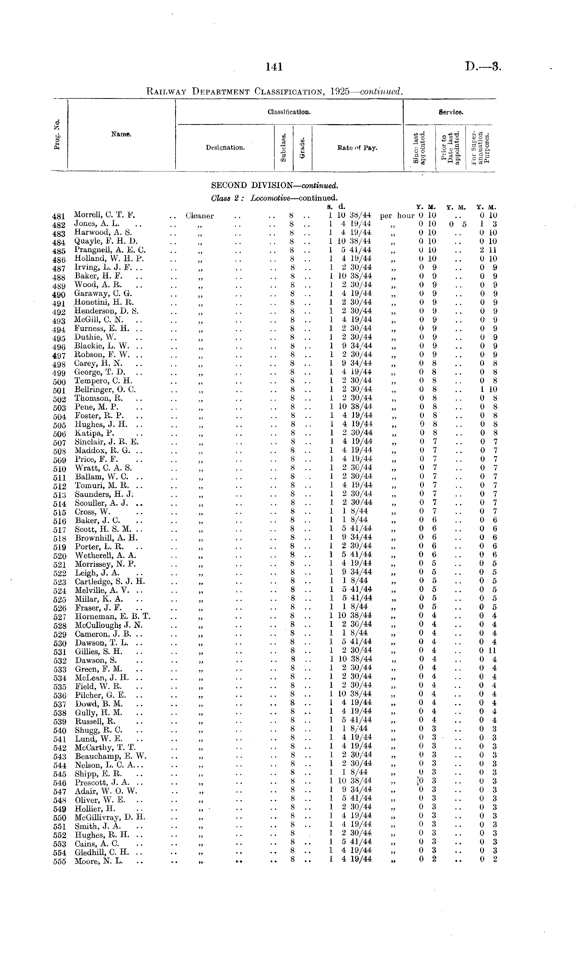 Classification. Service, o » wame - S • »•§ SI'S &§s 2 <S ,2 jS-g S** 3 m Oh Designation. o oj Rate of Pay. © •§ o •§ 5 § §, a a -£-s g. s |S M ag 1 £|P< ; 1 SECOND DIVISION —continued. Glass 2 : Locomotive—continued. s. d. y. M. y. m. y. M. 481 Morrell, C. T. F, .. Cleaner .. .. 8 1 10 38/44 per hour 0 10 .. 0 10 482 Jones, A. L. .. .. „ .. 8 .. 14 19/44 „ 0 10 0 5 1 3 483 Harwood, A. S. .. „ .. 8 .. 14 19/44 „ 0 10 .. 0 10 484 Quayle, F. H. D. .. „ .. 8 .. 1 10 38/44 „ 0 10 .. 0 10 485 Prangnell, A. E. C. .. „ .. 8 .. 1 5 41/44 „ 0 10 .. 2 11 486 Holland, W. H. P. .. „ .. .. 8 .. 14 19/44 „ 0 10 .. 0 10 487 Irving, L. J. F. .. .. „ .. .. 8 .. 1 2 30/44 „ 0 9 .. 0 9 488 Baker, H. F. .. „ .. 8 .. 1 10 38/44 „ 0 9' .. 0 9 489 Wood, A. R. .. .. „ .. 8 .. 1 2 30/44 „ 0 9 .. 0 9 490 Garaway, C. G. .. „ .. 8 14 19/44 „ 0 9 .. 0 9 491 Honetini, H. B. .. „ .. .. 8 .. 1 2 30/44 „ 0 9 .. 0 9 492 Henderson, D. S. .. „ .. 8 .. 1 2 30/44 „ 0 9 .. 0 9 493 MoGill, C. N. .. .. „ .. .. 8 .. 1 4 19/44 ,. 0 9 .. 0 9 494 Furness, E. H. .. .. „ .. .. 8 .. 1 2 30/44 „ 0 9 .. 0 9 495 Duthie, W. .. .. „ .. .. 8 .. 1 2 30/44 „ 0 9 .. 0 9 496 Blackie, L. W. .. .. „ .. .. 8 .. 1 9 34/44 „ 0 9 .. 0 9 497 Bobson, F. W. .. .. „ .. .. 8 .. 1 2 30/44 „ 0 9 .. 0 9 498 Carey, H. N. .. .. „ .. 8 .. 1 9 34/44 „ 0 8 .. 0 8 499 George, T. D. .. .. „ .. 8 14 19/44 „ 0 8 .. 0 8 500 Tempero, C. H. .. „ .. .. 8 .. 1 2 30/44 „ 0 8 .. 0 8 501 Bellringer, O. C. .. „ .. .. 8 .. 1 2 30/44 „ 0 8 .. 1 10 502 Thomson, B. .. „ .. 8 .. 1 2 30/44 „ 0 8 .. 0 8 503 Bene, M. B. .. .. „ .. .. 8 .. 1 10 38/44 „ 0 8 .. 0 8 504 Foster, B. B. .. .. „ .. .. 8 .. 1 4 19/44 „ 0 8 .. 0 8 505 Hughes, J. H. .. .. „ .. .. 8 .. 1 4 19/44 „ 0 8 .. 0 8 506 Katipa, P. .. .. „ .. .. 8 .. 1 2 30/44 „ 0 8 .. 0 8 507 Sinclair, J. B. E. .. „ .. 8 .. 14 19/44 „ 0 7 .. 0 7 508 Maddox, B. G. .. .. „ .. .. 8 .. 14 19/44 „ 0 7 .. 0 7 509 Price, F. F. .. .. „ .. .. 8 .. 14 19/44 „ 0 7 .. 0 7 510 Wratt, C. A. S. .. „ .. .. 8 .. 1 2 30/44 „ 0 7 .. 0 7 511 Ballam, W. C. .. .. „ .. .. 8 . . 1 2 30/44 „ 0 7 .. 0 7 512 Tomuri, M. R. .. .. ,, .. 8 14 19/44 „ 0 7 .. 0 7 513 Saunders, H. J? .. „ .. .. 8 .. 1 2 30/44 „ 0 7 .. 0 7 514 Scouller, A. J. .. .. „ .. .. 8 .. 1 2 30/44 „ 0 7 .. 0 7 515 Cross, W „ .. .. 8 .. 11 8/44 „ 0 7 .. 0 7 516 Baker, J. C. .. „ .. .. 8 .. 11 8/44 „ 0 6 .. 0 6 517 Scott, H. S. M „ .. .. 8 .. 1 5 41/44 „ 0 6 .. 0 6 518 Brownhill, A. H. .. „ .. 8 1 9 34/44 „ 0 6 .. 0 6 519 Porter, L. B „ .. .. 8 .. 1 2 30/44 „ 0 6 .. 0 6 520 Wetherell, A. A. .. „ .. .. 8 .. 1 5 41/44 „ 0 6 .. 0 6 521 Morrissey, N. P. .. „ .. .. 8 .. 14 19/44 „ 0 5 .. 0 5 522 Leigh, J. A. .. .. „ .. .. 8 .. 1 9 34/44 „ 0 5 .. 0 5 523 Cartledge, S. J. H. . . „ .. .. 8 1 1 8/44 „ 0 5 .. 0 5 524 Melville, A. V. .. .. „ .. .. 8 . . 1 5 41/44 „ 0 5 .. 0 5 525 Millar, K. A. .. .. „ .. .. 8 .. 1 5 41/44 „ 0 5 .. 0 5 526 Eraser, J. F. .. „ .. 8 11 8/44 „ 0 5 .. 0 5 527 Horneman, E. B. T. .. „ .. .. 8 1 10 38/44 „ 0 4 .. 0 4 528 McCullough? J. N. .. „ .. .. 8 .. 1 2 30/44 „ 0 4 .. 0 4 529 Cameron, J. B. .. .. ,, .. ■. 8 11 8/44 „ 0 4 .. 0 4 530 Dawson, T. L. .. .. „ .. • ■ 8 . . 1 5 41/44 „ 0 4 .. 0 4 531 Gillies, S. H. .. .. „ .. .. 8 .. 1 2 30/44 „ 0 4 .. 0 11 532 Dawson, S. .. .. „ .. • • 8 .. 1 10 38/44 „ 0 4 .. 0 4 533 Green, F. M. .. .. „ • • .. 8 .. 1 2 30/44 „ 0 4 .. 0 4 534 McLean, J. H. .. .. „ .. .. 8 1 2 30/44 „ 0 4 .. 0 4 535 Field, W. B. .. .. „ .. .. 8 .. 1 2 30/44 „ 0 4 .. 0 4 536 Pilcher, G. E. .. .. „ .. .. 8 .. 1 10 38/44 „ 0 4 .. 0 4 537 Dowd, B. M. .. .. „ .. .. 8 .. 14 19/44 „ 0 4 .. 0 4 538 Gully, H. M „ .. .. 8 .. 14 19/44 „ 0 4 .. 0 4 539 Bussell, B. .. .. „ .. . . 8 .. 1 5 41/44 „ 0 4 .. 0 4 540 Shugg, B. C. .. „ ■ • .. 8 .. 11 8/44 „ 0 3 .. 0 3 541 Lund, W. E. .. .. „ .. .. 8 .. 14 19/44 „ 0 3 .. 0 3 542 McCarthy, T. T. .. ,, ■ ■ 8 14 19/44 „ 0 3 .. 0 3 543 Beauchamp, E. W. .. ,, •• 8 1 2 30/44 „ 0 3 .. 0 3 544 Nelson, L. C. A... .. ,, •• 8 1 2 30/44 ,, 0 3 .. 0 3 545 Shipp, E. B. .. „ ■ ■ 8 11 8/44 „ U 3 .. 0 3 546 Prescott, J. A. .. .. ,, • • • - 8 1 10 38/44 ,, i,0 3 .. 0 3 547 Adair, W. O. W. .. „ ■ • .. 8 .. 1 9 34/44 „ 0 3 .. 0 3 548 Oliver, W. E. .. .. „ .. .. 8 .. 1 5 41/44 „ 0 3 .. 0 3 549 Hollier, H 8 .. 1 2 30/44 „ 0 3 .. 0 3 550 McGillivray, D. H. .. „ .. .. 8 .. 14 19/44 „ 0 3 .. 0 3 551 Smith, J. A. .. ■. „ ■ ■ .. 8 .. 14 19/44 „ 0 3 .. 0 3 552 Hughes, R. H. .. .. „ • • 8 1 2 30/44 „ 0 3 .. 0 3 553 Cains, A. C 8 .. 1 5 41/44 „ 0 3 .. 0 3 554 Gledhill, C. H „ .. .. 8 .. 1 4 19/44 „ 0 3 .. 0 3 555 Moore, N. L. .. .. „ ... .. 8 .. 14 19/44 „ 0 2 .. 0 2