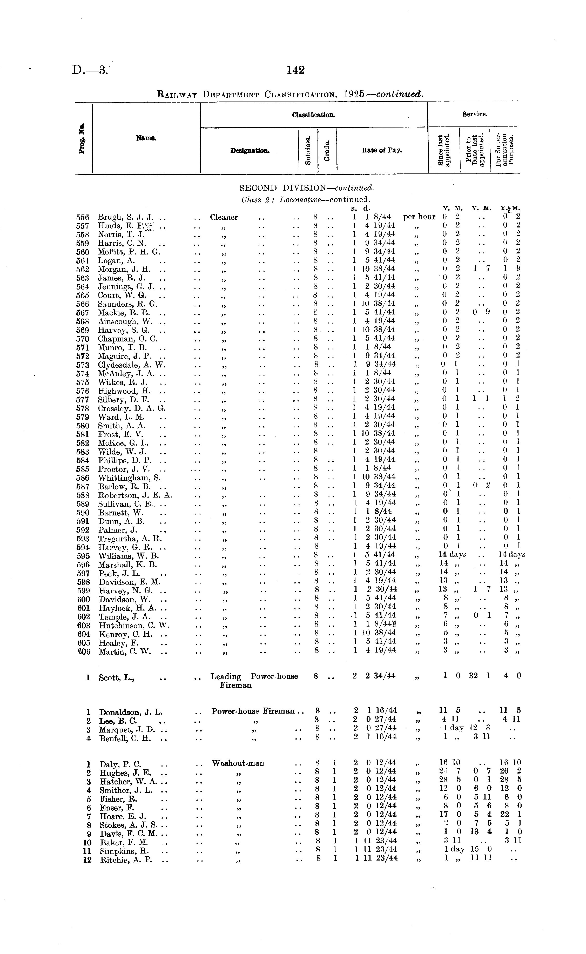 Classification. Service. I : —77I Nam * § i 11 iii £ Designation. g Is Rate of Pay. 5 « II Eg| lis SECOND DIVISION —continued. Glass 2: Locomotive—continued. s. d. Y. M. Y. M. Y.ijM. 556 Brugh, S. J. J. .. .. Cleaner .. .. 8 .. 11 8/44 per hour 0 2 .. 0 2 557 Hinds, E. F.|*' .. .. „ .. .. 8 .. 14 19/44 „ 0 2 .. 0 2 558 Norris, T. J. .. „ .. .. 8 .. 14 19/44 „ 0 2 .. 0 2 559 Harris, C. N. .. .. „ .. .. 8 .. 1 9 34/44 „ 0 2 .. 0 2 560 Moffitt, P. H. G. .. „ .. .. 8 .. 1 9 34/44 „ 0 2 .. 0 2 561 Logan, A. .. .. „ .. .. 8 .. 1 5 41/44 „ 0 2 .. 0 2 562 Morgan, J. H. .. .. „ .. .. 8 .. 1 10 38/44 „ 0 2 17 19 563 James, R. J. .. .. „ .. .. 8 .. 1 5 41/44 „ 0 2 .. 0 2 564 Jennings, G. J. .. .. „ .. .. 8 1 2 30/44 „ 0 2 .. 0 2 565 Court, W. G. .. .. „ .. .. 8 .. 14 19/44 „ 0 2 .. 0 2 566 Saunders, R. G. .. „ .. .. 8 .. 1 10 38/44 „ 0 2 .. 0 2 567 Mackie, R. R „ .. .. 8 .. 15 41/44 „ 0 2 0 9 0 2 568 Ainscough, W. .. .. „ .. 8 14 19/44 „ 0 2 .. 0 2 569 Harvey, S. G .. .. 8. .. 1 10 38/44 „ 0 2 .. 0 2 570 Chapman, O. C. .. „ .. 8 1 5 41/44 „ 0 2 .. 0 2 571 Munro, T. B. .. .. „ .. .. 8 .. 11 8/44 „ 0 2 .. 0 2 572 Maguire, J. P. .. .. „ .. .. 8 .. 1 9 34/44 „ 0 2 .. 0 2 573 Clydesdale, A. W. .. „ .. .. 8 .. 1 9 34/44 „ 01 .. 0 1 574 MeAuley, J. A. .. .. „ .. .. 8 .. 1 1 8/44 ,, 0 1 .. 0 1 575 Wilkes, R. J. .. .. „ .. .. 8 .. 1 2 30/44 „ 0 1 .. 0 1 576 Highwood, H. .. .. „ .. 8 1 2 30/44 ,, 0 1 .. 0 1 577 Silbery, D. F. .. .. „ .. .. 8 .. 1 2 30/44 „ 0 11112 578 Crossley, D. A. G. .. „ .. 8 14 19/44 ,, 0 1 .. 0 1 579 Ward, L. M. .. „ .. .. 8 .. 14 19/44 „ 0 1 .. 0 1 580 Smith, A. A. .. .. „ .. .. 8 .. 1 2 30/44 „ 0 1 .. 0 1 581 Frost, E. V. .. .. „ .. .. 8 .. I 10 38/44 „ 0 1 .. 0 1 582 McKee, G. L. .. .. „ .. .. 8 .. 1 2 30/44 „ 0 1 .. 0 1 583 Wilde, W. J. .. .. „ • • .. 8 1 2 30/44 „ 0 1 .. 0 1 584 Phillips, D. P. .. .. „ .. .. 8 .. 14 19/44 „ 0 1 .. 0 1 585 Proctor, J. V. .. .. „ .. 8 1 1 8/44 „ 0 1 .. 0 1 586 Whittingham, S. ■■ ,, •• 8 .. 1 10 38/44 ,, 0 1 .. 0 1 587 Barlow, R. B. .. .. „ .. 8 .. 1 9 34/44 „ 0 1 0 2 0 1 588 Robertson, J. E. A. .. ,, .. ■ ■ 8 1 9 34/44 „ 0 1 .. 0 1 589 Sullivan, C. E. .. .. „ .. .. 8 .. 14 19/44 „ 0 1 .. 0 1 590 Barnett, W. .. ,, •• 8 1 1 8/44 „ 0 1 .. 0 1 591 Dunn, A. B. .. .. „ .. • • 8 .. 1 2 30/44 „ 0 1 .. 0 1 592 Palmer, J. .. .. „ ■ • .. 8 .. 1 2 30/44 „ 0 1 .. 0 1 593 Tregurtha, A. R. .. ,, .. 8 1 2 30/44 „ 0 1 .. 0 1 594 Harvey, G. R. .. .. „ •• ..8 14 19/44 „ 0 1 .. 0 1 595 Williams, W. B. .. „ .. .. 8 .. 1 5 41/44 „ 14 days .. 14days 596 Marshall, K. B. .. „ .. .. 8 .. 1 5 41/44 „ 14 „ .. 14 „ 597 Peek, J. L. .. .. „ •. . 8 .. 1 2 30/44 „ 14 „ .. 14 „ 598 Davidson, E. M. -. ,, • • 8 14 19/44 ,, 13 „ .. 13 ,, 599 Harvey, N. G. .. .. ,, • • • • 8 .. 1 2 30/44 ,, 13 „ 17 13 „ 600 Davidson, W. .. „ • • .. 8 .. 1 5 41/44 „ 8 „ .. 8 „ 601 Haylock, H. A. .. ■. „ • • • • 8 .. 1 2 30/44 ,, 8 „ .. 8 ,, 602 Temple, J. A. .. .. ,, • • 8 1 5 41/44 „ 7 ,, 0 1 7 ,, 603 Hutchinson, C. W. .. „ ... 8 .. 11 8/44$ „ 6 „ .. 6 „ 604 Kenroy, C. H. .. .. „ .. • • 8 .. 1 10 38/44 „ 5 „ .. 5 „ 605 Healey, F. .. .. „ • • .. 8 .. 1 5 41/44 „ 3 „ .. 3 „ S06 Martin, C. W. .. .. „ . • .. 8 .. 14 19/44 „ 3 „ .. 3 „ 1 Scott, L., .. .. Leading Power-house 8 .. 2 2 34/44 „ 1 0 32 1 4 0 Fireman 1 Donaldson, J. L. .. Power-house Fireman .. 8 .. 2 1 16/44 „ 11 5 .. 11 5 2 Lee, B. C. .. •• .» 8 .. 2 0 27/44 „ 4 11 .. 4 11 3 Marquet, J. D. .. .. „ .. 8 .. 2 0 27/44 „ 1 day 12 3 4 Benfell, C. H. .. .. „ .. 8 .. 2 1 16/44 „ 1 „ 3 11 1 Dalv, P. C. .. • • Washout-man .. 8 1 2 0 12/44 „ 16 10 .. 16 10 2 Hughes, J. E. .. .. ,, ..8 1 2 0 12/44 „ 2 > 7 0 7 26 2 3 Hatcher, W. A „ ..8 1 2 0 12/44 „ 28 5 0 1 28 5 4 Smither, J. L „ ..8 1 2 0 12/44 „ 12 0 6 0 12 0 5 Fisher, R „ ..8 1 2 0 12/44 „ 6 0 5 11 6 0 6 Enser, F. .. . • „ ..8 1 2 0 12/44 „ 8 0 5 6 8 0 7 Hoare, E. J. . • „ ..8 1 2 0 12/44 „ 17 0 5 4 22 1 8 Stokes, A. J. S „ ..8 1 2 0 12/44 „ 2 0 7 5 5 1 9 Davis, F. C. M. .. .. „ ..8 1 2 0 12/44 „ 1 0 13 4 1 0 10 Baker, F. M „ ..8 1 1 11 23/44 „ 3 11 .. 3 11 II Simpkins, H. .. .. „ ..8 1 1 11 23/44 „ 1 day 15 0 12 Ritchie, A. P. .. .. „ .. 8 1 1 11 23/44 „ 1 „ 1111