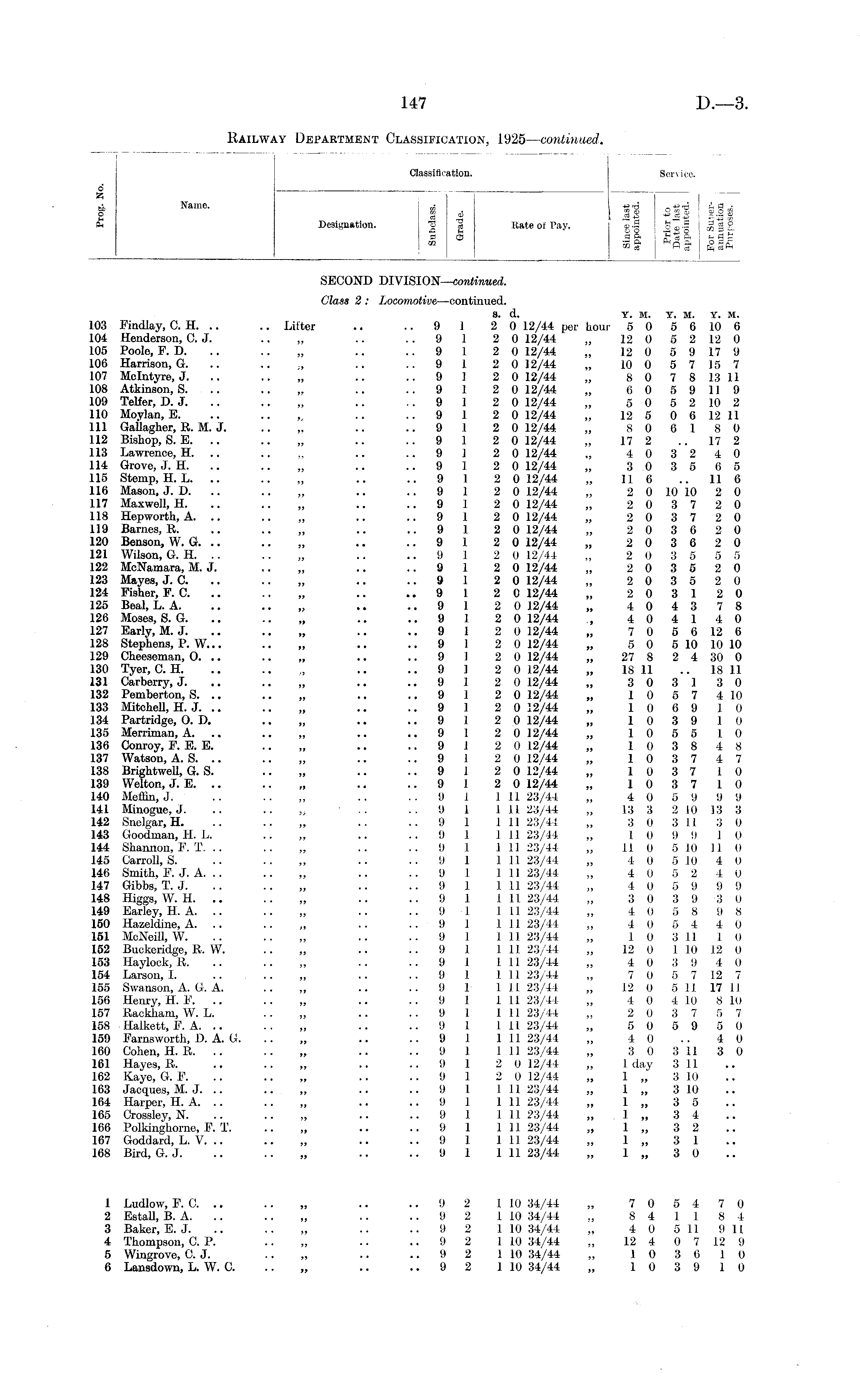 Classification. Service, o w> Name ' £ . S'g oti £ § * 8 S *2 ca| Designation. J g Hate of Pay. ©.§ S©-! a? s ° * ® SS'S'S^feSp £§< ggfi SECOND DIVISION—continued. Glass 2 : Locomotive—continued. a. d. y. m. y. m. y. m. 103 Findlay, 0. H. .. .. Lifter .. .. 9 1 2 0 12/44 per hour 5 0 5 6 10 6 104 Henderson, 0. J. .. „ .. ..9 1 2 0 12/44 „ 12 0 5 2 12 0 105 Poole, F. D. .. .. „ .. ..9 1 2 0 12/44 „ 12 0 5 9 17 9 106 Harrison, G. .. .. „ .. ..9 1 2 0 12/44 „ 10 0 5 7 15 7 107 Mclntyre, J. .. .. „ .. ..9 1 2 0 12/44 „ 8 0 7 8 13 11 108 Atkinson, S. .. .. ,. .. ..9 1 2 0 12/44 „ 6 0 5 9 11 9 109 Telfer, D. J. .. „ .. ..9 1 2 0 12/44 „ 5 0 5 2 10 2 110 Moylan, E. .. .. ,, .. ..9 1 2 0 12/44 „ 12 5 0 6 12 11 111 Gallagher, R. M. J. .. „ .. ..9 1 2 0 12/44 „ 8 0 6 1 8 0 112 Bishop, S. E. .. .. „ .. ..9 1 2 0 12/44 „ 17 2 17 2 113 Lawrence, H. .. .. .. ..9 1 2 0 12/44 „ 4 0 3 2 4 0 114 Grove, J. H. .. .. „ .. ..9 1 2 0 12/44 „ 3 0 3 5 6 5 115 Stemp, H. L. .. .. „ .. ..9 1 2 0 12/44 „ 11 6 .. 11 6 116 Mason, J. D. .. .. „ .. ..9 1 2 0 12/44 „ 2 0 10 10 2 0 117 Maxwell, H. .. „ .. ..9 1 2 0 12/44 „ 2 0 3 7 2 0 118 Hepworth, A. .. .. „ .. ..9 1 2 0 12/44 „ 2 0 3 7 2 0 119 Barnes, R. .. .. „ .. ..9 1 2 0 12/44 „ 2 0 3 6 2 0 120 Benson, W. G. .. .. „ .. ..9 1 2 0 12/44 „ 2 0 3 6 2 0 121 Wilson, G. H. .. .. „ .. .. 9 1 2 0 12/44 „ 2 0 3 5 5 5 122 McNamara, M. J. .. „ .. ..9 1 2 0 12/44 „ 2 0 3 5 2 0 123 Mayes, J. C. .. „ .. ..9 1 2 0 12/44 „ 2 0 3 5 2 0 124 Fisher, F. O. .. „ .. .. 9 1 2 0 12/44 „ 2 0 3 1 2 0 125 Beal, L. A. .. .. „ .. .. 9 1 2 0 12/44 „ 4 0 4 3 7 8 126 Moses, S. G. .. .. „ .. ..9 1 2 0 12/44 4 0 4 1 4 0 127 Early, M. J. .. „ .. ..9 1 2 0 12/44 „ 7 0 5 6 12 6 128 Stephens, P. W... .. „ .. ..9 1 2 0 12/44 „ 5 0 5 10 10 10 129 Cheeseman, O. .. .. „ .. ..9 1 2 0 12/44 „ 27 8 2 4 30 0 130 Tyer, C. H. .. .. „ .. .. 9 ] 2 0 12/44 „ 18 11 .. 18 11 131 Carberry, J. .. .. „ .. ..9 1 2 0 12/44 „ 3 0 3 .1 3 0 132 Pemberton, S. .. .. „ .. ..9 1 2 0 12/44 „ 1 0 5 7 4 10 133 Mitchell, H. J. .. .. „ .. ..9 1 2 0 12/44 „ 1 0 6 9 1 0 134 Partridge, O. D. .. „ .. ..9 1 2 0 12/44 „ 1 0 3 9 1 0 135 Merriman, A. .. .. „ .. .. 9 1 2 0 12/44 „ 1 0 5 5 1 0 136 Conroy, F. E. E. .. „ .. ..9 1 2 0 12/44 „ 1 0 3 8 4 8 137 Watson, A. S. .. .. „ .. ..9 1 2 0 12/44 „ 1 0 3 7 4 7 138 Brightwell, G. S. .. „ .. ..9 1 2 0 12/44 „ 1 0 3 7 1 0 139 Welton, J. E. .. .. „ .. ..9 1 2 0 12/44 „ 1 0 3 7 1 0 140 Meffin, J. .. .. „ .. ..9 1 1 11 23/44 „ 4 0 5 9 9 9 141 Minogue, J. .. .. „ .. ..91 1 11 23/44 „ 13 3 2 10 13 3 142 Snelgar, H. .. .. „ .. .. 9 J J 11 23/44 „ 3 0 3 11 3 0 143 Goodman, H. L. .. ,, .. ..9 1 1 11 23/44 „ 1 0 9 9 1 0 144 Shannon, F. T. .. .. „ .. ..9 1 1 11 23/44 „ 11 0 5 10 11 0 145 Carroll, S. .. .. „ .. ..9 1 1 11 23/44 „ 4 0 5 10 4 0 146 Smith, F. J. A. .. .. „ .. ..9 1 1 11 23/44 „ 4 0 5 2 4 0 147 Gibbs, T. J. .. .. „ .. ..9 1 1 11 23/44 „ 4 0 5 9 9 9 148 Higgs, W. H. .. .. „ .. ..9 1 1 11 23/44 „ 3 0 3 9 3 0 149 Earley, H. A. .. .. „ .. ..9 1 1 11 23/44 „ 4 0 5 8 9 8 150 Hazeldine, A. .. .. „ .. ..9 1 1 11 23/44 „ 4 0 5 4 4 0 151 McNeill, W. .. .. „ .. ..9 1 1 11 23/44 „ 1 0 3 11 1 0 152 Buckeridge, R. W. .. „ .. ..91 111 23/44 „ 12 0 1 10 12 0 153 Haylock, R. .. .. „ .. ..9 1 1 11 23/44 „ 4 0 3 9 4 0 154 Larson, I. .. .. „ .. ..9 1 1 11 23/44 „ 7 0 5 7 12 7 155 Swanson, A. G. A. .. „ .. ..9 1 1 11 23/44 „ 12 0 5 11 17 11 156 Henry, H. F. .. .. „ .. ..9 1 1 11 23/44 „ 4 0 4 10 8 10 157 Rackham, W. L. .. „ .. ..9 1 1 11 23/44 „ 2 0 3 7 5 7 158 Halkett, F. A. .. .. „ .. ..9 1 1 11 23/44 „ 5 0 5 9 5 0 159 Famsworth, D. A. G. .. „ .. ..9 1 1 11 23/44 „ 4 0 .. 4 0 160 Cohen, H. R. .. .. „ .. ..9 1 1 11 23/44 „ 3 0 3 11 3 0 161 Hayes, R. .. .. „ .. ..9 1 2 0 12/44 „ 1 day 3 11 162 Kaye, G. F. .. .. „ .. ..9 1 2 0 12/44 „ 1 „ 3 10 163 Jacques, M. J. .. .. „ .. ..9 1 1 11 23/44 „ 1 „ 3 10 164 Harper, H. A. .. .. „ .. ..9 1 1 11 23/44 „ 1 „ 3 5 165 Crossley, N. .. .. „ .. ..9 1 1 11 23/44 „ 1 „ 3 4 166 Polkinghorne, F. T. .. „ .. ..9 1 1 11 23/44 „ 1 „ 3 2 167 Goddard, L. V. .. .. „ .. ..9 1 1 11 23/44 „ 1 „ 3 1 168 Bird, G.J. .. .. „ .. ..9 1 1 11 23/44 „ 1 „ 3 0 1 Ludlow, F. C. .. .. „ .. .. 9 2 1 10 34/44 „ 7 0 5 4 7 0 2 Estall, B. A. .. „ .. ..9 2 1 10 34/44 ., 8 4 1 1 8 4 3 Baker, E. J. .. .. „ .. ..9 2 1 10 34/44 „ 4 0 5 11 9 11 4 Thompson, C. P. .. „ .. .. 9 2 1 10 34/44 „ 12 4 0 7 12 9 5 Wingrove, C. J. .. „ .. ..9 2 1 10 34/44 „ 1 0 3 6 1 0 6 Lansdown, L. W. C. .. „ .. .. 9 2 1 10 34/44 „ 1 0 3 9 1 0