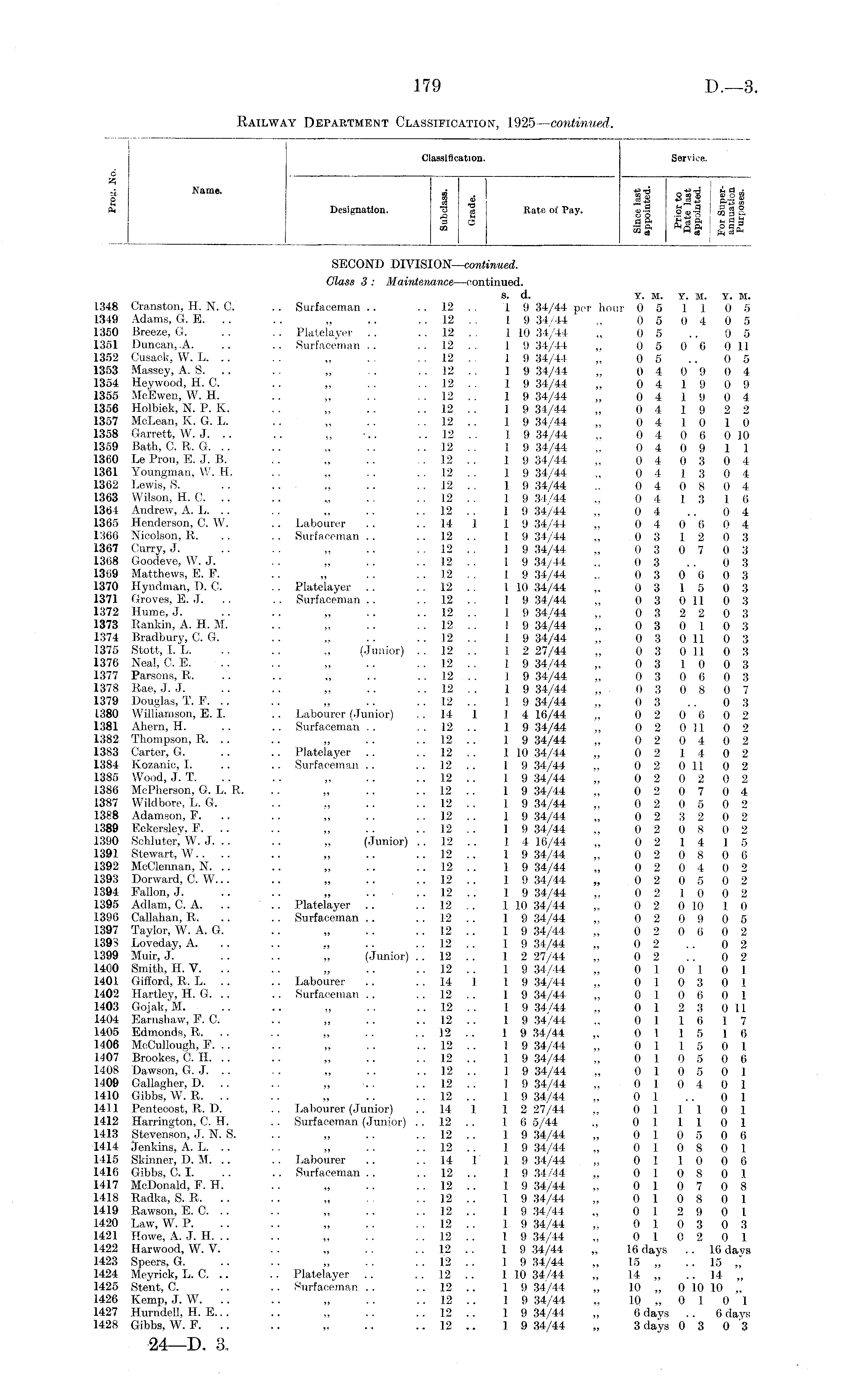 Railway Department Classification, 1925 —continued.