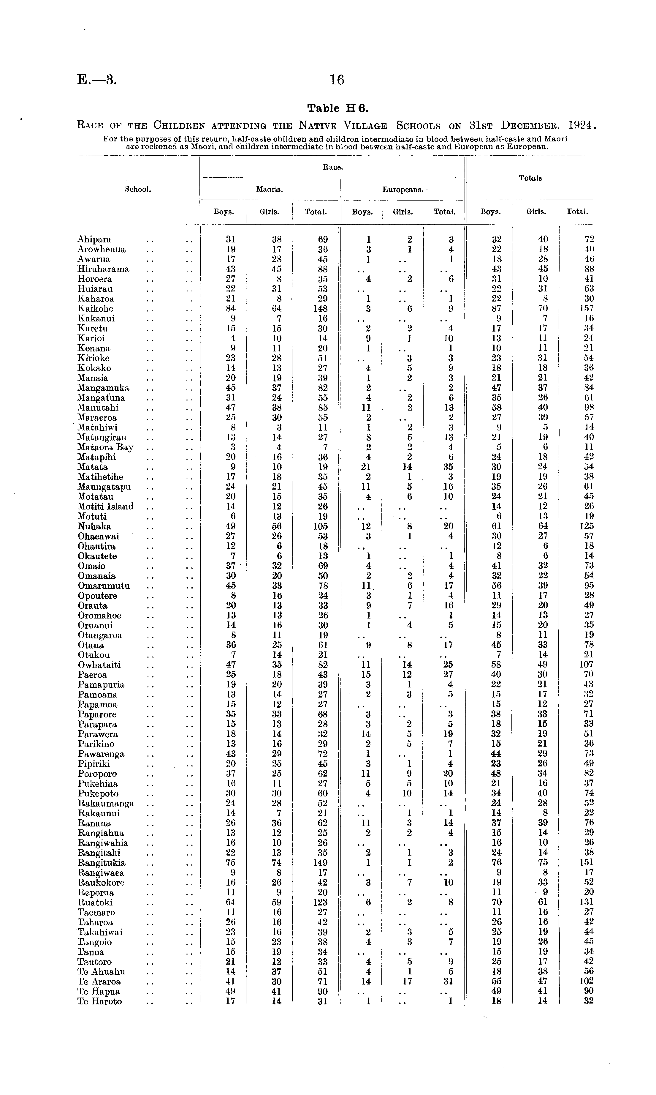 Table H6. Race of the Children attending the Native Village Schools on 31st December, 1924. For the purposes of this return, half-caste children and children intermediate in blood between half-caste and Maori are reckoned as Maori, and children intermediate in blood between half-caste and European as European.
