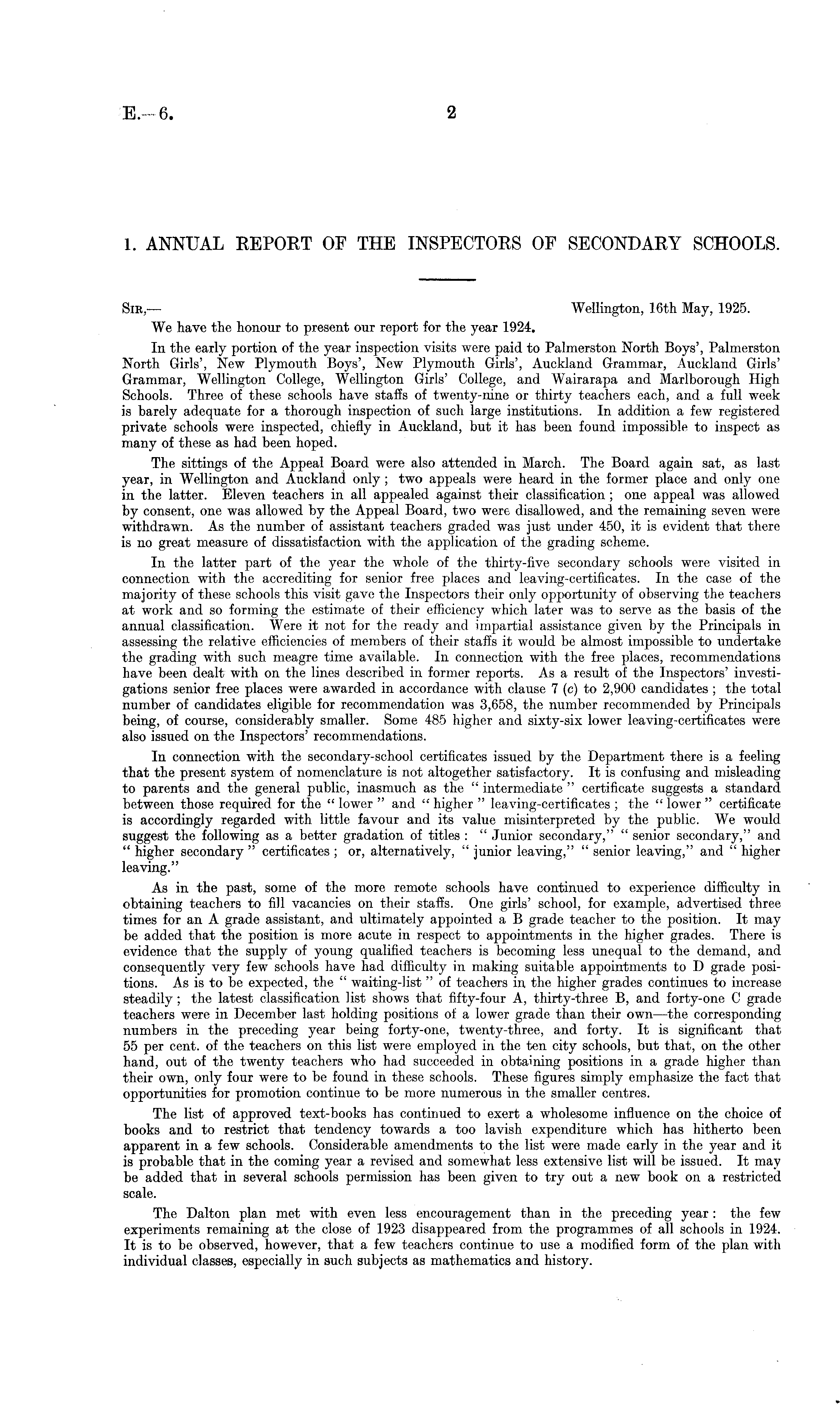 1. ANNUAL REPORT OF THE INSPECTORS OF SECONDARY SCHOOLS. Sir, —• Wellington, 16th May, 1925. We have the honour to present our report for the year 1924. In the early portion of the year inspection visits were paid to Palmerston North Boys', Palmerston North Girls', New Plymouth Boys', New Plymouth Girls', Auckland Grammar, Auckland Girls' Grammar, Wellington College, Wellington Girls' College, and Wairarapa and Marlborough High Schools. Three of these schools have staffs of twenty-nine or thirty teachers each, and a full week is barely adequate for a thorough inspection of such large institutions. In addition a few registered private schools were inspected, chiefly in Auckland, but it has been found impossible to inspect as many of these as had been hoped. The sittings of the Appeal Board were also attended in March. The Board again sat, as last year, in Wellington and Auckland only ; two appeals were heard in the former place and only one in the latter. Eleven teachers in all appealed against their classification ; one appeal was allowed by consent, one was allowed by the Appeal Board, two were disallowed, and the remaining seven were withdrawn. As the number of assistant teachers graded was just under 450, it is evident that there is no great measure of dissatisfaction with the application of the grading scheme. In the latter part of the year the whole of the thirty-five secondary schools were visited in connection with the accrediting for senior free places and leaving-certificates. In the case of the majority of these schools this visit gave the Inspectors their only opportunity of observing the teachers at work and so forming the estimate of their efficiency which later was to serve as the basis of the annual classification. Were it not for the ready and impartial assistance given by the Principals in assessing the relative efficiencies of members of their staffs it would be almost impossible to undertake the grading with such meagre time available. In connection with the free places, recommendations have been dealt with on the lines described in former reports. As a result of the Inspectors' investigations senior free places were awarded in accordance with clause 7 (c) to 2,900 candidates ; the total number of candidates eligible for recommendation was 3,658, the number recommended by Principals being, of course, considerably smaller. Some 485 higher and sixty-six lower leaving-certificates were also issued on the Inspectors' recommendations. In connection with the secondary-school certificates issued by the Department there is a feeling that the present system of nomenclature is not altogether satisfactory. It is confusing and misleading to parents and the general public, inasmuch as the " intermediate " certificate suggests a standard between those required for the " lower " and " higher " leaving-certificates ; the " lower " certificate is accordingly regarded with little favour and its value misinterpreted by the public. We would suggest the following as a better gradation of titles : " Junior secondary," " senior secondary," and " higher secondary " certificates ; or, alternatively, " junior leaving," " senior leaving," and " higher leaving." As in the past, some of the more remote schools have continued to experience difficulty in obtaining teachers to fill vacancies on their staffs. One girls' school, for example, advertised three times for an A grade assistant, and ultimately appointed a B grade teacher to the position. It may be added that the position is more acute in respect to appointments in the higher grades. There is evidence that the supply of young qualified teachers is becoming less unequal to the demand, and consequently very few schools have had difficulty in making suitable appointments to D grade positions. As is to be expected, the " waiting-list" of teachers in the higher grades continues to increase steadily; the latest classification list shows that fifty-four A, thirty-three B, and forty-one C grade teachers were in December last holding positions of a lower grade than their own —the corresponding numbers in the preceding year being forty-one, twenty-three, and forty. It is significant that 55 per cent, of the teachers on this list were employed in the ten city schools, but that, on the other hand, out of the twenty teachers who had succeeded in obtaining positions in a grade higher than their own, only four were to be found in these schools. These figures simply emphasize the fact that opportunities for promotion continue to be more numerous in the smaller centres. The list of approved text-books has continued to exert a wholesome influence on the choice of books and to restrict that tendency towards a too lavish expenditure which has hitherto been apparent in a few schools. Considerable amendments to the list were made early in the year and it is probable that in the coming year a revised and somewhat less extensive list will be issued. It may be added that in several schools permission has been given to try out a new book on a restricted scale. The Dalton plan met with even less encouragement than in the preceding year: the few experiments remaining at the close of 1923 disappeared from the programmes of all schools in 1924. It is to be observed, however, that a few teachers continue to use a modified form of the plan with individual classes, especially in such subjects as mathematics and history.