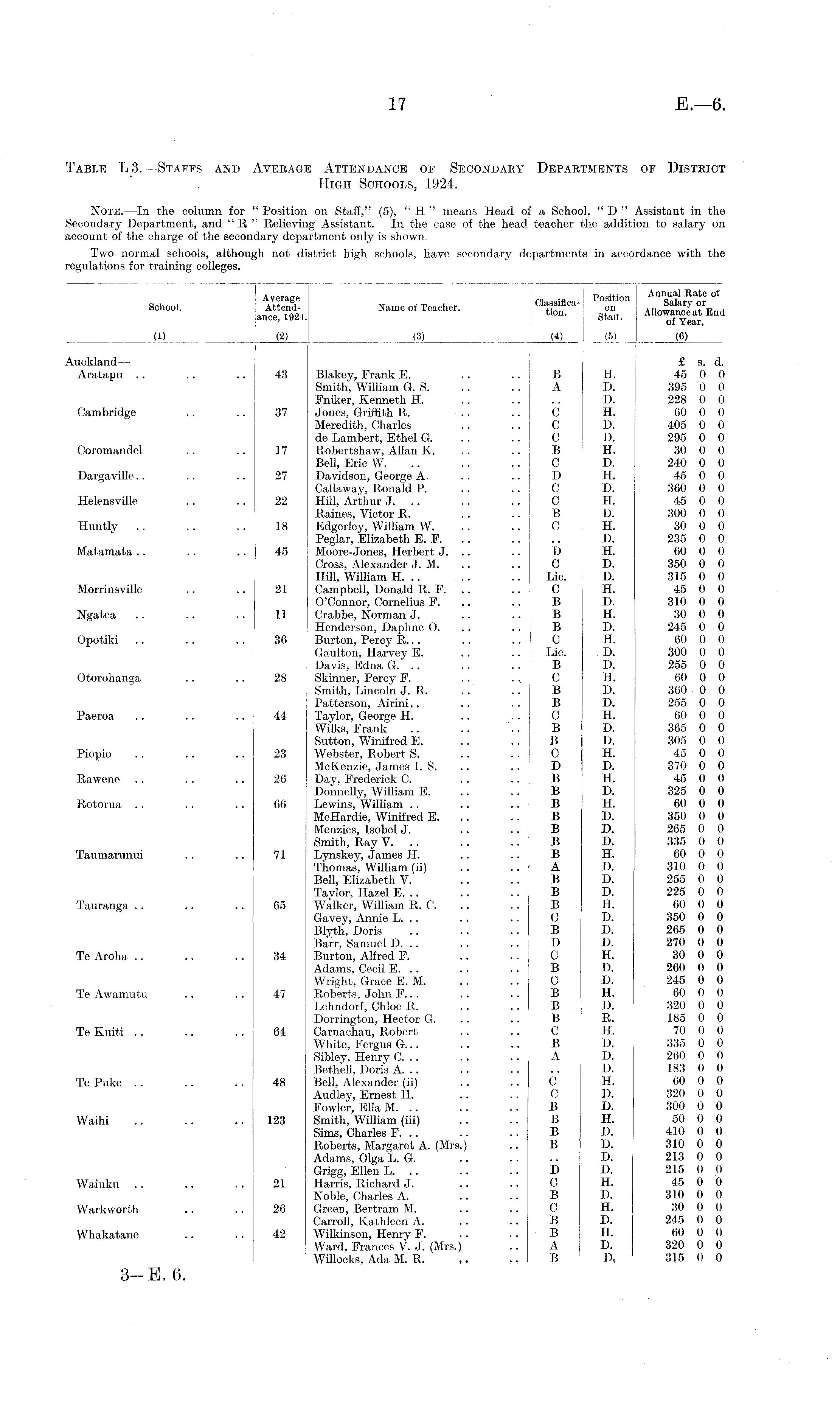 Note. —In the column for " Position on Staff," (5), " H " means Head of a School, " D " Assistant in the Secondary Department, and " R " Relieving Assistant. In the case of the head teacher the addition to salary on account of the charge of the secondary department only is shown. Two normal schools, although not district high schools, have secondary departments in accordance with the regulations for training colleges. Avera S e i Classifies Position °' School. Attend. Name of Teacher. C ™> on Ano ®Sa°t B nd ance, iv&'i. ouaii. Year W_ (2) (3) i (4) _ (5) (C) , Auckland— £ s. d. Aratapu .. .. .. 43 Blakey, Frank E. .. .. B H. 45 0 0 Smith, William G. ,8. .. . . A I). 395 0 0 Fniker, Kenneth H. .. .. .. D. 228 0 0 Cambridge .. .. 37 Jones, Griffith R. .. C H. 60 0 0 Meredith, Charles .. .. 0 D. 405 0 0 de Lambert, Ethel G. .. .. C D. 295 0 0 Coromandel .. .. 17 Robertshaw, Allan K, .. B H. 30 0 0 Bell, Eric W. .. .. C D. 240 0 0 Dargaville.. .. .. 27 Davidson, George A .. .. D H. 45 0 0 Callaway, Ronald P. .. .. C I ). 360 0 0 Helensville .. .. 22 Hill, Arthur J. .. .. .. C H. 45 0 0 Raines, Victor R. .. .. B D. 300 0 0 Huntly .. .. .. 18 Edgerley, William W. .. C H. 30 0 0 Peglar, Elizabeth E. F. .. .. .. I). 235 0 0 Matamata.. .. .. 45 Moore-Jones, Herbert J. .. .. D H. 60 0 0 Cross, Alexander J. M. .. C D. 350 0 0 Hill, William H. .. . . .. Lie. D. 315 0 0 Morrinsville .. .. 21 Campbell, Donald R. F. .. I C H. 45 0 0 O'Connor, Cornelius F. .. j B D. 310 0 0 Ngatea .. .. .. 11 Crabbe, Norman J. . . .. | B H. 30 0 0 Henderson, Daphne O. . . B D. 245 0 0 Opotiki .. . . .. 36 Burton, Percy R... .. .. C H. 60 0 0 Gaulton, Harvey E. .. .. Lie. D. 300 0 0 Davis, Edna G. .. .. .. B D. 255 0 0 Otorohanga .. .. 28 Skinner, Percy F. .. ., C H. 60 0 0 Smith, Lincoln J. R. .. .. B D. 360 0 0 Patterson, Airini.. .. .. B D. 255 0 0 Paeroa .. .. .. 44 Taylor, George H. .. .. C H. 60 0 0 Wilks, Frank .. .. .. B D. 365 0 0 Sutton, Winifred E. .. B D. 305 0 0 Piopio .. .. .. 23 Webster, Robert S. .... C H. 45 0 0 McKenzie, James I. S. .. .. D D. 370 0 0 Rawene .. . . .. 26 Day, Frederick C. .. .. B H. 45 0 0 Donnelly, William E. .. .. B D. 325 0 0 Rotorua .. .. .. 66 Lewins, William .. .. .. B H. 60 0 0 McHardie, Winifred E. .. . . B D. 351) 0 0 Menzies, Isobel J. .. .. B D. 265 0 0 Smith, Ray V. .. .. .. B D. 335 0 0 Taumarunui .. .. 71 Lynskey, James H. .. .. B H. 60 0 0 Thomas, William (ii) .. .. A D. 310 0 0 Bell, Elizabeth V. .. .. B D. 255 0 0 Taylor, Hazel E. .. .. .. B D. 225 0 0 Tauranga .. .. .. 65 Walker, William R. 0. • • B H. 60 0 0 Gavey, Annie L, .. .. .. C D. 350 0 0 Blyth, Doris .. .. .. B D. 265 0 0 Barr, Samuel D. .. .. .. D D. 270 0 0 Te Aroha .. .. .. 34 Burton, Alfred F. .. .. C H. 30 0 0 Adams, Cecil E. .. .. . . B D. 260 0 0 Wright, Grace E. M. .. .. C D. 245 0 0 Te Awamutu .. .. 47 Roberts, John F... .. .. B H. 60 0 0 Lehndorf, Chloe R. .. .. B D. 320 0 0 Dorrington, Hector G. .. B R. 185 0 0 Te Kuiti .. .. .. 64 Carnachan, Robert .. .. C H. 70 0 0 White, Fergus G... .. .. B D. 335 0 0 Sibley, Henry 0. .. .. .. A D. 260 0 0 Bethell, Doris A. .. .. .. .. D. 183 0 0 Te Puke ,. .. .. 48 Bell, Alexander (ii) .. .. C H. 60 0 0 Audley, Ernest H. .. .. 0 D. 320 0 0 Fowler, Ella M. .. .. .. B D. 300 0 0 Waihi . . .. .. 123 Smith, William (iii) .. .. B H. 50 0 0 Sims, Charles F. .. .. .. B D. 410 0 0 Roberts, Margaret A. (Mrs.) .. B D. 310 0 0 Adams, Olga L. G. .. .. •• ,D. 213 0 0 Grigg, Ellen L. .. .. .. D D. 215 0 0 Waiuku .. .. .. 21 Harris, Richard J. .. .. C H. 45 0 0 Noble, Charles A. .. .. B D. 310 0 0 Warkworth .. .. 26 Green, Bertram M. .. .. C H. 30 0 0 Carroll, Kathleen A. .. .. B D. 245 0 0 Whakatane .. .. 42 Wilkinson, Henry F. .. .. B H. 60 0 0 Ward, Frances V. J. (Mrs.) .. A D. 320 0 0 1 Willocks, Ada M, R. ,, ., B D, 315 0 0