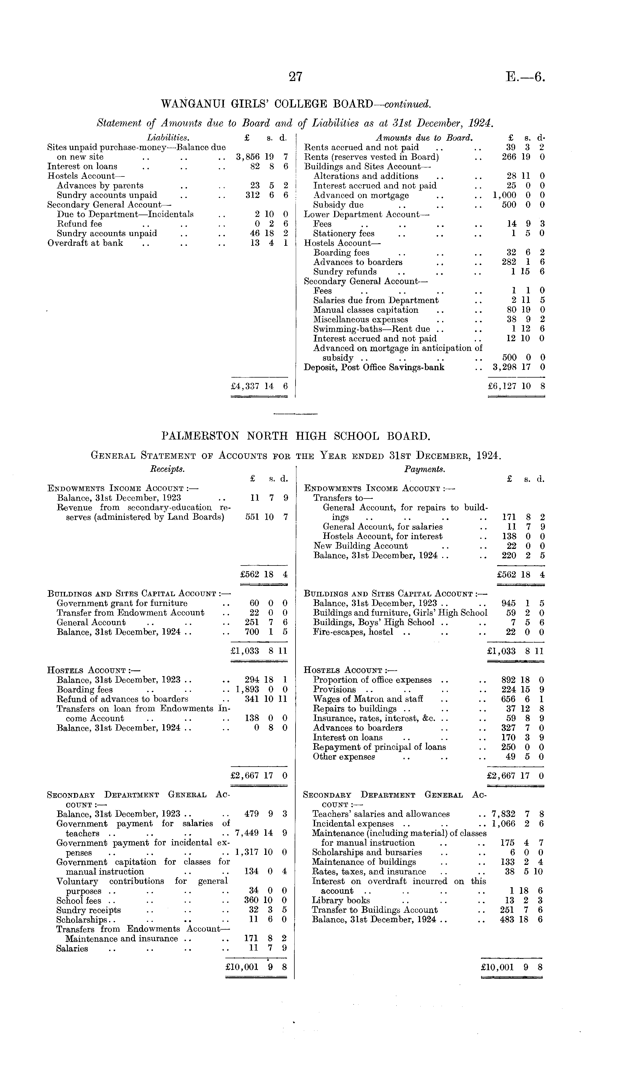 WANGANUI GIRLS' COLLEGE BOARD—continued. Statement of Amounts due to Board and of Liabilities as at 31st December, 1924. Liabilities. £ a. d. Amounts due to Board. £ s. (!• Sites unpaid purchase-money—Balance due Rents accrued and not paid .. .. 39 3 2 on new site .. .. .. 3,856 If) 7 Rents (reserves vested in Board) .. 266 19 0 Interest on loans .. .. .. 82 8 6 Buildings and Sites Account — Hostels Account— Alterations and additions .. .. 28110 Advances by parents .. .. 23 5 2 Interest accrued and not paid .. 25 0 0 Sundry accounts unpaid .. .. 312 6 6 Advanced on mortgage .. .. 1,000 0 0 Secondary General Account— Subsidy due .. .. .. 500 0 0 Due to Department—lncidentals .. 210 0 Lower Department Account — Refund fee .. .. .. 0 2 6 Fees .. .. .. .. 14 9 3 Sundry accounts unpaid .. .. 46 18 2 Stationery fees .. .. .. 15 0 Overdraft at bank .. .. .. 13 4 1 Hostels Account — Boarding fees .. .. .. 32 6 2 Advances to boarders .. .. 282 1 6 Sundry refunds .. .. .. 1 15 6 Secondary General Account— Fees .. .. .. .. 110 Salaries due from Department .. 2 115 Manual classes capitation .. .. 80 19 0 Miscellaneous expenses .. .. 38 9 2 Swimming-baths—Rent due .. .. 1 12 6 Interest accrued and not paid .. 12 10 0 Advanced on mortgage in anticipation of subsidy .. .. .. .. 500 0 0 Deposit, Post Office Savings-bank .. 3,298 17 0 £4,337 14 6 £6,127 10 8 PALMERSTON NORTH HIGH SCHOOL BOARD. General Statement op Accounts for the Year ended 31st December, 1924-. Receipts. Payments. £ s. d. £ s. d. Endowments Income Account :—• Endowments Income Account :— Balance, 31st December, 1923 .. 11 7 9 Transfers to —- Revenue from secondary-education re- General Account, for repairs to buildserves (administered by Land Boards) 551 10 7 ings .. .. .. .. 171 8 2 General Account, for salaries .. 117 9 Hostels Account, for interest .. 138 0 0 New Building Account .. .. 22 0 0 Balance, 31st December, 1924 .. .. 220 2 5 £562 18 4 £562 18 4 Buildings and Sites Capital Account :—- Buildings and Sites Capital Account : — Government grant for furniture .. 60 0 0 Balance, 31st December, 1923 .. .. 945 1 5 Transfer from Endowment Account .. 22 0 0 Buildings and furniture, Girls' High School 59 2 0 General Account .. .. .. 251 7 6 Buildings, Boys' High School .. .. 7 5 6 Balance, 31st December, 1924 .. .. 700 1 5 Fire-escapes, hostel .. .. .. 22 0 0 £1,033 8 11 £1,033 8 11 Hostels Account :— Hostels Account : —- Balance, 31st December, 1923 .. .. 294 18 1 Proportion of office expenses .. .. 892 18 0 Boarding fees .. .. .. 1,893 0 0 Provisions .. .. .. .. 224 15 9 Refund of advances to boarders .. 341 10 11 Wages of Matron and stafE .. .. 656 6 1 Transfers on loan from Endowments In- Repairs to buildings .. .. .. 37 12 8 come Account .. .. •. 138 0 0 Insurance, rates, interest, &c. .. .. 59 8 9 Balance, 31st December, 1924 .. .. 0 8 0 Advances to boarders .. .. 327 7 0 Interest on loans .. .. .. 170 3 9 Repayment of principal of loans .. 250 0 0 Other expenses .. .. .. 49 5 0 £2,667 17 0 £2,667 17 0 Secondary Department General Ac- Secondary Department General Account count : — Balance, 31st December, 1923 .. .. 479 9 3 Teachers'salaries and allowances .. 7,832 7 8 Government payment for salaries of Incidental expenses .. .. .. 1,066 2 6 teachers .. .. .. .. 7,449 14 9 Maintenance (including material) of classes Government payment for incidental ex- for manual instruction .. .. 175 4 7 penses .. .. .. .. 1,317 10 0 Scholarships and bursaries .. .. 6 0 0 Government capitation for classes for Maintenance of buildings .. .. 133 2 4 manual instruction .. .. 134 0 4 Rates, taxes, and insurance .. .. 38 510 Voluntary contributions for general Interest on overdraft incurred on this purposes .. .. .. •. 34 0 0 account .. .. .. .. I 18 6 School fees .. .. • ■ • ■ 360 10 0 Library books .. .. .. 13 2 3 Sundry receipts .. .. .. 32 3 5 Transfer to Buildings Account .. 251 7 6 Scholarships.. .. .. .. 11 6 0 Balance, 31st December, 1924 .. .. 483 18 6 Transfers from Endowments Account —• Maintenance and insurance .. .. 171 8 2 Salaries .. .. .. .. 117 9 £10,001 9 8 £10,001 9 8
