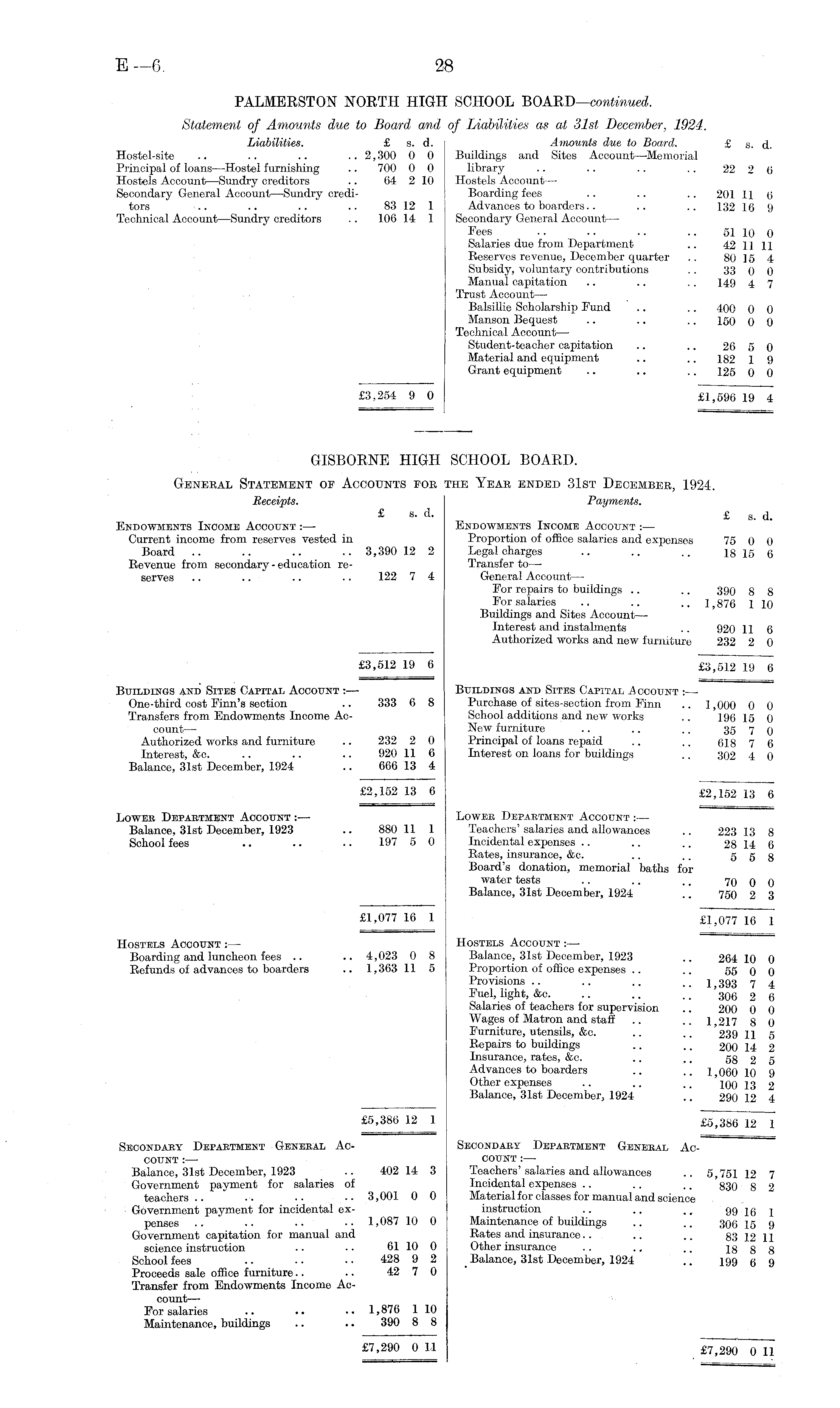 PALMERSTON NORTH HIGH SCHOOL BOARD—continued. Statement of Amounts due to Board and of Liabilities as at 31st December, 1924. Liabilities. £ s. d. Amounts due to Board. £ g. d. Hostel-site .. .. .. .. 2,300 0 0 Buildings and Sites Account —Memorial Principal of loans—Hostel furnishing .. 700 0 0 library .. .. .. .. 22 2 6 Hostels Account—Sundry creditors .. 64 210 Hostels Account— Secondary General Account —Sundry credi- Boarding fees .. .. .. 201 11 6 tors .. .. .. .. 83 12 1 Advances to boarders.. .. .. 132 16 9 Technical Account —Sundry creditors .. 106 14 1 Secondary General Account —- Fees .. .. .. .. 51 10 0 Salaries due from Department .. 42 11 11 Reserves revenue, December quarter .. 80 ] 5 4 Subsidy, voluntary contributions .. 33 0 0 Manual capitation .. .. .. 149 4 7 Trust Account— Balsillie Scholarship Fund .. .. 400 0 0 Manson Bequest .. .. .. 150 0 0 Technical Account — Student-teacher capitation .. .. 26 5 0 Material and equipment .. .. 182 1 9 Grant equipment .. .. .. 125 0 0 £3,254 9 0 £1,596 19 4 GISBORNE HIGH SCHOOL BOARD. General Statement op Accounts foe the Year ended 31st December, 1924. Receipts. Payments. £ s - d. £ s. d. Endowments Income Account :— Endowments Income Account : — Current income from reserves vested in Proportion of office salaries and expenses 75 0 0 Board .. .. .. .. 3,390 12 2 Legal charges .. .. .. 18 15 6 Revenue from secondary - education re- Transfer to — serves .. .. .. .. 122 7 4 General Account— For repairs to buildings .. .. 390 8 8 For salaries .. .. .. 1,876 110 Buildings and Sites Account— Interest and instalments .. 920 11 6 Authorized works and new furniture 232 2 0 £3,512 19 6 £3,512 19 6 Buildings and Sites Capital Account :— Buildings and Sites Capital Account :— One-third cost Finn's section .. 333 6 8 Purchase of sites-section from Finn .. 1,000 0 0 Transfers from Endowments Income Ac- School additions and new works .. 196 15 0 count— New furniture .. .. .. 35 7 0 Authorized works and furniture .. 232 2 0 Principal of loans repaid .. .. 618 7 6 Interest, &c. .. .. .. 920 11 6 Interest on loans for buildings .. 302 4 0 Balance, 31st December, 1924 .. 666 13 4 £2,152 13 6 £2,152 13 6 Lower Department Account :— Lower Department Account :—- Balance, 31st December, 1923 .. 880 11 1 Teachers'salaries and allowances .. 223 13 8 School fees .. .. .. 197 5 0 Incidental expenses .. .. .. 28 14 6 Rates, insurance, &c. .. .. 5 5 8 Board's donation, memorial baths for water tests .. .. .. 70 0 0 Balance, 31st December, 1924 .. 750 2 3 £1,077 16 1 £1,077 16 I Hostels Account : —■ Hostels Account :— Boarding and luncheon fees .. .. 4,023 0 8 Balance, 31st December, 1923 .. 264 10 0 Refunds of advances to boarders .. 1,363 11 5 Proportion of office expenses .. .. 55 0 0 Provisions .. .. .. .. 1 393 7 4 Fuel, light, &c. .. .. .. ' 306 2 6 Salaries of teachers for supervision .. 200 0 0 Wages of Matron and staff .. .. 1,217 8 0 Furniture, utensils, &e. .. .. 23911 5 Repairs to buildings .. .. 200 14 2 Insurance, rates, &c. .. .. 58 2 5 Advances to boarders .. .. 1 060 10 9 Other expenses .. .. .. jqo 13 2 Balance, 31st December, 1924 .. 290 12 4 £5,386 12 1 £5,386 12 1 Secondary Department General Ac- Secondary Department General Account :— count : —• Balance, 31st December, 1923 .. 402 14 3 Teachers'salaries and allowances .. 5,751 12 7 Government payment for salaries of Incidental expenses .. .. .. 830 8 2 teachers.. .. .. ■■ 3,001 0 0 Material for classes for manual and science Government payment for incidental ex- instruction .. .. ~ 99 16 1 penses .. .. .. •• 1,087 10 0 Maintenance of buildings .. .. 306 15 9 Government capitation for manual and Rates and insurance.. .. .. 83 12 11 science instruction .. .. 61 10 0 Other insurance .. .. .. 18 8 8 School fees .. •• •• 428 9 2 _ Balance, 31st December, 1924 .. 199 (j 9 Proceeds sale office furniture.. .. 42 7 0 Transfer from Endowments Income Account — For salaries .. .. 1,876 1 10 Maintenance, buildings .. .. 390 8 8 £7,290 0 11 £7,290 0 11