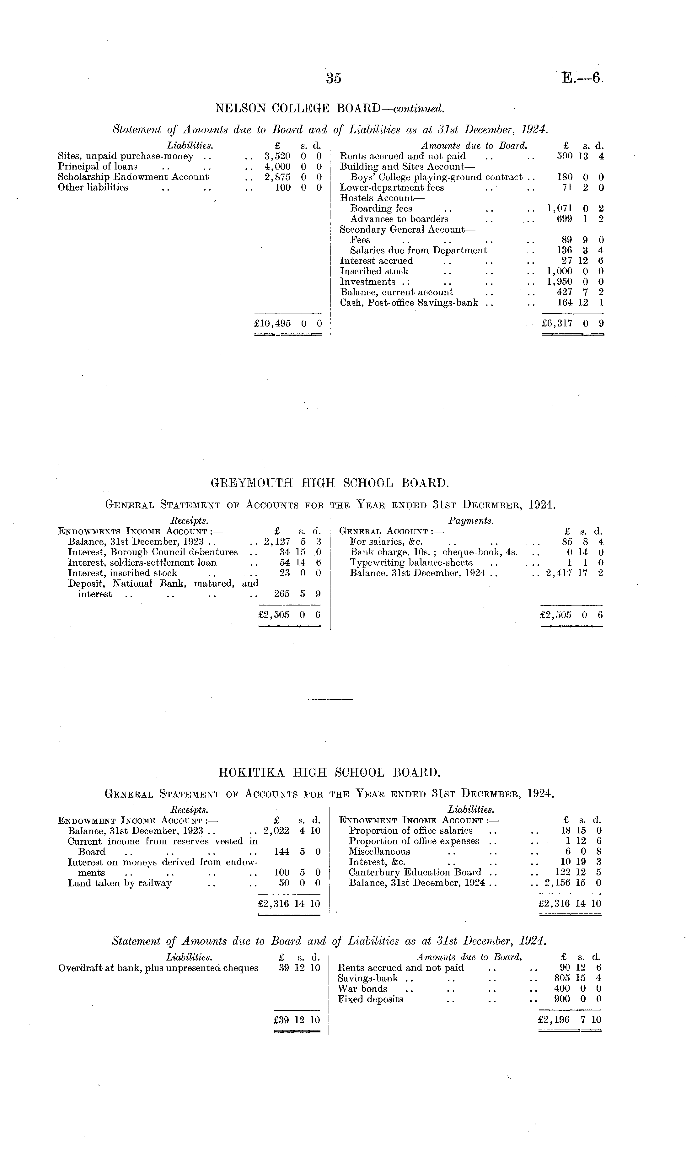 NELSON COLLEGE BOARD —continued. Statement of Amounts due to Board and of Liabilities as at 31st December, 1924. Liabilities. £ s. d. ! Amounts due to Board. £ s. d. Sites, unpaid purchase-money .. .. 3,520 0 0 Rents accrued and not paid .. .. 500 13 4 Principal of loans .. .. .. 4,000 0 0 Building and Sites Account — Scholarship Endowment Account .. 2,875 0 0 Boys' College playing-ground contract .. 180 0 0 Other liabilities .. .. .. 100 0 0 Lower-department fees .. .. 71 2 0 Hostels Account — Boarding fees .. .. .. 1,071 0 2 Advances to boarders .. .. 699 1 2 Secondary General Account— Fees .. .. .. .. 89 9 0 Salaries due from Department . . 136 3 4 Interest accrued .. .. .. 27 12 6 Inscribed stock .. .. 1,000 0 0 Investments .. .. .. 1,950 0 0 Balance, current account .. .. 427 7 2 Cash, Post-office Savings-bank .. .. 164 12 1 £10,495 0 0 £6,317 0 9 GREYMOUTH HIGH SCHOOL BOARD. General Statement of Accounts fob the Year ended 31st December, 1924. Receipts. Payments. Endowments Income Account :— £ s. d. General Account :— £ s. d. Balance, 31st December, 1923 .. .. 2,127 5 3 For salaries, &c. .. .. .. 85 8 4 Interest, Borough Council debentures .. 34 15 0 Bank charge, 10s. ; cheque-book, 4s. .. 014 0 Interest, soldiers-settlement loan .. 54 14 6 Typewriting balance-sheets .. .. 110 Interest, inscribed stock .. .. 23 0 0 Balance, 31st December, 1924 .. .. 2,417 17 2 Deposit, National Bank, matured, and interest .. .. .. .. 265 5 9 £2,505 0 6 £2,505 0 6 HOKITIKA HIGH SCHOOL BOARD. General Statement of Accounts for the Year ended 31st December, 1924. Receipts. Liabilities. Endowment Income Account :— £ s. d. Endowment Income Account :— £ s. d. Balance, 31st December, 1923 .. .. 2,022 410 Proportion of office salaries ~ .. 18 15 0 Current income from reserves vested in Proportion of office expenses .. .. 1 12 6 Board .. .. .. .. 144 5 0 Miscellaneous .. .. .. 6 0 8 Interest on moneys derived from endow- Interest, &c. .. .. .. 10 19 3 ments .. .. .. .. 100 5 0 Canterbury Education Board .. .. 122 12 5 Land taken by railway .. .. 50 0 0 Balance, 31st December, 1924 .. .. 2,156 15 0 £2,316 14 10 £2,316 14 10 Statement of Amounts due to Board and of Liabilities as at 31st December, 1924. Liabilities. £ s. d. Amounts due to Board. £ s. d. Overdraft at bank, plus unpresented cheques 39 12 10 Rents accrued and not paid .. .. 90 12 6 Savings-bank .. .. .. .. 805 15 4 War bonds .. .. .. .. 400 0 0 Fixed deposits .. .. .. 900 0 0 £39 12 10 £2,196 7 10