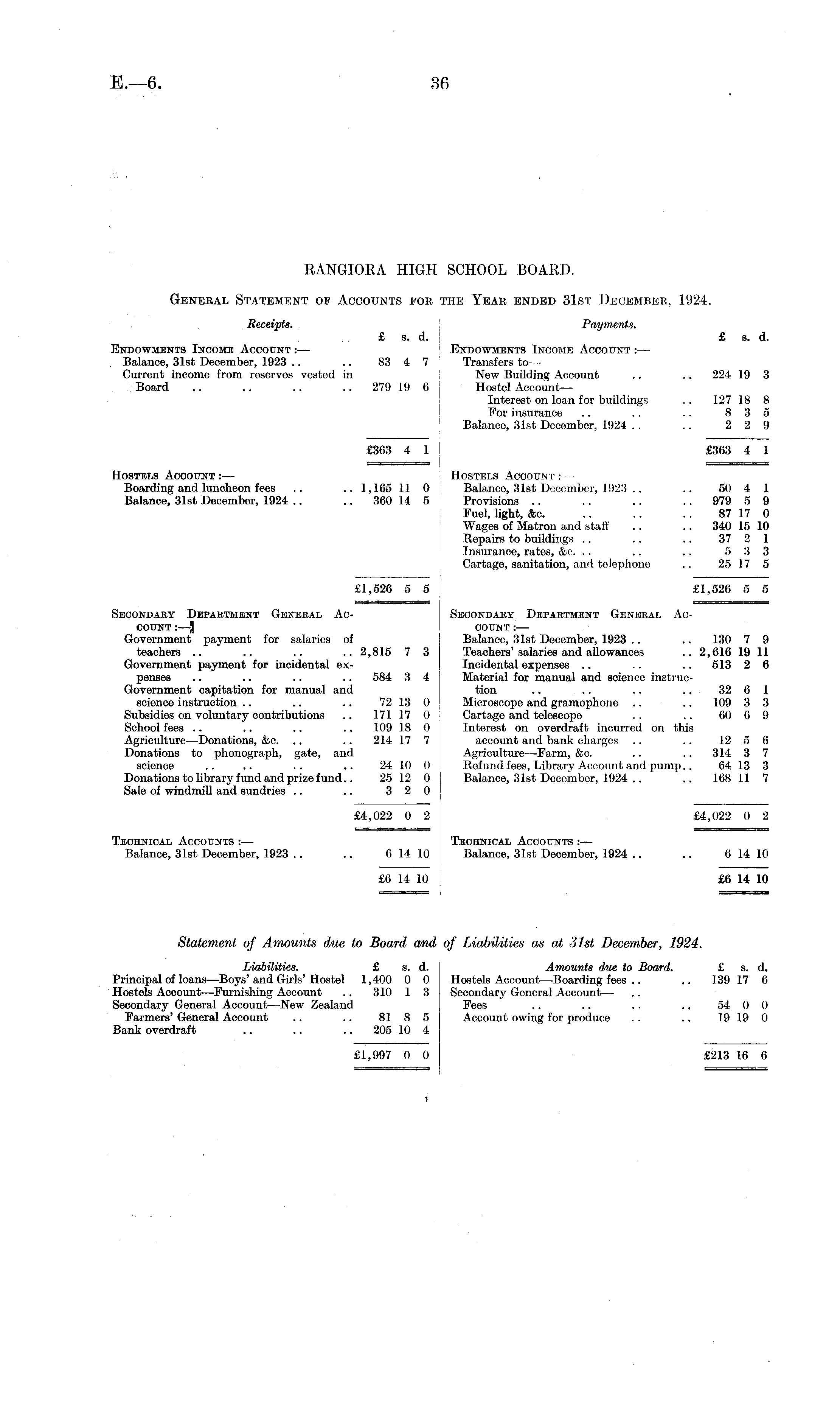 RANGIORA HIGH SCHOOL BOARD. General Statement of Accounts foe the Year ended 31st December, 1924. Receipts. Payments. £ s. d. £ s. d. Endowments Income Account Endowments Income Account :— Balance, 31st December, 1923 .. .. 83 4 7 Transfers to— Current income from reserves vested in New Building Account .. .. 224 19 3 Board .. .. .. .. 279 19 6 Hostel Account — Interest on loan for buildings .. 127 18 8 For insurance .. .. .. 8 3 8 Balance, 31st December, 1924 .. .. 2 2 9 £363 4 1 £363 4 1 Hostels Account :— Hostels Account :— Boarding and luncheon fees .. .. 1,165 11 0 Balance, 31st December, 1923 .. .. 50 4 1 Balance, 31st December, 1924 .. .. 360 14 5 Provisions .. .. .. .. 979 5 9 Fuel, light, &c. .. .. .. 87 17 0 Wages of Matron and staff .. .. 340 16 10 Repairs to buildings .. .. .. 37 2 1 Insurance, rates, &c. .. .. .. 5 3 3 Cartage, sanitation, and telephone .. 25 17 5 £1,526 5 5 £1,526 5 5 Secondary Department General Ac- Secondary Department General Account J count :— Government payment for salaries of Balance, 31st December, 1923 .. .. 130 7 9 teachers .. .. .. ... 2,815 7 3 Teachers'salaries and allowances .. 2,616 19 11 Government payment for incidental ex- Incidental expenses .. .. . . 513 2 6 penses .. .. .. .. 584 3 4 Material for manual and science instrucGovernment capitation for manual and tion .. .. .. .. 32 6 1 science instruction .. .. .. 72 13 0 Microscope and gramophone .. .. 109 3 3 Subsidies on voluntary contributions .. 171 17 0 Cartage and telescope .. .. 60 6 9 School fees .. .. .. .. 109180 Interest on overdraft incurred on this Agriculture—Donations, &c. .. .. 214 17 7 account and bank charges .. .. 12 5 6 Donations to phonograph, gate, and Agriculture—Farm, &c. .. .. 314 3 7 science .. .. .. .. 24 10 0 Refund fees, Library Account and pump.. 64 13 3 Donations to library fund and prize fund.. 25 12 0 Balance, 31st December, 1924 .. .. 168 11 7 Sale of windmill and sundries .. .. 3 2 0 £4,022 0 2 £4,022 0 2 Technical Accounts :— Technical Accounts Balance, 31st December, 1923 .. .. 6 14 10 Balance, 31st December, 1924 .. .. 6 14 10 £6 14 10 £6 14 10 Statement of Amounts due to Board and of Liabilities as at 31st December, 1924. Liabilities. £ s. d. Amounts due to Board. £ s. d. Principal of loans —Boys'and Girls' Hostel 1,400 0 0 Hostels Account—Boarding fees .. .. 139 17 6 Hostels Account-—Furnishing Account .. 310 1 3 Secondary General Account— Secondary General Account—New Zealand Fees .. .. .. .. 54 0 0 Farmers' General Account .. .. 818 5 Account owing for produce .. .. 19 19 0 Bank overdraft .. .. .. 205 10 4 £1,997 0 0 £213 16 6 i