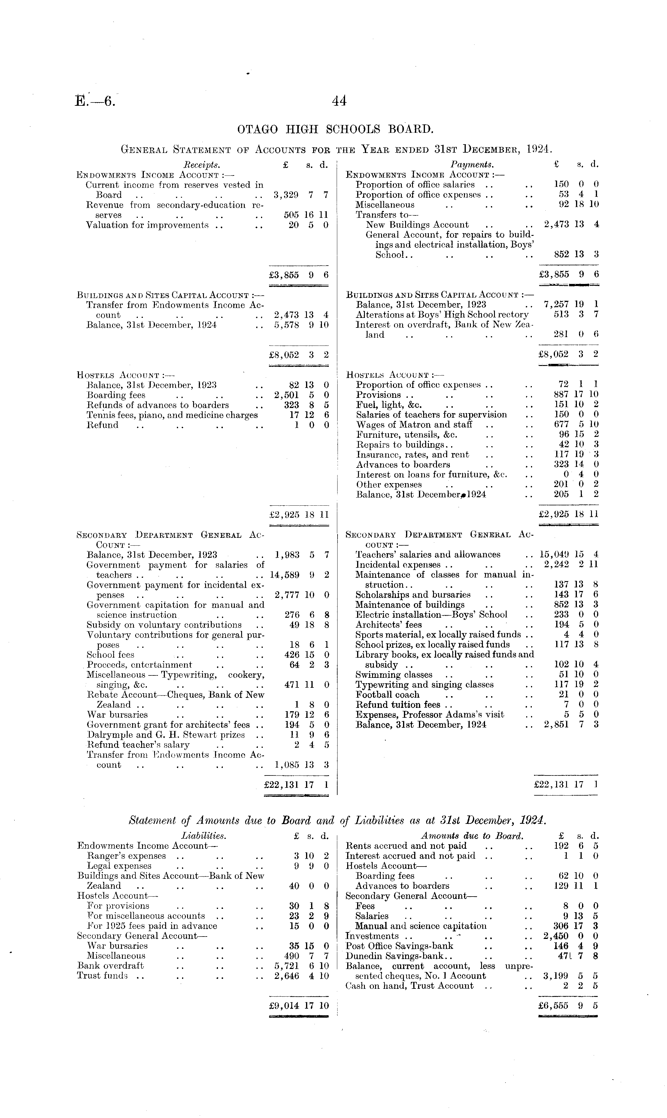 OTAGO HIGH SCHOOLS BOARD. General Statement op Accounts fob the Year ended 31st December, 1924. Receipts. £ s. d. Payments. £ s. d. Endowments Income Account : — Endowments Income Account :— Current income from reserves vested in Proportion of office salaries .. .. 150 0 0 Board .. .. .. .. 3,329 7 7 Proportion of office expenses .. .. 53 4 1 Revenue from secondary-education re- Miscellaneous .. .. .. 92 18 10 serves .. .. .. .. 505 16 11 Transfers to— Valuation for improvements .. .. 20 5 0 New Buildings Account .. .. 2,473 13 4 General Account, for repairs to buildings and electrical installation, Boys' School.. .. .. .. 852 13 3 £3,855 9 6 £3,855 9 6 Buildings and Sites Capital Account :— Buildings and Sites Capital Account : — Transfer from Endowments Income Ac- Balance, 31st December, 1923 .. 7,257 19 1 count .. .. .. .. 2,473 13 4 Alterations at Boys' High School rectory 513 3 7 Balance, 31st December, 1924 .. 5,578 910 Interest on overdraft, Bank of New Zealand .. .. .. .. 281 0 6 £8,052 3 2 £8,052 3 2 Hostels Account :— Hostels Account :— Balance, 31st December, 1923 .. 82 13 0 Proportion of office expenses .. .. 72 1 1 Boarding fees .. .. .. 2,501 5 0 Provisions .. .. .. .. 887 17 10 Refunds of advances to boarders .. 323 8 5 Euel, light, &c. .. .. .. 151 10 2 Tennis fees, piano, and medicine charges 17 12 6 Salaries of teachers for supervision .. 150 0 0 Refund .. .. .. .. 10 0 Wages of Matron and staff .. .. 677 510 Furniture, utensils, &c. .. .. 96 15 2 Repairs to buildings.. .. .. 42 10 3 Insurance, rates, and rent .. .. 117 19 3 Advances to boarders . . .. 323 14 0 Interest on loans for furniture, &c. .. 0 4 0 Other expenses .. .. .. 201 0 2 Balance, 31st 1924 .. 205 1 2 £2,925 18 11 £2,925 18 11 Secondary Department General Ac- Secondary Department General AcCount :— count :— Balance, 31st December, 1923 .. 1,983 5 7 Teachers'salaries and allowances .. 15,049 15 4 Government payment for salaries of Incidental expenses .. .. .. 2,242 2 11 teachers .. .. .. .. 14,589 9 2 Maintenance of classes for manual inGovernment payment for incidental ex- struction.. .. .. .. 137 13 8 penses .. .. .. .. 2,777 10 0 Scholarships and bursaries .. .. 143 17 6 Government capitation for manual and Maintenance of buildings . . .. 852 13 3 science instruction .. .. 276 6 8 Electric installation—Boys'School .. 233 0 0 Subsidy on voluntary contributions .. 49 18 8 Architects' fees .. .. .. 194 5 0 Voluntary contributions for general pur- Sports material, ex locally raised funds .. 4 4 0 poses .. .. .. .. 18 6 1 School prizes, ex locally raised funds .. 117 13 8 School fees .. .. .. 426 15 0 Library books, ex locally raised funds and Proceeds, entertainment .. .. 64 2 3 subsidy .. .. .. .. 102 10 4 Miscellaneous — Typewriting, cookery, Swimming classes .. .. . . 51 10 0 singing, &c. .. .. .. 471 11 0 Typewriting and singing classes .. 117 19 2 Rebate Account —Cheques, Bank of New Football coach .. .. .. 21 0 0 Zealand .. .. .. .. 18 0 Refund tuition fees .. .. .. 7 0 0 War bursaries .. .. .. 179 12 6 Expenses, Professor Adams's visit .. 5 5 0 Government grant for architects'fees .. 194 5 0 Balance, 31st December, 1924 .. 2,851 7 3 Dalrymple and G. H. Stewart prizes .. 119 6 Refund teacher's salary .. .. 2 4 5 Transfer from Endowments Income Account .. .. .. .. 1,085 13 3 £22,131 17 1 £22,131 17 1 Statement of Amounts due to Board and of Liabilities as at 31st December, 1924. Liabilities. £ s. d. Amounts due to Board. £ s. d. Endowments Income Account— Rents accrued and not paid .. .. 192 6 5 Ranger's expenses .. .. .. 310 2 Interest accrued and not paid .. .. 110 Legal expenses .. .. .. 9 9 0 Hostels Account— Buildings and Sites Account—Bank of New Boarding fees .. .. .. 62 10 0 Zealand .. .. .. .. 40 0 0 Advances to boarders .. .. 129 11 1 Hostels Account— Secondary General Account — For provisions .. .. .. 30 1 8 Fees .. .. .. .. 8 0 0 For miscellaneous accounts .. .. 23 2 9 Salaries .. .. .. .. 9 13 5 For 1925 fees paid in advance .. 15 0 0 Manual and science capitation .. 306 17 3 Secondary General Account — Investments .. .. ■• .. 2,450 0 0 War bursaries .. .. .. 35 15 0 Post, Office Savings-bank .. .. 146 4 9 Miscellaneous .. .. .. 490 7 7 | Dunedin Savings-bank.. .. .. 471 7 8 Bank overdraft .. .. .. 5,721 6 10 I Balance, current account, less unpreTrust funds .. .. .. .. 2,646 4 10 sented cheques, No. 1 Account .. 3,199 5 5 Cash on hand, Trust Account . . .. 2 2 5 £9,014 17 10 , £6,555 9 5