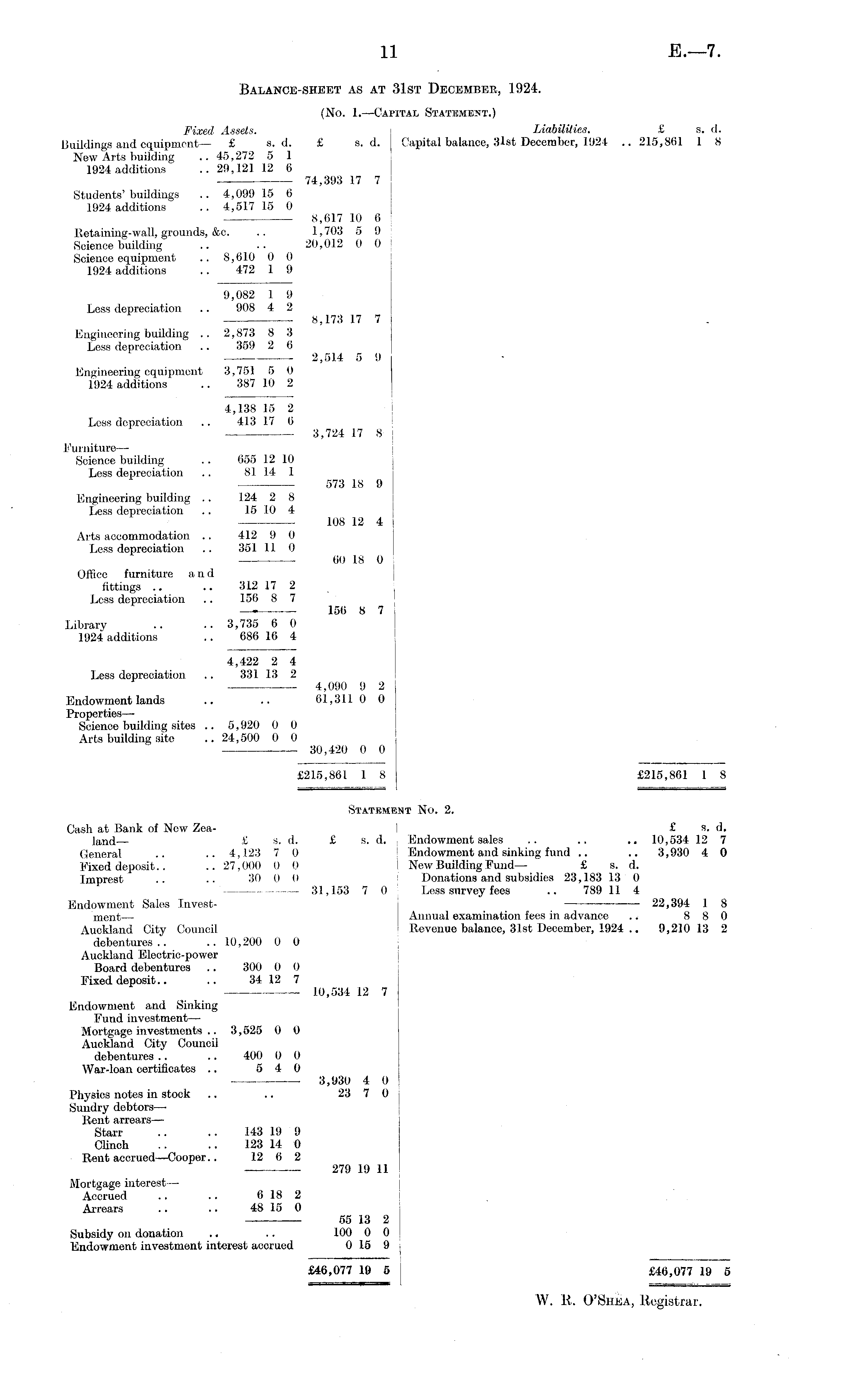 Balance-sheet as at 31st December, 1924. (No. I.—Capital Statement.) Fixed- Assets. Liabilities. £ s. d. Buildings and equipment— £ s. d. £ s. d. Capital balance, 3lst December, 1924 .. 215,861 1 8 New Arts building .. 45,272 5 1 1924 additions .. 29,121 12 6 — 74,393 17 7 Students' buildings .. 4,099 15 6 1924 additions .. 4,517 15 0 8,617 10 6 ltetaining-wall, grounds, &c. .. 1,703 5 9 Science building .. •• 20,012 0 0 Science equipment .. 8,610 0 0 1924 additions .. 472 1 9 9,082 1 9 Less depreciation .. 908 4 2 8,173 17 7 Engineering building .. 2,873 8 3 Less depreciation .. 359 2 6 2,514 5 9 Engineering equipment 3,751 5 0 1924 additions .. 387 10 2 4,138 15 2 Less depreciation .. 413 17 6 3,724 17 8 Eurniture— Science building .. 655 12 10 Less depreciation .. 81 14 1 573 18 9 Engineering building .. 124 2 8 Less depreciation .. 15 10 4 108 12 4 Arts accommodation .. 412 9 0 Less depreciation .. 351 11 0 60 is o ; Office furniture and fittings .. .. 312 17 2 Less depreciation .. 156 8 7 — 156 8 7 i Library .. .. 3,735 6 0 1924 additions .. 686 16 4 4,422 2 4 Less depreciation .. 331 13 2 4,090 9 2 Endowment lands .. .. 61,31100 PropertiesScience building sites .. 5,920 0 0 Arts building site .. 24,500 0 0 30,420 0 0 £215,861 1 8 £215,861 1 8 Statement No. 2. Cash at Bank of New Zea- ] £ s. d. land— £ s. d. £ s. d. Endowment sales .. .. .. 10,534 12 7 General .. .. 4,123 7 0 ! Endowment and sinking fund .. .. 3,930 4 0 Eixed deposit.. .. 27,000 0 0 New Building Eund — £ s. d. Imprest .. .. 30 0 0 Donations and subsidies 23,183 13 0 31,153 7 0 Less survey fees .. 789 11 4 Endowment Sales Invest- 22,394 1 8 ment—■ i Annual examination fees in advance .. 8 8 0 Auckland City Council Revenue balance, 31st December, 1924 .. 9,210 13 2 debentures.. .. 10,200 0 0 Auckland Electric-power Board debentures .. 300 0 0 Eixed deposit.. .. 34 12 7 10,534 12 7 Endowment and Sinking Eund investment —- Mortgage investments .. 3,525 0 0 Auckland City Council debentures .. .. 400 0 0 War-loan certificates .. 5 4 0 — 3,930 4 0 Physics notes in stock .. .. 23 7 0 Sundry debtors—Rent arrears— Starr .. .. 143 19 9 Clinoh .. .. 123 14 0 Rent accrued—Cooper.. 12 6 2 279 19 11 Mortgage interest — Accrued .. .. 6 18 2 Arrears .. .. 48 15 0 55 13 2 Subsidy on donation .. .. 100 0 0 Endowment investment interest accrued 0 15 9 £46,077 19 5 £46,077 19 5 W. It. O'Shea, Registrar.