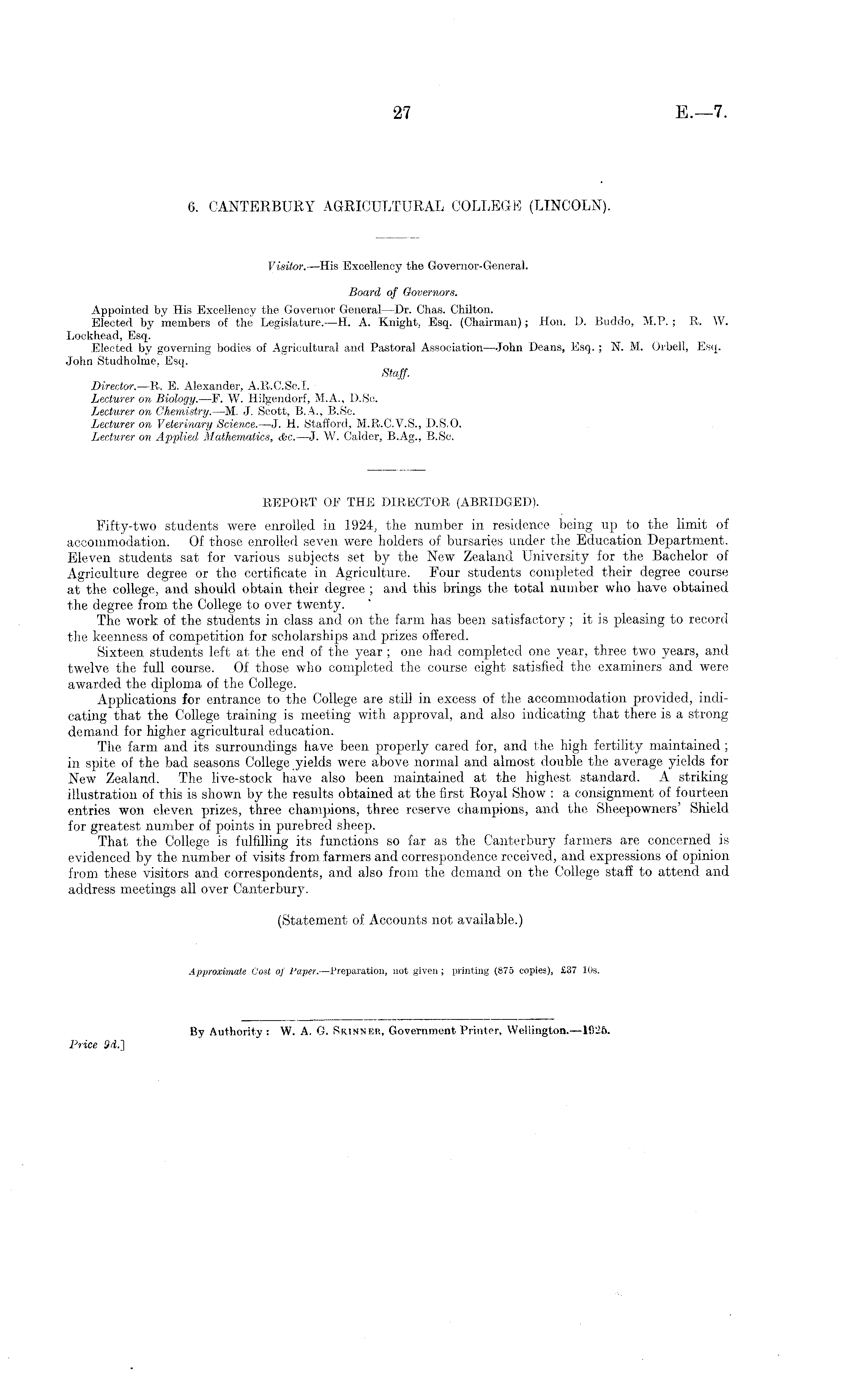 6. CANTERBURY AGRICULTURAL COLLEGE (LINCOLN). Visitor. —His Excellency the Governor-General. Board of Governors. Appointed by His Excellency the Governor General—Dr. Chas. Chilton. Elected by members of the Legislature.—H. A. Knight. Esq. (Chairman); Hon. D. Buddo, M.P. ; R. W. Lockhead, Esq. Elected by governing bodies of Agricultural and Pastoral Association—John Deans, Esq. ; N. M. Orbell, Esq. John Studholme, Esq. Staff. Director.—R. E. Alexander, A.R.C.Sc.I. Lecturer on Biology.—F. W. Hilgendorf, M.A., D.Sc. Lecturer on Chemistry.—M. J. Scott, 8.A., R.Sc. Lecturer on Veterinary Science. —J. H. Stafford, M.R.C.V.S., D.S.O. Lecturer on Applied Mathematics, &c. —J. W. Calder, B.Ag., B.Sc. REPORT OF THE DIRECTOR (ABRIDGED). Fifty-two students were enrolled in 1924, the number in residence being up to the limit of accommodation. Of those enrolled seven were holders of bursaries under the Education Department. Eleven students sat for various subjects set by the New Zealand University for the Bachelor of Agriculture degree or the certificate in Agriculture. Four students completed their degree course at the college, and should obtain their degree ; and this brings the total number who have obtained the degree from the College to over twenty. The work of the students in class and on the farm has been satisfactory; it is pleasing to record the keenness of competition for scholarships and prizes offered. Sixteen students left at the end of the year ; one had completed one year, three two years, and twelve the full course. Of those who completed the course eight satisfied the examiners and were awarded the diploma of the College. Applications for entrance to the College are still in excess of the accommodation provided, indicating that the College training is meeting with approval, and also indicating that there is a strong demand for higher agricultural education. The farm and its surroundings have been properly cared for, and the high fertility maintained ; in spite of the bad seasons College yields were above normal and almost double the average yields for New Zealand. The live-stock have also been maintained at the highest standard. A striking illustration of this is shown by the results obtained at the first Royal Show : a consignment of fourteen entries won eleven prizes, three champions, three reserve champions, and the Sheepowners' Shield for greatest number of points in purebred sheep. That the College is fulfilling its functions so far as the Canterbury farmers are concerned is evidenced by the number of visits from farmers and correspondence received, and expressions of opinion from these visitors and correspondents, and also from the demand on the College staff to attend and address meetings all over Canterbury. (Statement of Accounts not available.)