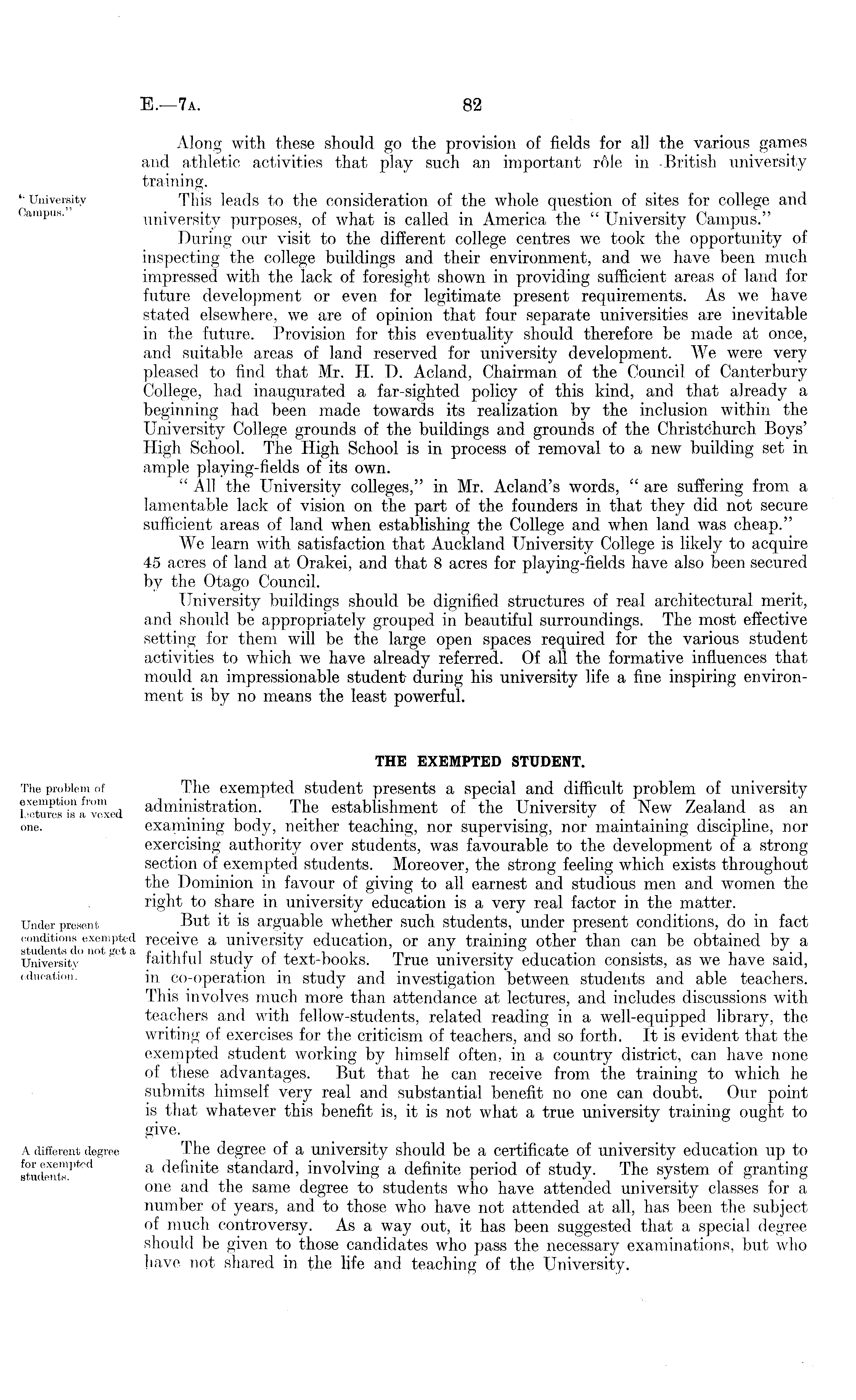 Along with these should go the provision of fields for all the various games and athletic activities that play such an important role in British university training. This leads to the consideration of the whole question of sites for college and university purposes, of what is called in America the " University Campus." During our visit to the different college centres we took the opportunity of inspecting the college buildings and their environment, and we have been much impressed with the lack of foresight shown in providing sufficient areas of land for future development or even for legitimate present requirements. As we have stated elsewhere, we are of opinion that four separate universities are inevitable in the future. Provision for this eventuality should therefore be made at once, and suitable areas of land reserved for university development. We were very pleased to find that Mr. H. D. Acland, Chairman of the Council of Canterbury College, had inaugurated a far-sighted policy of this kind, and that already a beginning had been made towards its realization by the inclusion within the University College grounds of the buildings and grounds of the Christchurch Boys' High School. The High School is in process of removal to a new building set in ample playing-fields of its own. " All the University colleges," in Mr. Acland's words, " are suffering from a lamentable lack of vision on the part of the founders in that they did not secure sufficient areas of land when establishing the College and when land was cheap." We learn with satisfaction that Auckland University College is likely to acquire 45 acres of land at Orakei, and that 8 acres for playing-fields have also been secured by the Otago Council. University buildings should be dignified structures of real architectural merit, and should be appropriately grouped in beautiful surroundings. The most effective setting for them will be the large open spaces required for the various student activities to which we have already referred. Of all the formative influences that mould an impressionable student during his university life a fine inspiring environment is by no means the least powerful. THE EXEMPTED STUDENT. The exempted student presents a special and difficult problem of university administration. The establishment of the University of New Zealand as an examining body, neither teaching, nor supervising, nor maintaining discipline, nor exercising authority over students, was favourable to the development of a strong section of exempted students. Moreover, the strong feeling which exists throughout the Dominion in favour of giving to all earnest and studious men and women the right to share in university education is a very real factor in the matter. But it is arguable whether such students, under present conditions, do in fact receive a university education, or any training other than can be obtained by a faithful study of text-books. True university education consists, as we have said, in co-operation in study and investigation between students and able teachers. This involves much more than attendance at lectures, and includes discussions with teachers and with fellow-students, related reading in a well-equipped library, the writing of exercises for the criticism of teachers, and so forth. It is evident that the exempted student working by himself often, in a country district, can have none of these advantages. But that he can receive from the training to which he submits himself very real and substantial benefit no one can doubt. Our point is that whatever this benefit is, it is not what a true university training ought to give. The degree of a university should be a certificate of university education up to a definite standard, involving a definite period of study. The system of granting one and the same degree to students who have attended university classes for a number of years, and to those who have not attended at all, has been the subject of much controversy. As a way out, it has been suggested that a special degree should be given to those candidates who pass the necessary examinations, but who have not shared in the life and teaching of the University.