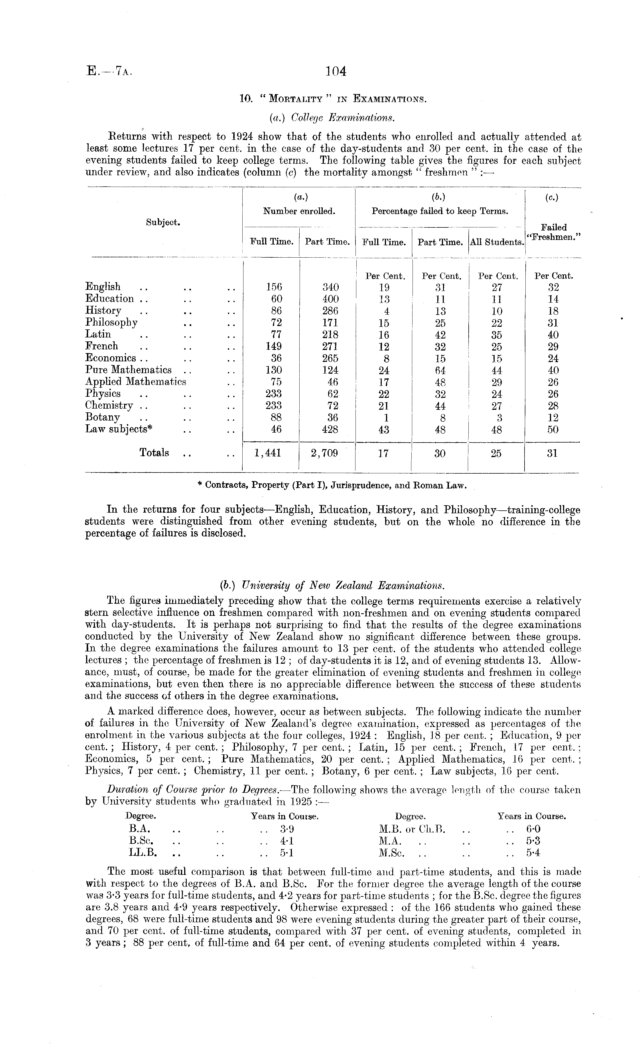 In the returns for four subjects—English, Education, History, and Philosophy —training-college students were distinguished from other evening students, but on the whole no difference in the percentage of failures is disclosed, (b.) University of New Zealand Examinations. The figures immediately preceding show that the college terms requirements exercise a relatively Stern selective influence on freshmen compared with non-freshmen and on evening students compared with day-students. It is perhaps not surprising to find that the results of the degree examinations conducted by the University of New Zealand show no significant difference between these groups. In the degree examinations the failures amount to 13 per cent, of the students who attended college lectures ; the percentage of freshmen is 12 ; of day-students it is 12, and of evening students 13. Allowance, must, of course, be made for the greater elimination of evening students and freshmen in college examinations, but even then there is no appreciable difference between the success of these students and the success of others in the degree examinations. A marked difference does, however, occur as between subjects. The following indicate the number of failures in the University of New Zealand's degree examination, expressed as percentages of the enrolment in the various subjects at the four colleges, 1924 : English, 18 per cent. ; Education, 9 per cent.; History, 4 per cent.; Philosophy, 7 percent.; Latin, 15 per cent.; French, 17 per cent.; Economics, 5 per cent. ; Pure Mathematics, 20 per cent. ; Applied Mathematics, 16 per cent. ; Physics, 7 per cent. ; Chemistry, 11 per cent. ; Botany, 6 per cent. ; Law subjects, 16 per cent. Duration of Course prior to Degrees.—The following shows the average length of the course taken by University students who graduated in 1925 : — Degree. Years in Course. Degree. Years in Course. B.A. .. .. .. 3'9 M.B. or Ch.B. .. .. 6-0 B.Sc 4-1 MA 5-3 LL.B. .. .. .. 5-1 M.Sc. .. .. .. 5-4 The most useful comparison is that between full-time and part-time students, and this is made with respect to the degrees of B.A. and B.Sc. For the former degree the average length of the course was 3-3 years for full-time students, and 4-2 years for part-time students ; for the B.Sc. degree the figures are 3.8 years and 4-9 years respectively. Otherwise expressed : of the 166 students who gained these degrees, 68 were full-time students and 98 were evening students during the greater part of their course, and 70 per cent, of full-time students, compared with 37 per cent, of evening students, completed in 3 years; 88 per cent, of full-time and 64 per cent, of evening students completed within 4 years.