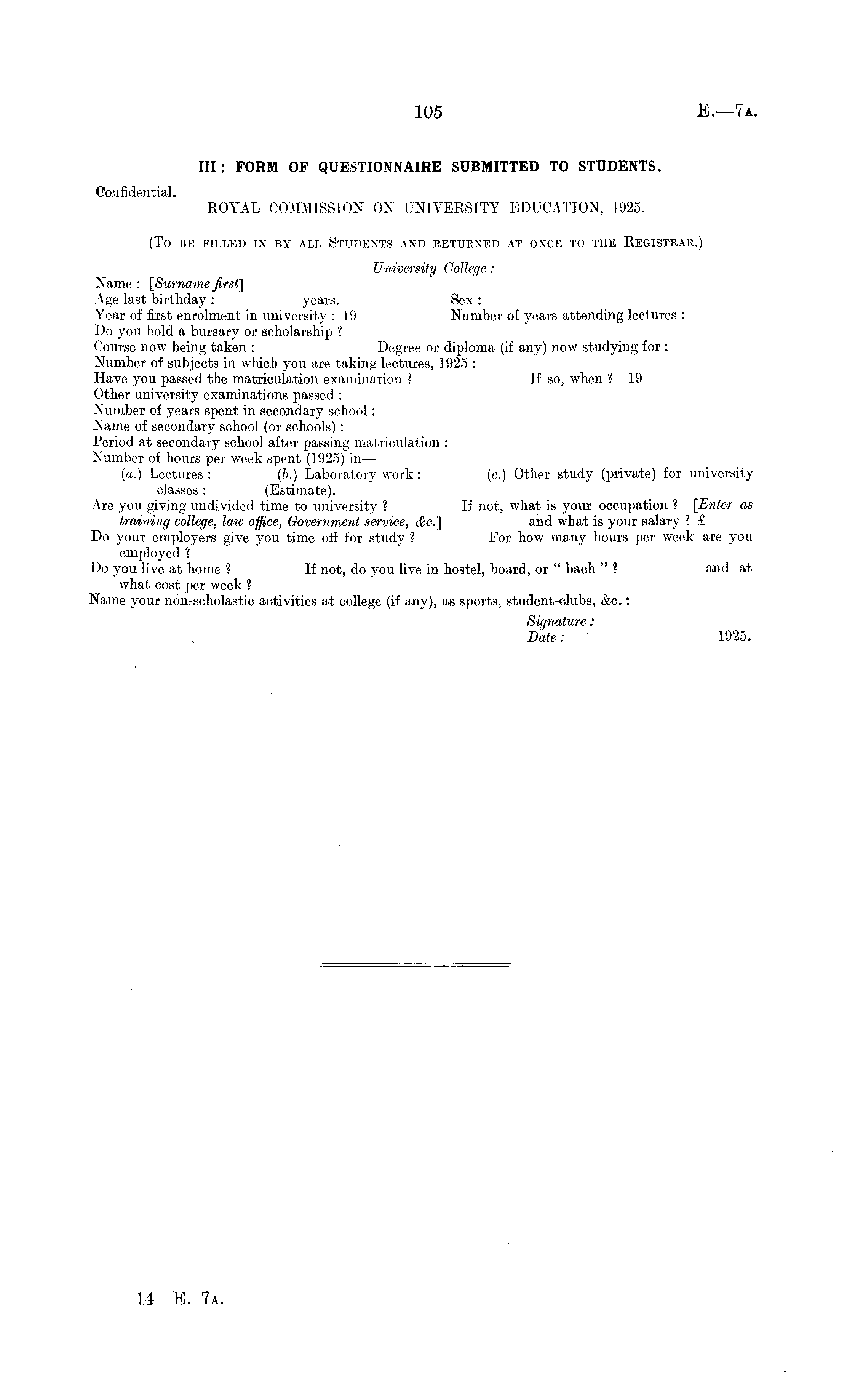 Ill: FORM OF QUESTIONNAIRE SUBMITTED TO STUDENTS. Confidential. ROYAL COMMISSION ON UNIVERSITY EDUCATION, 1925. (To BE FILLED IN BY ALL STUDENTS ATJD RETURNED AT ONCE TO THE REGISTRAR.) University College: Name : [Surname first] Age last birthday : years. Sex : Year of first enrolment in university : 19 Number of years attending lectures : Do you hold a bursary or scholarship ? Course now being taken : Degree or diploma (if any) now studying for : Number of subjects in which you are taking lectures, 1925 : Have you passed the matriculation examination 1 If so, when ? 19 Other university examinations passed : Number of years spent in secondary school : Name of secondary school (or schools): Period at secondary school after passing matriculation : Number of hours per week spent (1925) in— (a.) Lectures : (b.) Laboratory work : (c.) Other study (private) for university classes: (Estimate). Are you giving undivided time to university ? If not, what is your occupation ? [Enter as training college, law office, Government service, cfee.] and what is your salary ? £ Do your employers give you time off for study ? For how many hours per week are you employed ? Do you live at home ? If not, do you live in hostel, board, or " bach " ? and at what cost per week ? Name your non-scholastic activities at college (if any), as sports, student-clubs, &c.: Signature: Date: 1925.