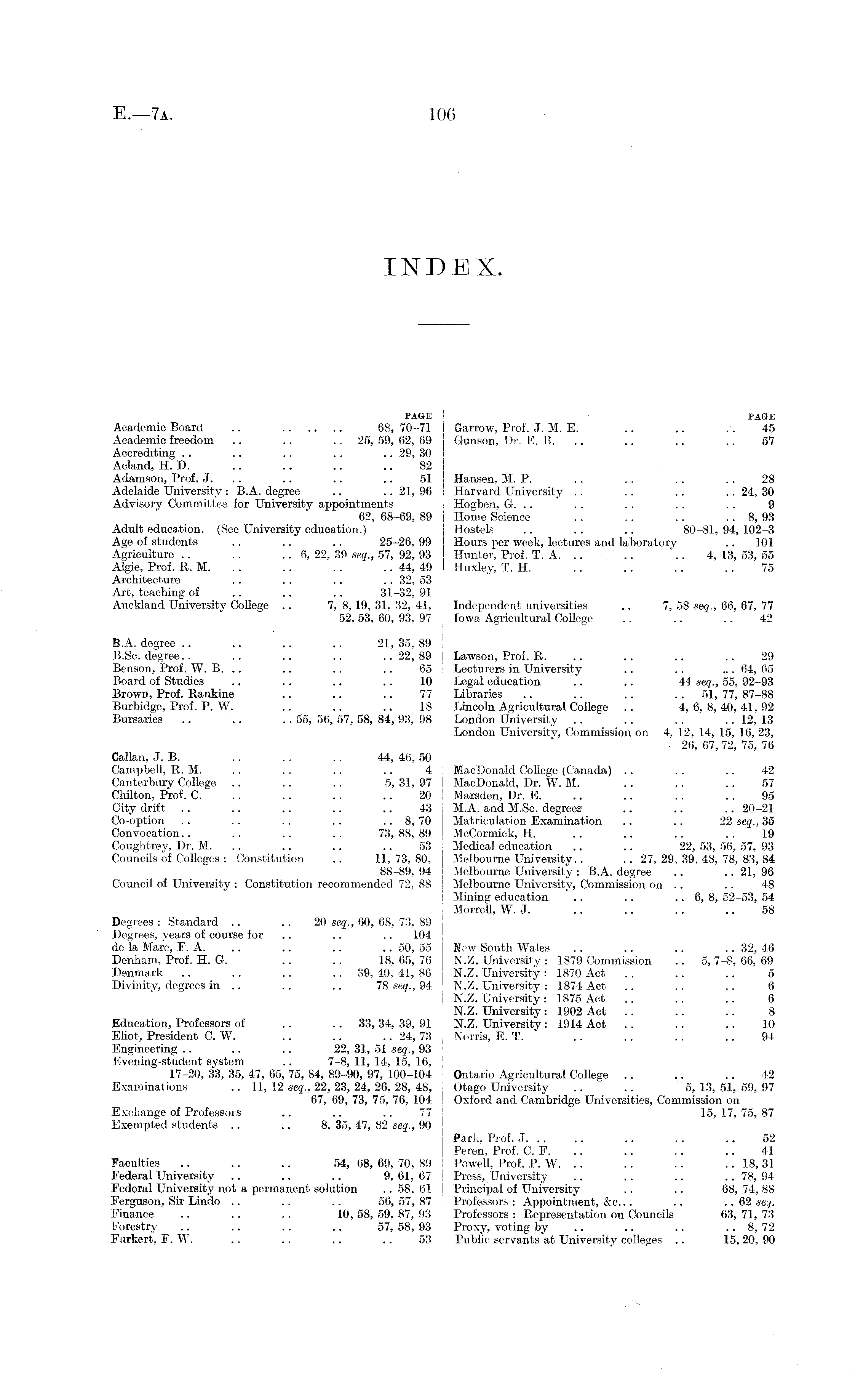 PAGE ! PAGE Academic Board .. 08, 70-71 Garrow, Prof. J. M. E. .. .. .. 45 Academic freedom .. . . 25, 59, 02, 09 I Gunson, Dr. E. B. .. .. .. 57 Accrediting .. .. .. .. .. 29, 30 Acland, H. D. .. .. .. .. 82 Adamson, Prof. J. .. .. .. 51 Hansen, M. P. .. .. . . .. 28 Adelaide University : B.A. degree .. .. 21, 96 Harvard University . . .. .. .. 24, 30 Advisory Committee for University appointments Hogben, G. .. . . . . . . .. 9 62, 68-69, 89 Home Science .. .. .. .. 8, 93 Adult education. (See University education.) Hostels .. .. .. 80-81, 94, 102-3 Age of students .. .. . . 25-26, 99 Hours per week, lectures and laboratory .. 101 Agriculture .. .. .. 6, 22, 39 seq., 57, 92, 93 Hunter, Prof. T. A. .. .. .. 4, 13, 53, 55 Algie, Prof. R. M. . . .. . . .. 44, 49 Huxley, T. H. .. .. .. . . 75 Architecture .. .. .. .. 32, 53 Art, teaching of .. .. .. 31-32, 91 Auckland University College .. 7, 8,19, 31, 32, 41, Independent universities .. 7, 58 seq., 66, 67, 77 52,53, 60, 93, 97 Iowa : Agricultural College .. .. .. 42 B.A. degree .. .. .. .. 21,35,89 B.Sc. degree.. .. .. .. ..22,89 Lawson, Prof. R. .. .. .. .. 29 Benson, Prof. W. B. .. .. .. .. 65 Lecturers in University .. .. ... 64, 65 Board of Studies .. .. .. .. 10 Legal education .. .. 44 seq., 55, 92-93 Brown, Prof. Rankine .. .. .. 77 Libraries .. .. .. 51, 77, 87-88 Burbidge, Prof. P. W. .. .. .. 18 Lincoln Agricultural College .. 4,6,8,40,41,92 Bursaries .. .. .. 55, 56, 57, 58, 84, 93, 98 London University .. .. . . .. 12, 13 London University, Commission on 4. 12, 14, 15, 16, 23, • 26, 67, 72, 75, 76 Callan, J. B. .. . . .. 44, 46, 50 Campbell, R. M. .. .. .. .. 4 Mac Donald College (Canada) .. .. .. 42 Canterbury College .. .. .. 5, 31, 97 Mac Donald, Dr. W. M. .. .. .. 57 Chilton, Prof. C. .. .. .. .. 20 Marsden, Dr. E. .. .. .. .. 95 City drift .. .. .. .. .. 43 M.A. and M.Sc. degrees .. .. .. 20-21 Co-option .. .. .. .. .. 8, 70 Matriculation Examination .. .. 22 seq., 35 Convocation.. .. .. .. 73,88,89 McCormick, H. .. .. .. .. 19 Coughtrey, Dr. M. .. .. .. 53 Medical education .. .. 22, 53, 56, 57, 93 Councils of Colleges : Constitution .. 11,73,80, Melbourne University.. .. 27, 29, 39, 48, 78, 83, 84 88-89, 94 Melbourne University: B.A. degree .. .. 21, 96 Council of University : Constitution recommended 72, 88 Melbourne University, Commission on .. .. 48 Mining education .. .. .. 6, 8, 52-53, 54 Morrell, W. J. .. .. .. .. 58 Degrees : Standard .. .. 20 seq., 60, 68, 73, 89 Degrees, years of course for .. .. .. 104 de la Mare, F. A. .. .. .. .. 50, 55 New South Wales .. .. .. .. 32, 46 Denham, Prof. H. G. .. .. 18, 65, 76 N.Z. University : 1879 Commission .. 5, 7-8, 66, 69 Denmark .. .. .. 39, 40, 41, 86 N.Z. University: 1870 Act .. .. .. 5 Divinity, degrees in .. .. .. 78 seq., 94 N.Z. University : 1874 Act .. .. .. 6 N.Z. University : 1875 Act .. .. .. 6 N.Z. University : 1902 Act .. .. .. 8 Education, Professors of .. .. 33, 34,39,91 N.Z. University: 1914 Act .. .. .. 10 Eliot, President C. W. .. .. .. 24, 73 Norris, E. T. .. . . . . .. 94 Engineering .. .. .. 22, 31, 51 seq., 93 Evening-student system .. 7-8, 11, 14, 15, 16, 17-20, 33, 35, 47, 65, 75, 84, 89-90, 97, 100-104 Ontario Agricultural College .. .. .. 42 Examinations .. 11, 12 seq., 22, 23, 24, 26, 28, 48, Otago University .. .. 5,13,51,59,97 67, 69, 73, 75, 76, 104 Oxford and Cambridge Universities, Commission on Exchange of Professors ...... 77 15, 17, 75, 87 Exempted students .. .. 8, 35, 47, 82 seq., 90 Park, Prof. J. .. .. .. .. .. 52 Peren, Prof. C. P. .. .. .. .. 41 Faculties .. .. .. 54, 68, 69, 70, 89 Powell, Prof. P. W. .. .. . . .. 18, 31 Federal University .. .. .. 9,61,67 Press, University .. .. .. ..78,94 Federal University not a permanent solution .. 58, 61 Principal of University .. .. 68, 74, 88 Ferguson, Sir Lindo .. .. .. 56, 57, 87 Professors : Appointment, &c... .. .. 62 seq. Finance .. . . .. 10, 58, 59, 87, 93 Professors : Representation on Councils 63, 71, 73 Forestry .. .. .. .. 57, 58, 93 Proxy, voting by .. .. .. .. 8, 72 Furkert, F. W. .. .. .. .. 53 Public servants at University colleges .. 15,20, 90