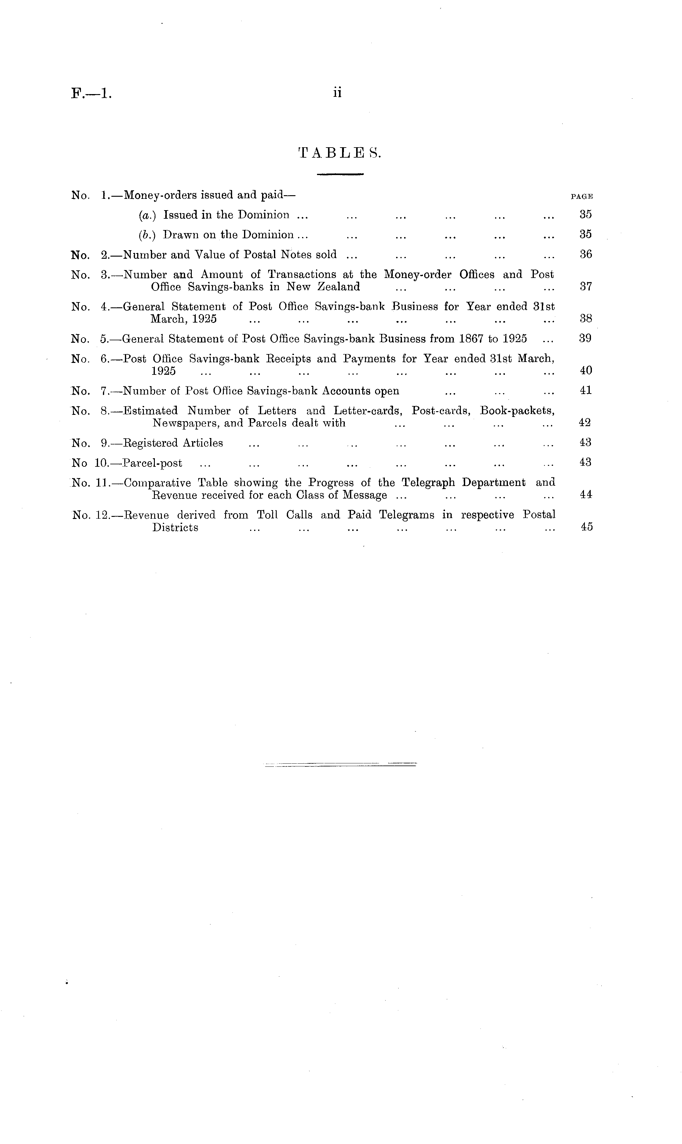 TABLES. No. 1. —Money-orders issued and paid— pagb (a..) Issued in the Dominion ... ... ... ... ... ... 35 (b.) Drawn on the Dominion ... ... ... ... ... ... 35 No. 2.—Number and Value of Postal Notes sold ... ... ... ... ... 36 No. 3.—'Number and Amount of Transactions at the Money-order Offices and Post Office Savings-banks in New Zealand ... ... ... ... 37 No. 4.—General Statement of Post Office Savings-bank Business for Year ended 31st March, 1925 ... ... ... ... ... ... ... 38 No. 5. —-General Statement of Post Office Savings-bank Business from 1867 to 1925 ... 39 No. 6.—Post Office Savings-bank Receipts and Payments for Year ended 31st March, 1925 ... ... ... ...' ... ... ... ... 40 No. 7.—Number of Post Office Savings-bank Accounts open ... ... ... 41 No. 8. —Estimated Number of Letters and Letter-cards, Post-cards, Book-packets, Newspapers, and Parcels dealt with ... ... ... ... 42 No. 9.—Registered Articles ... ... .. ... ... ... ... 43 No 10.—Parcel-post ... ... ... ... ... ... ... ... 43 No. 11 .—Comparative Table showing the Progress of the Telegraph Department and Revenue received for each Class of Message ... ... ... ... 44 No. 12.—Revenue derived from Toll Calls and Paid Telegrams in respective Postal Districts ... ... ... ... ... ... ... 45