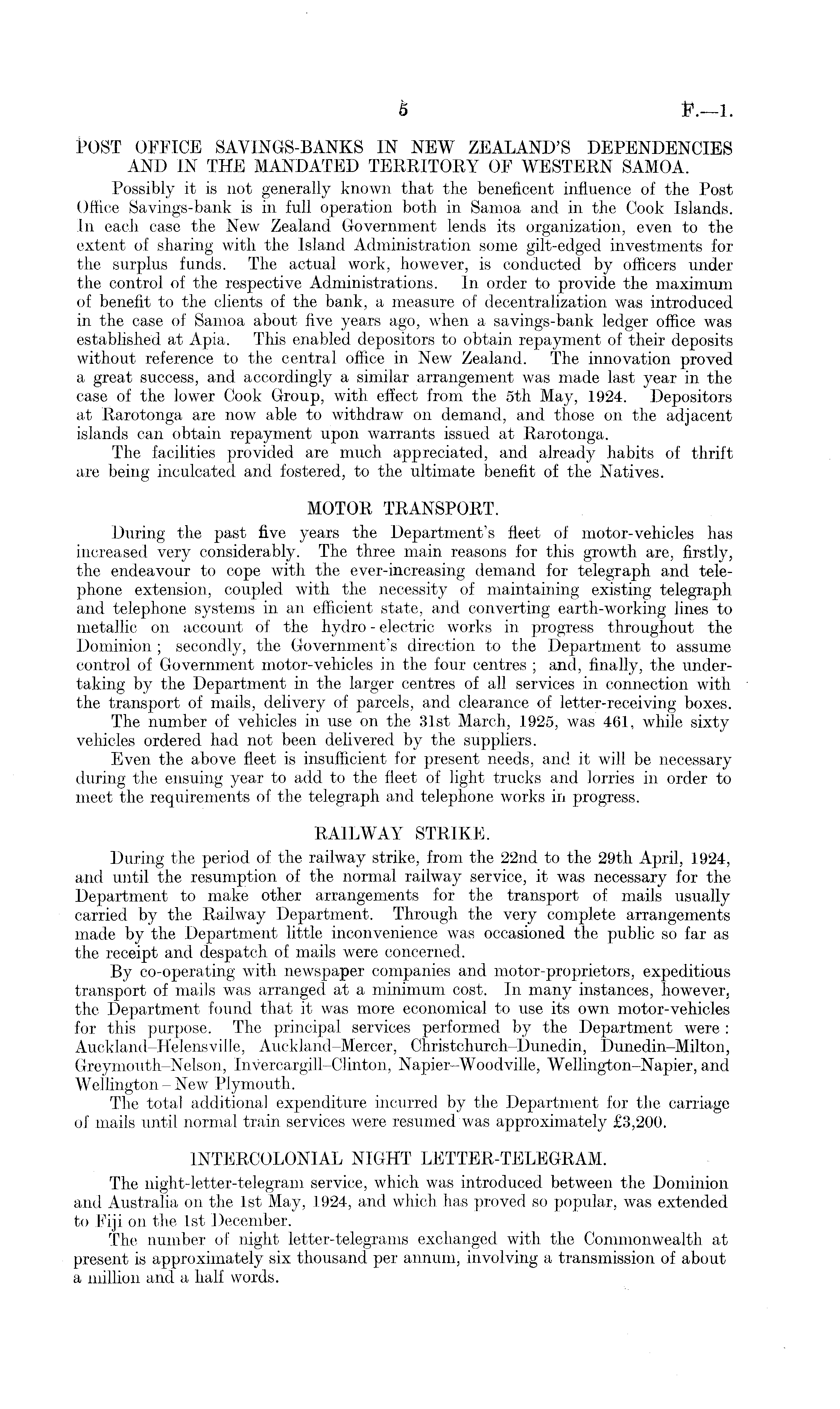 POST OFFICE SAVINGS-BANKS IN NEW ZEALAND'S DEPENDENCIES AND IN THE MANDATED TERRITORY OF WESTERN SAMOA. Possibly it is not generally known that the beneficent influence of the Post Office Savings-bank is in full operation both in Samoa and in the Cook Islands. In each case the New Zealand Government lends its organization, even to the extent of sharing with the Island Administration some gilt-edged investments for the surplus funds. The actual work, however, is conducted by officers under the control of the respective Administrations. In order to provide the maximum of benefit to the clients of the bank, a measure of decentralization was introduced in the case of Samoa about five years ago, when a savings-bank ledger office was established at Apia. This enabled depositors to obtain repayment of their deposits without reference to the central office in New Zealand. The innovation proved a great success, and accordingly a similar arrangement was made last year in the case of the lower Cook Group, with effect from the sth May, 1924. Depositors at Rarotonga are now able to withdraw on demand, and those on the adjacent islands can obtain repayment upon warrants issued at Rarotonga. The facilities provided are much appreciated, and already habits of thrift are being inculcated and fostered, to the ultimate benefit of the Natives. MOTOR TRANSPORT. During the past five years the Department's fleet of motor-vehicles has increased very considerably. The three main reasons for this growth are, firstly, the endeavour to cope with the ever-increasing demand for telegraph and telephone extension, coupled with the necessity of maintaining existing telegraph and telephone systems in an efficient state, and converting earth-working lines to metallic on account of the hydro - electric works in progress throughout the Dominion ; secondly, the Government's direction to the Department to assume control of Government motor-vehicles in the four centres ; and, finally, the undertaking by the Department in the larger centres of all services in connection with the transport of mails, delivery of parcels, and clearance of letter-receiving boxes. The number of vehicles in use on the 31st March, 1925, was 461, while sixty vehicles ordered had not been delivered by the suppliers. Even the above fleet is insufficient for present needs, and it will be necessary during the ensuing year to add to the fleet of light trucks and lorries in order to meet the requirements of the telegraph and telephone works in progress. RAILWAY STRIKE. During the period of the railway strike, from the 22nd to the 29th April, 1924, and until the resumption of the normal railway service, it was necessary for the Department to make other arrangements for the transport of mails usually carried by the Railway Department. Through the very complete arrangements made by the Department little inconvenience was occasioned the public so far as the receipt and despatch of mails were concerned. By co-operating with newspaper companies and motor-proprietors, expeditious transport of mails was arranged at a minimum cost. In many instances, however, the Department found that it was more economical to use its own motor-vehicles for this purpose. The principal services performed by the Department were : Auck land-He] ensvi 11 e, Auckland-Mercer, Christchurch-Dunedin, Dunedin-Milton, Greymouth-Nelson, Invercargill-Clinton, Napier-Woodville, Wellington-Napier, and Wellington - New Plymouth. The total additional expenditure incurred by the Department for the carriage of mails until normal train services were resumed was approximately £3,200. INTERCOLONIAL NIGHT LETTER-TELEGRAM. The night-letter-telegram service, which was introduced between the Dominion and Australia on the Ist May, 1924, and which has proved so popular, was extended to Fiji on the Ist December. The number of night letter-telegrams exchanged with the Commonwealth at present is approximately six thousand per annum, involving a transmission of about a million and a half words.