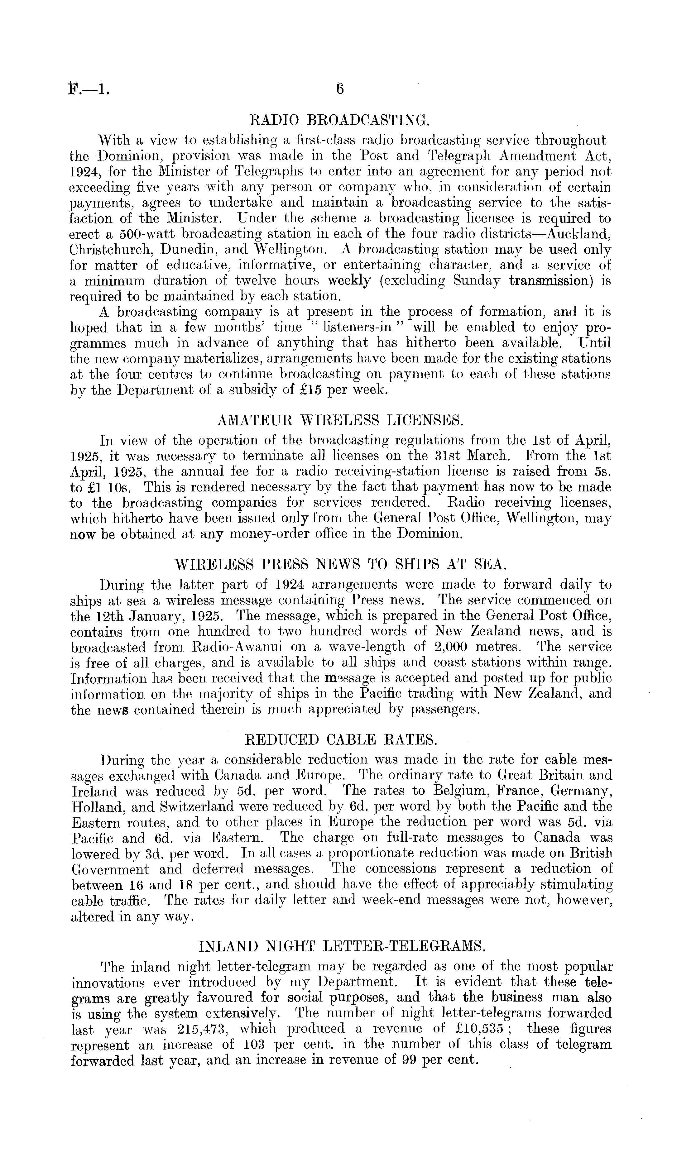 RADIO BROADCASTING. With a view to establishing a first-class radio broadcasting service throughout the Dominion, provision was made in the Post and Telegraph Amendment Act, 1924, for the Minister of Telegraphs to enter into an agreement for any period not exceeding five years with any person or company who, in consideration of certain, payments, agrees to undertake and maintain a broadcasting service to the satisfaction of the Minister. Under the scheme a broadcasting licensee is required to erect a 500-watt broadcasting station in each of the four radio districts —Auckland, Christchurch, Dunedin, and Wellington. A broadcasting station may be used only for matter of educative, informative, or entertaining character, and a service of a minimum duration of twelve hours weekly (excluding Sunday transmission) is required to be maintained by each station. A broadcasting company is at present in the process of formation, and it is hoped that in a few months' time " listeners-in " will be enabled to enjoy programmes much in advance of anything that has hitherto been available. Until the new company materializes, arrangements have been made for the existing stations at the four centres to continue broadcasting on payment to each of these stations by the Department of a subsidy of £15 per week. AMATEUR WIRELESS LICENSES. In view of the operation of the broadcasting regulations from the Ist of April, 1925, it was necessary to terminate all licenses on the 31st March. From the Ist April, 1925, the annual fee for a radio receiving-station license is raised from ss. to £l 10s. This is rendered necessary by the fact that payment has now to be made to the broadcasting companies for services rendered. Radio receiving licenses, which hitherto have been issued only from the General Post Office, Wellington, may now be obtained at any money-order office in the Dominion. WIRELESS PRESS NEWS TO SHIPS AT SEA. During the latter part of 1924 arrangements were made to forward daily to ships at sea a wireless message containing Press news. The service commenced on the 12th January, 1925. The message, which is prepared in the General Post Office, contains from one hundred to two hundred words of New Zealand news, and is broadcasted from Radio-Awanui on a wave-length of 2,000 metres. The service is free of all charges, and is available to all ships and coast stations within range. Information has been received that the message is accepted and posted up for public information on the majority of ships in the Pacific trading with New Zealand, and the news contained therein is much appreciated by passengers. REDUCED CABLE RATES. During the year a considerable reduction was made in the rate for cable messages exchanged with Canada and Europe. The ordinary rate to Great Britain and Ireland was reduced by sd. per word. The rates to Belgium, France, Germany, Holland, and Switzerland were reduced by 6d. per word by both the Pacific and the Eastern routes, and to other places in Europe the reduction per word was sd. via Pacific and 6d. via Eastern. The charge on full-rate messages to Canada was lowered by 3d. per word. In all cases a proportionate reduction was made on British Government and deferred messages. The concessions represent a reduction of between 16 and 18 per cent., and should have the effect of appreciably stimulatingcable traffic. The rates for daily letter and week-end messages were not, however, altered in any way. INLAND NIGHT LETTER-TELEGRAMS. The inland night letter-telegram may be regarded as one of the most popular innovations ever introduced by my Department. It is evident that these telegrams are greatly favoured for social purposes, and that the business man also is using the system extensively. The number of night letter-telegrams forwarded last year was 215,473, which produced a revenue of £10,535 ; these figures represent an increase of 103 per cent, in the number of this class of telegram forwarded last year, and an increase in revenue of 99 per cent.