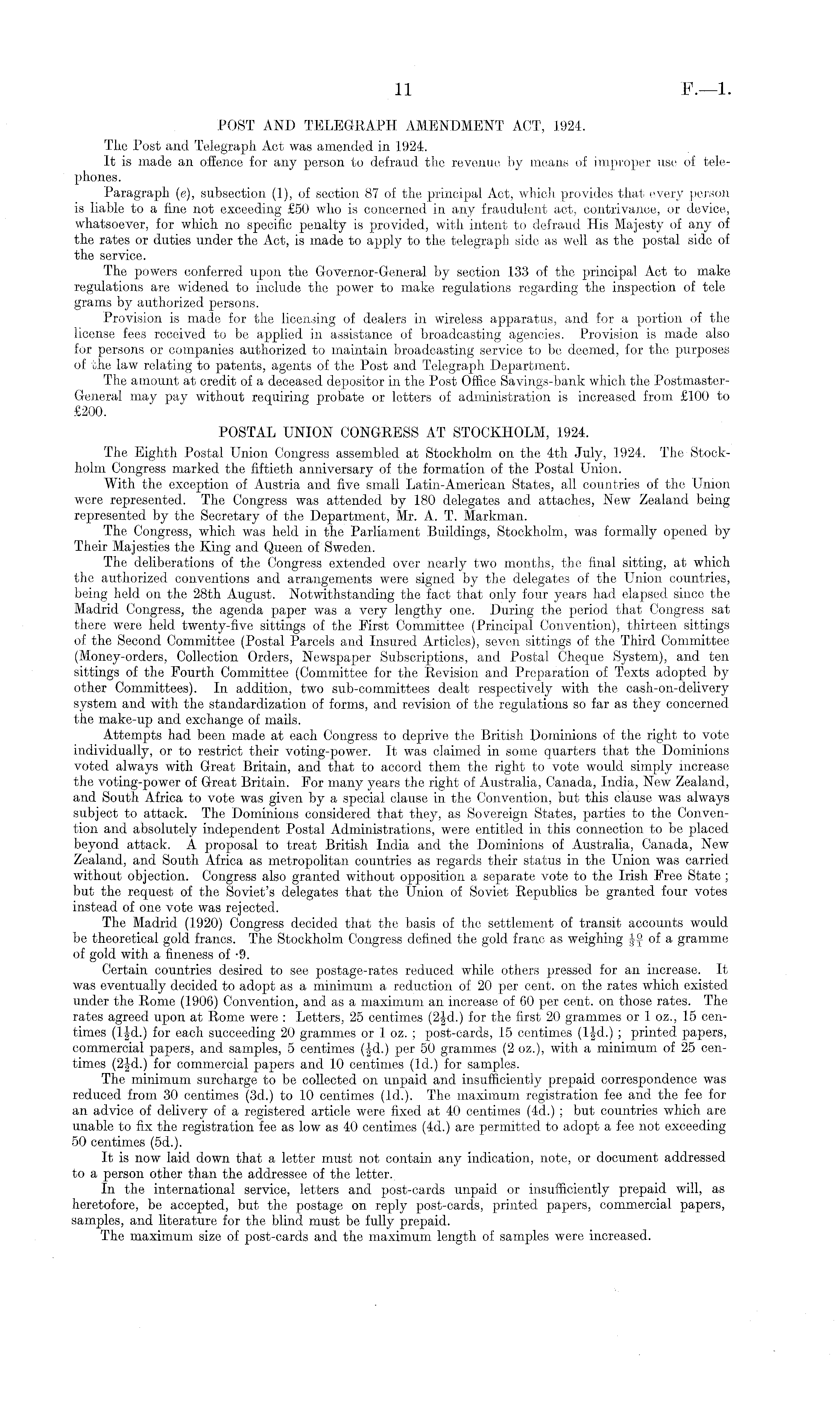 POST AND TELEGRAPH AMENDMENT ACT, 1924. The Post and Telegraph Act was amended in 1924. It is made an offence lor any person to defraud the revenue by means of improper use of telephones. Paragraph (e), subsection (1), of section 87 of the principal Act, which provides that every person is liable to a fine not exceeding £50 who is concerned in any fraudulent act, contrivance, or device, whatsoever, for which no specific penalty is provided, with intent to defraud His Majesty of any of the rates or duties under the Act, is made to apply to the telegraph side as well as the postal side of the service. The powers conferred upon the Governor-General by section 133 of the principal Act to make regulations are widened to include the power to make regulations regarding the inspection of tele grams by authorized persons. Provision is made for the licensing of dealers in wireless apparatus, and for a portion of the license fees received to be applied in assistance of broadcasting agencies. Provision is made also for persons or companies authorized to maintain broadcasting service to be deemed, for the purposes of the law relating to patents, agents of the Post and Telegraph Department. The amount at credit of a deceased depositor in the Post Office Savings-bank which the PostmasterGeneral may pay without requiring probate or letters of administration is increased from £100 to £200. POSTAL UNION CONGRESS AT STOCKHOLM, 1924. The Eighth Postal Union Congress assembled at Stockholm on the 4tli July, 1924. The Stockholm Congress marked the fiftieth anniversary of the formation of the Postaf Union. With the exception of Austria and five small Latin-American States, all countries of the Union were represented. The Congress was attended by 180 delegates and attaches, New Zealand being represented by the Secretary of the Department, Mr. A. T. Markman. The Congress, which was held in the Parliament Buildings, Stockholm, was formally opened by Their Majesties the King and Queen of Sweden. The deliberations of the Congress extended over nearly two months, the final sitting, at which the authorized conventions and arrangements were signed by the delegates of the Union countries, being held on the 28th August. Notwithstanding the fact that only four years had elapsed since the Madrid Congress, the agenda paper was a very lengthy one. During the period that Congress sat there were held twenty-five sittings of the Eirst Committee (Principal Convention), thirteen sittings of the Second Committee (Postal Parcels and Insured Articles), seven sittings of the Third Committee (Money-orders, Collection Orders, Newspaper Subscriptions, and Postal Cheque System), and ten sittings of the Fourth Committee (Committee for the Revision and Preparation of Texts adopted by other Committees). In addition, two sub-committees dealt respectively with the cash-on-delivery system and with the standardization of forms, and revision of the regulations so far as they concerned the make-up and exchange of mails. Attempts had been made at each Congress to deprive the British Dominions of the right to vote individually, or to restrict their voting-power. It was claimed in some quarters that the Dominions voted always with Great Britain, and that to accord them the right to vote would simply increase the voting-power of Great Britain. For many years the right of Australia, Canada, India, New Zealand, and South Africa to vote was given by a special clause in the Convention, but this clause was always subject to attack. The Dominions considered that they, as Sovereign States, parties to the Convention and absolutely independent Postal Administrations, were entitled in this connection to be placed beyond attack. A proposal to treat British India and the Dominions of Australia, Canada, New Zealand, and South Africa as metropolitan countries as regards their status in the Union was carried without objection. Congress also granted without opposition a separate vote to the Irish Free State ; but the request of the Soviet's delegates that the Union of Soviet Republics be granted four votes instead of one vote was rejected. The Madrid (1920) Congress decided that the basis of the settlement of transit accounts would be theoretical gold francs. The Stockholm Congress defined the gold franc as weighing if. of a gramme of gold with a fineness of -9. Certain countries desired to see postage-rates reduced while others pressed for an increase. It was eventually decided to adopt as a minimum a reduction of 20 per cent, on the rates which existed under the Rome (1906) Convention, and as a maximum an increase of 60 per cent, on those rates. The rates agreed upon at Rome were : Letters, 25 centimes (2|d.) for the first 20 grammes or 1 oz., 15 centimes (l|d.) for each succeeding 20 grammes or 1 oz. ; post-cards, 15 centimes (ljd.) ; printed papers, commercial papers, and samples, 5 centimes (Jd.) per 50 grammes (2 oz.), with a minimum of 25 centimes (2Jd.) for commercial papers and 10 centimes (Id.) for samples. The minimum surcharge to be collected on unpaid and insufficiently prepaid correspondence was reduced from 30 centimes (3d.) to 10 centimes (Id.). The maximum registration fee and the fee for an advice of delivery of a registered article were fixed at 40 centimes (4d.) ; but countries which are unable to fix the registration fee as low as 40 centimes (4d.) are permitted to adopt a fee not exceeding 50 centimes (5d.). It is now laid down that a letter must not contain any indication, note, or document addressed to a person other than the addressee of the letter. In the international service, letters and post-cards unpaid or insufficiently prepaid will, as heretofore, be accepted, but the postage on reply post-cards, printed papers, commercial papers, samples, and literature for the blind must be fully prepaid. The maximum size of post-cards and the maximum length of samples were increased.