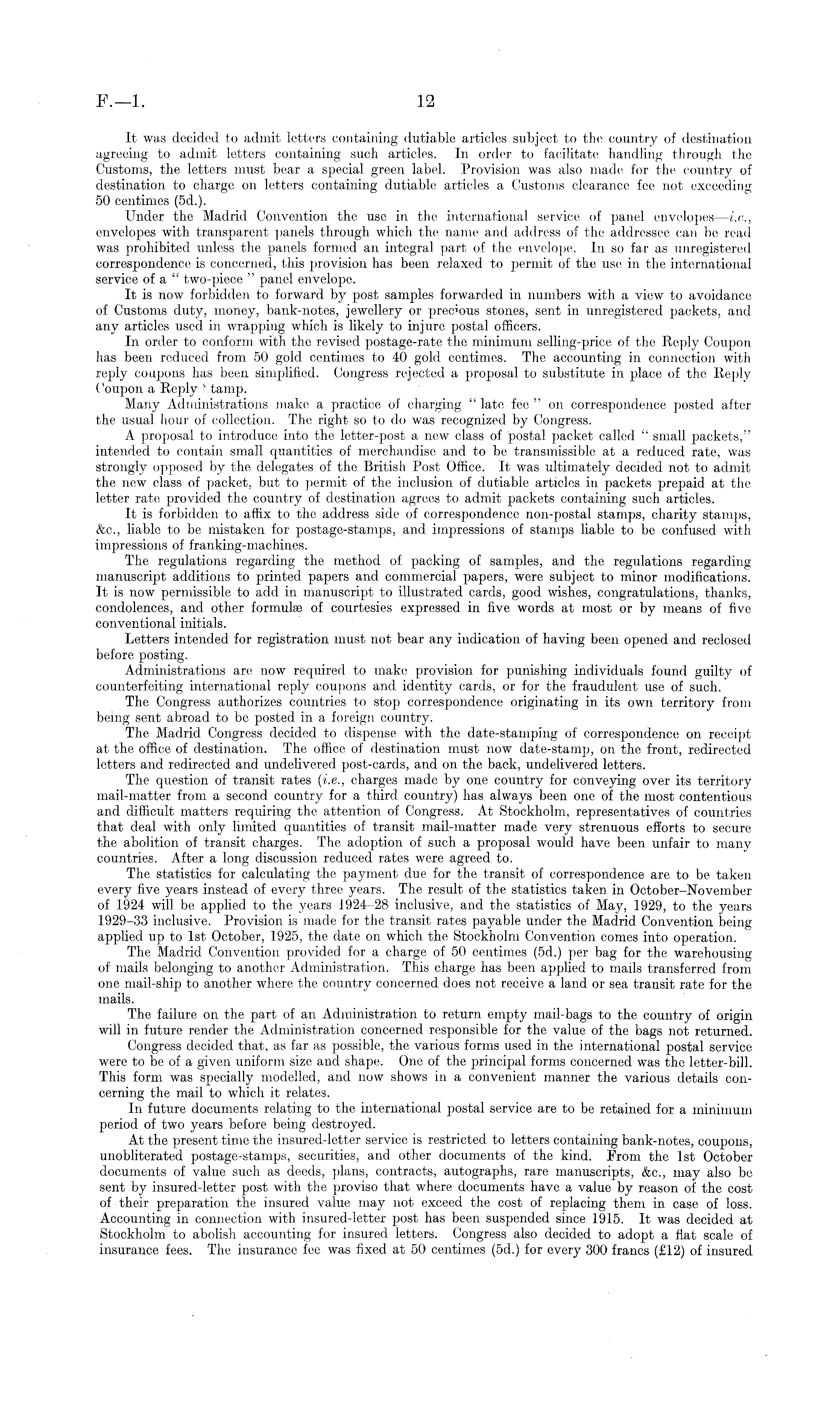It was decided to admit letters containing dutiable articles subject to the country of destination agreeing to admit letters containing such articles. In order to facilitate handling through the Customs, the letters must bear a special green label. Provision was also made for the country of destination to charge on letters containing dutiable articles a Customs clearance fee not exceeding 50 centimes (5d.). Under the Madrid Convention the use in the international service of panel envelopes —i.e., envelopes with transparent panels through which the name and address of the addressee can be read was prohibited unless the panels formed an integral part of the envelope. In so far as unregistered correspondence is concerned, this provision has been relaxed to permit of the use in the international service of a " two-piece " panel envelope. It is now forbidden to forward by post samples forwarded in numbers with a view to avoidance of Customs duty, money, bank-notes, jewellery or precious stones, sent in unregistered packets, and any articles used in wrapping which is likely to injure postal officers. In order to conform with the revised postage-rate the minimum selling-price of the Reply Coupon has been reduced from 50 gold centimes to 40 gold centimes. The accounting in connection with reply coupons has been simplified. Congress rejected a proposal to substitute in place of the Reply Coupon a Reply s tamp. Many Administrations make a practice of charging " late fee " on correspondence posted after the usual hour of collection. The right so to do was recognized by Congress. A proposal to introduce into the letter-post a new class of postal packet called " small packets," intended to contain sma-ll quantities of merchandise and to be transmissible at a reduced rate, was strongly opposed by the delegates of the British Post Office. It was ultimately decided not to admit the new class of packet, but to permit of the inclusion of dutiable articles in packets prepaid at the letter rate provided the country of destination agrees to admit packets containing such articles. It is forbidden to affix to the address side of correspondence non-postal stamps, charity stamps, &c., liable to be mistaken for postage-stamps, and impressions of stamps liable to be confused with impressions of franking-machines. The regulations regarding the method of packing of samples, and the regulations regarding manuscript additions to printed papers and commercial papers, were subject to minor modifications. It is now permissible to add in manuscript to illustrated cards, good wishes, congratulations, thanks, condolences, and other formulae of courtesies expressed in five words at most or by means of five conventional initials. Letters intended for registration must not bear any indication of having been opened and reclosed before posting. Administrations are now required to make provision for punishing individuals found guilty of counterfeiting international reply coupons and identity cards, or for the fraudulent use of such. The Congress authorizes countries to stop correspondence originating in its own territory from being sent abroad to be posted in a foreign country. The Madrid Congress decided to dispense with the date-stamping of correspondence on receipt at the office of destination. The office of destination must now date-stamp, on the front, redirected letters and redirected and undelivered post-cards, and on the back, undelivered letters. The question of transit rates (i.e., charges made by one country for conveying over its territory mail-matter from a second country for a third country) has always been one of the most contentious and difficult matters requiring the attention of Congress. At Stockholm, representatives of countries that deal with only limited quantities of transit mail-matter made very strenuous efforts to secure the abolition of transit charges. The adoption of such a proposal would have been unfair to many countries. After a long discussion reduced rates were agreed to. The statistics for calculating the payment due for the transit of correspondence are to be taken every five years instead of every three years. The result of the statistics taken in October-November of 1924 will be applied to the years 1924-28 inclusive, and the statistics of May, 1929, to the years 1929-33 inclusive. Provision is made for the transit rates payable under the Madrid Convention being applied up to Ist October, 1925, the date on which the Stockholm Convention comes into operation. The Madrid Convention provided for a charge of 50 centimes (5d.) per bag for the warehousing of mails belonging to another Administration. This charge has been applied to mails transferred from one mail-ship to another where the country concerned does not receive a land or sea transit rate for the mails. The failure on the part of an Administration to return empty mail-bags to the country of origin will in future render the Administration concerned responsible for the value of the bags not returned. Congress decided that, as far as possible, the various forms used in the international postal service were to be of a given uniform size and shape. One of the principal forms concerned was the letter-bill. This form was specially modelled, and now shows in a convenient manner the various details concerning the mail to which it relates. In future documents relating to the international postal service are to be retained for a minimum period of two years before being destroyed. At the present time the insured-letter service is restricted to letters containing bank-notes, coupons, unobliterated postage-stamps, securities, and other documents of the kind. From the Ist October documents of value such as deeds, plans, contracts, autographs, rare manuscripts, &c., may also be sent by insured-letter post with the proviso that where documents have a value by reason of the cost of their preparation the insured value may not exceed the cost of replacing