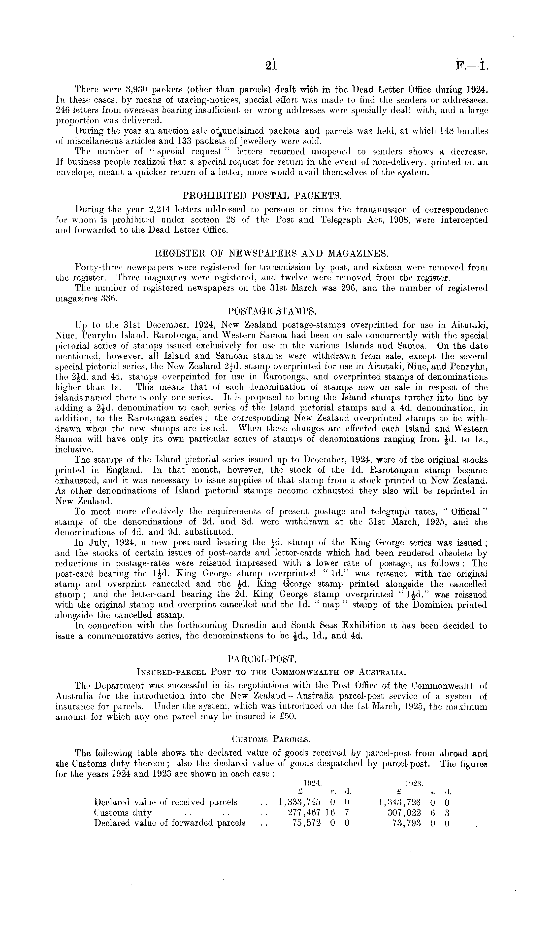 There were 3,930 packets (other than parcels) dealt with in the Dead Letter Office during 1924. In these cases, by means of tracing-notices, special effort was made to find the senders or addressees. 246 letters from overseas bearing insufficient or wrong addresses were specially dealt with, and a large proportion was delivered. During the year an auction sale of,unclaimed packets and parcels was held, at which 148 bundles of miscellaneous articles and 133 packets of jewellery were sold. The number of " special request " letters returned unopened to senders shows a decrease. If business people realized that a special request for return in the event of non-delivery, printed on an envelope, meant a quicker return of a letter, more would avail themselves of the system. PROHIBITED POSTAL PACKETS. During the year 2,2.14 letters addressed to persons or firms the transmission of correspondence for whom is prohibited under section 28 of the Post and Telegraph Act, 1908, were intercepted and forwarded to the Dead Letter Office. REGISTER OF NEWSPAPERS AND MAGAZINES. Forty-three newspapers were registered for transmission by post, and sixteen were removed from the register. Three magazines were registered, and twelve were removed from the register. The number of registered newspapers on the 31st March was 296, and the number of registered magazines 336. POSTAGE-STAMPS. Up to the 31st December, 1924, New Zealand postage-stamps overprinted for use in Aitutaki, Niue, Penryhn Island, Rarotonga, and Western Samoa had been on sale concurrently with the special pictorial series of stamps issued exclusively for use in the various Islands and Samoa. On the date mentioned, however, all Island and Samoan stamps were withdrawn from sale, except the several special pictorial series, the New Zealand 2§d. stamp overprinted for use in Aitutaki, Niue, and Penryhn, the 2W. and 4d. stamps overprinted for use in Rarotonga, and overprinted stamps of denominations higher than Is. This means that of each denomination of stamps now on sale in respect of the islands named there is only one series. It is proposed to bring the Island stamps further into line by adding a 2|d. denomination to each series of the Island pictorial stamps and a 4d. denomination, in addition, to the Rarotongan series ; the corresi)onding New Zealand overprinted stamps to be withdrawn when the new stamps are issued. When these changes are effected each Island and Western Samoa will have only its own particular series of stamps of denominations ranging from |d. to Is., inclusive. The stamps of the Island pictorial series issued up to December, 1924, wore of the original stocks printed in England. In that month, however, the stock of the Id. Rarotongan stamp became exhausted, and it was necessary to issue supplies of that stamp from a stock printed in New Zealand. As other denominations of Island pictorial stamps become exhausted they also will be reprinted in New Zealand. To meet more effectively the requirements of present postage and telegraph rates, " Official " stamps of the denominations of 2d. and Bd. were withdrawn at the 31st March, 1925, and the denominations of 4d. and 9d. substituted. In July, 1924, a new post-card bearing the |d. stamp of the King George series was issued ; and the stocks of certain issues of post-cards and letter-eards which had been rendered obsolete by reductions in postage-rates were reissued impressed with a lower rate of postage, as follows : The post-card bearing the l£d. King George stamp overprinted " Id." was reissued with the original stamp and overprint cancelled and the J-d. King George stamp printed alongside the cancelled stamp ; and the letter-card bearing the 2d. King George stamp overprinted " l|d." was reissued with the original stamp and overprint cancelled and the Id. " map " stamp of the Dominion printed alongside the cancelled stamp. In connection with the forthcoming Dunedin and South Seas Exhibition it has been decided to issue a commemorative series, the denominations to be £d., Id., and 4d. PARCEL-POST. Insured-parcel Post to the Commonwealth of Australia. The Department was successful in its negotiations with the Post Office of the Commonwealth of Australia for the introduction into the New Zealand - Australia parcel-post service of a system of insurance for parcels. Under the system, which was introduced on the Ist March, 1925, the maximum amount for which any one parcel may be insured is £50. Customs Parcels. The following table shows the declared value of goods received by parcel-post from abroad and the Customs duty thereon; also the declared value of goods despatched by parcel-post. The figures for the years 1924 and 1923 are shown in each case : —■ 1924. 1923. £ «. d. £ s. d. Declared value of received parcels .. 1,333,745 0 0 1,343,726 0 0 Customs duty .. .. .. 277,467 16 7 307,022 6 3 Declared value of forwarded parcels .. 75,572 0 0 73,793 0 0