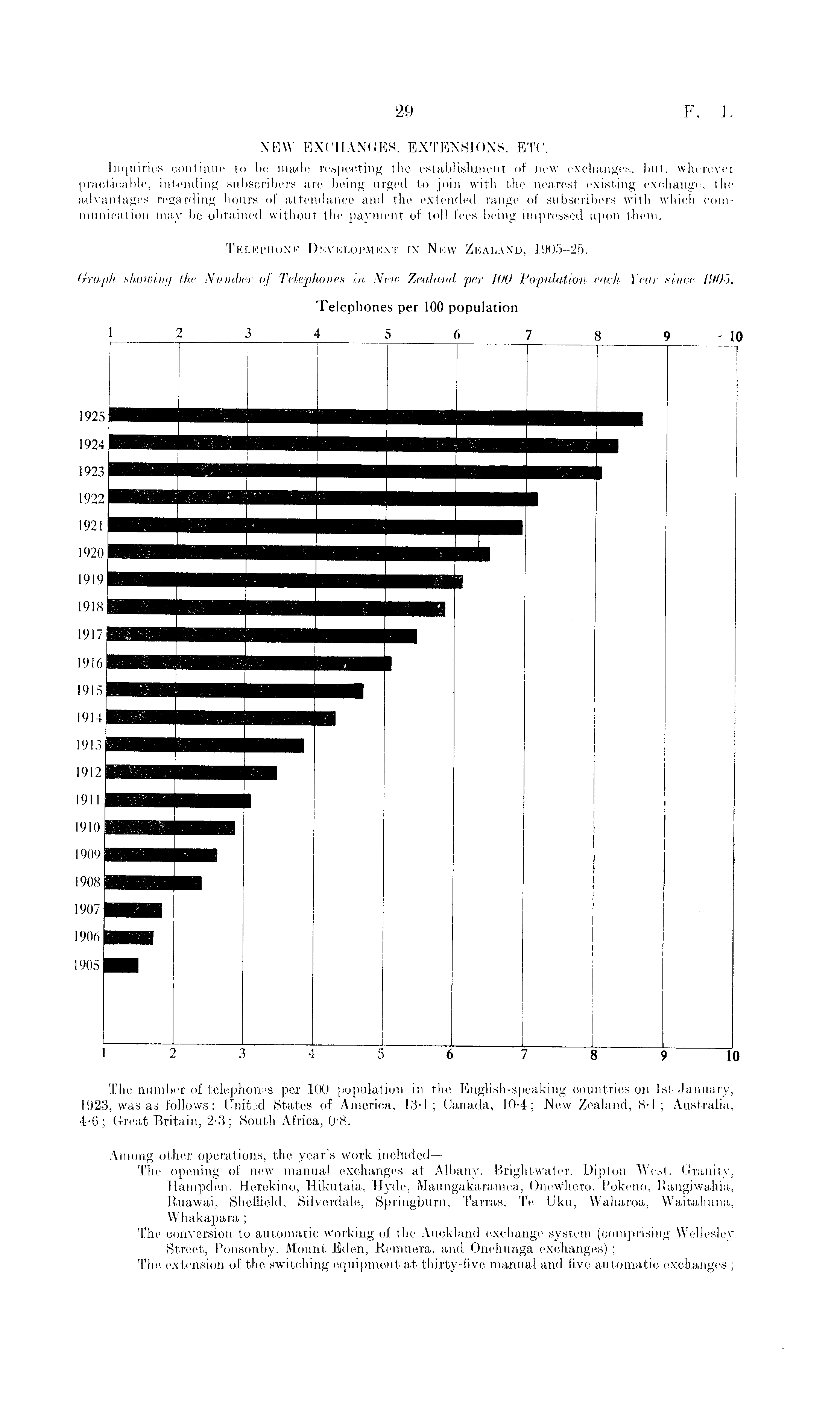 The number of telephones per 100 population in the English-speaking countries on Ist January, 1923, was as follows: Unit id States of America, 13-1; Canada, 10-4; New Zealand, 8-1 ; Australia, 4-6; Great Britain, 2-3; South Africa, o'B. Among other operations, the year's work included — The opening of new manual exchanges at Albany, Brightwatcr, Dip toil West, Granity, Hampden, Herekino, Hikutaia, Hyde, Maungakaramea, OneWhcro, Pokeno, Rangiwahia, Ruawai, Sheffield, Silverdale, Springburn, Tarras, Te Uku, Waharoa, Waitahuna, Whakapara ; The conversion to automatic Working of the Auckland exchange system (comprising Wellesley Street, Ponsonby, Mount Eden, Remuera, and Onehunga exchanges) ; The extension of the switching equipment at thirty-five manual and five automatic exchanges ;