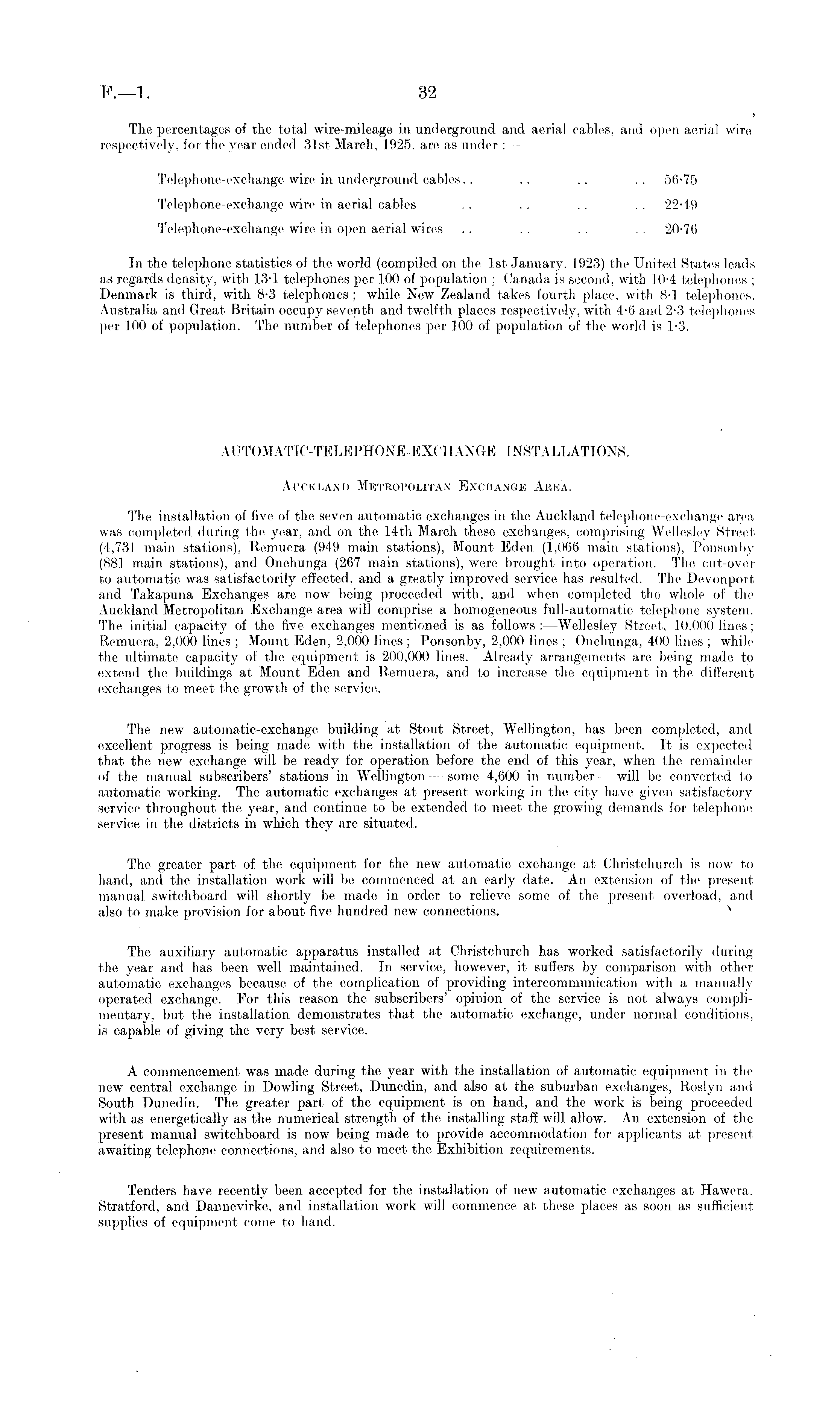 1 Tlie percentages of the total wire-mileage in underground and aerial cables, and open aerial wire respectively, for the year ended 31st March, 1925, are as under : — Telephone-exchange wire in underground cables.. .. . . .. 56-75 Telephone-exchange wire in aerial cables .. .. .. .. 22-49 Telephone-exchange wire in open aerial wires .. .. .. . . 20-76 In the telephone statistics of the world (compiled on the Ist January, 1923) the United States leads as regards density, with 13-1 telephones per 100 of population ; Canada is second, with 10-4 telephones ; Denmark is third, with 8-3 telephones ; while New Zealand takes fourth place, with 8-1 telephones. Australia and Great Britain occupy seventh and twelfth places respectively, with 4-6 and 2-3 telephones per 100 of population. The number of telephones per 100 of population of the world is 1-3. AUTOMATIC-TELEPHONE-EXCHANGE INSTALLATIONS. Auckland Metropolitan Exchange Area. The installation of five of the seven automatic exchanges in the Auckland telephone-exchange area was completed during the year, and on the 14th March these exchanges, comprising Wellesley Street (4,731 main stations), Remuera (949 main stations), Mount Eden (1,066 main stations), Ponsonby (881 main stations), and Onehunga (267 main stations), were brought into operation. The cut-over to automatic was satisfactorily effected, and a greatly improved service has resulted. The Devonport and Takapuna Exchanges are now being proceeded with, and when completed the whole of the Auckland Metropolitan Exchange area will comprise a homogeneous full-automatic telephone system. The initial capacity of the five exchanges mentioned is as follows: —Wellesley Street, 10,000 lines; Remuera, 2,000 lines ; Mount Eden, 2,000 lines ; Ponsonby, 2,000 lines ; Onehunga, 400 lines ; while the ultimate capacity of the equipment is 200,000 lines. Already arrangements are being made to extend the buildings at Mount Eden and Remuera, and to increase the equipment in the different exchanges to meet the growth of the service. The new automatic-exchange building at Stout Street, Wellington, has been completed, and excellent progress is being made with the installation of the automatic equipment. It is expected that the new exchange will be ready for operation before the end of this year, when the remainder of the manual subscribers' stations in Wellington - — some 4,600 in number — will be converted to automatic working. The automatic exchanges at present working in the city have given satisfactory service throughout the year, and continue to be extended to meet the growing demands for telephone service in the districts in which they are situated. The greater part of the equipment for the new automatic exchange at Christchurch is now to hand, and the installation work will be commenced at an early date. An extension of the present manual switchboard will shortly be made in order to relieve some of the present overload, and also to make provision for about five hundred new connections. The auxiliary automatic apparatus installed at Christchurch has worked satisfactorily during the year and has been well maintained. In service, however, it suffers by comparison with other automatic exchanges because of the complication of providing intercommunication with a manually operated exchange. For this reason the subscribers' opinion of the service is not always complimentary, but the installation demonstrates that the automatic exchange, under normal conditions, is capable of giving the very best service. A commencement was made during the year with the installation of automatic equipment in the new central exchange in Dowling Street, Dunedin, and also at the suburban exchanges, Roslyn and South Dunedin. The greater part of the equipment is on hand, and the work is being proceeded with as energetically as the numerical strength of the installing staff will allow. An extension of the present manual switchboard is now being made to provide accommodation for applicants at present awaiting telephone connections, and also to meet the Exhibition requirements. Tenders have recently been accepted for the installation of new automatic exchanges at Hawera. Stratford, and Dannevirke, and installation work will commence at these places as soon as sufficient supplies of equipment come to hand.